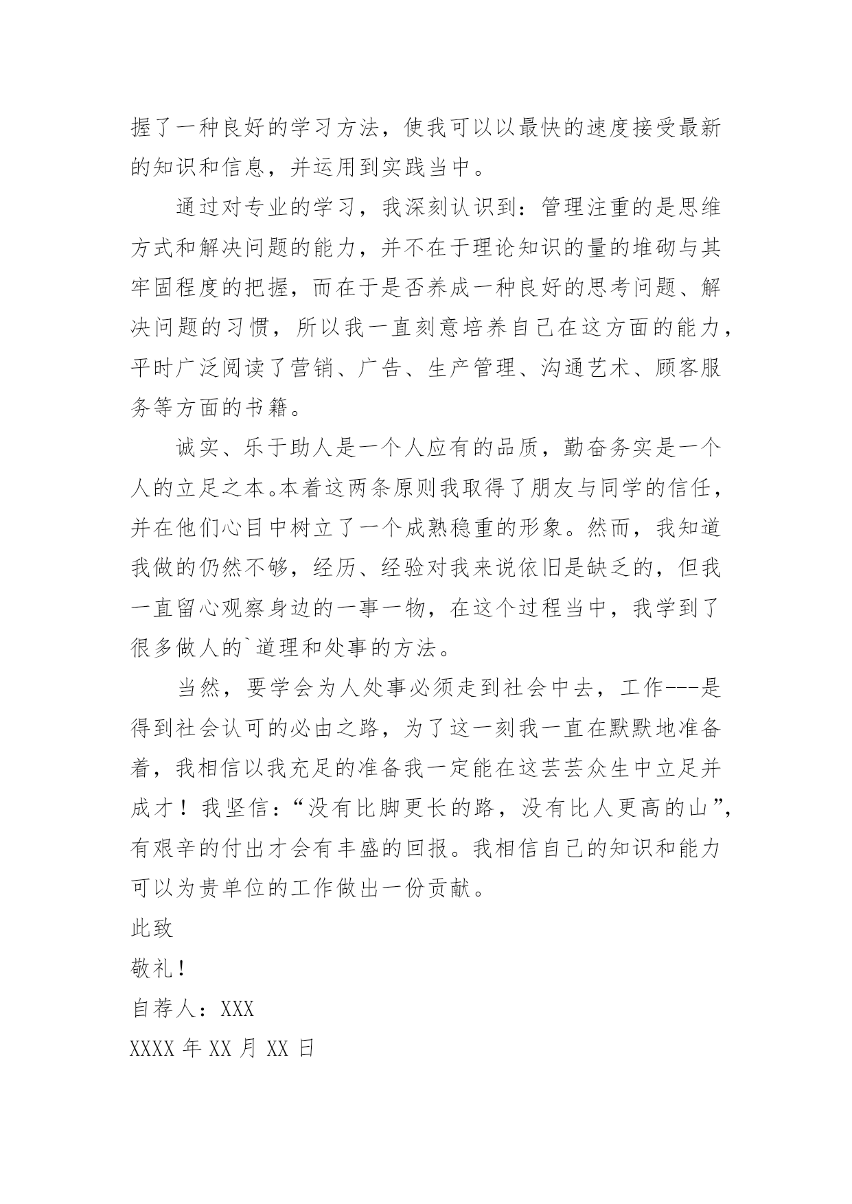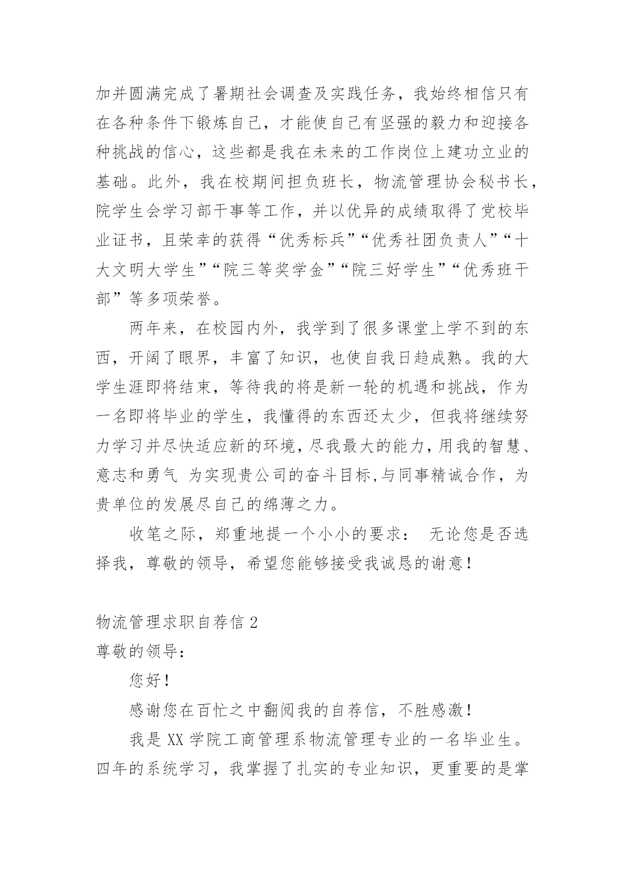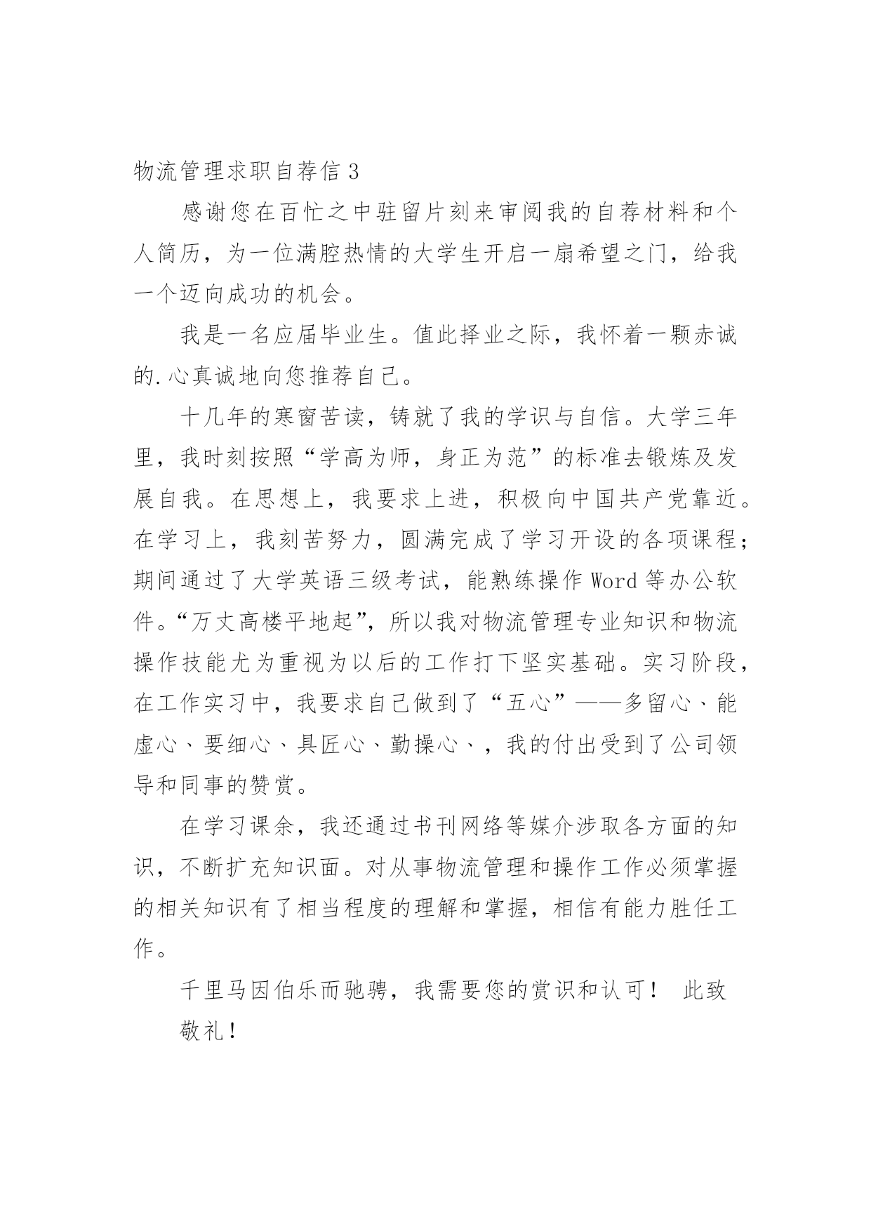 物流管理求职自荐信在当今社会中,我很多时候都不得不用到自荐信,我们在写自荐信的时候要注意理由要充分、合理。那么问题来了,自荐信应该怎么写?以下是小编精心整理的物流管理求职自荐信,欢迎阅读,希望大家能够喜欢。物流管理求职自荐信1尊敬的公司领导:非常感谢您在百忙之中阅读我的自荐信。自从我考入了Xx学院物流管理系以来,这里成了我锻炼成长的沃土,为了早日从一个不喑世事的中学生蜕变成一名全面发展、素质优良的大学生,我积极的投入到学习和生活中,得益于良好的校风,师友的严格教益及个人努力下,我具备了扎实的`专业基础知识、系统的掌握了《现代物流管理基础》、《物流配送中心规划与设计》、《供应链管理》《经济法》《商品学》等一系列有关的理论;可初步从事物流管理业务;进行物流系统调查分析;评价与选择物流技术方案和进行物流信息系统分析;熟悉涉外工作常用礼仪;具有一定的语言表达能力。同时,我利用课余时间广泛地涉猎了大量的书籍,不但充实了自己,也培养了自己多方面的技能,更重要的是,严谨的学风和端正的学习态度,塑造了我自律、自信,朴实、创新的性格特点。不仅如此,我还积极地参加各种社会活动,抓住每一个机会,20xx年夏又积极参加并圆满完成了暑期社会调查及实践任务,我始终相信只有在各种条件下锻炼自己,才能使自己有坚强的毅力和迎接各种挑战的信心,这些都是我在未来的工作岗位上建功立业的基础。此外,我在校期间担负班长,物流管理协会秘书长,院学生会学习部干事等工作,并以优异的成绩取得了党校毕业证书,且荣幸的获得“优秀标兵”“优秀社团负责人”“十大文明大学生”“院三等奖学金”“院三好学生”“优秀班干部”等多项荣誉。两年来,在校园内外,我学到了很多课堂上学不到的东西,开阔了眼界,丰富了知识,也使自我日趋成熟。我的大学生涯即将结束,等待我的将是新一轮的机遇和挑战,作为一名即将毕业的学生,我懂得的东西还太少,但我将继续努力学习并尽快适应新的环境,尽我最大的能力,用我的智慧、意志和勇气为实现贵公司的奋斗目标,与同事精诚合作,为贵单位的发展尽自己的绵薄之力。收笔之际,郑重地提一个小小的要求:无论您是否选择我,尊敬的领导,希望您能够接受我诚恳的谢意!物流管理求职自荐信2尊敬的领导:您好!感谢您在百忙之中翻阅我的自荐信,不胜感激!我是XX学院工商管理系物流管理专业的一名毕业生。四年的系统学习,我掌握了扎实的专业知识,更重要的是掌握了一种良好的学习方法,使我可以以最快的速度接受最新的知识和信息,并运用到实践当中。通过对专业的学习,我深刻认识到:管理注重的是思维方式和解决问题的能力,并不在于理论知识的量的堆砌与其牢固程度的把握,而在于是否养成一种良好的思考问题、解决问题的习惯,所以我一直刻意培养自己在这方面的能力,平时广泛阅读了营销、广告、生产管理、沟通艺术、顾客服务等方面的书籍。诚实、乐于助人是一个人应有的品质,勤奋务实是一个人的立足之本。本着这两条原则我取得了朋友与同学的信任,并在他们心目中树立了一个成熟稳重的形象。然而,我知道我做的仍然不够,经历、经验对我来说依旧是缺乏的,但我一直留心观察身边的一事一物,在这个过程当中,我学到了很多做人的`道理和处事的方法。当然,要学会为人处事必须走到社会中去,工作---是得到社会认可的必由之路,为了这一刻我一直在默默地准备着,我相信以我充足的准备我一定能在这芸芸众生中立足并成才!我坚信:“没有比脚更长的路,没有比人更高的山”,有艰辛的付出才会有丰盛的回报。我相信自己的知识和能力可以为贵单位的工作做出一份贡献。此致敬礼!自荐人:XXXXXXX年XX月XX日物流管理求职自荐信3感谢您在百忙之中驻留片刻来审阅我的自荐材料和个人简历,为一位满腔热情的大学生开启一扇希望之门,给我一个迈向成功的机会。我是一名应届毕业生。值此择业之际,我怀着一颗赤诚的.心真诚地向您推荐自己。十几年的寒窗苦读,铸就了我的学识与自信。大学三年里,我时刻按照“学高为师,身正为范”的标准去锻炼及发展自我。在思想上,我要求上进,积极向中国共产党靠近。在学习上,我刻苦努力,圆满完成了学习开设的各项课程;期间通过了大学英语三级考试,能熟练操作Word等办公软件。“万丈高楼平地起”,所以我对物流管理专业知识和物流操作技能尤为重视为以后的工作打下坚实基础。实习阶段,在工作实习中,我要求自己做到了“五心”——多留心﹑能虚心﹑要细心﹑具匠心﹑勤操心﹑,我的付出受到了公司领导和同事的赞赏。在学习课余,我还通过书刊网络等媒介涉取各方面的知识,不断扩充知识面。对从事物流管理和操作工作必须掌握的相关知识有了相当程度的理解和掌握,相信有能力胜任工作。千里马因伯乐而驰骋,我需要您的赏识和认可!此致敬礼!物流管理求职自荐信4尊敬的领导:感谢您抽空垂阅我的自荐信!本人xxx,男,19xx年生于福建省福州市,从小