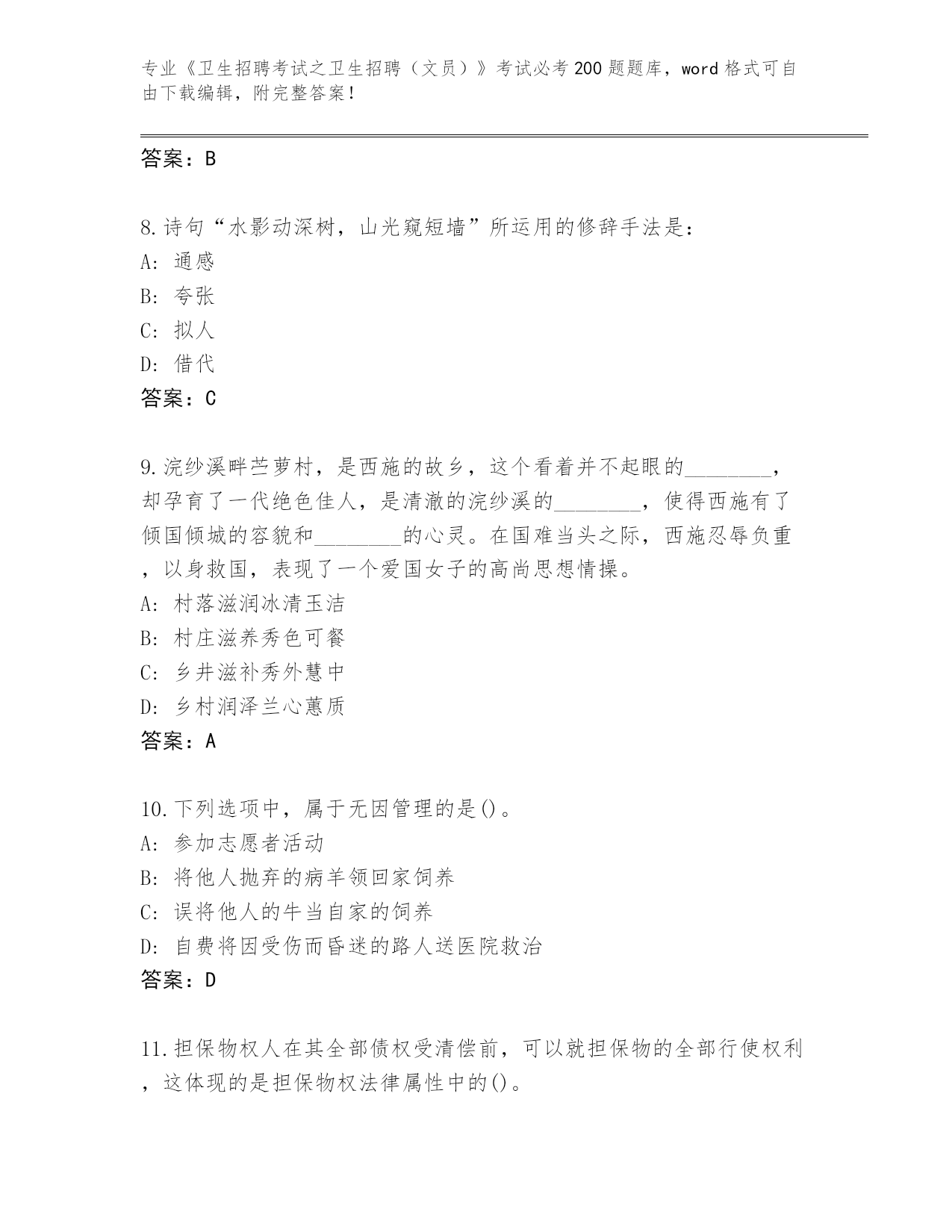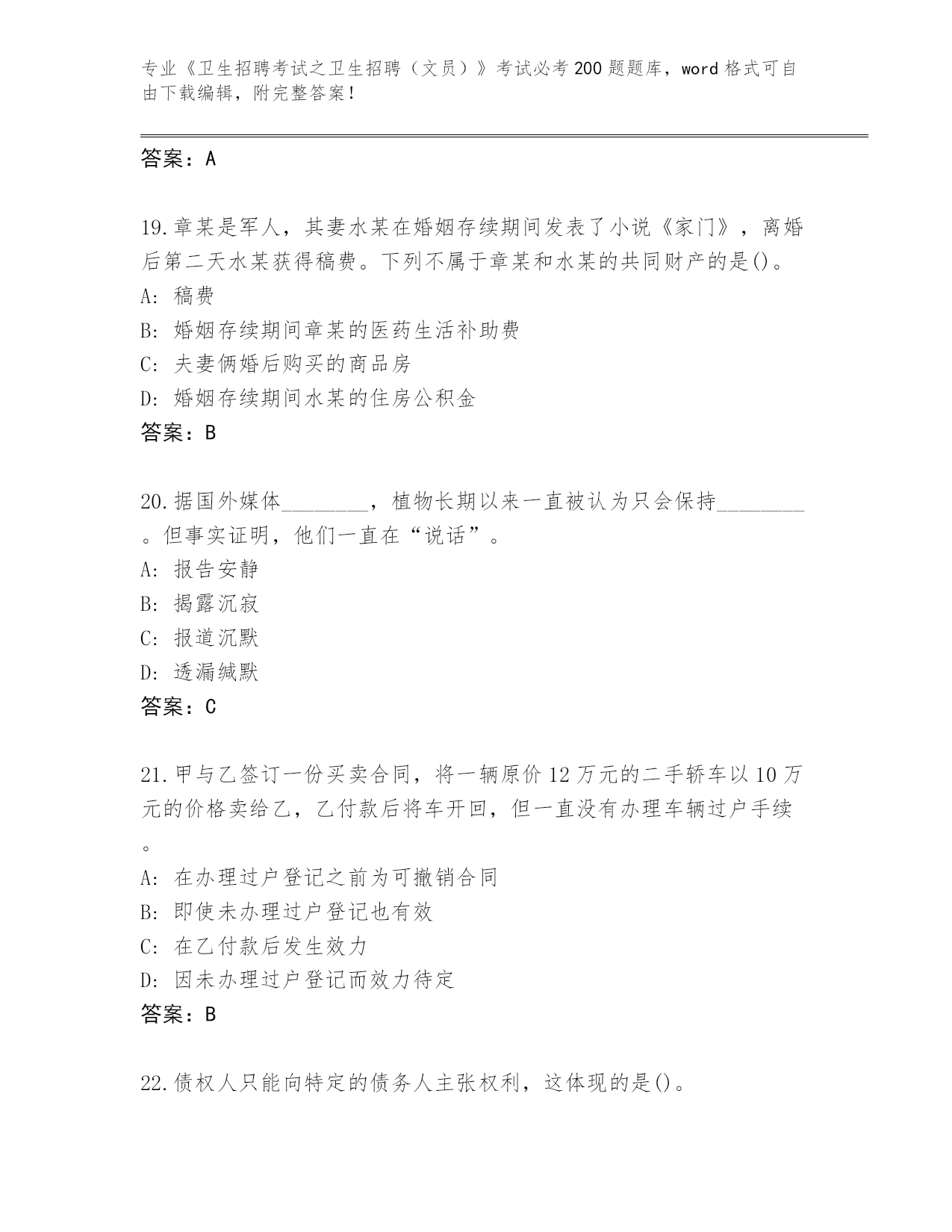 内部使用山东省《卫生招聘考试之卫生招聘(文员)》考试必考200题内部题库带答案(满分必刷)