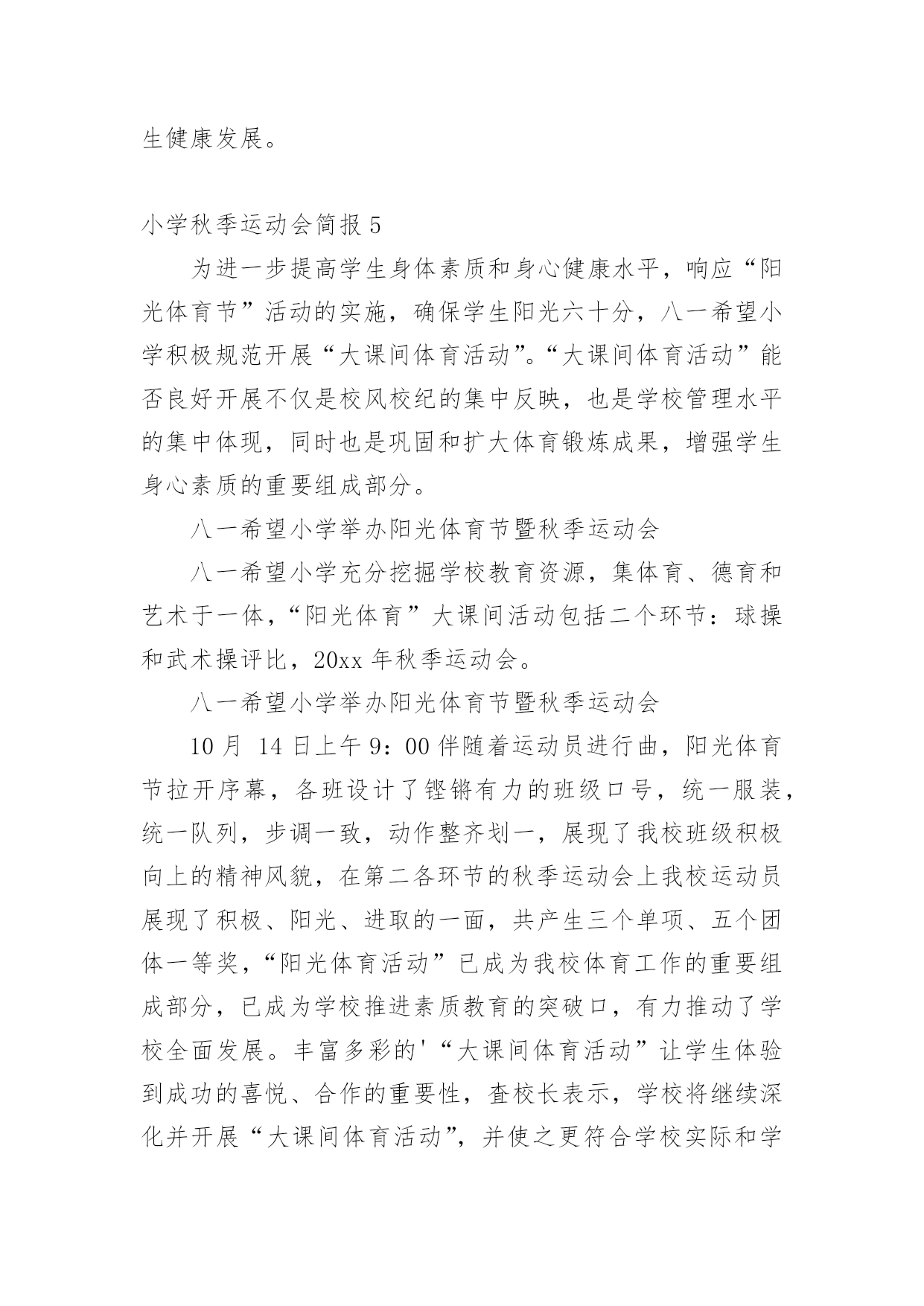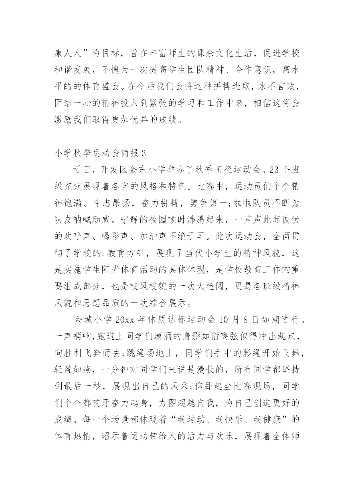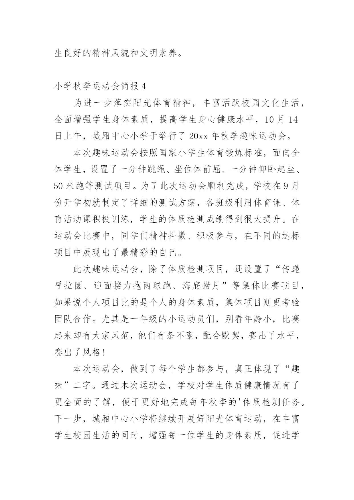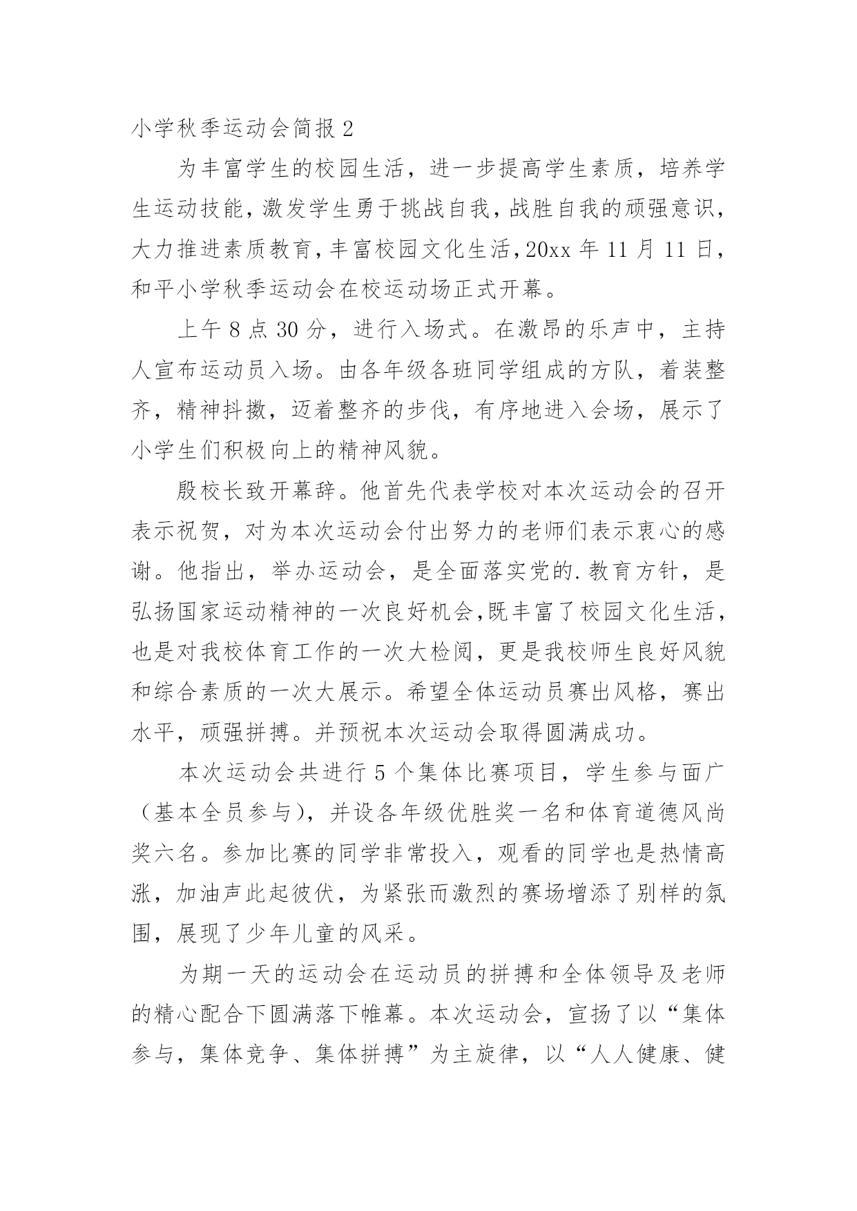 小学秋季运动会简报随着社会一步步向前发展,很多场合都离不了简报,简报具有简、精、快、新、实、活和连续性等特点。那么拟定简报真的很难吗?下面是小编为大家整理的小学秋季运动会简报,欢迎阅读与收藏。小学秋季运动会简报1金秋十月,凉意渐浓,但回民小学的校园里却热火朝天,整个校园里回荡着呐喊声、鼓乐声、欢笑声……原来我们正在举办20xx年秋季运动会。走近赛场,学校各级领导端坐主席台观看比赛。43个班级观赛方阵整齐罗列,摇旗呐喊。近百名班主任和老师各司其职,他们是运动会有序进行,公平竞争的关键。516名运动员或摩拳擦掌,蓄势待发;或箭已离弦,直刺重点;或满脸笑容,洋溢着幸福的.喜悦;又或一脸沮丧,却又浑身是劲,一百个不服气。运动场成了师生创造自我,见证奇迹的欢乐海洋。本届运动会10月18日8时隆重开幕,会期两天。我们相信,通过这次盛会将诞生许多优秀选手,推动学生体育学习,促进学校体育工作。通过这次集会洗礼更能培养师生的集体荣誉感,团结合作意识,民族团结精神,有利于个人发展和班级、学校管理。小学秋季运动会简报2为丰富学生的校园生活,进一步提高学生素质,培养学生运动技能,激发学生勇于挑战自我,战胜自我的顽强意识,大力推进素质教育,丰富校园文化生活,20xx年11月11日,和平小学秋季运动会在校运动场正式开幕。上午8点30分,进行入场式。在激昂的乐声中,主持人宣布运动员入场。由各年级各班同学组成的方队,着装整齐,精神抖擞,迈着整齐的步伐,有序地进入会场,展示了小学生们积极向上的精神风貌。殷校长致开幕辞。他首先代表学校对本次运动会的召开表示祝贺,对为本次运动会付出努力的老师们表示衷心的感谢。他指出,举办运动会,是全面落实党的.教育方针,是弘扬国家运动精神的一次良好机会,既丰富了校园文化生活,也是对我校体育工作的一次大检阅,更是我校师生良好风貌和综合素质的一次大展示。希望全体运动员赛出风格,赛出水平,顽强拼搏。并预祝本次运动会取得圆满成功。本次运动会共进行5个集体比赛项目,学生参与面广(基本全员参与),并设各年级优胜奖一名和体育道德风尚奖六名。参加比赛的同学非常投入,观看的同学也是热情高涨,加油声此起彼伏,为紧张而激烈的赛场增添了别样的氛围,展现了少年儿童的风采。为期一天的运动会在运动员的拼搏和全体领导及老师的精心配合下圆满落下帷幕。本次运动会,宣扬了以“集体参与,集体竞争、集体拼搏”为主旋律,以“人人健康、健康人人”为目标,旨在丰富师生的课余文化生活,促进学校和谐发展,不愧为一次提高学生团队精神、合作意识,高水平的的体育盛会。在今后我们会将这种拼搏进取,永不言败,团结一心的精神投入到紧张的学习和工作中来,相信这将会激励我们取得更加优异的成绩。小学秋季运动会简报3近日,开发区金东小学举办了秋季田径运动会。23个班级充分展现着各自的风格和特色。比赛中,运动员们个个精神饱满、斗志昂扬,奋力拼搏,勇争第一;啦啦队员不断为队友呐喊助威。宁静的校园顿时沸腾起来,一声声此起彼伏的欢呼声、喝彩声、加油声不绝于耳。此次运动会,全面贯彻了学校的.教育方针,展现了当代小学生的精神风貌,这是实施学生阳光体育活动的具体体现,是学校教育工作的重要组成部分,也是校风校貌的一次大检阅,更是各班级精神风貌和思想品质的一次综合展示。金城小学20xx年体质达标运动会10月8日如期进行。一声哨响,跑道上同学们潇洒的身影如箭离弦似得冲出起点,向胜利飞奔而去;跳绳场地上,同学们手中的彩绳开始飞舞,轻盈如燕,一分钟对同学们来说是漫长的,所有同学都坚持到最后一秒,展现出自己的风采;仰卧起坐比赛现场,同学们个个都咬牙奋力起身,力图超越自我,为自己创造更好的成绩。每一个场景都体现着“我运动、我快乐、我健康”的体育热情,昭示着运动带给人的活力与欢乐,展现着全体师生良好的精神风貌和文明素养。小学秋季运动会简报4为进一步落实阳光体育精神,丰富活跃校园文化生活,全面增强学生身体素质,提高学生身心健康水平,10月14日上午,城厢中心小学于举行了20xx年秋季趣味运动会。本次趣味运动会按照国家小学生体育锻炼标准,面向全体学生,设置了一分钟跳绳、坐位体前屈、一分钟仰卧起坐、50米跑等测试项目。为了此次运动会顺利完成,学校在9月份开学初就制定了详细的测试方案,各班级利用体育课、体育活动课积极训练,学生的体质检测成绩得到很大提升。在运动会比赛中,同学们精神抖擞、积极参与,在不同的达标项目中展现出了最精彩的自己。此次趣味运动会,除了体质检测项目,还设置了“传递呼拉圈、迎面接力抱两球跑、海底捞月”等集体比赛项目,如果说个人项目比的是个人的身体素质,集体项目则更考验团队合作。尤其是一年级的小运动员们,别看年龄小,比赛起来却有大家风范,他们有条不紊,配合默契,赛出了水平,赛出了风格!本次运动会,做到了每个学生都参与,真