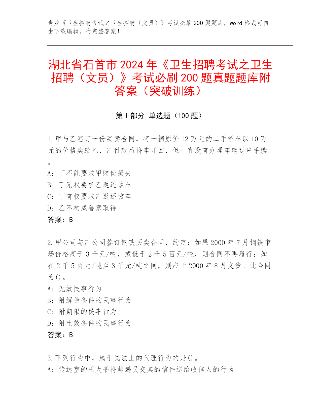 2024年湖北省石首市《卫生招聘考试之卫生招聘(文员)》资格考试必刷200题真题【原创题】
