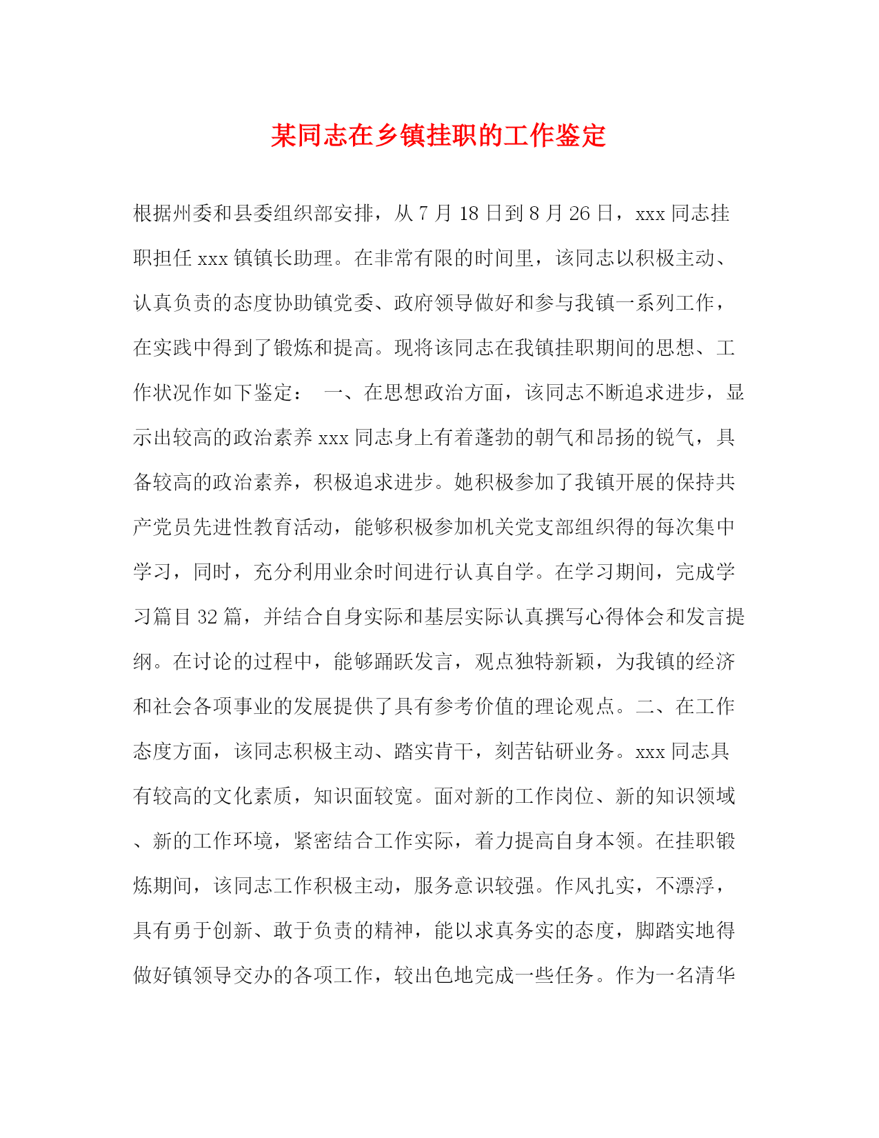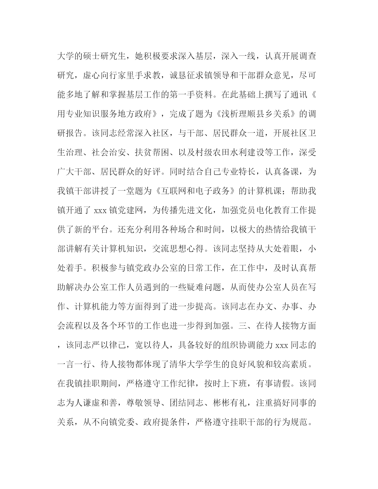 PAGE此资料由网络收集而来,如有侵权请告知上传者立即删除。资料共分享,我们负责传递知识。某同志在乡镇挂职的工作鉴定根据州委和县委组织部安排,从7月18日到8月26日,xxx同志挂职担任xxx镇镇长助理。在非常有限的时间里,该同志以积极主动、认真负责的态度协助镇党委、政府领导做好和参与我镇一系列工作,在实践中得到了锻炼和提高。现将该同志在我镇挂职期间的思想、工作状况作如下鉴定:一、在思想政治方面,该同志不断追求进步,显示出较高的政治素养xxx同志身上有着蓬勃的朝气和昂扬的锐气,具备较高的政治素养,积极追求进步。她积极参加了我镇开展的保持共产党员先进性教育活动,能够积极参加机关党支部组织得的每次集中学习,同时,充分利用业余时间进行认真自学。在学习期间,完成学习篇目32篇,并结合自身实际和基层实际认真撰写心得体会和发言提纲。在讨论的过程中,能够踊跃发言,观点独特新颖,为我镇的经济和社会各项事业的发展提供了具有参考价值的理论观点。二、在工作态度方面,该同志积极主动、踏实肯干,刻苦钻研业务。xxx同志具有较高的文化素质,知识面较宽。面对新的工作岗位、新的知识领域、新的工作环境,紧密结合工作实际,着力提高自身本领。在挂职锻炼期间,该同志工作积极主动,服务意识较强。作风扎实,不漂浮,具有勇于创新、敢于负责的精神,能以求真务实的态度,脚踏实地得做好镇领导交办的各项工作,较出色地完成一些任务。作为一名清华大学的硕士研究生,她积极要求深入基层,深入一线,认真开展调查研究,虚心向行家里手求教,诚恳征求镇领导和干部群众意见,尽可能多地了解和掌握基层工作的第一手资料。在此基础上撰写了通讯《用专业知识服务地方政府》,完成了题为《浅析理顺县乡关系》的调研报告。该同志经常深入社区,与干部、居民群众一道,开展社区卫生治理、社会治安、扶贫帮困、以及村级农田水利建设等工作,深受广大干部、居民群众的好评。同时结合自己专业特长,认真备课,为我镇干部讲授了一堂题为《互联网和电子政务》的计算机课;帮助我镇开通了xxx镇党建网,为传播先进文化,加强党员电化教育工作提供了新的平台。还充分利用各种场合和时间,以极大的热情给我镇干部讲解有关计算机知识,交流思想心得。该同志坚持从大处着眼,小处着手。积极参与镇党政办公室的日常工作,在工作中,及时认真帮助解决办公室工作人员遇到的一些疑难问题,从而使办公室人员在写作、计算机能力等方面得到了进一步提高。该同志在办文、办事、办会流程以及各个环节的工作也进一步得到加强。三、在待人接物方面,该同志严以律己,宽以待人,具备较好的组织协调能力xxx同志的一言一行、待人接物都体现了清华大学学生的良好风貌和较高素质。在我镇挂职期间,严格遵守工作纪律,按时上下班,有事请假。该同志为人谦虚和善,尊敬领导、团结同志、彬彬有礼,注重搞好同事的关系,从不向镇党委、政府提条件,严格遵守挂职干部的行为规范。xxx同志在工作和生活中能够严格要求自己,摆正位置,放平心态,谦虚谨慎,注意形象,工作踏实,任劳任怨,她富有朝气,充满活力,头脑中框子少,接受新事物快,工作热情高,工作中勇于开拓和创新,得到了我镇领导和全体同志们的认同和好评。