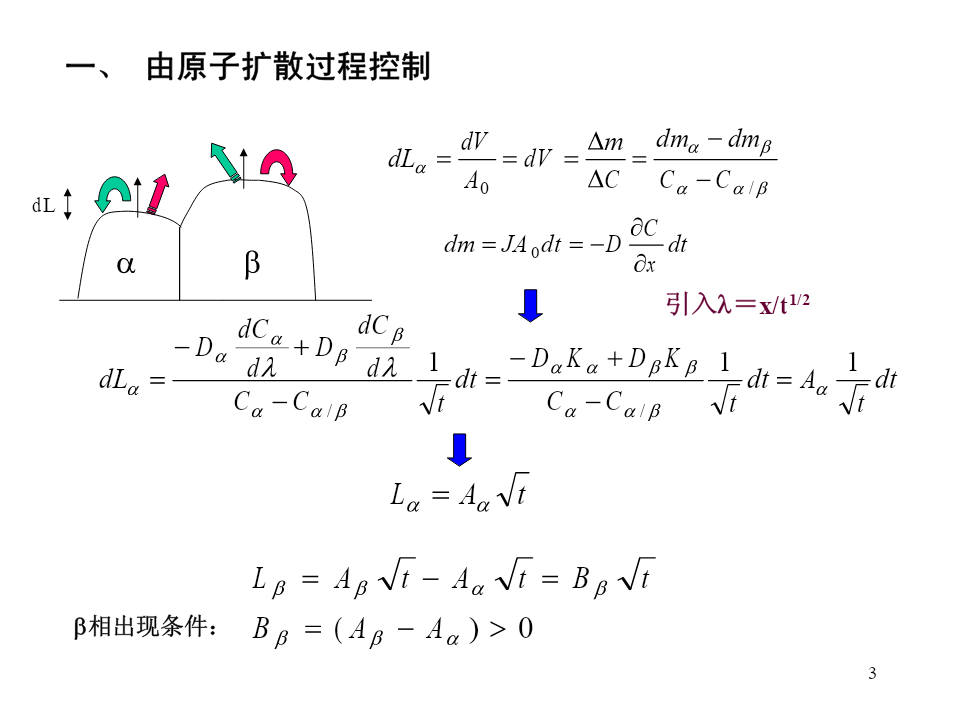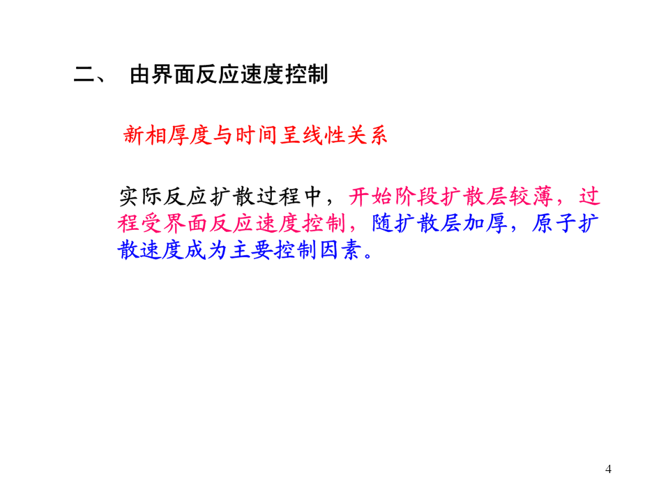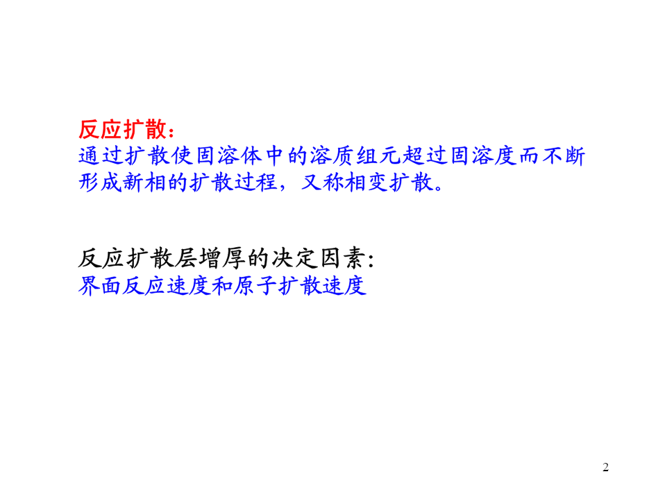 第一章第五节反应扩散《材料科学基础》第四章第五节1反应扩散:通过扩散使固溶体中的溶质组元超过固溶度而不断形成新相的扩散过程,又称相变扩散。反应扩散层增厚的决定因素:界面反应速度和原子扩散速度2一、由原子扩散过程控制dVΔmdmα−dmβdL=α=dV==A0ΔCCCα−α/βdL∂Cdm=JA=dt−dtDαβ0∂x引入λ=x/t1/2dCαdCβ−Dα+Dβλddλ1DKDK−αα+β1β1dLα=dt=dt=αAdtCCα−α/βtCCα−α/βttLα=AαtLβ=Aβt−Aαt=βBt相出现条件:βBAAβ=(β−α)>03二、由界面反应速度控制新相厚度与时间呈线性关系实际反应扩散过程中,开始阶段扩散层较薄,过程受界面反应速度控制,随扩散层加厚,原子扩散速度成为主要控制因素。4