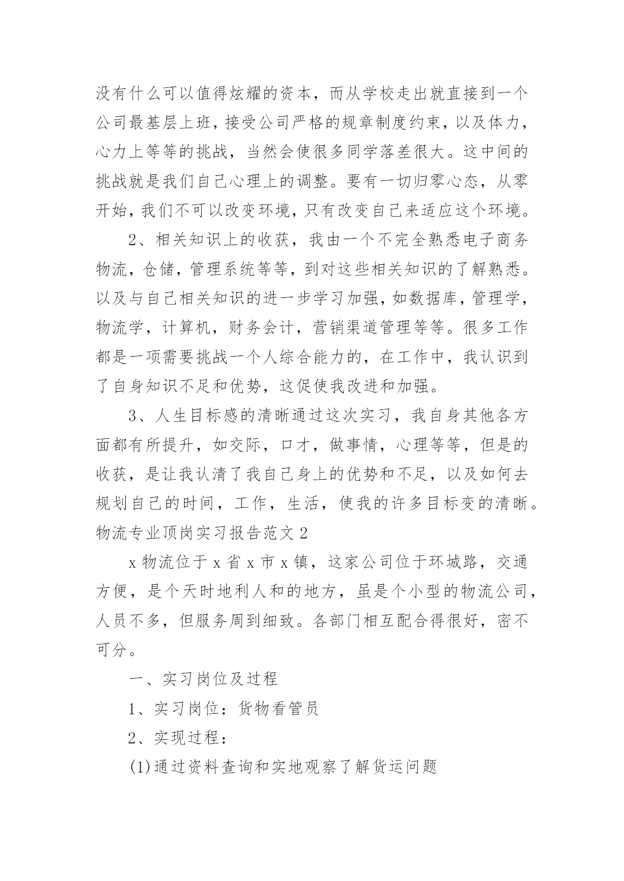 物流专业顶岗实习报告物流专业顶岗实习报告范文随着个人的素质不断提高,报告使用的次数愈发增长,我们在写报告的时候要注意逻辑的合理性。相信很多朋友都对写报告感到非常苦恼吧,下面是小编帮大家整理的物流专业顶岗实习报告范文,仅供参考,希望能够帮助到大家。物流专业顶岗实习报告范文1一、实习单位及地址名称:公司地址:仓库公司简介:物流科技(中国)有限公司是由信息技术和供应链资深专家联合组建的创新型综合物流供应链服务提供商。物流成立于20年,中国区总部扎根于,目前已在全国范围内建立多级营运中心,配送网络覆盖全国四、六级城市。通过完整、系统的合作伙伴认证管理体系,专业的供应链解决方案设计,先进的信息技术和公司自行研发的综合营运平台GeniMa系统为国内外企业提供综合供应链设计与优化,电子物流与网络化仓储管理、干线运输、区域和同城配送等一站式物流管理外包服务。目前已有超过200家企业通过与合作,有效改善了供应链管理并享受精准的物流服务,其中包括等多家合作伙伴将百世纳入年度战略合作伙伴体系。物流通过面向服务的信息平台架构(SOA)建立以客户需求为导向的快速响应机制,优选服务产品组合,以专业的服务管理能力和协同工作平台,帮助企业客户和合作伙伴提高效益,降低成本。“信任链接你我!”百世物流旨在为客户全力打造卓越的物流供应链服务平台,并不断超越客户期望。二、实习时间20年xx月xx日——20年xx月xx日第一周:了解公司总体情况,了解公司仓库具体内外情况和整体布局。第二周:到公司仓库学习仓库管理系统,并如何在实际工作中操作。第三周:在仓库里处理订单,包装和收发货物以及仓库的日常管理工作。三、实习目的专业实习是物流管理专业的实践性必修课程。为了巩固、升华我们大学三年以来所学的理论知识,同时也为了使我们学的理论知识能得到融会贯通的运用。学校组织我们为期三周的专业实习,实习重点是参与企业的日常管理活动(主要是物流管理)以及企业有关职能部门(主要是物流部门)的实际运作。通过在企业的实习,将学校里所学物流和管理知识与企业具体情况相结合,将理论知识灵活地运用到现实管理当中,增加实习经验,也从现实的企业管理当中得到知识的巩固和升华。除此之外,在实习之余磨练意志,学会工作上刻苦耐劳,学习工作中如何待人处事,如何灵活应急。一方面检验教学效果,另一方面为毕业后走上工作岗位打下一定的基础。四、实习内容此次实习活动中,公司给了宽松的实习环境,在短短的三周里,给予了丰富的实习安排,使我的实习计划内容得到充分的实现,我实习的内容分为一下了几大阶段:(一)了解公司总体情况,学习如何进行库位编码和库位设置等仓库整体布局规划。(二)学习公司仓库管理系统如何在实际中的具体运作,熟悉其在实际运用中的功能和特色,并与实际工作结合起来。(三)了解仓库运作的整体流程,学习如何处理订单、分拣、包装、收发货物和退货,还有仓库的日常管理工作等。五、实习体会物流这个行业是一个极待发展的行业,在现在这个物流水平发展还不平衡的时期,我们作为物流的专业人才更应该在实践中去透彻了解物流行业的概况和发展趋势。在物流实习期间,我了解了物流公司的大概操作流程,参与到了各项工作中,包括仓库的布置和维护,包括订单的处理,货物的分拣、包装,货物的收发管理等。(一)仓库管理系统的功能和特色物流科技的GeniMa系统,是采用创新的信息技术,融合物流专家先进的管理理念、方法,为满足供应链各方的信息、管理需求而设计的一套综合解决方案。GeniWMS仓储管理系统是一个按照各种业务规则,对仓库信息、资源、行为、库存和分销运作进行实时、优化管理的应用系统。实现分布式、网络化仓库集中管理的统一集成解决方案,化满足有效产出和精确性操作的要求。从原材料到成品,从人员到设备,与物流GeniTrans系统的无缝对接,保证客户对整条物流供应链掌控;全程地实时监控货物状态并保障货物无破损,降低客户库存成本;及时快速的订单执行,迅速解决客户物流需求。物流的仓储管理系统有以下功能:多组织管理、多仓业务处理,多客户、多仓多货物存储,多级包装自定义货物属性,精确的货物仓储管理,上架与拣货操作的推荐、指导,跨仓库的货物分拨与调拨,分销货主货物属性全方位转移,可配置的业务流程和业务规则设定,详尽的库存交易跟踪与多纬度的查询机制,货物包装设定能根据需要进行灵活的组合、分解,客户终端自定义人机界面,多级权限管理。有以下特色:“我的仓库”—客户人性化的透明管理(具体可实现:对货物存储用户全程透明的仓储管理、供存储货物客户直接在线库存查询与分析、提供存储货物客户实时管理仓库货物、货物客户通过下达分拨/调拨指令,能进行直接的作业指导,以及通过下达盘点指令以实时平衡库存、助客户有效的管理自己的资产,减少库存费用,提高分销渠道的管理效率)、强大而灵活的系统配置功能、无缝的