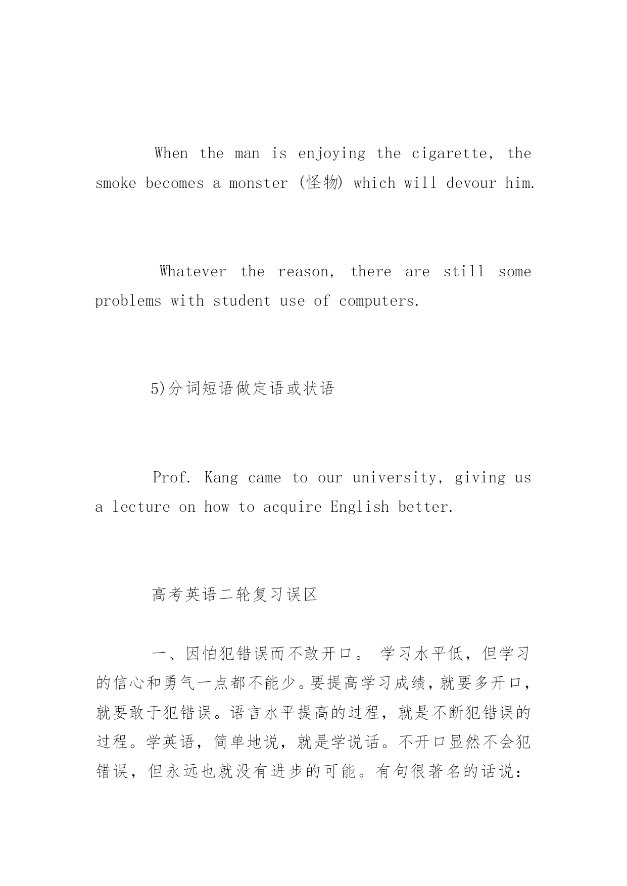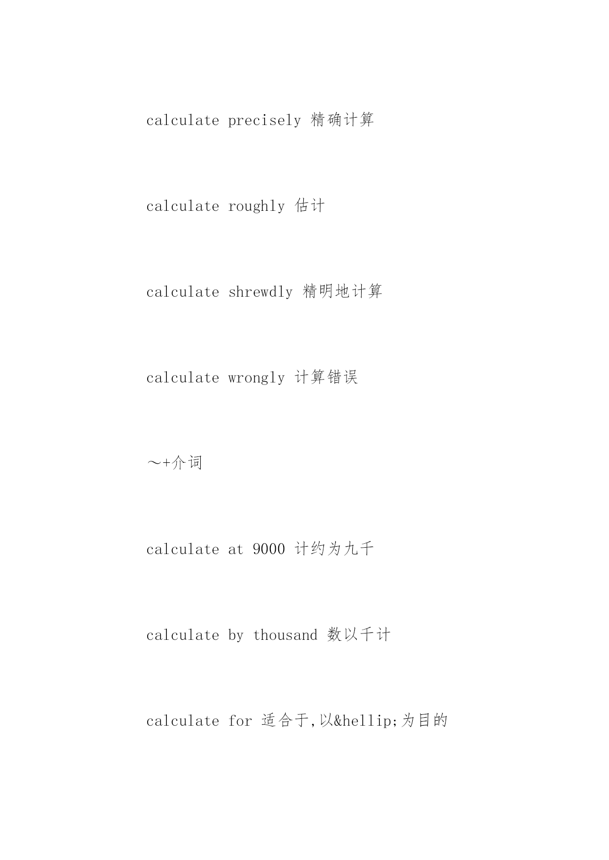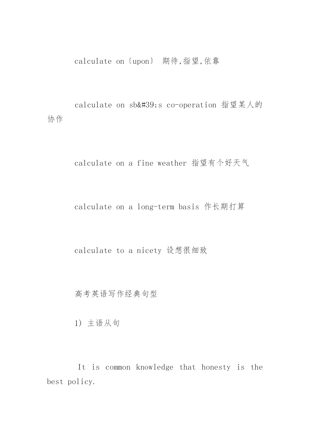 广东高考英语高频单词复习讲义2017广东高考英语必备高频单词复习讲义要想在广东高考的英语考试中取得好成绩,复习好高频单词的复习讲义必不可少,下面百分网小编为大家整理的广东高考英语必备高频单词复习讲义,希望大家喜欢。广东高考英语必备高频单词复习讲义~+名词calculateaddress打算演说calculatearea计算面积calculatethecostofthejourney计算旅途的费用calculatecrime蓄意犯罪calculateaneclipse预测日(月)食calculateinsult有意侮辱calculateload设计负载calculateman-daysinattendance应出勤工日数calculatethemoney数钱~+副词calculatementally心算calculateprecisely精确计算calculateroughly估计calculateshrewdly精明地计算calculatewrongly计算错误~+介词calculateat9000计约为九千calculatebythousand数以千计calculatefor适合于,以…为目的calculateon〔upon〕期待,指望,依靠calculateonsb'sco-operation指望某人的协作calculateonafineweather指望有个好天气calculateonalong-termbasis作长期打算calculatetoanicety设想很细致高考英语写作经典句型1)主语从句Itiscommonknowledgethathonestyisthebestpolicy.Itiswell-knownthat…Itisself-evident/conceivable/obvious/apparentthat…Itgoeswithoutsayingthat…Itisuniversallyacknowledgedthat…Itis/that2)宾(表)语从句Wecannotunderstandwhyhewassocrueltohisroommates.Theproblemisnotwhowillgo,butwhowillstay.3)定语从句(限定性和非限定性)Asisshown/demonstrated/illustrated/depicted/described…inthecartoon/picture/graph/table…,TherearemanyreasonswhyIwanttostudyinyouruniversity.Itisestimatedthattensofbillionsofpoundsisspentoncigaretteseveryyearinourcountry,whichisahugewaste.4)状语从句(时间,原因,地点,条件,让步,转折等)Whenthemanisenjoyingthecigarette,thesmokebecomesamonster(怪物)whichwilldevourhim.Whateverthereason,therearestillsomeproblemswithstudentuseofcomputers.5)分词短语做定语或状语Prof.Kangcametoouruniversity,givingusalectureonhowtoacquireEnglishbetter.高考英语二轮复习误区一、因怕犯错误而不敢开口。学习水平低,但学习的信心和勇气一点都不能少。要提高学习成绩,就要多开口,就要敢于犯错误。语言水平提高的过程,就是不断犯错误的过程。学英语,简单地说,就是学说话。不开口显然不会犯错误,但永远也就没有进步的可能。有句很著名的话说:“畏惧错误就等于毁灭进步!”这话对语言的学习班来说是颇有哲理的。二、阅读训练时,阅读测试正确率低是因为读速太快。如果读完一篇材料后进行阅读测试,发现阅读的正确率的上升,就断然决定降低读速,这是不科学的`。其一是因为不符合阅读训练的真正目的,二是阅读正确率还与许多其他的因素有关,如文章难等。换句话说,在这种情况下,读速再慢慢已与正确率的高低关系不大了。相反地,为了提高阅读水平,就必须进行广泛而大量的阅读,这样做的前提就是要进行快速阅读。三、背会了单词就等于能正确地拼写。把单词公在一个个字母背熟并不能代表可以正确地拼写出来。在单词的记忆中,要把读音、拼写和用法融为一体,同步进行,也就