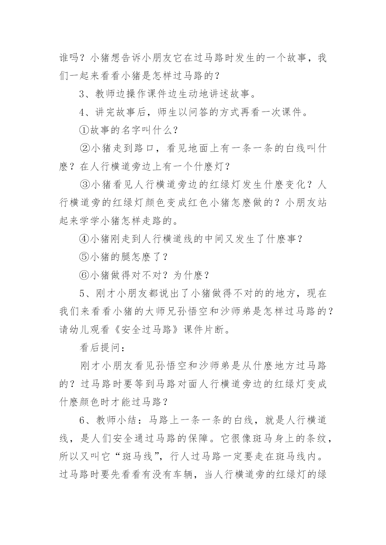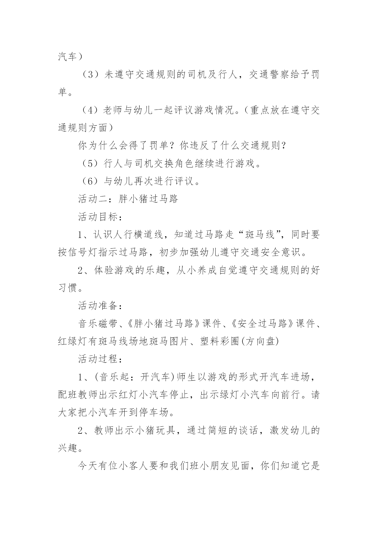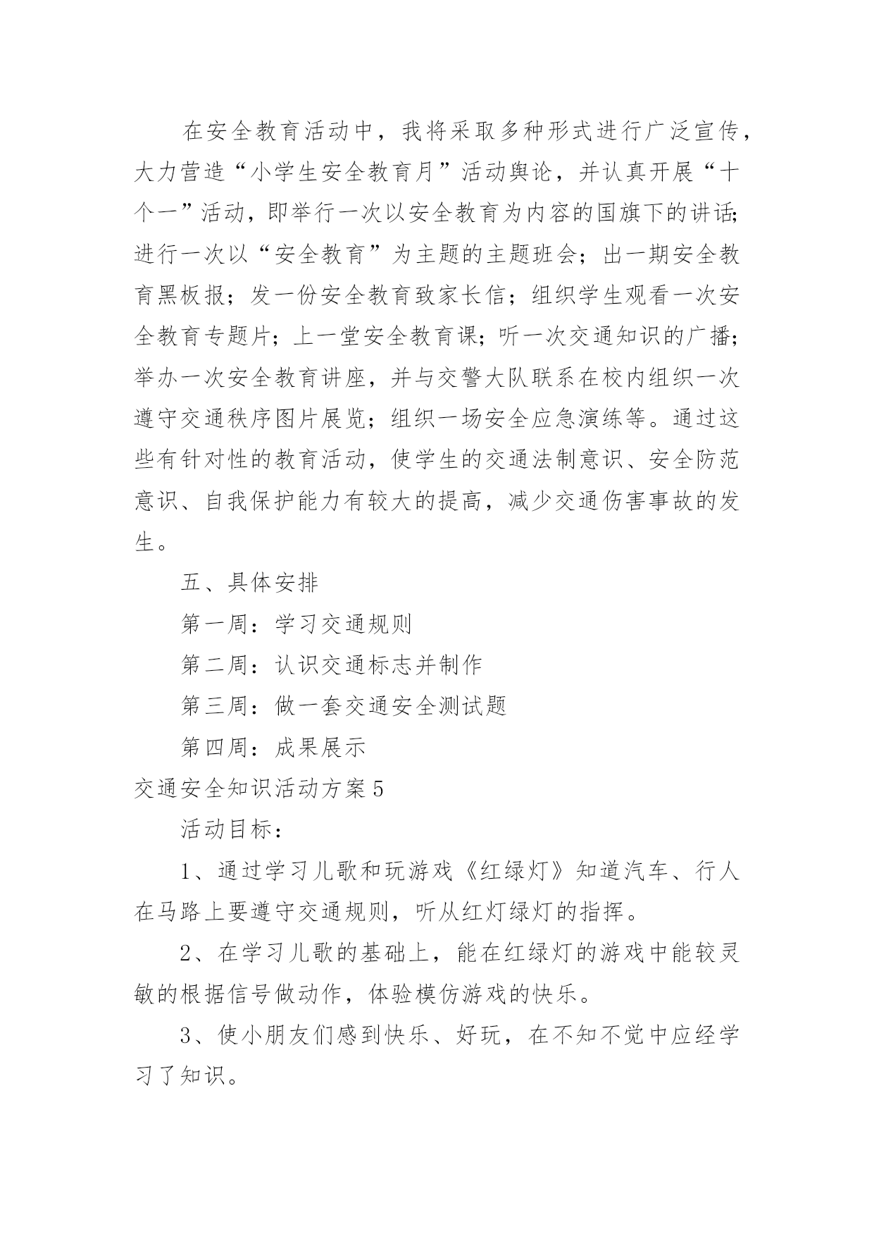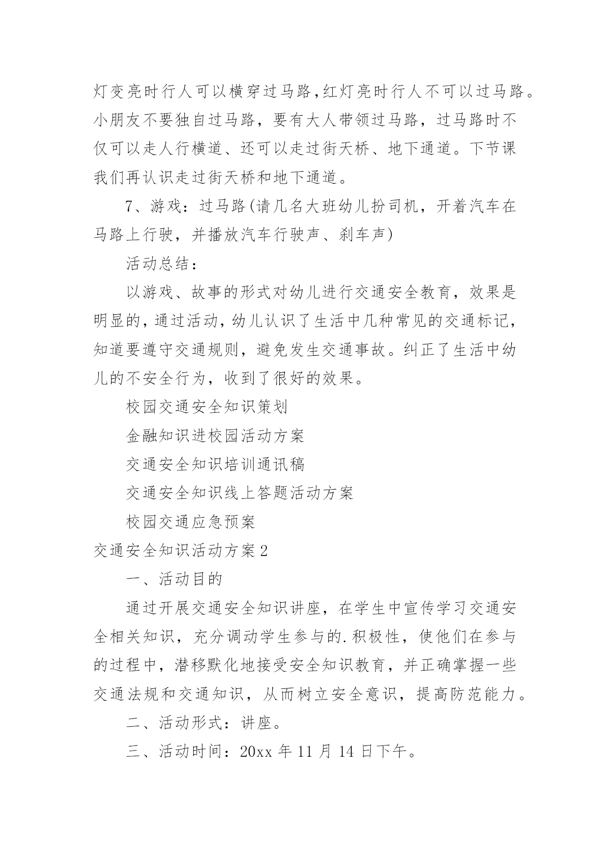 交通安全知识活动方案交通安全知识活动方案(精选12篇)为了确保工作或事情能高效地开展,通常会被要求事先制定方案,一份好的方案一定会注重受众的参与性及互动性。你知道什么样的方案才能切实地帮助到我们吗?下面是小编精心整理的交通安全知识活动方案,仅供参考,欢迎大家阅读。交通安全知识活动方案1设计意图:安全意识是指幼儿对安全知识的掌握及保证自身安全的基本行为的认识,它是幼儿自我保护能力的一个重要方面。因此,我们对幼儿开展了“交通安全我知道”活动。教育幼儿要从小养成自觉遵守道路交通法规的良好习惯,树立交通安全意识,切实保护幼儿的交通安全。主题目标:1、认识马路上的标志,学习安全地过马路,增强幼儿的交通安全意识。2、体验游戏乐趣,养成自觉遵守交通规则的好品质。活动安排:活动一:我会过马路目标:1、懂得识别过马路的标志,安全地过马路。2、能够大胆地进行交流,勇于表达自己的想法。3、体验游戏扮演的乐趣,养成自觉遵守交通规则的好品质。材料:事先在有关交通规则的DV、自制的红绿灯、布置公路场景所需的道具。在活动室周围张贴交通事故图片、各种过马路的交通标志。活动过程:1、请幼儿一起观察交通事故图片,让幼儿认识到交通事故的严重性。2、与幼儿一起观看DV。引入主题,请幼儿观看关于交通安全的DV。请幼儿说说观看DV后的发现及感受,一起讨论应如何遵守交通规则。师:你们在录像中看到了人们是怎样过马路的?你觉得他们这么做会有怎样的`后果呢?我们怎样才能安全地过马路?3、请幼儿到教室四周去观察各种交通标志,并猜测它的作用,请个别幼儿上来说。告诉幼儿交通标志的真正意义。延伸活动:与幼儿一起玩“交通”游戏。(1)与幼儿一起将交通标志布置在“马路”的各个角落。(2)全班幼儿分两组,一组当行人,一组当司机(身戴汽车胸饰),两名幼儿当交通警察。(一个管行人,一个管汽车)(3)未遵守交通规则的司机及行人,交通警察给予罚单。(4)老师与幼儿一起评议游戏情况。(重点放在遵守交通规则方面)你为什么会得了罚单?你违反了什么交通规则?(5)行人与司机交换角色继续进行游戏。(6)与幼儿再次进行评议。活动二:胖小猪过马路活动目标:1、认识人行横道线,知道过马路走“斑马线”,同时要按信号灯指示过马路,初步加强幼儿遵守交通安全意识。2、体验游戏的乐趣,从小养成自觉遵守交通规则的好习惯。活动准备:音乐磁带、《胖小猪过马路》课件、《安全过马路》课件、红绿灯有斑马线场地斑马图片、塑料彩圈(方向盘)活动过程:1、(音乐起:开汽车)师生以游戏的形式开汽车进场,配班教师出示红灯小汽车停止,出示绿灯小汽车向前行。请大家把小汽车开到停车场。2、教师出示小猪玩具,通过简短的谈话,激发幼儿的兴趣。今天有位小客人要和我们班小朋友见面,你们知道它是谁吗?小猪想告诉小朋友它在过马路时发生的一个故事,我们一起来看看小猪是怎样过马路的?3、教师边操作课件边生动地讲述故事。4、讲完故事后,师生以问答的方式再看一次课件。①故事的名字叫什么?②小猪走到路口,看见地面上有一条一条的白线叫什麽?在人行横道旁边上有一个什麽灯?③小猪看见人行横道旁边的红绿灯发生什麽变化?人行横道旁的红绿灯颜色变成红色小猪怎麽做的?小朋友站起来学学小猪怎样走路的。④小猪刚走到人行横道线的中间又发生了什麽事?⑤小猪的腿怎麽了?⑥小猪做得对不对?为什麽?5、刚才小朋友都说出了小猪做得不对的的地方,现在我们来看看小猪的大师兄孙悟空和沙师弟是怎样过马路的?请幼儿观看《安全过马路》课件片断。看后提问:刚才小朋友看见孙悟空和沙师弟是从什麽地方过马路的?过马路时要等到马路对面人行横道旁边的红绿灯变成什麽颜色时才能过马路?6、教师小结:马路上一条一条的白线,就是人行横道线,是人们安全通过马路的保障。它很像斑马身上的条纹,所以又叫它“斑马线”,行人过马路一定要走在斑马线内。过马路时要先看看有没有车辆,当人行横道旁的红绿灯的绿灯变亮时行人可以横穿过马路,红灯亮时行人不可以过马路。小朋友不要独自过马路,要有大人带领过马路,过马路时不仅可以走人行横道、还可以走过街天桥、地下通道。下节课我们再认识走过街天桥和地下通道。7、游戏:过马路(请几名大班幼儿扮司机,开着汽车在马路上行驶,并播放汽车行驶声、刹车声)活动总结:以游戏、故事的形式对幼儿进行交通安全教育,效果是明显的,通过活动,幼儿认识了生活中几种常见的交通标记,知道要遵守交通规则,避免发生交通事故。纠正了生活中幼儿的不安全行为,收到了很好的效果。校园交通安全知识策划金融知识进校园活动方案交通安全知识培训通讯稿交通安全知识线上答题活动方案校园交通应急预案交通安全知识活动方案2一、活动目的通过开展交通安全知识讲座,在学生中宣传学习交通安全相关知识,充分调动学生参与的.积极性,使他们在参与的过程中,潜移默化地接受安全知识教育,