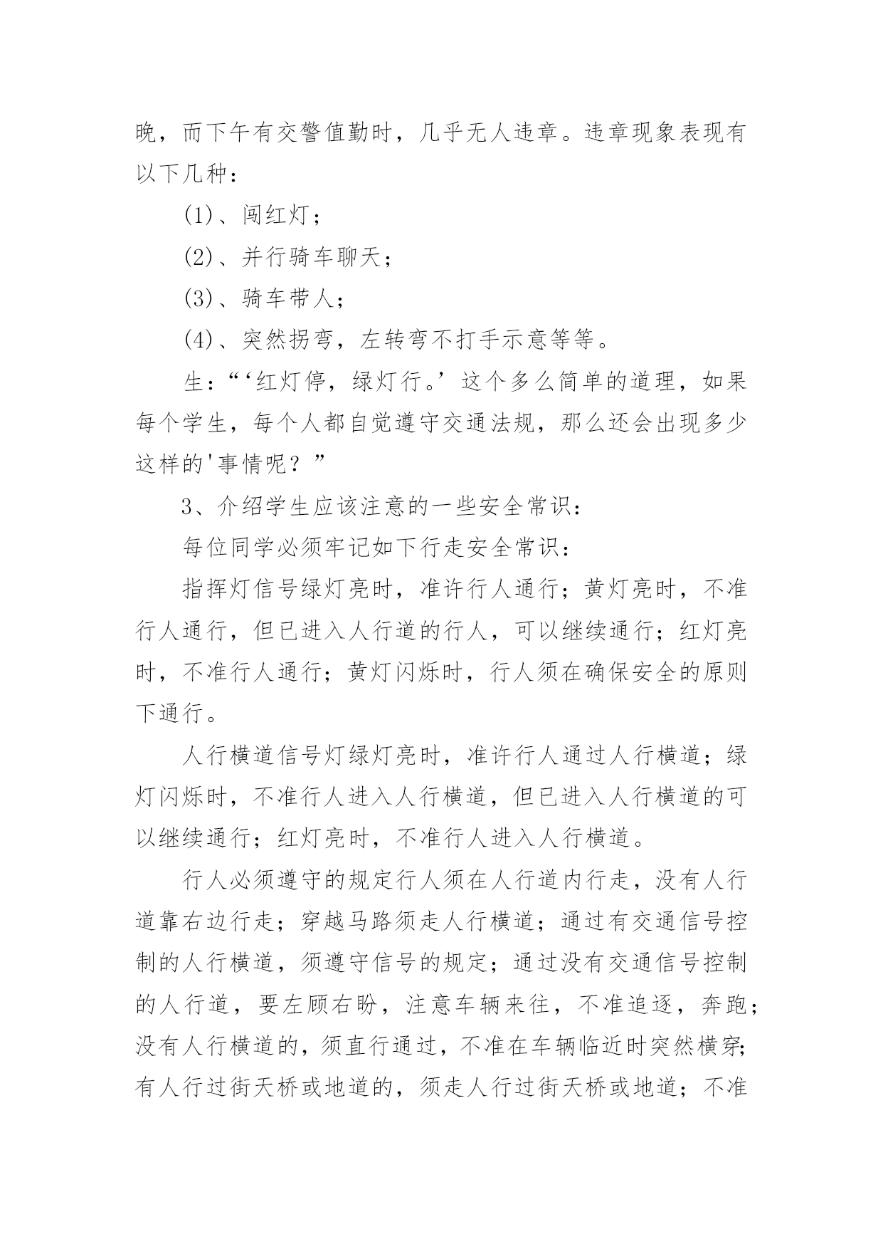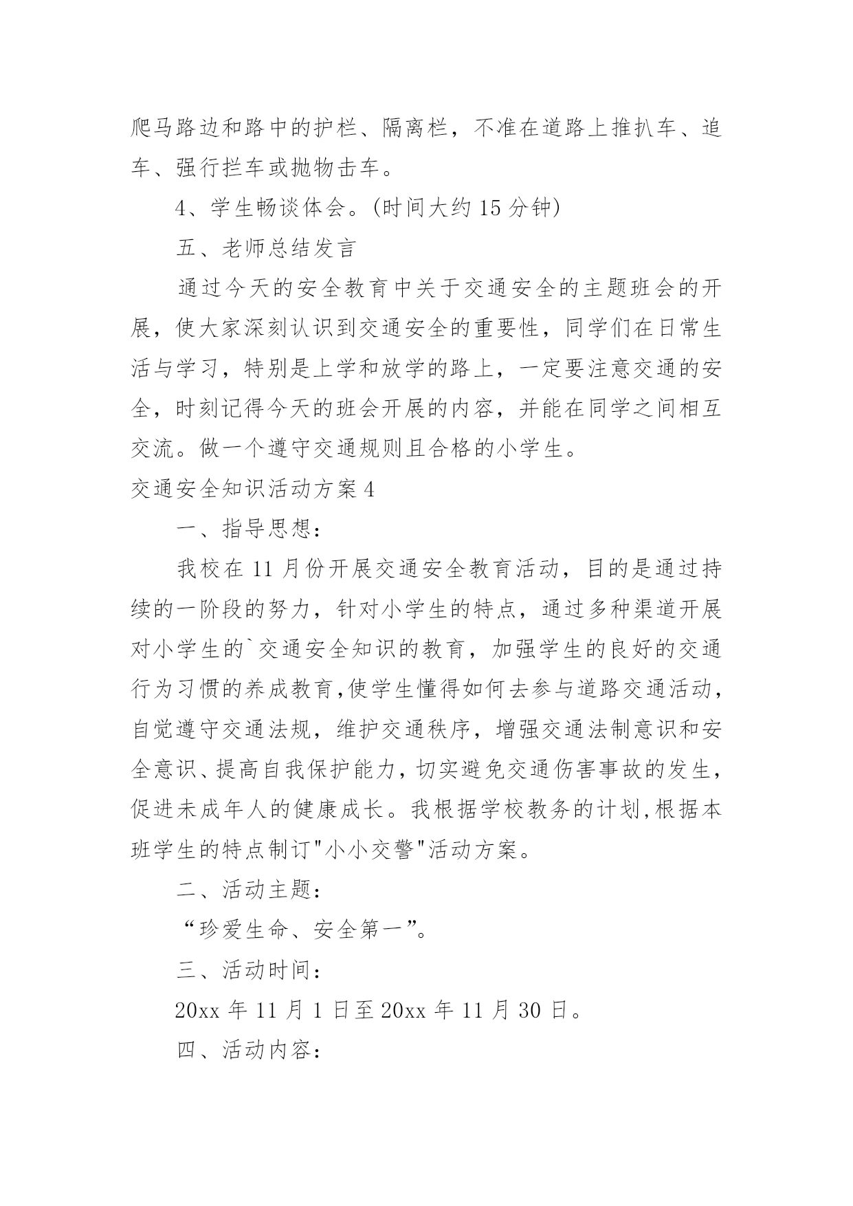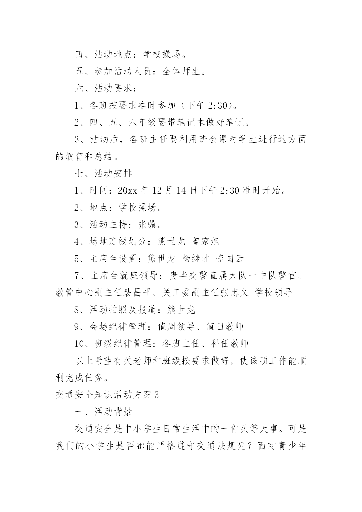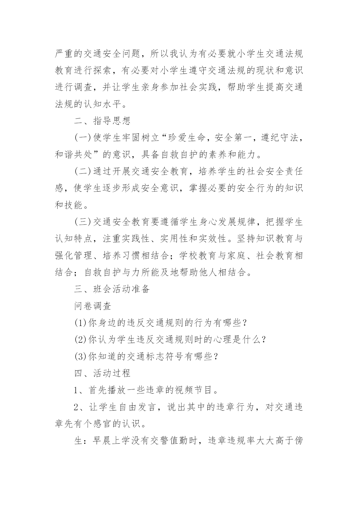 交通安全知识活动方案交通安全知识活动方案(精选12篇)为了确保工作或事情能高效地开展,通常会被要求事先制定方案,一份好的方案一定会注重受众的参与性及互动性。你知道什么样的方案才能切实地帮助到我们吗?下面是小编精心整理的交通安全知识活动方案,仅供参考,欢迎大家阅读。交通安全知识活动方案1设计意图:安全意识是指幼儿对安全知识的掌握及保证自身安全的基本行为的认识,它是幼儿自我保护能力的一个重要方面。因此,我们对幼儿开展了“交通安全我知道”活动。教育幼儿要从小养成自觉遵守道路交通法规的良好习惯,树立交通安全意识,切实保护幼儿的交通安全。主题目标:1、认识马路上的标志,学习安全地过马路,增强幼儿的交通安全意识。2、体验游戏乐趣,养成自觉遵守交通规则的好品质。活动安排:活动一:我会过马路目标:1、懂得识别过马路的标志,安全地过马路。2、能够大胆地进行交流,勇于表达自己的想法。3、体验游戏扮演的乐趣,养成自觉遵守交通规则的好品质。材料:事先在有关交通规则的DV、自制的红绿灯、布置公路场景所需的道具。在活动室周围张贴交通事故图片、各种过马路的交通标志。活动过程:1、请幼儿一起观察交通事故图片,让幼儿认识到交通事故的严重性。2、与幼儿一起观看DV。引入主题,请幼儿观看关于交通安全的DV。请幼儿说说观看DV后的发现及感受,一起讨论应如何遵守交通规则。师:你们在录像中看到了人们是怎样过马路的?你觉得他们这么做会有怎样的`后果呢?我们怎样才能安全地过马路?3、请幼儿到教室四周去观察各种交通标志,并猜测它的作用,请个别幼儿上来说。告诉幼儿交通标志的真正意义。延伸活动:与幼儿一起玩“交通”游戏。(1)与幼儿一起将交通标志布置在“马路”的各个角落。(2)全班幼儿分两组,一组当行人,一组当司机(身戴汽车胸饰),两名幼儿当交通警察。(一个管行人,一个管汽车)(3)未遵守交通规则的司机及行人,交通警察给予罚单。(4)老师与幼儿一起评议游戏情况。(重点放在遵守交通规则方面)你为什么会得了罚单?你违反了什么交通规则?(5)行人与司机交换角色继续进行游戏。(6)与幼儿再次进行评议。活动二:胖小猪过马路活动目标:1、认识人行横道线,知道过马路走“斑马线”,同时要按信号灯指示过马路,初步加强幼儿遵守交通安全意识。2、体验游戏的乐趣,从小养成自觉遵守交通规则的好习惯。活动准备:音乐磁带、《胖小猪过马路》课件、《安全过马路》课件、红绿灯有斑马线场地斑马图片、塑料彩圈(方向盘)活动过程:1、(音乐起:开汽车)师生以游戏的形式开汽车进场,配班教师出示红灯小汽车停止,出示绿灯小汽车向前行。请大家把小汽车开到停车场。2、教师出示小猪玩具,通过简短的谈话,激发幼儿的兴趣。今天有位小客人要和我们班小朋友见面,你们知道它是谁吗?小猪想告诉小朋友它在过马路时发生的一个故事,我们一起来看看小猪是怎样过马路的?3、教师边操作课件边生动地讲述故事。4、讲完故事后,师生以问答的方式再看一次课件。①故事的名字叫什么?②小猪走到路口,看见地面上有一条一条的白线叫什麽?在人行横道旁边上有一个什麽灯?③小猪看见人行横道旁边的红绿灯发生什麽变化?人行横道旁的红绿灯颜色变成红色小猪怎麽做的?小朋友站起来学学小猪怎样走路的。④小猪刚走到人行横道线的中间又发生了什麽事?⑤小猪的腿怎麽了?⑥小猪做得对不对?为什麽?5、刚才小朋友都说出了小猪做得不对的的地方,现在我们来看看小猪的大师兄孙悟空和沙师弟是怎样过马路的?请幼儿观看《安全过马路》课件片断。看后提问:刚才小朋友看见孙悟空和沙师弟是从什麽地方过马路的?过马路时要等到马路对面人行横道旁边的红绿灯变成什麽颜色时才能过马路?6、教师小结:马路上一条一条的白线,就是人行横道线,是人们安全通过马路的保障。它很像斑马身上的条纹,所以又叫它“斑马线”,行人过马路一定要走在斑马线内。过马路时要先看看有没有车辆,当人行横道旁的红绿灯的绿灯变亮时行人可以横穿过马路,红灯亮时行人不可以过马路。小朋友不要独自过马路,要有大人带领过马路,过马路时不仅可以走人行横道、还可以走过街天桥、地下通道。下节课我们再认识走过街天桥和地下通道。7、游戏:过马路(请几名大班幼儿扮司机,开着汽车在马路上行驶,并播放汽车行驶声、刹车声)活动总结:以游戏、故事的形式对幼儿进行交通安全教育,效果是明显的,通过活动,幼儿认识了生活中几种常见的交通标记,知道要遵守交通规则,避免发生交通事故。纠正了生活中幼儿的不安全行为,收到了很好的效果。校园交通安全知识策划金融知识进校园活动方案交通安全知识培训通讯稿交通安全知识线上答题活动方案校园交通应急预案交通安全知识活动方案2一、活动目的通过开展交通安全知识讲座,在学生中宣传学习交通安全相关知识,充分调动学生参与的.积极性,使他们在参与的过程中,潜移默化地接受安全知识教育,