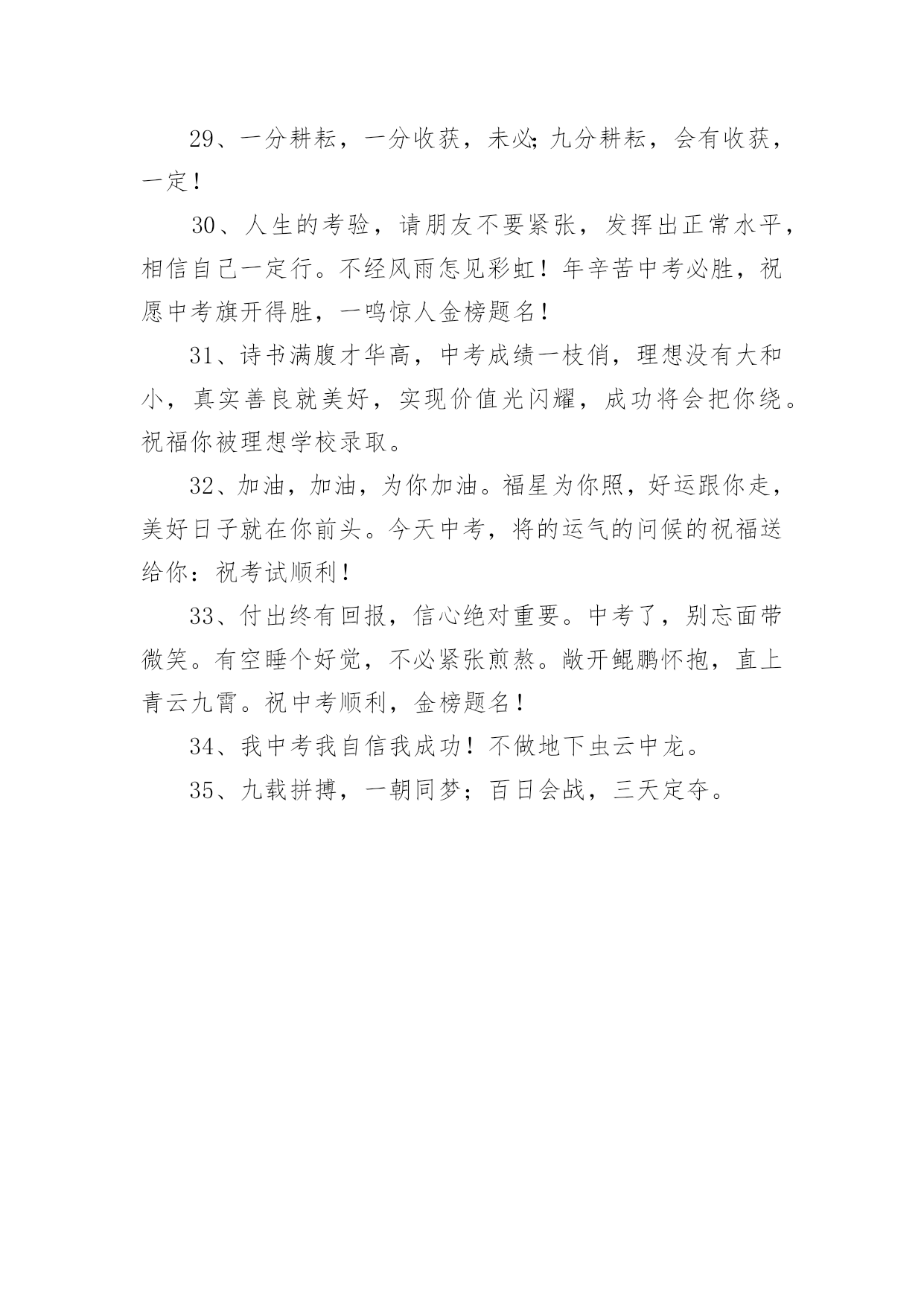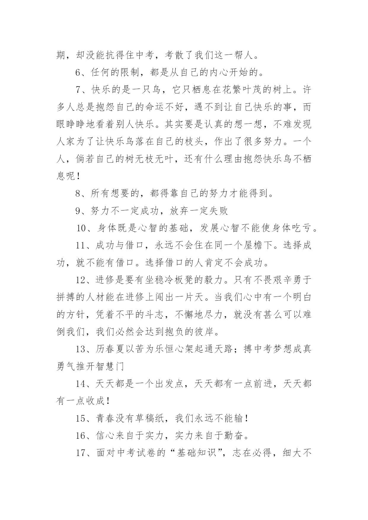 中考体育考试励志的句子在生活、工作和学习中,大家肯定对各类句子都很熟悉吧,句子是由词或词组构成的,是具有一定语调并表达一个完整意思的语言运用单位。你所见过的句子是什么样的呢?以下是小编为大家收集的中考体育考试励志的句子,仅供参考,大家一起来看看吧。1、三年的苦读,现在终于要面对霸气的中考了。我们是雄鹰,我们是梅花。朋友,让我们在这个没有硝烟的战场上一切展翅高飞吧!过了月,我们将有梅花的芳香。2、青春的风铃,吹开了心扉,青春的彩笛,吹动了梦想,青春的音符带动我奔向希望。青春,这个美好的季节,正是我们播种希望的时候,珍惜它,把握它,让它在我们手中放出夺目的光彩。3、期中考试的号角已吹响,收拾好行装,带上最锋利的头脑,怀着一颗最细致的心灵,握紧最有力的拳头,让我们满怀自信地冲锋,让我们在中考面前对自己大声说:“我能行!”让我们将期中考试的考场,变成我们的梦想舞台。4、上帝给予我们每一个人的梦,光线缓慢地淌过梦里的衣摆,留下一段段气息。雨点落在地面的刹那,变成无数只飞鸟重回天空。它希望梦能把我们唤醒,让我们拒绝平庸,绽放人生的光彩。5、初中三年,我承受住了节课,小时,个星期,个学期,却没能抗得住中考,考散了我们这一帮人。6、任何的限制,都是从自己的内心开始的。7、快乐的是一只鸟,它只栖息在花繁叶茂的树上。许多人总是抱怨自己的命运不好,遇不到让自己快乐的事,而眼睁睁地看着别人快乐。其实要是认真的想一想,不难发现人家为了让快乐鸟落在自己的枝头,作出了很多努力。一个人,倘若自己的树无枝无叶,还有什么理由抱怨快乐鸟不栖息呢!8、所有想要的,都得靠自己的努力才能得到。9、努力不一定成功,放弃一定失败10、身体既是心智的基础,发展心智不能使身体吃亏。11、成功与借口,永远不会住在同一个屋檐下。选择成功,就不能有借口。选择借口的人肯定不会成功。12、进修是要有坐稳冷板凳的毅力。只有不畏艰辛勇于拼搏的人材能在进修上闯出一片天。当我们心中有一个明白的方针,凭着不平的斗志,不懈地尽力,就没有甚么可以难倒我们,我们必然会达到抱负的彼岸。13、历春夏以苦为乐恒心架起通天路;搏中考梦想成真勇气推开智慧门14、天天都是一个出发点,天天都有一点前进,天天都有一点收成!15、青春没有草稿纸,我们永远不能输!16、信心来自于实力,实力来自于勤奋。17、面对中考试卷的“基础知识”,志在必得,细大不捐;“力所不及”,失不足惜。18、乐学实学,挑战中考;勤勉向上,成就自我。19、没有平日的失败,就没有最终的成功。重要的是分析失败原因并吸取教训。20、生命之中最快乐的是拼搏,而非成功,生命之中最痛苦的是懒散,而非失败。21、祝我今天中考能考个好成绩,也祝今天中考的人考好,加油!22、互支持,共同奋斗:相信自己,直到成功那一刻,笑看风云!23、初三不再有,劝君珍惜之。一年之经历,终身之财富。24、转眼中考到,知识已记牢,眼下要做到,心不焦气不燥,常到外面溜一遭,看看蓝天有多高,不把功名之事看成宝,只要尽力就是好,到时成功自会把你找。祝你心情愉快,中考顺利。25、祝初三的师弟师妹们,中考加油,都能考上一个好的高中,为初中的生活画上一个圆满的句号。初中的时光是短暂而充实的,希望大家都能珍惜在学校的最后两个多月的时光,好好和同学一起加油,好好奋斗!26、身体教育和知识教育之间必须保持平衡。体育应造就体格健壮的勇士,并且使健全的精神寓于健全的体格。27、拼一分高一分,一分成就终生。28、练习就是中考,中考就是练习。29、一分耕耘,一分收获,未必;九分耕耘,会有收获,一定!30、人生的考验,请朋友不要紧张,发挥出正常水平,相信自己一定行。不经风雨怎见彩虹!年辛苦中考必胜,祝愿中考旗开得胜,一鸣惊人金榜题名!31、诗书满腹才华高,中考成绩一枝俏,理想没有大和小,真实善良就美好,实现价值光闪耀,成功将会把你绕。祝福你被理想学校录取。32、加油,加油,为你加油。福星为你照,好运跟你走,美好日子就在你前头。今天中考,将的运气的问候的祝福送给你:祝考试顺利!33、付出终有回报,信心绝对重要。中考了,别忘面带微笑。有空睡个好觉,不必紧张煎熬。敞开鲲鹏怀抱,直上青云九霄。祝中考顺利,金榜题名!34、我中考我自信我成功!不做地下虫云中龙。35、九载拼搏,一朝同梦;百日会战,三天定夺。