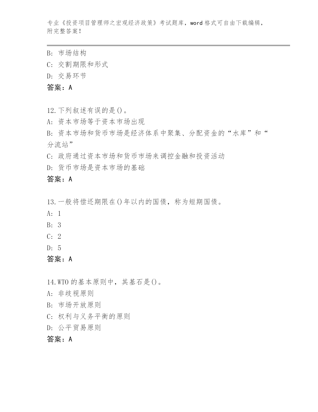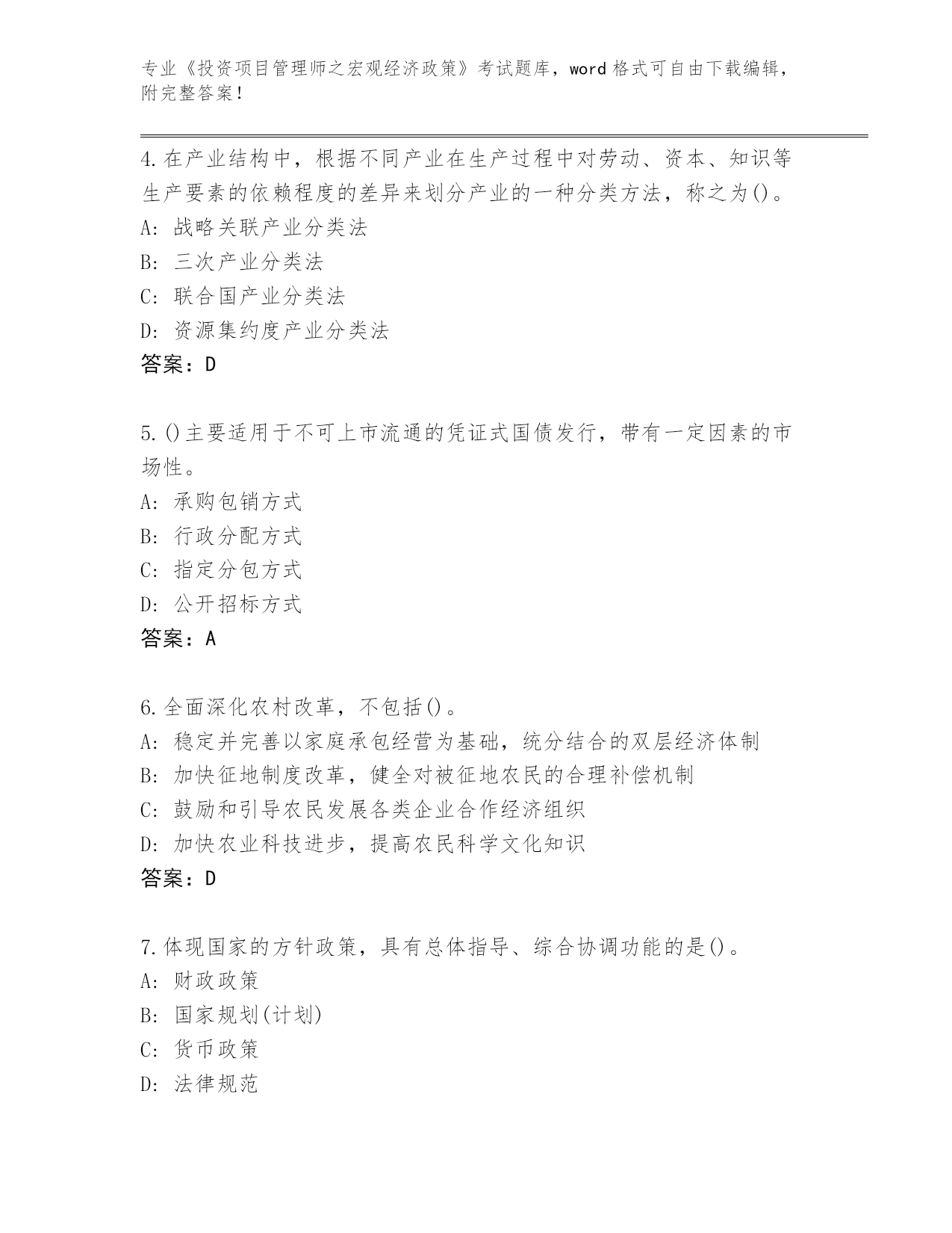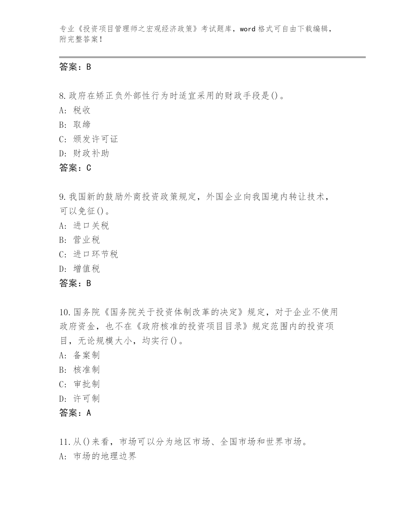 完整版陕西省碑林区《投资项目管理师之宏观经济政策》考试必考200题题库(名师系列)