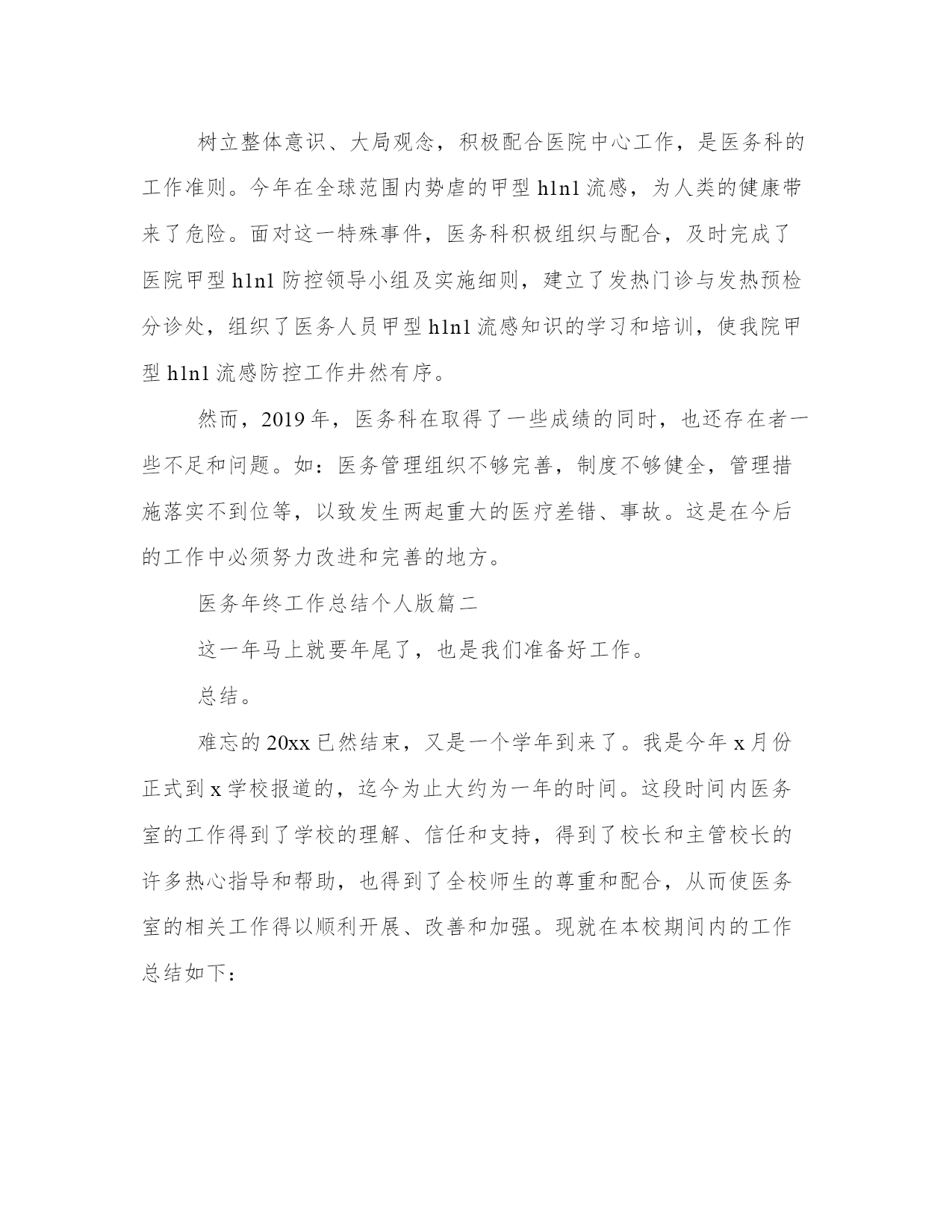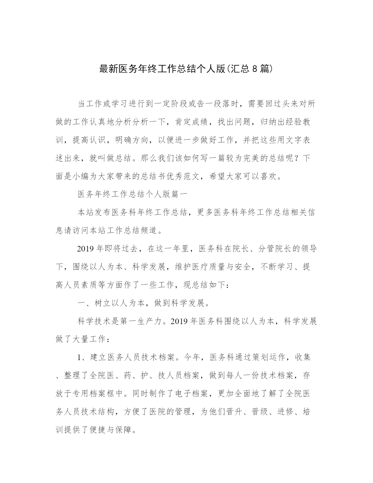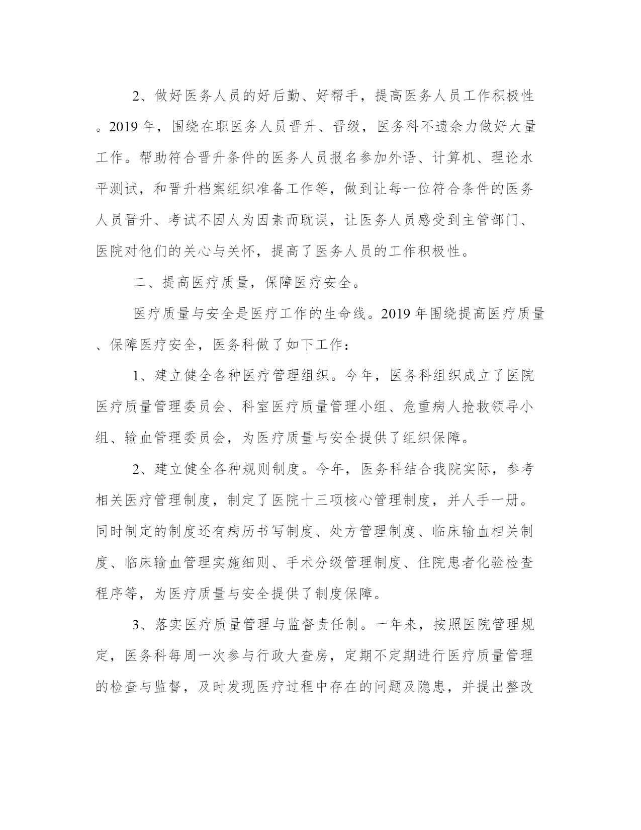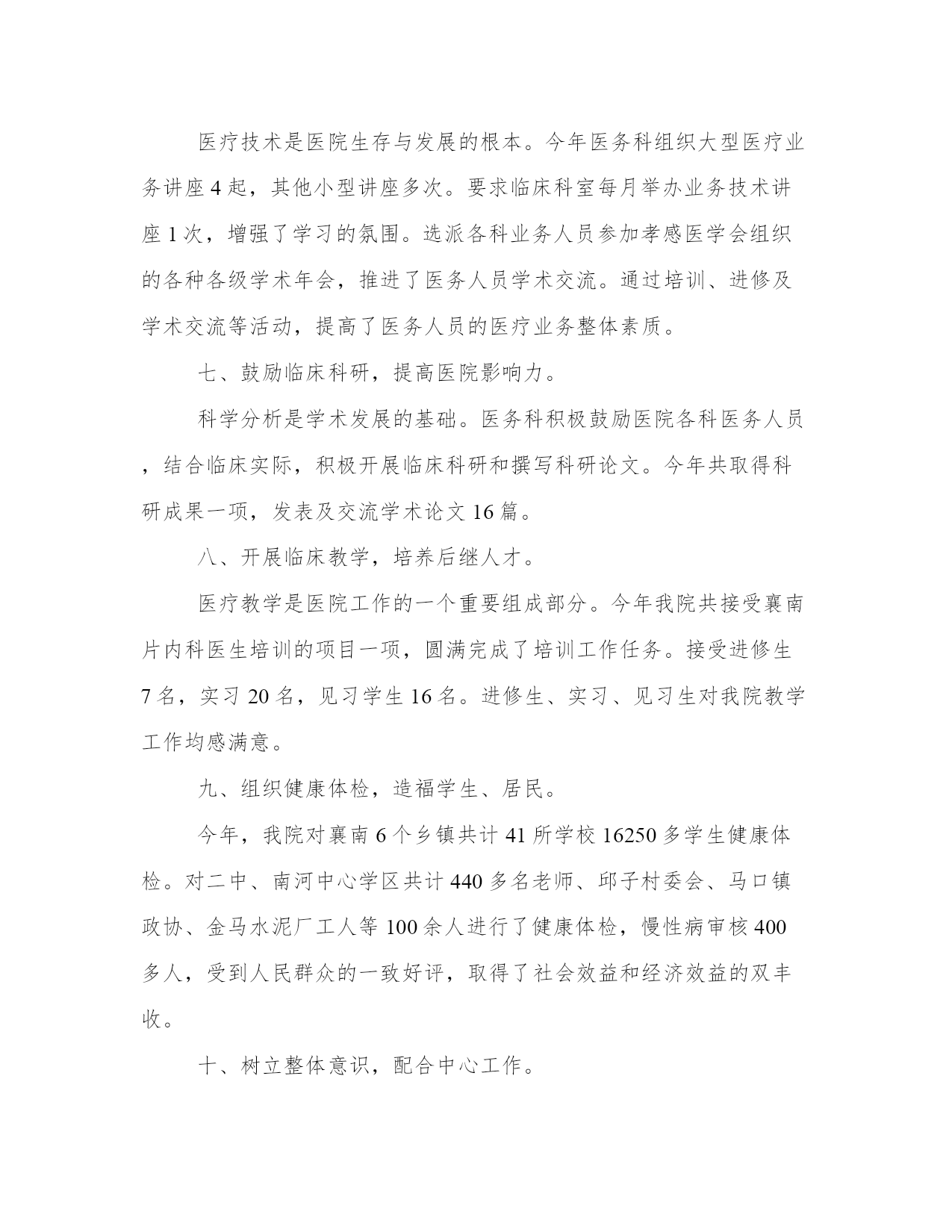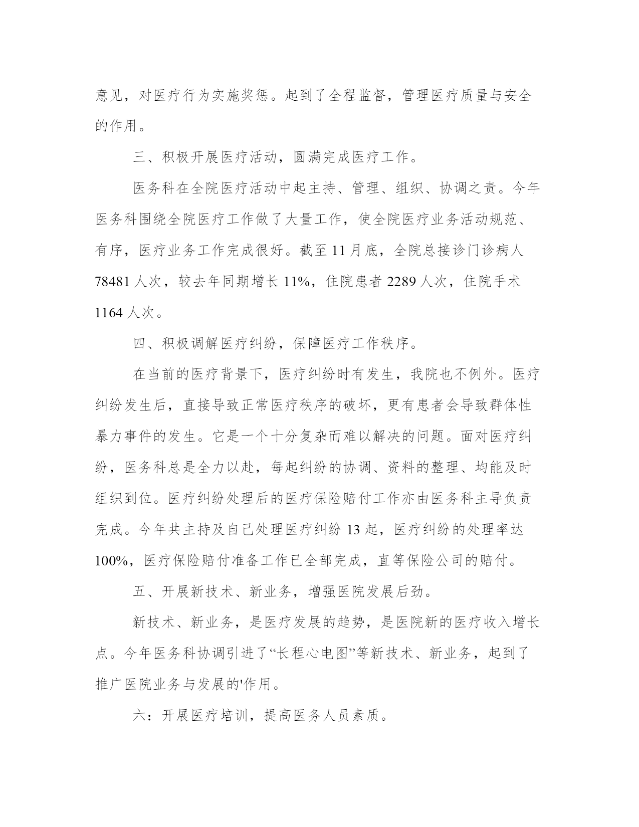 最新医务年终工作总结个人版(汇总8篇)当工作或学习进行到一定阶段或告一段落时,需要回过头来对所做的工作认真地分析分析一下,肯定成绩,找出问题,归纳出经验教训,提高认识,明确方向,以便进一步做好工作,并把这些用文字表述出来,就叫做总结。那么我们该如何写一篇较为完美的总结呢?下面是小编为大家带来的总结书优秀范文,希望大家可以喜欢。医务年终工作总结个人版篇一本站发布医务科年终工作总结,更多医务科年终工作总结相关信息请访问本站工作总结频道。2019年即将过去,在这一年里,医务科在院长、分管院长的领导下,围绕以人为本、科学发展,维护医疗质量与安全,不断学习、提高人员素质等方面作了一些工作,现总结如下:一、树立以人为本,做到科学发展。科学技术是第一生产力。2019年医务科围绕以人为本,科学发展做了大量工作:1、建立医务人员技术档案。今年,医务科通过策划运作,收集、整理了全院医、药、护、技人员档案,做到每人一份技术档案,存放于专用档案框中。同时制作了电子档案,更加全面地了解了全院医务人员技术结构,方便了医院的管理,为他们晋升、晋级、进修、培训提供了便捷与保障。2、做好医务人员的好后勤、好帮手,提高医务人员工作积极性。2019年,围绕在职医务人员晋升、晋级,医务科不遗余力做好大量工作。帮助符合晋升条件的医务人员报名参加外语、计算机、理论水平测试,和晋升档案组织准备工作等,做到让每一位符合条件的医务人员晋升、考试不因人为因素而耽误,让医务人员感受到主管部门、医院对他们的关心与关怀,提高了医务人员的工作积极性。二、提高医疗质量,保障医疗安全。医疗质量与安全是医疗工作的生命线。2019年围绕提高医疗质量、保障医疗安全,医务科做了如下工作:1、建立健全各种医疗管理组织。今年,医务科组织成立了医院医疗质量管理委员会、科室医疗质量管理小组、危重病人抢救领导小组、输血管理委员会,为医疗质量与安全提供了组织保障。2、建立健全各种规则制度。今年,医务科结合我院实际,参考相关医疗管理制度,制定了医院十三项核心管理制度,并人手一册。同时制定的制度还有病历书写制度、处方管理制度、临床输血相关制度、临床输血管理实施细则、手术分级管理制度、住院患者化验检查程序等,为医疗质量与安全提供了制度保障。3、落实医疗质量管理与监督责任制。一年来,按照医院管理规定,医务科每周一次参与行政大查房,定期不定期进行医疗质量管理的检查与监督,及时发现医疗过程中存在的问题及隐患,并提出整改意见,对医疗行为实施奖惩。起到了全程监督,管理医疗质量与安全的作用。三、积极开展医疗活动,圆满完成医疗工作。医务科在全院医疗活动中起主持、管理、组织、协调之责。今年医务科围绕全院医疗工作做了大量工作,使全院医疗业务活动规范、有序,医疗业务工作完成很好。截至11月底,全院总接诊门诊病人78481人次,较去年同期增长11%,住院患者2289人次,住院手术1164人次。四、积极调解医疗纠纷,保障医疗工作秩序。在当前的医疗背景下,医疗纠纷时有发生,我院也不例外。医疗纠纷发生后,直接导致正常医疗秩序的破坏,更有患者会导致群体性暴力事件的发生。它是一个十分复杂而难以解决的问题。面对医疗纠纷,医务科总是全力以赴,每起纠纷的协调、资料的整理、均能及时组织到位。医疗纠纷处理后的医疗保险赔付工作亦由医务科主导负责完成。今年共主持及自己处理医疗纠纷13起,医疗纠纷的处理率达100%,医疗保险赔付准备工作已全部完成,直等保险公司的赔付。五、开展新技术、新业务,增强医院发展后劲。新技术、新业务,是医疗发展的趋势,是医院新的医疗收入增长点。今年医务科协调引进了“长程心电图”等新技术、新业务,起到了推广医院业务与发展的'作用。六:开展医疗培训,提高医务人员素质。医疗技术是医院生存与发展的根本。今年医务科组织大型医疗业务讲座4起,其他小型讲座多次。要求临床科室每月举办业务技术讲座1次,增强了学习的氛围。选派各科业务人员参加孝感医学会组织的各种各级学术年会,推进了医务人员学术交流。通过培训、进修及学术交流等活动,提高了医务人员的医疗业务整体素质。七、鼓励临床科研,提高医院影响力。科学分析是学术发展的基础。医务科积极鼓励医院各科医务人员,结合临床实际,积极开展临床科研和撰写科研论文。今年共取得科研成果一项,发表及交流学术论文16篇。八、开展临床教学,培养后继人才。医疗教学是医院工作的一个重要组成部分。今年我院共接受襄南片内科医生培训的项目一项,圆满完成了培训工作任务。接受进修生7名,实习20名,见习学生16名。进修生、实习、见习生对我院教学工作均感满意。九、组织健康体检,造福学生、居民。今年,我院对襄南6个乡镇共计41所学校16250多学生健康体检。对二中、南河中心学区共计440多名老师
