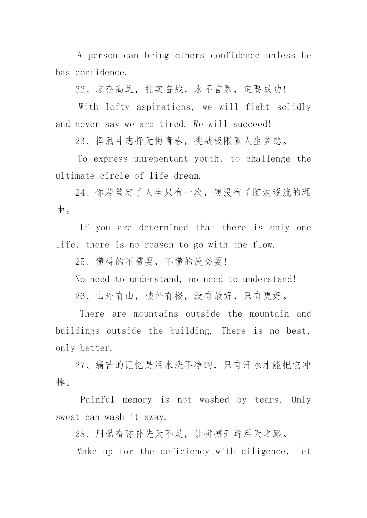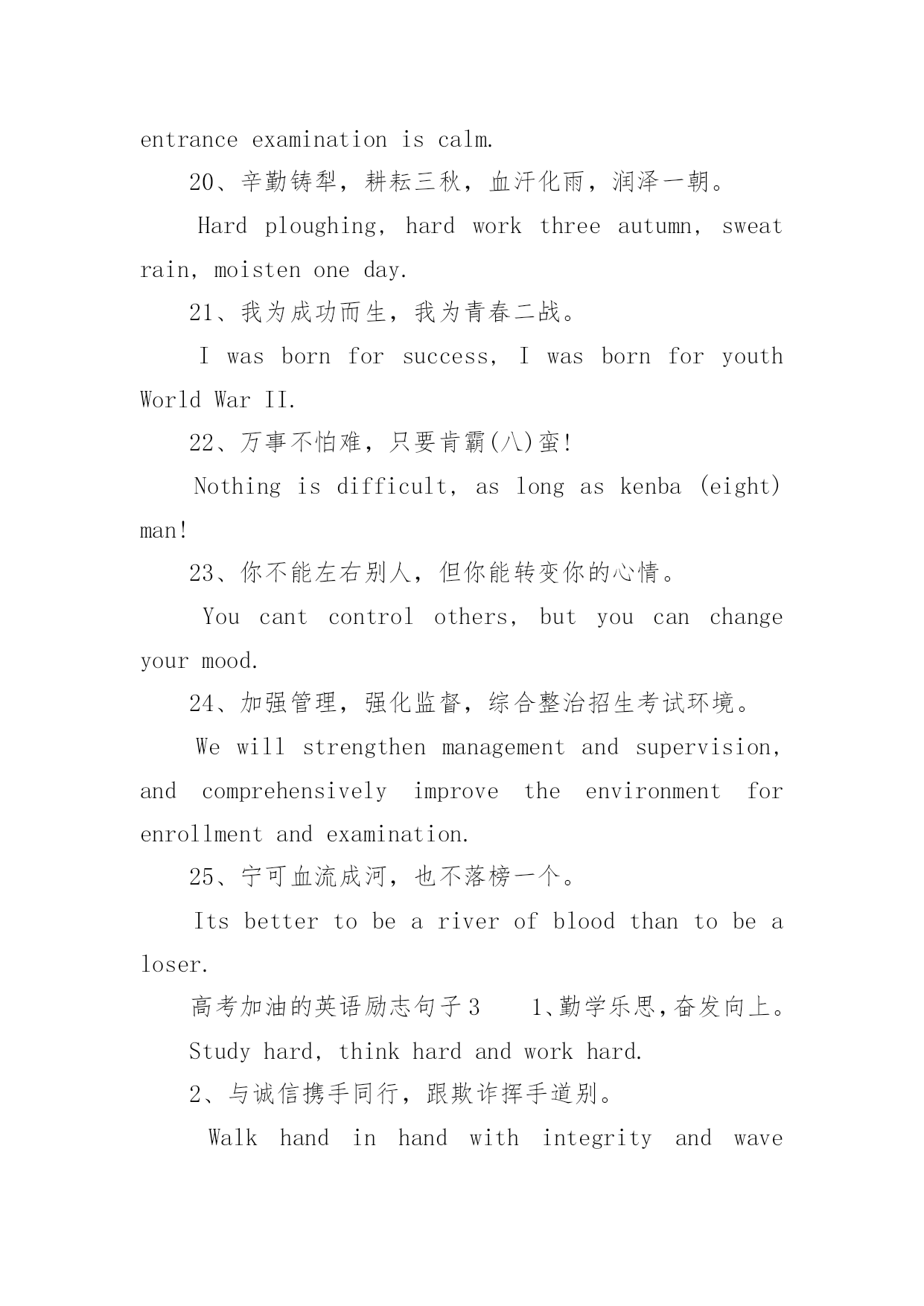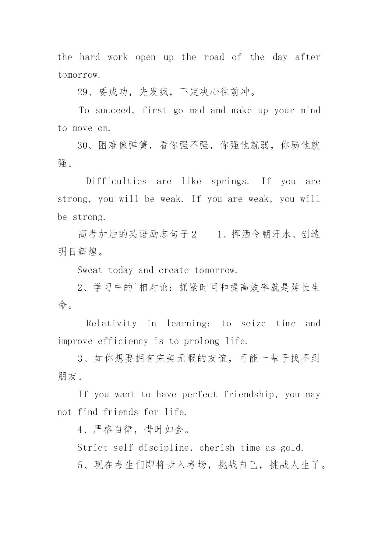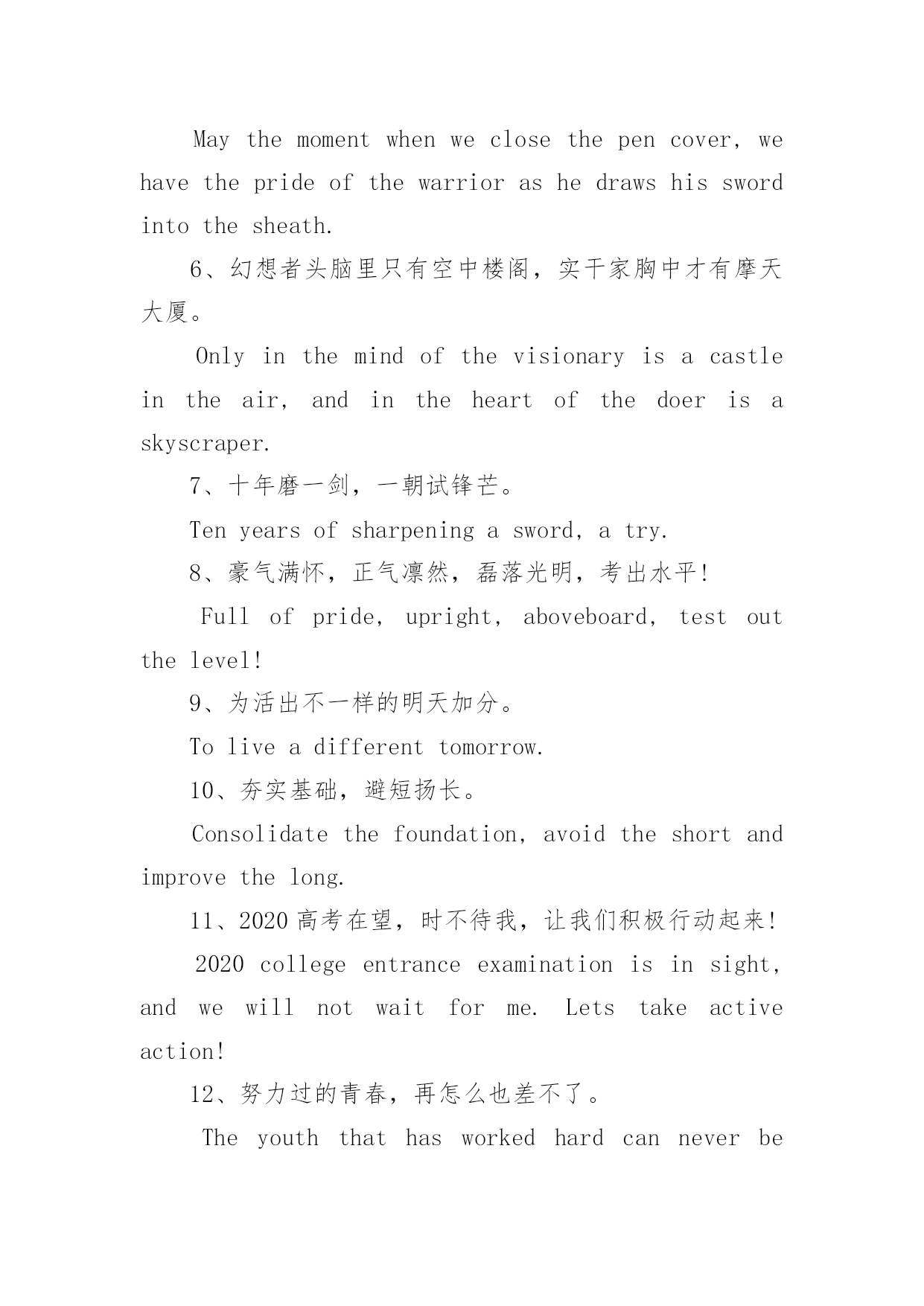 高考加油的英语励志句子高考加油的英语励志句子(精选70句)无论是身处学校还是步入社会,大家都接触过比较经典的句子吧,句子是能够表达一个相对完整的意思,有一定的语调,表示不同的语气,句未有一个较大停顿的语言单位。那什么样的句子才具有启发意义呢?以下是小编整理的高考加油的英语励志句子(精选70句),欢迎阅读,希望大家能够喜欢。高考加油的英语励志句子11、学会生活学会学习,挑战自我直到成功。Learntolive,learntolearn,challengeyourselftosuccess.2、不放过每一点疏漏,不放弃每一分希望。Donotletgoofeveryomission,donotgiveupeveryhope.3、苦战两月终生不悔,迎六月生命无憾。Fightinghardfortwomonths,neverregrettingforlife,andfacingJunewithoutregret.4、你既然认准一条道路,何必去打听要走多久。Sinceyouknowaway,whydoyouhavetoaskhowlongitwilltake.5、愿我们合上笔盖的那一刻,有着武士收刀入鞘般的骄傲。Maythemomentwhenweclosethepencover,wehavetheprideofthewarriorashedrawshisswordintothesheath.6、幻想者头脑里只有空中楼阁,实干家胸中才有摩天大厦。Onlyinthemindofthevisionaryisacastleintheair,andintheheartofthedoerisaskyscraper.7、十年磨一剑,一朝试锋芒。Tenyearsofsharpeningasword,atry.8、豪气满怀,正气凛然,磊落光明,考出水平!Fullofpride,upright,aboveboard,testoutthelevel!9、为活出不一样的明天加分。Toliveadifferenttomorrow.10、夯实基础,避短扬长。Consolidatethefoundation,avoidtheshortandimprovethelong.11、2020高考在望,时不待我,让我们积极行动起来!2020collegeentranceexaminationisinsight,andwewillnotwaitforme.Letstakeactiveaction!12、努力过的青春,再怎么也差不了。Theyouththathasworkedhardcanneverbeworse.13、勇登书山,点点心血勤育英才厚泽九州。YongdengShushan,littleeffortandhardworktocultivatetalentsHouzeKyushu.14、拼搏让过程更加完美,奋斗使结局不留遗憾。Strivetomaketheprocessmoreperfect,struggletoleavenoregrets.15、旗开得胜日,心想事成时。Itsadaytowinwhenyouwanttosucceed.16、张扬乐学乐思的个性,坚守不骄不躁的心态。ZhangYangLespersonalityoflearningandthinkingistosticktotheattitudeofnotarrogantandimpetuous.17、人生最艰难的时候就是离胜利最近的时候。Thehardesttimeinlifeistheclosesttovictory.18、学如才识,不日进,则日退。Learningislikeknowledge.Ifyoudontadvance,youwillretreat.19、不为跑赢世界,只为超越自己。Nottowintheworld,justtosurpassyourself.20、文武之道,一张一弛。Thewayofwritingandmartialartsisrelaxing.21、一个人除非自己有信心,否则带给别人信心。Apersoncanbringothersconfidenceunlesshehasconfidence.22、志存高远,扎实奋战,永不言累,定要成功!Withloftyaspirations,wewillfightsolidlyandneversaywearetired.Wewillsucceed!23、挥洒斗志抒无悔青春,挑战极限圆人生梦想。Toexpressunrepentantyouth,tochallengetheultimatecircleoflifedream.24、你若笃定了人生只有一次,便没有了随波逐流的理由。Ifyouaredeterminedthattherei
