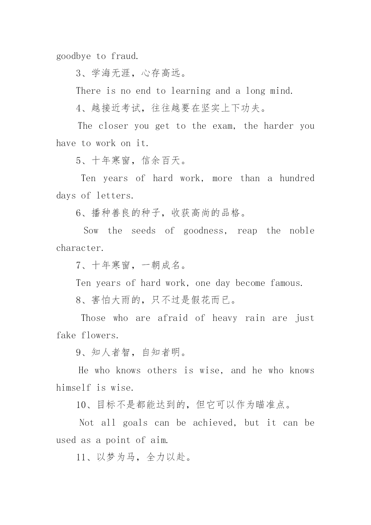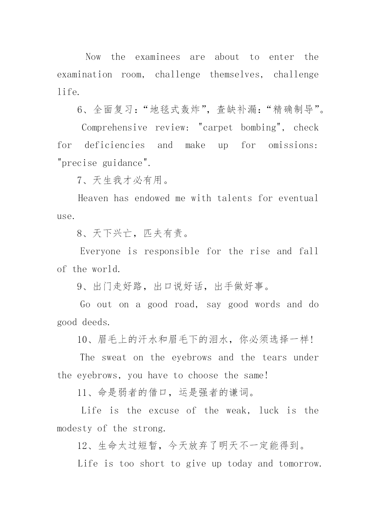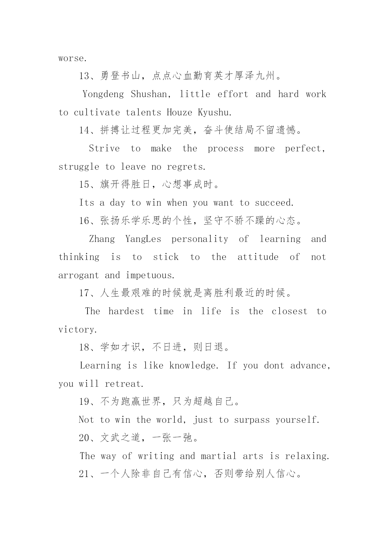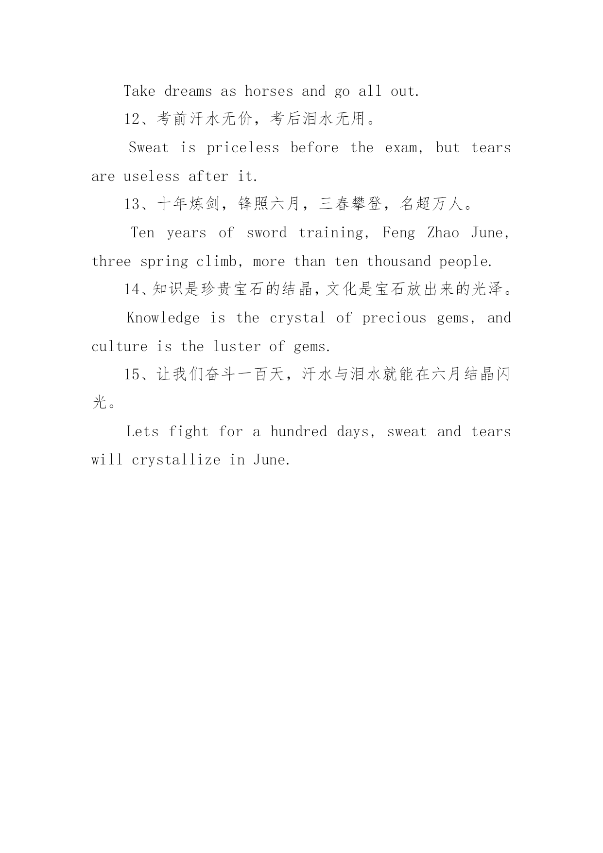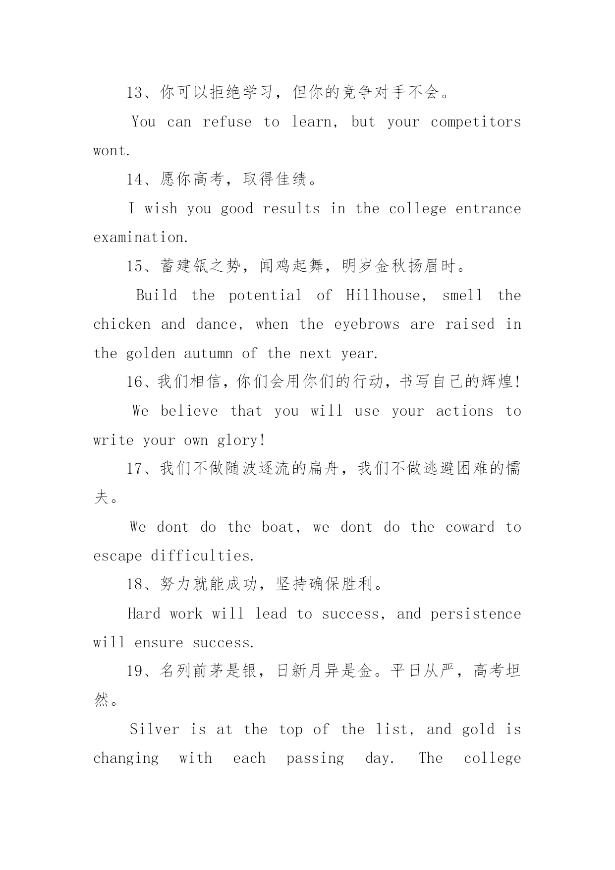 高考加油的英语励志句子高考加油的英语励志句子(精选70句)无论是身处学校还是步入社会,大家都接触过比较经典的句子吧,句子是能够表达一个相对完整的意思,有一定的语调,表示不同的语气,句未有一个较大停顿的语言单位。那什么样的句子才具有启发意义呢?以下是小编整理的高考加油的英语励志句子(精选70句),欢迎阅读,希望大家能够喜欢。高考加油的英语励志句子11、学会生活学会学习,挑战自我直到成功。Learntolive,learntolearn,challengeyourselftosuccess.2、不放过每一点疏漏,不放弃每一分希望。Donotletgoofeveryomission,donotgiveupeveryhope.3、苦战两月终生不悔,迎六月生命无憾。Fightinghardfortwomonths,neverregrettingforlife,andfacingJunewithoutregret.4、你既然认准一条道路,何必去打听要走多久。Sinceyouknowaway,whydoyouhavetoaskhowlongitwilltake.5、愿我们合上笔盖的那一刻,有着武士收刀入鞘般的骄傲。Maythemomentwhenweclosethepencover,wehavetheprideofthewarriorashedrawshisswordintothesheath.6、幻想者头脑里只有空中楼阁,实干家胸中才有摩天大厦。Onlyinthemindofthevisionaryisacastleintheair,andintheheartofthedoerisaskyscraper.7、十年磨一剑,一朝试锋芒。Tenyearsofsharpeningasword,atry.8、豪气满怀,正气凛然,磊落光明,考出水平!Fullofpride,upright,aboveboard,testoutthelevel!9、为活出不一样的明天加分。Toliveadifferenttomorrow.10、夯实基础,避短扬长。Consolidatethefoundation,avoidtheshortandimprovethelong.11、2020高考在望,时不待我,让我们积极行动起来!2020collegeentranceexaminationisinsight,andwewillnotwaitforme.Letstakeactiveaction!12、努力过的青春,再怎么也差不了。Theyouththathasworkedhardcanneverbeworse.13、勇登书山,点点心血勤育英才厚泽九州。YongdengShushan,littleeffortandhardworktocultivatetalentsHouzeKyushu.14、拼搏让过程更加完美,奋斗使结局不留遗憾。Strivetomaketheprocessmoreperfect,struggletoleavenoregrets.15、旗开得胜日,心想事成时。Itsadaytowinwhenyouwanttosucceed.16、张扬乐学乐思的个性,坚守不骄不躁的心态。ZhangYangLespersonalityoflearningandthinkingistosticktotheattitudeofnotarrogantandimpetuous.17、人生最艰难的时候就是离胜利最近的时候。Thehardesttimeinlifeistheclosesttovictory.18、学如才识,不日进,则日退。Learningislikeknowledge.Ifyoudontadvance,youwillretreat.19、不为跑赢世界,只为超越自己。Nottowintheworld,justtosurpassyourself.20、文武之道,一张一弛。Thewayofwritingandmartialartsisrelaxing.21、一个人除非自己有信心,否则带给别人信心。Apersoncanbringothersconfidenceunlesshehasconfidence.22、志存高远,扎实奋战,永不言累,定要成功!Withloftyaspirations,wewillfightsolidlyandneversaywearetired.Wewillsucceed!23、挥洒斗志抒无悔青春,挑战极限圆人生梦想。Toexpressunrepentantyouth,tochallengetheultimatecircleoflifedream.24、你若笃定了人生只有一次,便没有了随波逐流的理由。Ifyouaredeterminedthattherei