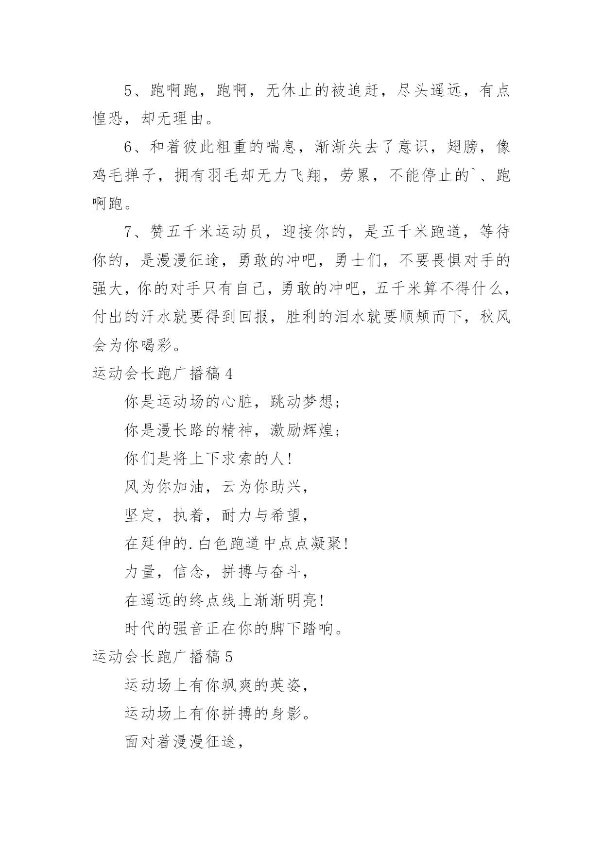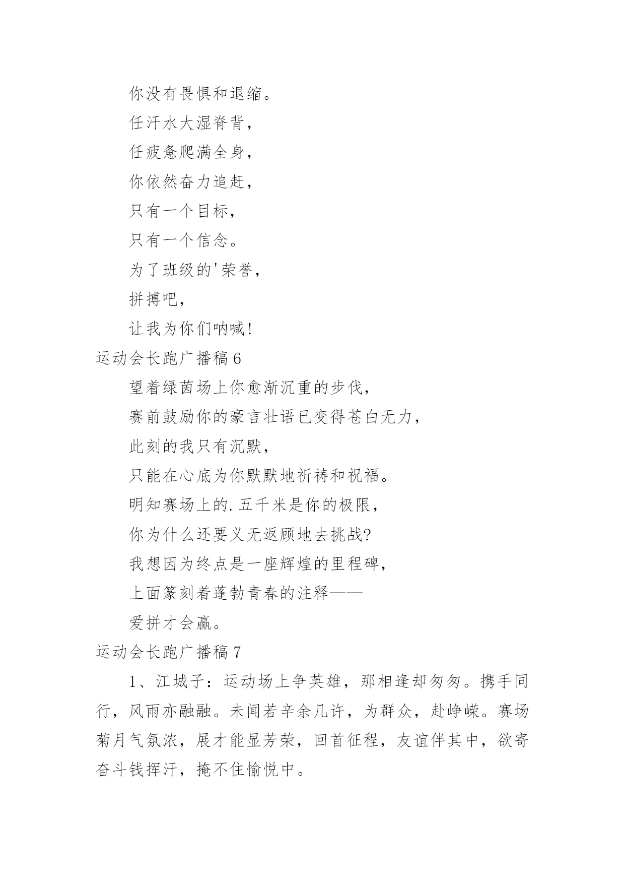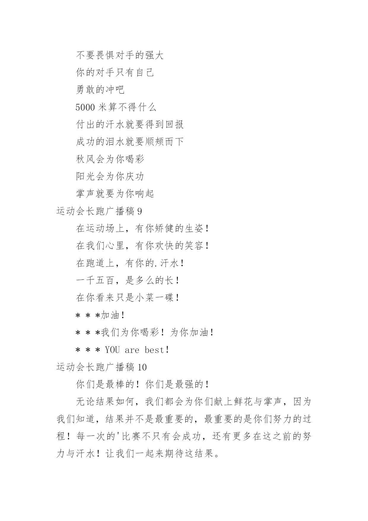 运动会长跑广播稿运动会长跑广播稿合集13篇有在学校广播站锻炼的学生,广播前都会提前准备好广播稿,好的广播稿会带来更好的广播效果,来参考自己需要的广播稿吧!以下是小编精心整理的运动会长跑广播稿,仅供参考,欢迎大家阅读。运动会长跑广播稿1洒一把艰辛的汗水,继续抬起疲倦的脚步,爆发的一吼气贯长虹,继续向前,不论成功与否,你已曾经拥有,曾记否,然你们在场上的时间很短暂,但你们的身影依然停留在人们的.脑海里,因为你们是赛场上最可爱的人,不为掌声的注释,不为刻意的征服,不为失败的痛苦,只有辛勤的汗水化作成功的脚步。在终点欢呼,震惊四周。运动会长跑广播稿2深深的呼吸,等待你的是艰难的`一千五百米。相信成功会属于你们。但在这征途上,需要你用勇敢的心去面对。我们在为你加油,你是否听到了我们发自心中的呐喊?困难和成功都在向你招手,去呀,快去呀,不要犹豫。快去击败困难、快去夺取成功!相信你会送给我们一个汗水浸湿的微笑!运动会长跑广播稿31、这是速度与毅力的接力,这是期望与祈盼的接力,时间在那里凝固,几分几秒也变得如此漫长。千百双眼睛注视着你那矫健的身影,近了,近了,你可曾听到那山呼海啸般的加油声近了,近了,前方就是终点,加油啊,运动员,成功和失败就在转瞬之间。2、老师说,语文老师说,你们很美,是一种回归大自然的天然美;数学老师说,你们很美,那轻盈一跃是对称的美;政治老师说,你们很美,是负出与收获的辩证美;老师说,在古典的文化美后你们有欧式的拼搏美。3、奔向前方,枪声响起,燃起的是你的激情,放飞的是你的理想,你的挥汗付出,在矫健的步伐以后逐一闪亮,纵使艰难,但,奔向前方,唯有它给你掌声。4、唯有它让你傲气昂扬!5、跑啊跑,跑啊,无休止的被追赶,尽头遥远,有点惶恐,却无理由。6、和着彼此粗重的喘息,渐渐失去了意识,翅膀,像鸡毛掸子,拥有羽毛却无力飞翔,劳累,不能停止的`、跑啊跑。7、赞五千米运动员,迎接你的,是五千米跑道,等待你的,是漫漫征途,勇敢的冲吧,勇士们,不要畏惧对手的强大,你的对手只有自己,勇敢的冲吧,五千米算不得什么,付出的汗水就要得到回报,胜利的泪水就要顺颊而下,秋风会为你喝彩。运动会长跑广播稿4你是运动场的心脏,跳动梦想;你是漫长路的精神,激励辉煌;你们是将上下求索的人!风为你加油,云为你助兴,坚定,执着,耐力与希望,在延伸的.白色跑道中点点凝聚!力量,信念,拼搏与奋斗,在遥远的终点线上渐渐明亮!时代的强音正在你的脚下踏响。运动会长跑广播稿5运动场上有你飒爽的英姿,运动场上有你拼搏的身影。面对着漫漫征途,你没有畏惧和退缩。任汗水大湿脊背,任疲惫爬满全身,你依然奋力追赶,只有一个目标,只有一个信念。为了班级的'荣誉,拼搏吧,让我为你们呐喊!运动会长跑广播稿6望着绿茵场上你愈渐沉重的步伐,赛前鼓励你的豪言壮语已变得苍白无力,此刻的我只有沉默,只能在心底为你默默地祈祷和祝福。明知赛场上的.五千米是你的极限,你为什么还要义无返顾地去挑战?我想因为终点是一座辉煌的里程碑,上面篆刻着蓬勃青春的注释——爱拼才会赢。运动会长跑广播稿71、江城子:运动场上争英雄,那相逢却匆匆。携手同行,风雨亦融融。未闻若辛余几许,为群众,赴峥嵘。赛场菊月气氛浓,展才能显芳荣,回首征程,友谊伴其中,欲寄奋斗钱挥汗,掩不住愉悦中。2、自信就是期望:是种子就该有绿色的期望,是种子就该有金色的梦想,不要躺在封闭的暖房,怕什么秋日薄薄的风霜,既然已走上了运动场,心里就不要多想,跑道已洒满阳光,不要羞涩不要紧张,听秋雁在空中为你歌唱,快去拾取片片金黄,充满信心,就有期望。3、赞啦啦队:几许真诚的鼓励,几句亲切的问候,几注深情的目光,几多支持与帮忙,带给运动员的是信心,是勇气,是誓夺第一的决心和毅力。几句呐喊,几束鲜花,阵阵锣鼓,片片掌声,带给运动员的是满足,是感激,是成功后的.喜悦和快意。多谢你,我们的啦啦队!4、有多少次挥汗如雨,伤痛曾添满记忆,只因为始终相信,去拼搏才能胜利。总在鼓舞自己,要成功就得努力。热血在赛场沸腾,巨人在赛场升起。相信自己,你将赢得胜利,创造奇迹;相信自己,梦想在你手中,这是你的天地。当一切过去,你们将是第一。相信自己,你们将超越极限,超越自己!相信自己,加油吧,健儿们,相信你自己。5、来吧,现在才是关键,把脆弱放在一边。抓不住机会的你,上不了最前线。踏上雪白跑线,把头发甩到后边。能量化成流汗,让我疯狂呐喊。相信我的预感,一定第一个撞线,定睛向你看,心情便会HIGH到极度点。运动会长跑广播稿8迎接你的,是5000米跑道等待你的,是漫漫征途勇敢的.冲吧,勇士们不要畏惧对手的强大你的对手只有自己勇敢的冲吧5000米算不得什么付出的汗水就要得到回报成功的泪水就要顺颊而下秋风会为你喝彩阳光会为你庆功掌声就要为你响起运动会长跑广播稿9在运动场上,有你矫健的生姿!