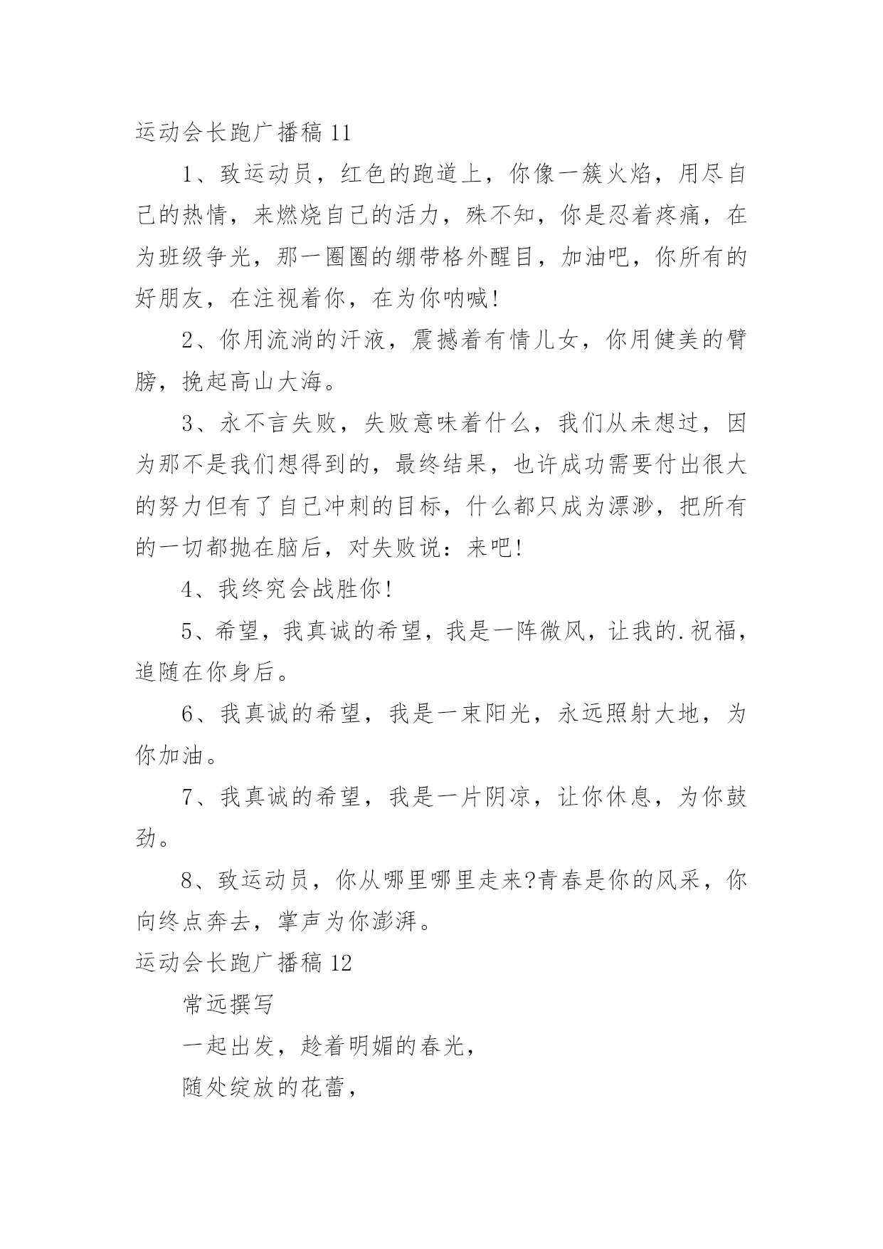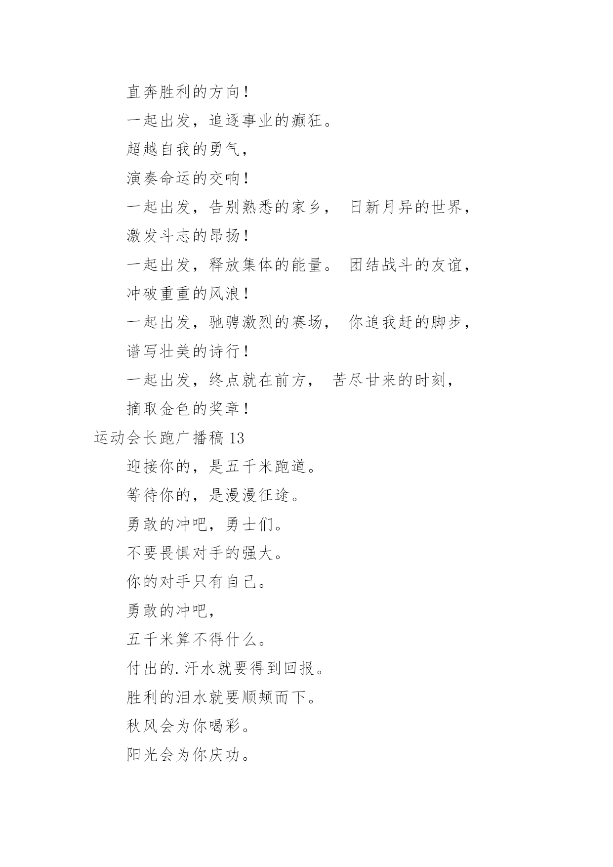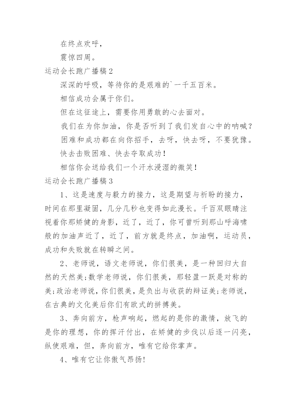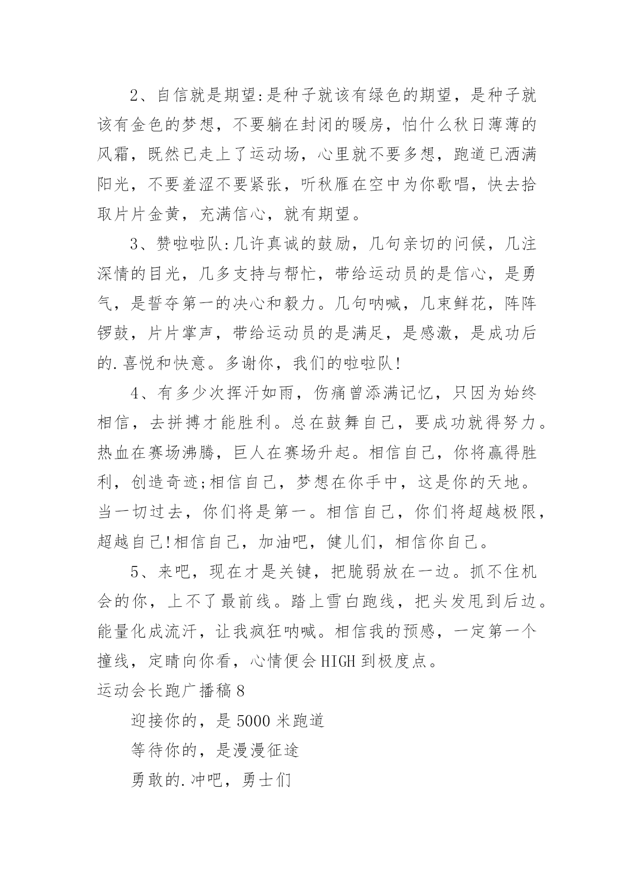 运动会长跑广播稿运动会长跑广播稿合集13篇有在学校广播站锻炼的学生,广播前都会提前准备好广播稿,好的广播稿会带来更好的广播效果,来参考自己需要的广播稿吧!以下是小编精心整理的运动会长跑广播稿,仅供参考,欢迎大家阅读。运动会长跑广播稿1洒一把艰辛的汗水,继续抬起疲倦的脚步,爆发的一吼气贯长虹,继续向前,不论成功与否,你已曾经拥有,曾记否,然你们在场上的时间很短暂,但你们的身影依然停留在人们的.脑海里,因为你们是赛场上最可爱的人,不为掌声的注释,不为刻意的征服,不为失败的痛苦,只有辛勤的汗水化作成功的脚步。在终点欢呼,震惊四周。运动会长跑广播稿2深深的呼吸,等待你的是艰难的`一千五百米。相信成功会属于你们。但在这征途上,需要你用勇敢的心去面对。我们在为你加油,你是否听到了我们发自心中的呐喊?困难和成功都在向你招手,去呀,快去呀,不要犹豫。快去击败困难、快去夺取成功!相信你会送给我们一个汗水浸湿的微笑!运动会长跑广播稿31、这是速度与毅力的接力,这是期望与祈盼的接力,时间在那里凝固,几分几秒也变得如此漫长。千百双眼睛注视着你那矫健的身影,近了,近了,你可曾听到那山呼海啸般的加油声近了,近了,前方就是终点,加油啊,运动员,成功和失败就在转瞬之间。2、老师说,语文老师说,你们很美,是一种回归大自然的天然美;数学老师说,你们很美,那轻盈一跃是对称的美;政治老师说,你们很美,是负出与收获的辩证美;老师说,在古典的文化美后你们有欧式的拼搏美。3、奔向前方,枪声响起,燃起的是你的激情,放飞的是你的理想,你的挥汗付出,在矫健的步伐以后逐一闪亮,纵使艰难,但,奔向前方,唯有它给你掌声。4、唯有它让你傲气昂扬!5、跑啊跑,跑啊,无休止的被追赶,尽头遥远,有点惶恐,却无理由。6、和着彼此粗重的喘息,渐渐失去了意识,翅膀,像鸡毛掸子,拥有羽毛却无力飞翔,劳累,不能停止的`、跑啊跑。7、赞五千米运动员,迎接你的,是五千米跑道,等待你的,是漫漫征途,勇敢的冲吧,勇士们,不要畏惧对手的强大,你的对手只有自己,勇敢的冲吧,五千米算不得什么,付出的汗水就要得到回报,胜利的泪水就要顺颊而下,秋风会为你喝彩。运动会长跑广播稿4你是运动场的心脏,跳动梦想;你是漫长路的精神,激励辉煌;你们是将上下求索的人!风为你加油,云为你助兴,坚定,执着,耐力与希望,在延伸的.白色跑道中点点凝聚!力量,信念,拼搏与奋斗,在遥远的终点线上渐渐明亮!时代的强音正在你的脚下踏响。运动会长跑广播稿5运动场上有你飒爽的英姿,运动场上有你拼搏的身影。面对着漫漫征途,你没有畏惧和退缩。任汗水大湿脊背,任疲惫爬满全身,你依然奋力追赶,只有一个目标,只有一个信念。为了班级的'荣誉,拼搏吧,让我为你们呐喊!运动会长跑广播稿6望着绿茵场上你愈渐沉重的步伐,赛前鼓励你的豪言壮语已变得苍白无力,此刻的我只有沉默,只能在心底为你默默地祈祷和祝福。明知赛场上的.五千米是你的极限,你为什么还要义无返顾地去挑战?我想因为终点是一座辉煌的里程碑,上面篆刻着蓬勃青春的注释——爱拼才会赢。运动会长跑广播稿71、江城子:运动场上争英雄,那相逢却匆匆。携手同行,风雨亦融融。未闻若辛余几许,为群众,赴峥嵘。赛场菊月气氛浓,展才能显芳荣,回首征程,友谊伴其中,欲寄奋斗钱挥汗,掩不住愉悦中。2、自信就是期望:是种子就该有绿色的期望,是种子就该有金色的梦想,不要躺在封闭的暖房,怕什么秋日薄薄的风霜,既然已走上了运动场,心里就不要多想,跑道已洒满阳光,不要羞涩不要紧张,听秋雁在空中为你歌唱,快去拾取片片金黄,充满信心,就有期望。3、赞啦啦队:几许真诚的鼓励,几句亲切的问候,几注深情的目光,几多支持与帮忙,带给运动员的是信心,是勇气,是誓夺第一的决心和毅力。几句呐喊,几束鲜花,阵阵锣鼓,片片掌声,带给运动员的是满足,是感激,是成功后的.喜悦和快意。多谢你,我们的啦啦队!4、有多少次挥汗如雨,伤痛曾添满记忆,只因为始终相信,去拼搏才能胜利。总在鼓舞自己,要成功就得努力。热血在赛场沸腾,巨人在赛场升起。相信自己,你将赢得胜利,创造奇迹;相信自己,梦想在你手中,这是你的天地。当一切过去,你们将是第一。相信自己,你们将超越极限,超越自己!相信自己,加油吧,健儿们,相信你自己。5、来吧,现在才是关键,把脆弱放在一边。抓不住机会的你,上不了最前线。踏上雪白跑线,把头发甩到后边。能量化成流汗,让我疯狂呐喊。相信我的预感,一定第一个撞线,定睛向你看,心情便会HIGH到极度点。运动会长跑广播稿8迎接你的,是5000米跑道等待你的,是漫漫征途勇敢的.冲吧,勇士们不要畏惧对手的强大你的对手只有自己勇敢的冲吧5000米算不得什么付出的汗水就要得到回报成功的泪水就要顺颊而下秋风会为你喝彩阳光会为你庆功掌声就要为你响起运动会长跑广播稿9在运动场上,有你矫健的生姿!
