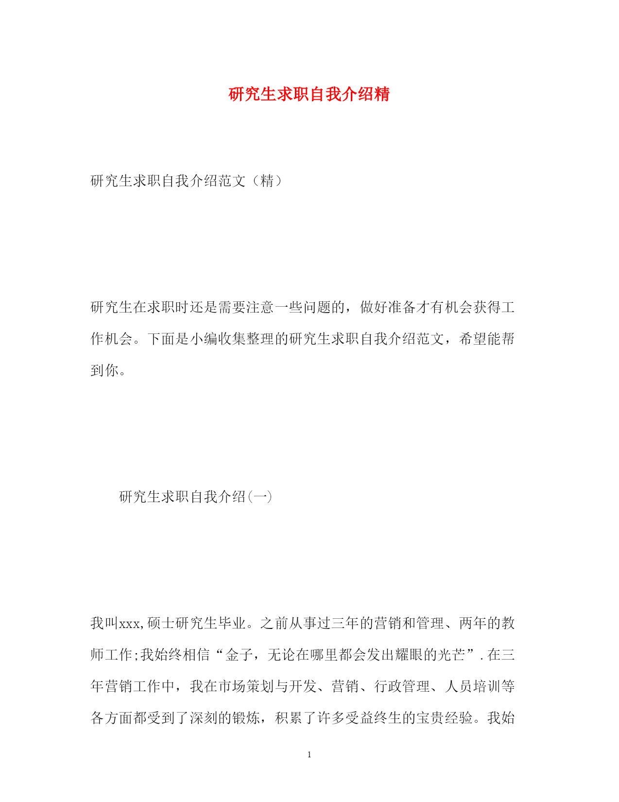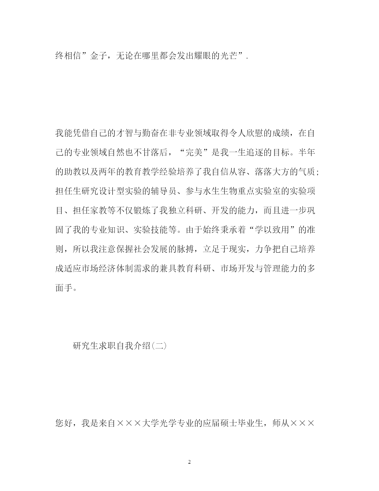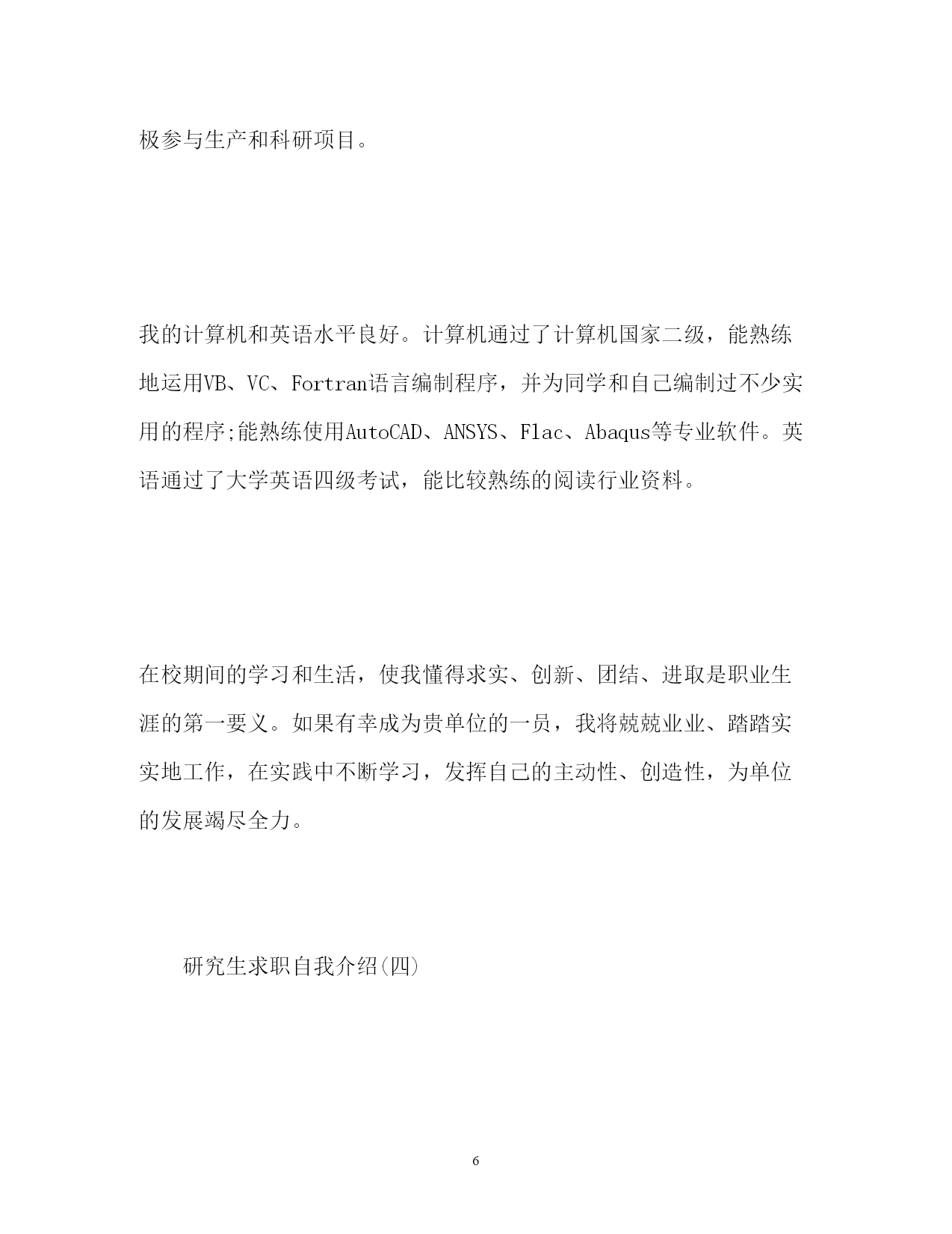 此资料由网络收集而来,如有侵权请告知上传者立即删除。资料共分享,我们负责传递知识。PAGEPAGE8研究生求职自我介绍精研究生求职自我介绍范文(精)研究生在求职时还是需要注意一些问题的,做好准备才有机会获得工作机会。下面是小编收集整理的研究生求职自我介绍范文,希望能帮到你。研究生求职自我介绍(一)我叫xxx,硕士研究生毕业。之前从事过三年的营销和管理、两年的教师工作;我始终相信“金子,无论在哪里都会发出耀眼的光芒”.在三年营销工作中,我在市场策划与开发、营销、行政管理、人员培训等各方面都受到了深刻的锻炼,积累了许多受益终生的宝贵经验。我始终相信”金子,无论在哪里都会发出耀眼的光芒”.我能凭借自己的才智与勤奋在非专业领域取得令人欣慰的成绩,在自己的专业领域自然也不甘落后,“完美”是我一生追逐的目标。半年的助教以及两年的教育教学经验培养了我自信从容、落落大方的气质;担任生研究设计型实验的辅导员、参与水生生物重点实验室的实验项目、担任家教等不仅锻炼了我独立科研、开发的能力,而且进一步巩固了我的专业知识、实验技能等。由于始终秉承着“学以致用”的准则,所以我注意保握社会发展的脉搏,立足于现实,力争把自己培养成适应市场经济体制需求的兼具教育科研、市场开发与管理能力的多面手。研究生求职自我介绍(二)您好,我是来自×××大学光学专业的应届硕士毕业生,师从×××大学光学专业×××教授。我想申请的职位是贵校的物理教师。我相信在××大学×××校训的培养下,我有能力接受任何挑战。自入大学以来,我一直重视自身能力和素质的综合培养,不断学习新知识积极参加各种社会实践活动锻炼自己。在本科及研究生的七年时间内,持之以恒地努力,在学习、工作等方面取得了一定的成绩,各方面能力也有了很大的提高。本科期间我认真、扎实的的学习和掌握了基础的专业知识,系统地掌握了物理学方面的相关的理论知识,熟练使用WindowsXP操作系统和办公软件,掌握Word、Powerpoint、Excel、C++等,熟悉Photoshop以及一些常用软件。同时,我利用课余时间广泛地涉猎了大量书籍,不但充实了自己,也培养了自己多方面的技能。更重要的.是,严谨的学风和端正的学习态度塑造了我朴实、稳重、创新的性格特点。本科毕业后我曾在**教育中心任教,从事高一物理教学工作,这是一所正规的辅导学校,在这一年当中我受益颇多,具备了一名教师应有的素质,有一定的授课经验和学生管理能力,我相信这将在我以后的教师工作中起积极的作用,也使我更有信心能够胜任教师这个岗位。研究生阶段,我依然努力学习学科基础知识,积极对课题进行研究和实践,学习与掌握了信号处理的相关知识、激光雷达系统的原理,以及应用小波工具箱和小波程序处理信号等技术,并有望在激光雷达信号处理理论及实验研究上取得突破性进展。并利用实验室的条件积极从事实验研究工作,实验与理论相结合,进一步充实和提高了自己。曾任××大学研究生学生会信息采编团队小组长,参加研究生代表大会、运动会等的宣传、组织和信息采集工作,提高了我的组织和创新能力。还参加的×××大学物理科学与技术学院基础物理实验光学部分的教学工作,我待人诚恳,交际广泛,具有很好的合作能力。我相信经过更多的实践与培训,可以胜任贵校所招聘的工作岗位。我热切地期望能成为贵校中的一员,请在实践中考验我!请给我一次证明的机会!谢谢!研究生求职自我介绍(三)我是XX大学土木工程学院工程力学专业20XX届硕士研究生,将于20XX年6月毕业,很想成为中南勘测设计研究院的一员,谨向您推荐自己。在本科四年和保送研究生的三年期间,本着“艰苦朴素、实事求是、严格要求、勇于探索”的校训严格要求自己,学习刻苦,工作认真,成绩优秀,年年获得奖学金,并积极参加社会实践。系统地学习专业知识的同时广泛地涉猎了大量书籍,不断拓宽知识面和社会阅历,积极参与生产和科研项目。我的计算机和英语水平良好。计算机通过了计算机国家二级,能熟练地运用VB、VC、Fortran语言编制程序,并为同学和自己编制过不少实用的程序;能熟练使用AutoCAD、ANSYS、Flac、Abaqus等专业软件。英语通过了大学英语四级考试,能比较熟练的阅读行业资料。在校期间的学习和生活,使我懂得求实、创新、团结、进取是职业生涯的第一要义。如果有幸成为贵单位的一员,我将兢兢业业、踏踏实实地工作,在实践中不断学习,发挥自己的主动性、创造性,为单位的发展竭尽全力。研究生求职自我介绍(四)我叫xx-x,是本科应届毕业生,就读于浙江财经学院,所学专业是信息管理与信息系统。大学期间,我担任班长一职,经常组织班级活动,培养了良好的人际交往能力。同时,在
