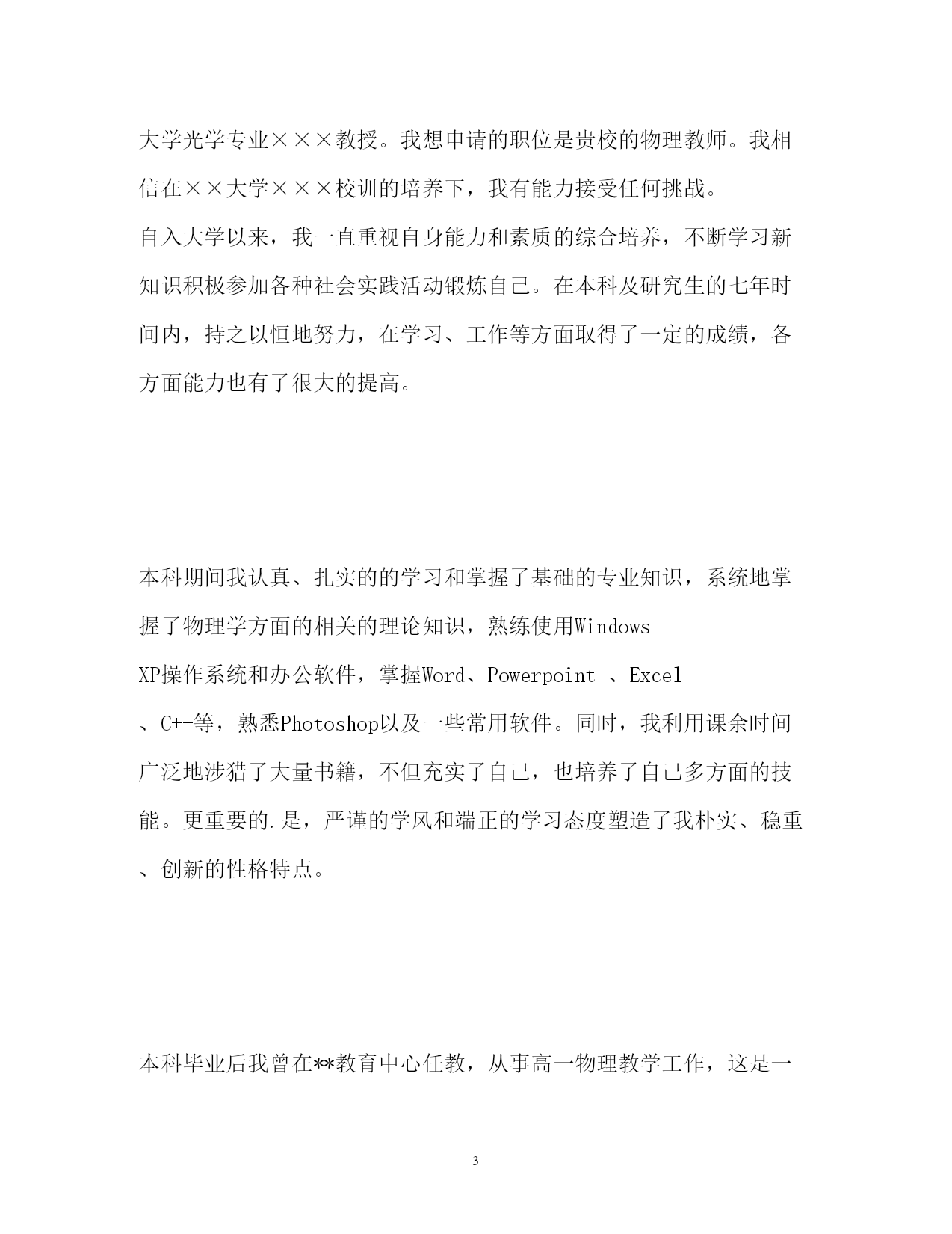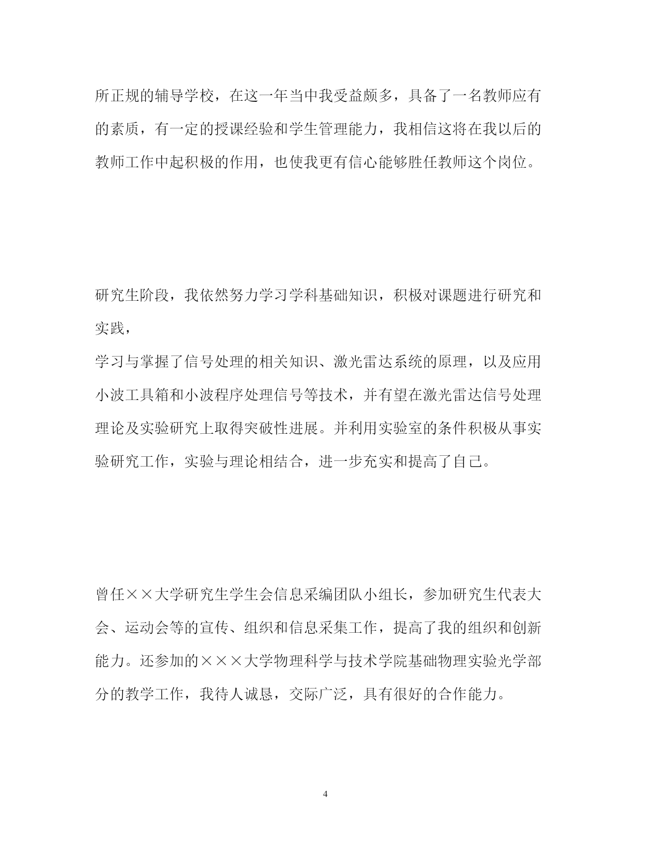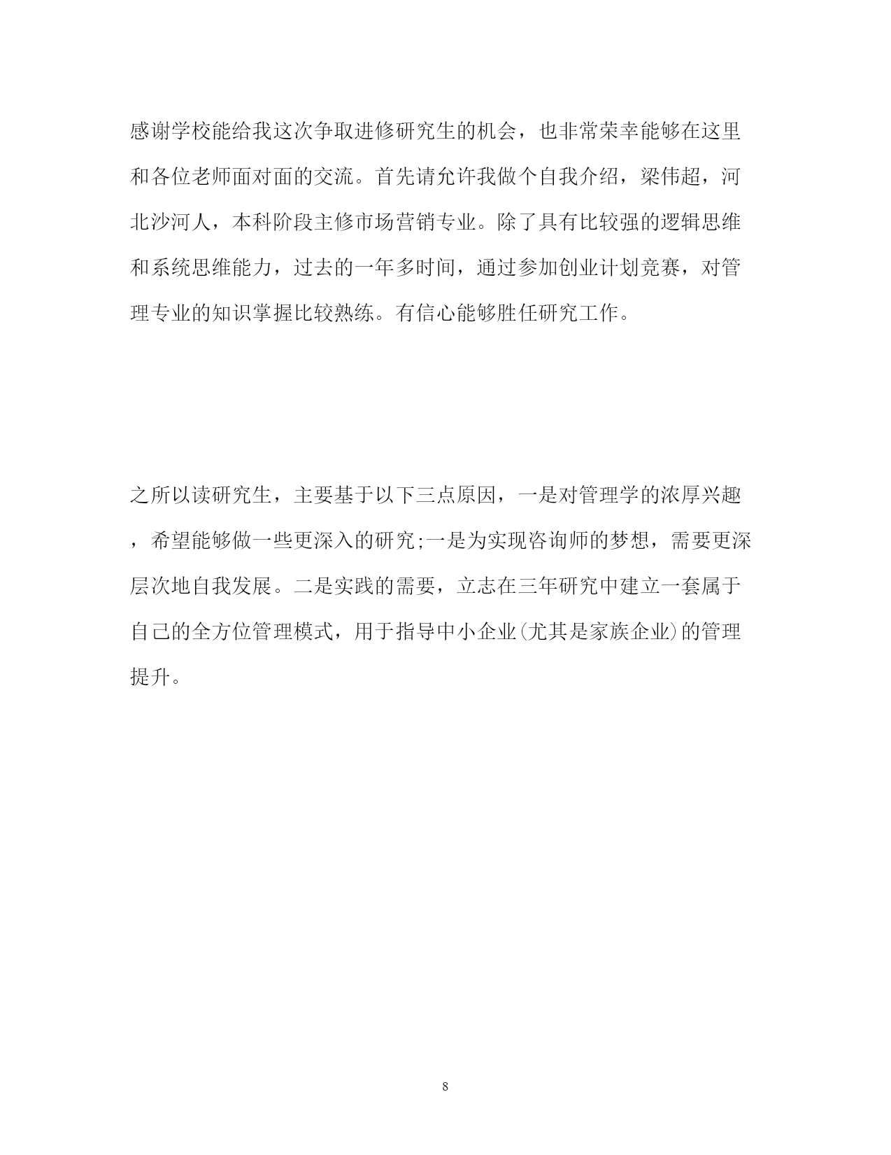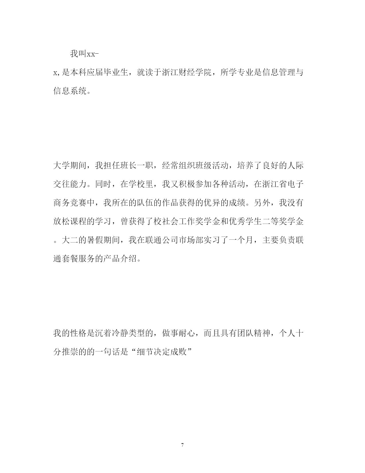 此资料由网络收集而来,如有侵权请告知上传者立即删除。资料共分享,我们负责传递知识。PAGEPAGE8研究生求职自我介绍精研究生求职自我介绍范文(精)研究生在求职时还是需要注意一些问题的,做好准备才有机会获得工作机会。下面是小编收集整理的研究生求职自我介绍范文,希望能帮到你。研究生求职自我介绍(一)我叫xxx,硕士研究生毕业。之前从事过三年的营销和管理、两年的教师工作;我始终相信“金子,无论在哪里都会发出耀眼的光芒”.在三年营销工作中,我在市场策划与开发、营销、行政管理、人员培训等各方面都受到了深刻的锻炼,积累了许多受益终生的宝贵经验。我始终相信”金子,无论在哪里都会发出耀眼的光芒”.我能凭借自己的才智与勤奋在非专业领域取得令人欣慰的成绩,在自己的专业领域自然也不甘落后,“完美”是我一生追逐的目标。半年的助教以及两年的教育教学经验培养了我自信从容、落落大方的气质;担任生研究设计型实验的辅导员、参与水生生物重点实验室的实验项目、担任家教等不仅锻炼了我独立科研、开发的能力,而且进一步巩固了我的专业知识、实验技能等。由于始终秉承着“学以致用”的准则,所以我注意保握社会发展的脉搏,立足于现实,力争把自己培养成适应市场经济体制需求的兼具教育科研、市场开发与管理能力的多面手。研究生求职自我介绍(二)您好,我是来自×××大学光学专业的应届硕士毕业生,师从×××大学光学专业×××教授。我想申请的职位是贵校的物理教师。我相信在××大学×××校训的培养下,我有能力接受任何挑战。自入大学以来,我一直重视自身能力和素质的综合培养,不断学习新知识积极参加各种社会实践活动锻炼自己。在本科及研究生的七年时间内,持之以恒地努力,在学习、工作等方面取得了一定的成绩,各方面能力也有了很大的提高。本科期间我认真、扎实的的学习和掌握了基础的专业知识,系统地掌握了物理学方面的相关的理论知识,熟练使用WindowsXP操作系统和办公软件,掌握Word、Powerpoint、Excel、C++等,熟悉Photoshop以及一些常用软件。同时,我利用课余时间广泛地涉猎了大量书籍,不但充实了自己,也培养了自己多方面的技能。更重要的.是,严谨的学风和端正的学习态度塑造了我朴实、稳重、创新的性格特点。本科毕业后我曾在**教育中心任教,从事高一物理教学工作,这是一所正规的辅导学校,在这一年当中我受益颇多,具备了一名教师应有的素质,有一定的授课经验和学生管理能力,我相信这将在我以后的教师工作中起积极的作用,也使我更有信心能够胜任教师这个岗位。研究生阶段,我依然努力学习学科基础知识,积极对课题进行研究和实践,学习与掌握了信号处理的相关知识、激光雷达系统的原理,以及应用小波工具箱和小波程序处理信号等技术,并有望在激光雷达信号处理理论及实验研究上取得突破性进展。并利用实验室的条件积极从事实验研究工作,实验与理论相结合,进一步充实和提高了自己。曾任××大学研究生学生会信息采编团队小组长,参加研究生代表大会、运动会等的宣传、组织和信息采集工作,提高了我的组织和创新能力。还参加的×××大学物理科学与技术学院基础物理实验光学部分的教学工作,我待人诚恳,交际广泛,具有很好的合作能力。我相信经过更多的实践与培训,可以胜任贵校所招聘的工作岗位。我热切地期望能成为贵校中的一员,请在实践中考验我!请给我一次证明的机会!谢谢!研究生求职自我介绍(三)我是XX大学土木工程学院工程力学专业20XX届硕士研究生,将于20XX年6月毕业,很想成为中南勘测设计研究院的一员,谨向您推荐自己。在本科四年和保送研究生的三年期间,本着“艰苦朴素、实事求是、严格要求、勇于探索”的校训严格要求自己,学习刻苦,工作认真,成绩优秀,年年获得奖学金,并积极参加社会实践。系统地学习专业知识的同时广泛地涉猎了大量书籍,不断拓宽知识面和社会阅历,积极参与生产和科研项目。我的计算机和英语水平良好。计算机通过了计算机国家二级,能熟练地运用VB、VC、Fortran语言编制程序,并为同学和自己编制过不少实用的程序;能熟练使用AutoCAD、ANSYS、Flac、Abaqus等专业软件。英语通过了大学英语四级考试,能比较熟练的阅读行业资料。在校期间的学习和生活,使我懂得求实、创新、团结、进取是职业生涯的第一要义。如果有幸成为贵单位的一员,我将兢兢业业、踏踏实实地工作,在实践中不断学习,发挥自己的主动性、创造性,为单位的发展竭尽全力。研究生求职自我介绍(四)我叫xx-x,是本科应届毕业生,就读于浙江财经学院,所学专业是信息管理与信息系统。大学期间,我担任班长一职,经常组织班级活动,培养了良好的人际交往能力。同时,在