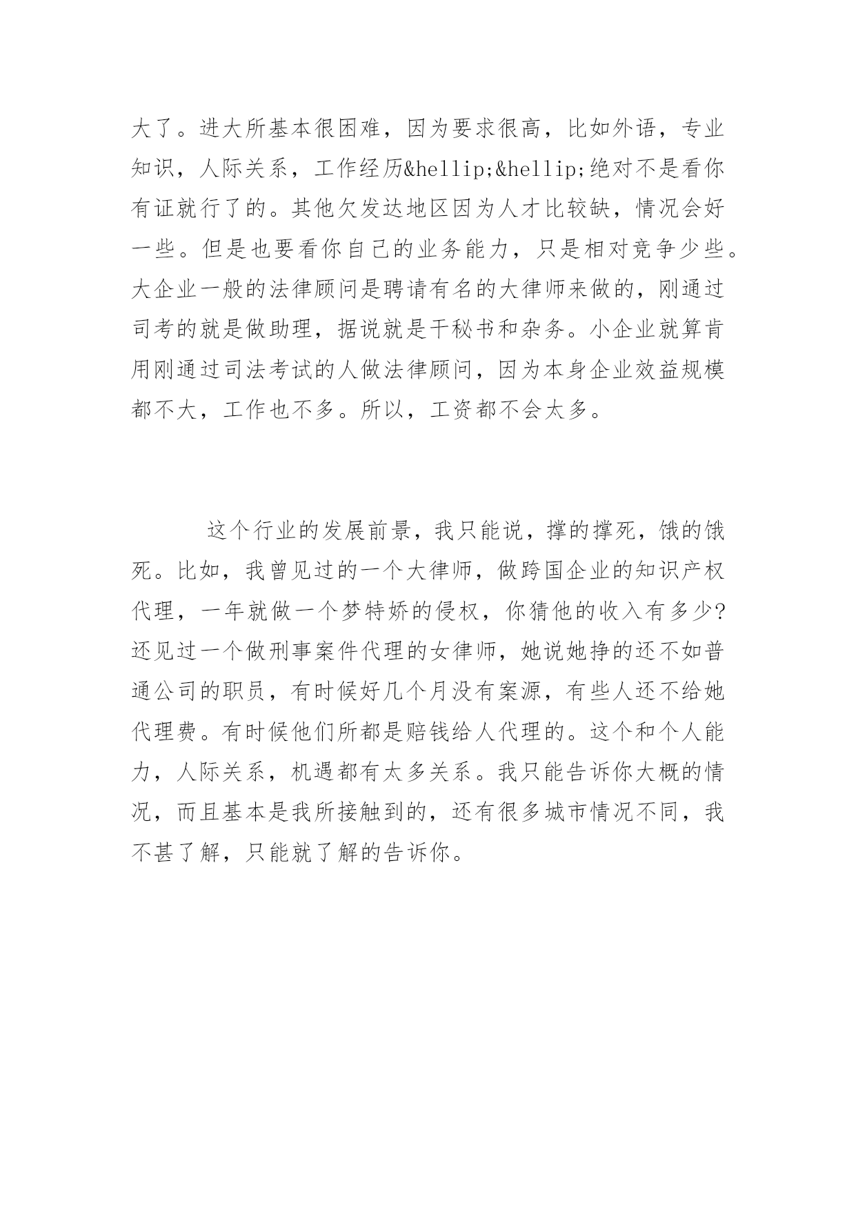 司法考试的含金量司法考试的含金量司法考试的含金量多不多呢?这个要看个人的,每个人都有每个人的想法,以下是小编整理好的司法考试的含金量,希望对你有所表现。司法考试的通过率一直都比较低,一般都是百分之十几的`样子,北京的通过率高于全国整体水平。一般来说通过率越低的证,其难度越大,含金量也就越高。中国的法律从业人员还是不够,但是水平参差,而且地区差异太大。比如上海,北京这样的大城市,分明法律专业的人员有些饱和。同时,中国法律从业人员,高素质经验丰富的人缺极度缺乏,而一些法学毕业生却找不到相关对口单位。具体收入这个没有办法估计。因为各个城市各个系统各个律所相差太大。我只能告诉你北京的大概情况,公检法我就不和你说了,具体情况你大概猜得到。一般律师助理和实习律师,小所的800-3000不等,大所至少2000以上。如果有案源拿提成,收入弹性就比较大了。进大所基本很困难,因为要求很高,比如外语,专业知识,人际关系,工作经历……绝对不是看你有证就行了的。其他欠发达地区因为人才比较缺,情况会好一些。但是也要看你自己的业务能力,只是相对竞争少些。大企业一般的法律顾问是聘请有名的大律师来做的,刚通过司考的就是做助理,据说就是干秘书和杂务。小企业就算肯用刚通过司法考试的人做法律顾问,因为本身企业效益规模都不大,工作也不多。所以,工资都不会太多。这个行业的发展前景,我只能说,撑的撑死,饿的饿死。比如,我曾见过的一个大律师,做跨国企业的知识产权代理,一年就做一个梦特娇的侵权,你猜他的收入有多少?还见过一个做刑事案件代理的女律师,她说她挣的还不如普通公司的职员,有时候好几个月没有案源,有些人还不给她代理费。有时候他们所都是赔钱给人代理的。这个和个人能力,人际关系,机遇都有太多关系。我只能告诉你大概的情况,而且基本是我所接触到的,还有很多城市情况不同,我不甚了解,只能就了解的告诉你。