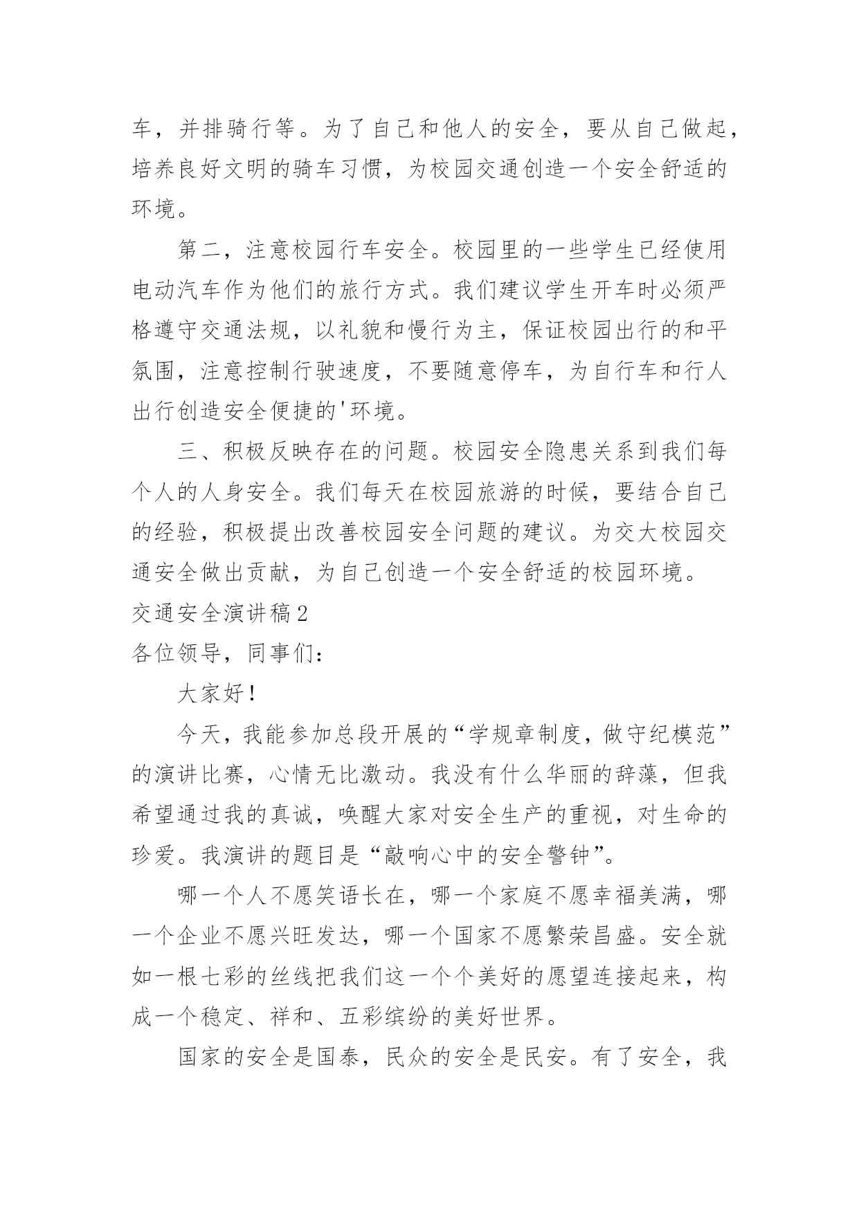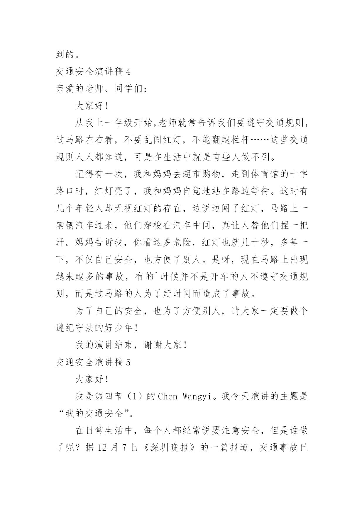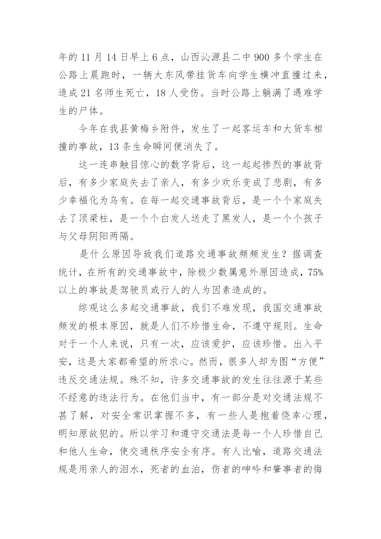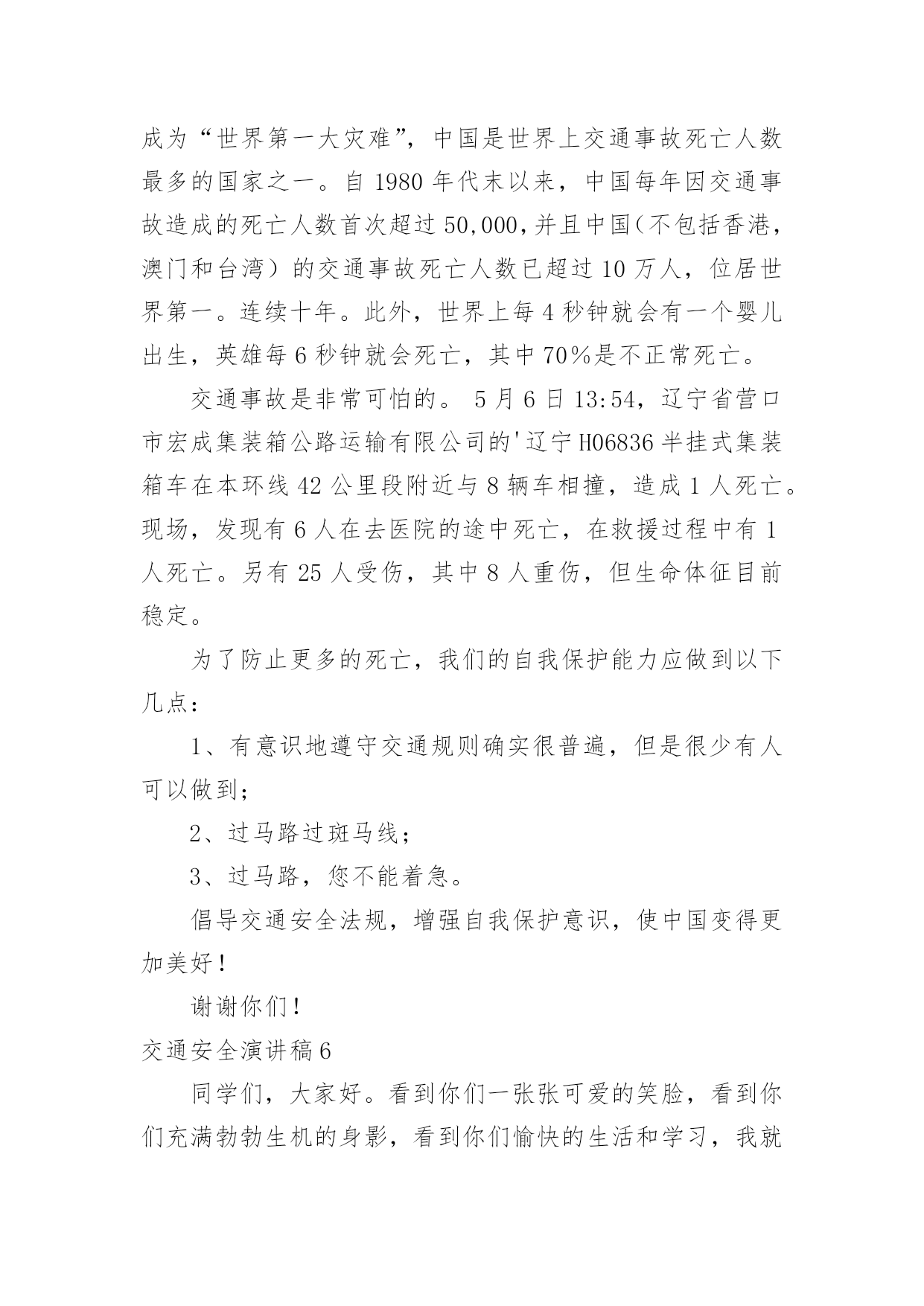 交通安全演讲稿交通安全演讲稿(集合15篇)演讲稿以发表意见,表达观点为主,是为演讲而事先准备好的文稿。在当下社会,在很多情况下我们需要用到演讲稿,来参考自己需要的演讲稿吧!下面是小编整理的交通安全演讲稿,欢迎大家借鉴与参考,希望对大家有所帮助。交通安全演讲稿1亲爱的同学们:当我们背着书包,扛起家人的希望,带着美好的未来蓝图来到美丽的校园,走在人来人往的宽阔街道上,常常感叹美丽的家乡发展之快。但是你有没有注意到交通线里面隐藏的危险?随着自行车、机动车等交通工具的增加,校园交通事故隐患也在增加。不遵守交通规则相当于不珍惜自己的生命。我们有年轻的身体,美好的理想,却常常忽视交通安全的“小事”;我们谈理想,谈报国,往往忽略了“珍爱生命”的底线。遵守交通规则不仅是我们所有人的义务,也是我们不可推卸的责任。为了远离流血和悲伤、伤疤和忧虑,我们提出了以下倡议:第一,杜绝不良骑车行为。不逆向行驶,转弯时提前减速,看清周围情况,不在校园内骑行,不急着急转弯;一起骑的人不多,不要互相攀越,不要互相追逐打闹;带人不骑车,并排骑行等。为了自己和他人的安全,要从自己做起,培养良好文明的骑车习惯,为校园交通创造一个安全舒适的环境。第二,注意校园行车安全。校园里的一些学生已经使用电动汽车作为他们的旅行方式。我们建议学生开车时必须严格遵守交通法规,以礼貌和慢行为主,保证校园出行的和平氛围,注意控制行驶速度,不要随意停车,为自行车和行人出行创造安全便捷的'环境。三、积极反映存在的问题。校园安全隐患关系到我们每个人的人身安全。我们每天在校园旅游的时候,要结合自己的经验,积极提出改善校园安全问题的建议。为交大校园交通安全做出贡献,为自己创造一个安全舒适的校园环境。交通安全演讲稿2各位领导,同事们:大家好!今天,我能参加总段开展的“学规章制度,做守纪模范”的演讲比赛,心情无比激动。我没有什么华丽的辞藻,但我希望通过我的真诚,唤醒大家对安全生产的重视,对生命的珍爱。我演讲的题目是“敲响心中的安全警钟”。哪一个人不愿笑语长在,哪一个家庭不愿幸福美满,哪一个企业不愿兴旺发达,哪一个国家不愿繁荣昌盛。安全就如一根七彩的丝线把我们这一个个美好的愿望连接起来,构成一个稳定、祥和、五彩缤纷的美好世界。国家的安全是国泰,民众的安全是民安。有了安全,我们才能以休闲的心情漫步在夕阳西下的田野上、小河边,低声吟唱“采菊东篱下,悠然见南山”,有了安全,我们才能以坚定的意志去攀登人生的阶梯,放声高歌“长风破浪会有时,直挂云帆济沧海”,有了安全,我们的企业才能象三春的桃李红红火火,有了安全,我们的国家才能在建设具有中国特色的社会主义大道上稳步前进。安全就如一颗光芒四射的太阳,照亮我们整个人生,安全就如一根长长的纽带,联系着我们的生死存亡。我们人类为了人民的安居乐业,为了社会的稳定发展制定了一系列的安全措施,例如为了交通的安全,我们经常在路旁看到一些交通安全标志。但是,尽管如此,还是有些人员麻痹大意,致使飞机打顿儿、轮船沉底、火车亲嘴等等一系列恶性事故屡见不鲜、屡杜不绝、给人民带来了无以弥补的灾难性后果。记得有一个故事,几个学者与一个老者同船共渡,学者们问老者是否知道什么是哲学,老者连连摇头,学者们纷纷叹息:那你已经失去了半的.生命,这时一个巨浪打来,小船被掀翻了,老者问:“你们会不会游泳?”学者们异口同声地说不会。老者叹息说;“那你们就失去了全部的生命。”虽然这只是一个小小的故事,但其中蕴含的哲理却耐人寻味,灾难的发生对每个人来说,不分贫富贵贱,不论性别年龄。孩子、学子、工人、知识分子、人民公仆……无论咿呀学语,还是学富五车,无论幼小纤弱,还是身强力壮,如果缺少应有的警惕,不懂起码的安全常识,那么,危险一旦降临,本可能逃离的厄运,却都会在意料之外,客观之中发生了。马路上车辆川流不息的景象随处可见。然而,由于有些人交通意识的淡薄,在车水马龙的马路上演了一幕幕不可挽回的悲剧。当你看到一个鲜活的生命消失在车轮之下;当你发现一阵阵欢声笑语湮没在尖锐的汽笛声中;当你卡面对那些触目惊心的场景时,能不感到痛心疾首吗?而导致悲剧发生的一个重要原因,就是我们欠缺安全防卫意识,自我保护能力差,思想麻痹大意、违章操作,把《安全生产法》视为虚设,把警示的标语视为无用的招牌。我们经历过这样伤痛已经太多太多了。前车之鉴给予我们告诫,未雨绸缪让我们理性,那么多惨痛的教训和血的代价已让我们深深地体悟到维护安全的不可或缺,明火尚不可惧,隐患才最好难防。安全,需人人遵守,时重视,事事重视,安全存于一点一滴中,隐于一时一刻里。生命对于我们每一个人只有一次,没有丝毫重复的机会,不要因一时疏忽而造成终身遗憾。只要你心中时刻装着安全,装着你的父母,你的妻儿,还有你的朋友。那么,每天的朝阳是属于你的!美丽的晚霞是属于你的!而我们多一份