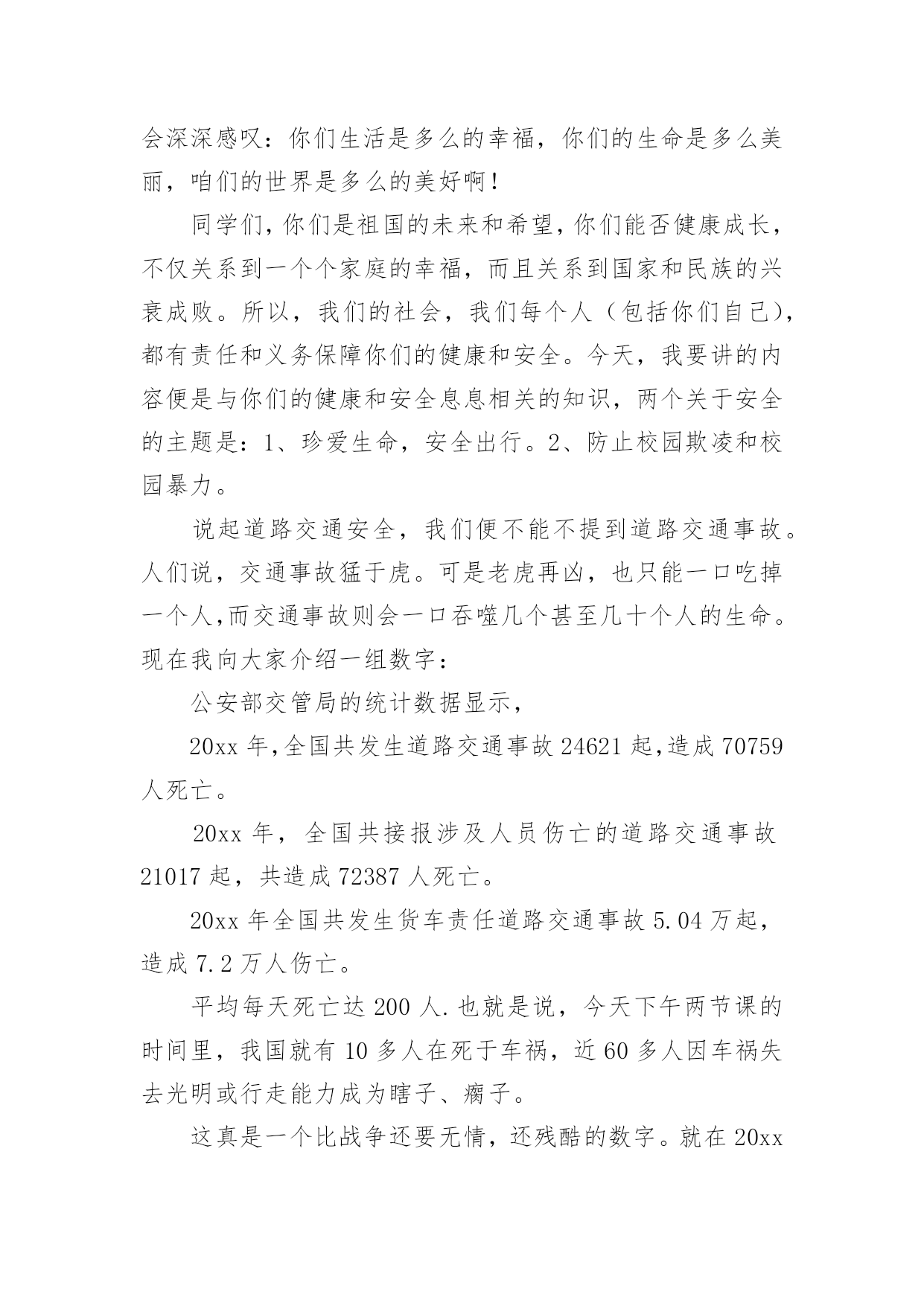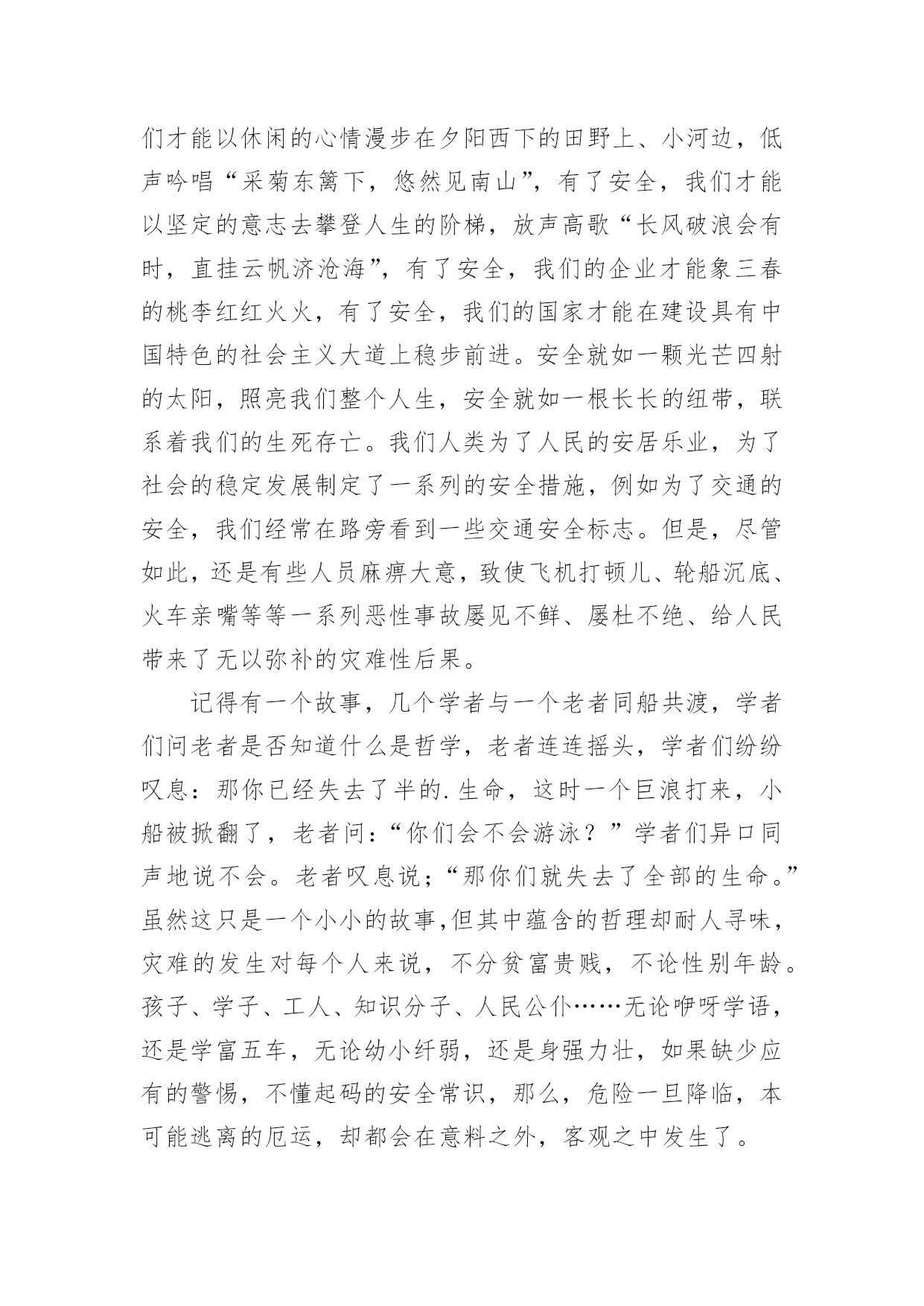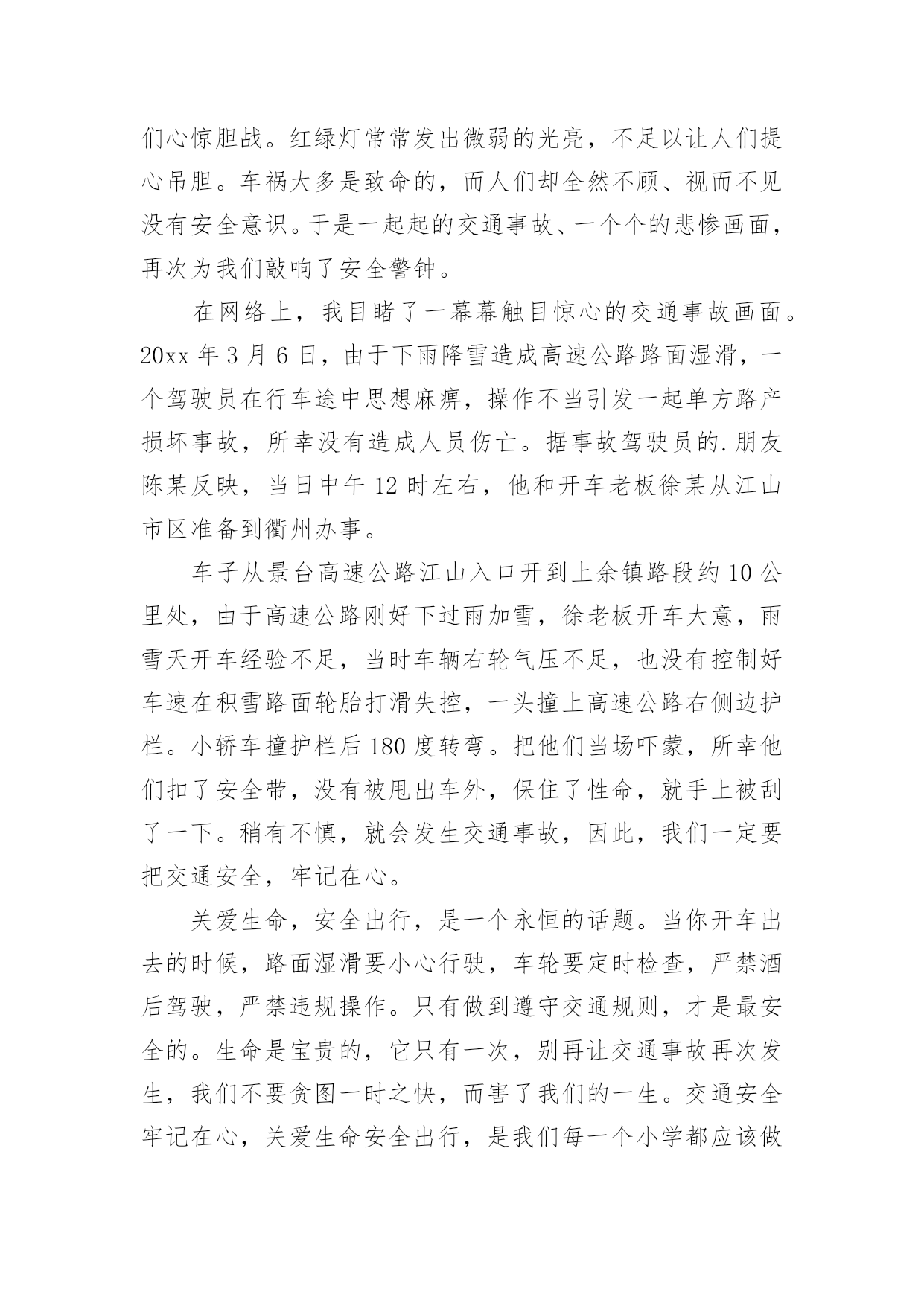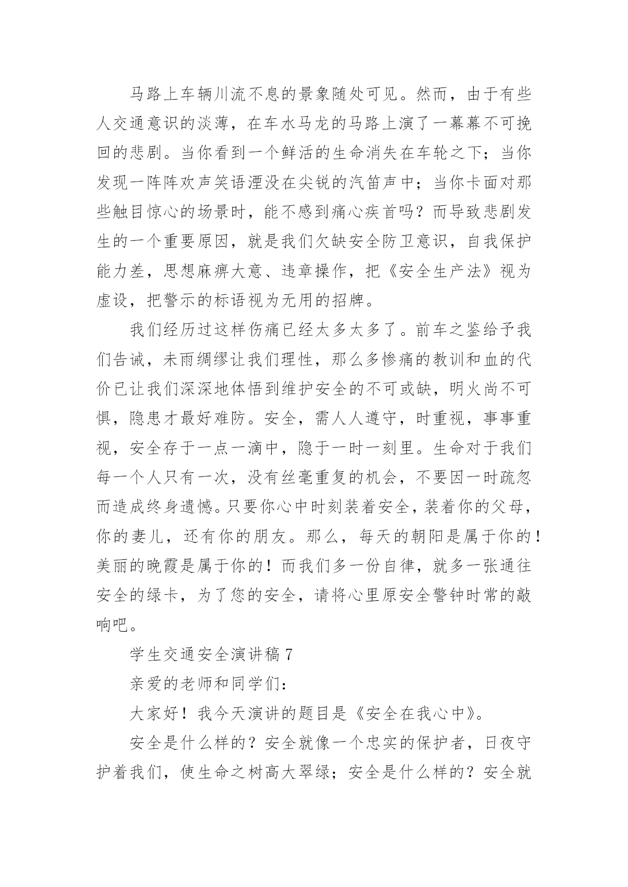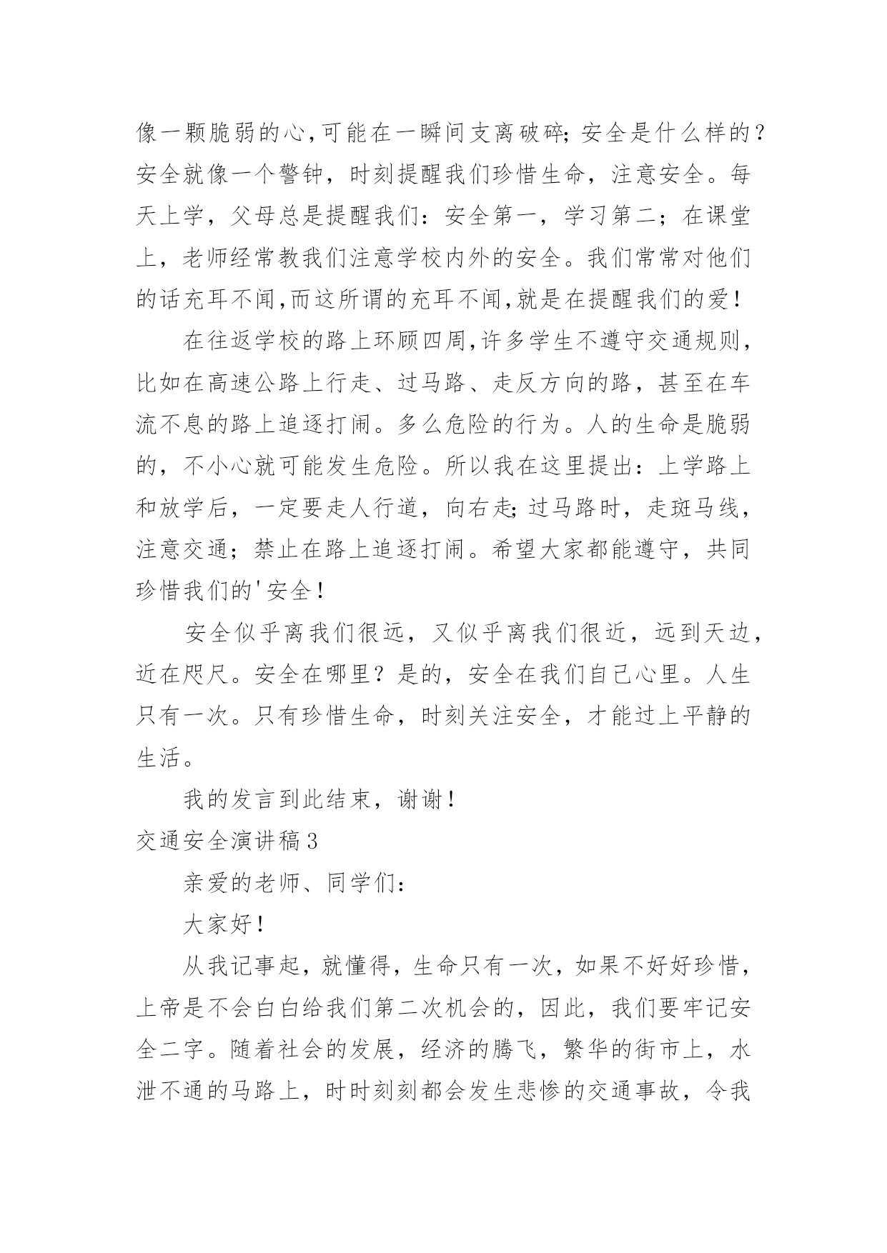 交通安全演讲稿交通安全演讲稿(集合15篇)演讲稿以发表意见,表达观点为主,是为演讲而事先准备好的文稿。在当下社会,在很多情况下我们需要用到演讲稿,来参考自己需要的演讲稿吧!下面是小编整理的交通安全演讲稿,欢迎大家借鉴与参考,希望对大家有所帮助。交通安全演讲稿1亲爱的同学们:当我们背着书包,扛起家人的希望,带着美好的未来蓝图来到美丽的校园,走在人来人往的宽阔街道上,常常感叹美丽的家乡发展之快。但是你有没有注意到交通线里面隐藏的危险?随着自行车、机动车等交通工具的增加,校园交通事故隐患也在增加。不遵守交通规则相当于不珍惜自己的生命。我们有年轻的身体,美好的理想,却常常忽视交通安全的“小事”;我们谈理想,谈报国,往往忽略了“珍爱生命”的底线。遵守交通规则不仅是我们所有人的义务,也是我们不可推卸的责任。为了远离流血和悲伤、伤疤和忧虑,我们提出了以下倡议:第一,杜绝不良骑车行为。不逆向行驶,转弯时提前减速,看清周围情况,不在校园内骑行,不急着急转弯;一起骑的人不多,不要互相攀越,不要互相追逐打闹;带人不骑车,并排骑行等。为了自己和他人的安全,要从自己做起,培养良好文明的骑车习惯,为校园交通创造一个安全舒适的环境。第二,注意校园行车安全。校园里的一些学生已经使用电动汽车作为他们的旅行方式。我们建议学生开车时必须严格遵守交通法规,以礼貌和慢行为主,保证校园出行的和平氛围,注意控制行驶速度,不要随意停车,为自行车和行人出行创造安全便捷的'环境。三、积极反映存在的问题。校园安全隐患关系到我们每个人的人身安全。我们每天在校园旅游的时候,要结合自己的经验,积极提出改善校园安全问题的建议。为交大校园交通安全做出贡献,为自己创造一个安全舒适的校园环境。交通安全演讲稿2各位领导,同事们:大家好!今天,我能参加总段开展的“学规章制度,做守纪模范”的演讲比赛,心情无比激动。我没有什么华丽的辞藻,但我希望通过我的真诚,唤醒大家对安全生产的重视,对生命的珍爱。我演讲的题目是“敲响心中的安全警钟”。哪一个人不愿笑语长在,哪一个家庭不愿幸福美满,哪一个企业不愿兴旺发达,哪一个国家不愿繁荣昌盛。安全就如一根七彩的丝线把我们这一个个美好的愿望连接起来,构成一个稳定、祥和、五彩缤纷的美好世界。国家的安全是国泰,民众的安全是民安。有了安全,我们才能以休闲的心情漫步在夕阳西下的田野上、小河边,低声吟唱“采菊东篱下,悠然见南山”,有了安全,我们才能以坚定的意志去攀登人生的阶梯,放声高歌“长风破浪会有时,直挂云帆济沧海”,有了安全,我们的企业才能象三春的桃李红红火火,有了安全,我们的国家才能在建设具有中国特色的社会主义大道上稳步前进。安全就如一颗光芒四射的太阳,照亮我们整个人生,安全就如一根长长的纽带,联系着我们的生死存亡。我们人类为了人民的安居乐业,为了社会的稳定发展制定了一系列的安全措施,例如为了交通的安全,我们经常在路旁看到一些交通安全标志。但是,尽管如此,还是有些人员麻痹大意,致使飞机打顿儿、轮船沉底、火车亲嘴等等一系列恶性事故屡见不鲜、屡杜不绝、给人民带来了无以弥补的灾难性后果。记得有一个故事,几个学者与一个老者同船共渡,学者们问老者是否知道什么是哲学,老者连连摇头,学者们纷纷叹息:那你已经失去了半的.生命,这时一个巨浪打来,小船被掀翻了,老者问:“你们会不会游泳?”学者们异口同声地说不会。老者叹息说;“那你们就失去了全部的生命。”虽然这只是一个小小的故事,但其中蕴含的哲理却耐人寻味,灾难的发生对每个人来说,不分贫富贵贱,不论性别年龄。孩子、学子、工人、知识分子、人民公仆……无论咿呀学语,还是学富五车,无论幼小纤弱,还是身强力壮,如果缺少应有的警惕,不懂起码的安全常识,那么,危险一旦降临,本可能逃离的厄运,却都会在意料之外,客观之中发生了。马路上车辆川流不息的景象随处可见。然而,由于有些人交通意识的淡薄,在车水马龙的马路上演了一幕幕不可挽回的悲剧。当你看到一个鲜活的生命消失在车轮之下;当你发现一阵阵欢声笑语湮没在尖锐的汽笛声中;当你卡面对那些触目惊心的场景时,能不感到痛心疾首吗?而导致悲剧发生的一个重要原因,就是我们欠缺安全防卫意识,自我保护能力差,思想麻痹大意、违章操作,把《安全生产法》视为虚设,把警示的标语视为无用的招牌。我们经历过这样伤痛已经太多太多了。前车之鉴给予我们告诫,未雨绸缪让我们理性,那么多惨痛的教训和血的代价已让我们深深地体悟到维护安全的不可或缺,明火尚不可惧,隐患才最好难防。安全,需人人遵守,时重视,事事重视,安全存于一点一滴中,隐于一时一刻里。生命对于我们每一个人只有一次,没有丝毫重复的机会,不要因一时疏忽而造成终身遗憾。只要你心中时刻装着安全,装着你的父母,你的妻儿,还有你的朋友。那么,每天的朝阳是属于你的!美丽的晚霞是属于你的!而我们多一份