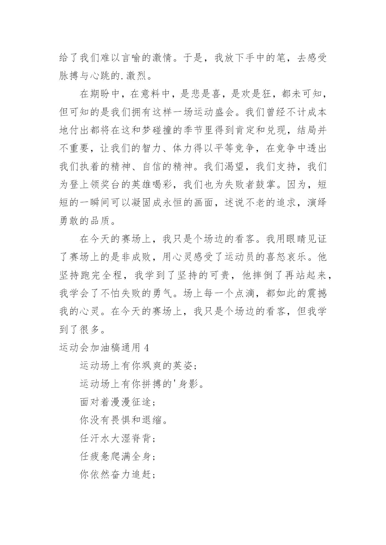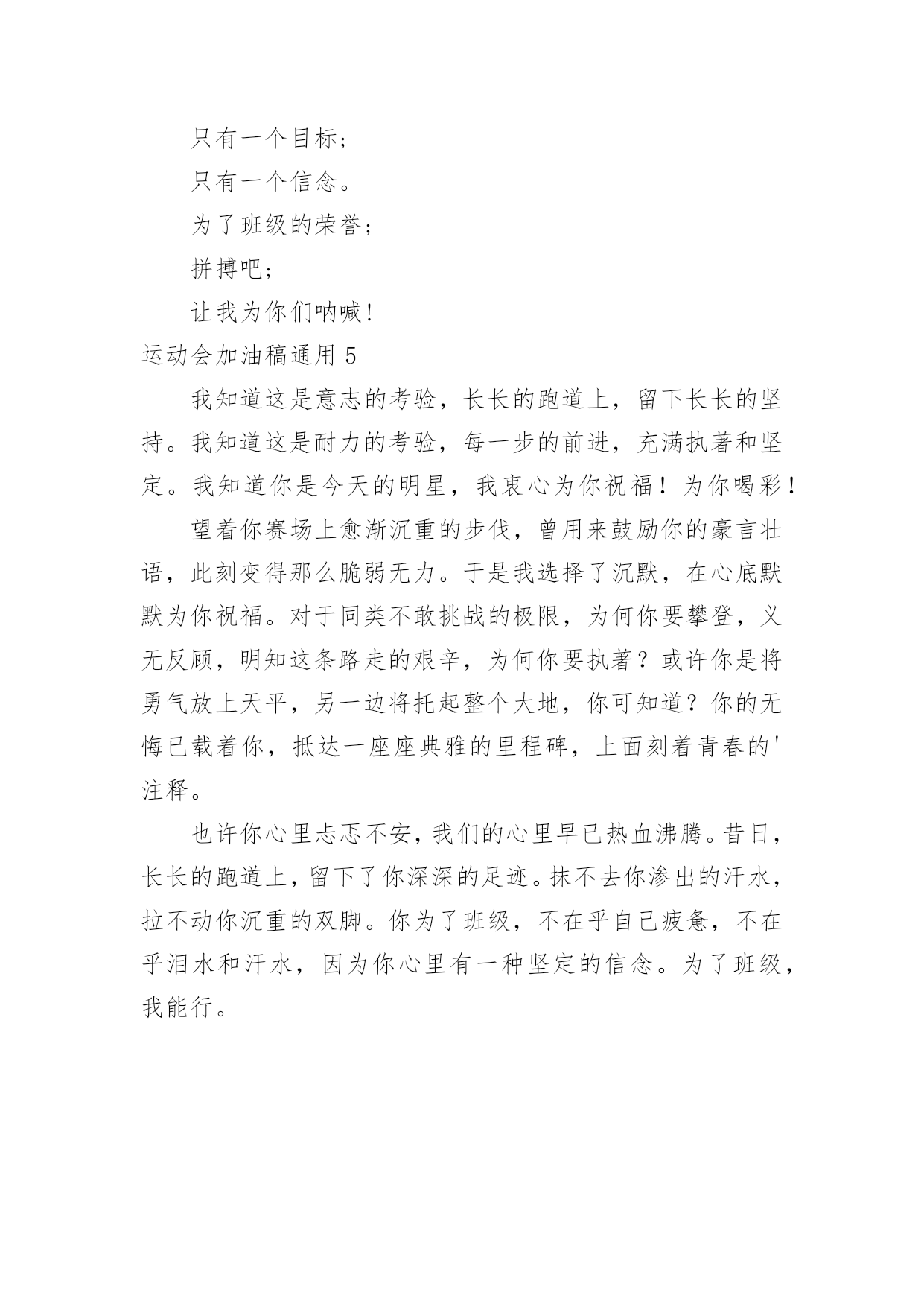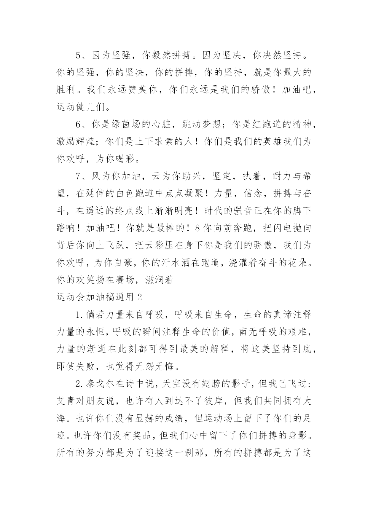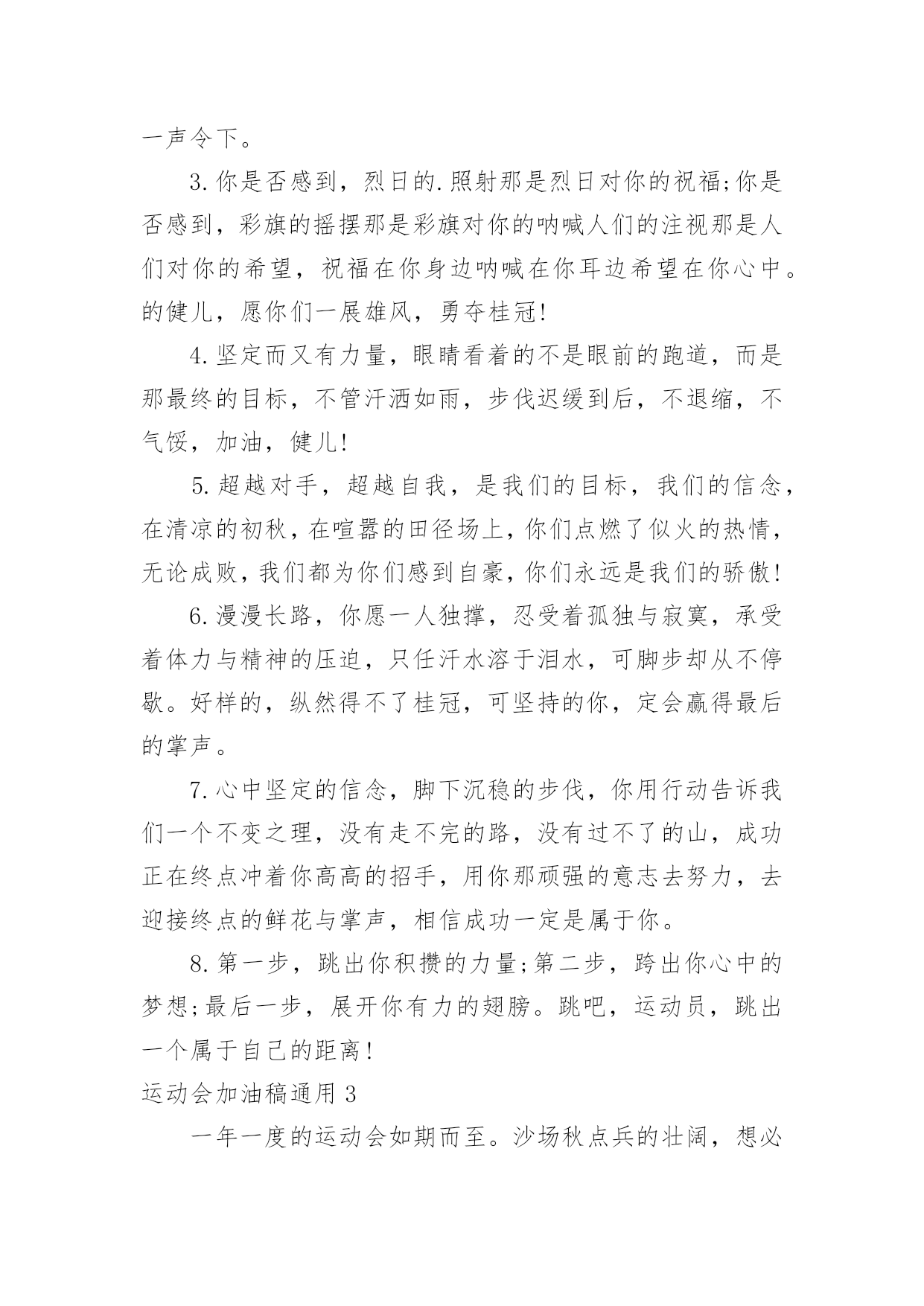 运动会加油稿运动会加油稿通用现如今,需要使用加油稿的情况越来越多,加油稿有着正向的鼓动作用。还是对加油稿一筹莫展吗?以下是小编为大家收集的运动会加油稿通用,欢迎大家分享。运动会加油稿通用11、掌声依然为你响起,鲜花依然为你献上一时的输赢不代表终生的成败!擦干泪水,振作精神,新的冲锋号已经吹响!不论结果如何你那拼搏的美丽都将成为我们心中的永恒!2、绿茵场上,你挥洒青春的笔墨,红跑道上,你书写青春的篇章。加油吧!年轻的心,我们为你欢呼!加油吧!青春的你,我们为你自豪!3、红色的跑道,是你的奔跑画出的轨迹,台上的.呐喊,是你的努力得到的祝福。驶向终点,这是你耐力与意志的检验,这是你自我挑战的目标,拼搏吧!努力吧!运动健儿们,胜利就在眼前,是男儿,我们不言放弃!4、呐喊阵阵,我们为你喝彩欢呼阵阵,我们为你祝福加油吧!运动健儿们到达终点的那一刻你们的成功与我们喜悦凝结成永恒!5、因为坚强,你毅然拼搏。因为坚决,你决然坚持。你的坚强,你的坚决,你的拼搏,你的坚持,就是你最大的胜利。我们永远赞美你,你们永远是我们的骄傲!加油吧,运动健儿们。6、你是绿茵场的心脏,跳动梦想;你是红跑道的精神,激励辉煌;你们是上下求索的人!你们是我们的英雄我们为你欢呼,为你喝彩。7、风为你加油,云为你助兴,坚定,执着,耐力与希望,在延伸的白色跑道中点点凝聚!力量,信念,拼搏与奋斗,在遥远的终点线上渐渐明亮!时代的强音正在你的脚下踏响!加油吧!你就是最棒的!8你向前奔跑,把闪电抛向背后你向上飞跃,把云彩压在身下你是我们的骄傲,我们为你欢呼,为你自豪,你的汗水洒在跑道,浇灌着奋斗的花朵。你的欢笑扬在赛场,滋润着运动会加油稿通用21.倘若力量来自呼吸,呼吸来自生命,生命的真谛注释力量的永恒,呼吸的瞬间注释生命的价值,南无呼吸的艰难,力量的渐逝在此刻都可得到最美的解释,将这美坚持到底,即使失败,也觉得无怨无悔。2.泰戈尔在诗中说,天空没有翅膀的影子,但我已飞过;艾青对朋友说,也许有人到达不了彼岸,但我们共同拥有大海。也许你们没有显赫的成绩,但运动场上留下了你们的足迹。也许你们没有奖品,但我们心中留下了你们拼搏的身影。所有的努力都是为了迎接这一刹那,所有的拼搏都是为了这一声令下。3.你是否感到,烈日的.照射那是烈日对你的祝福;你是否感到,彩旗的摇摆那是彩旗对你的呐喊人们的注视那是人们对你的希望,祝福在你身边呐喊在你耳边希望在你心中。的健儿,愿你们一展雄风,勇夺桂冠!4.坚定而又有力量,眼睛看着的不是眼前的跑道,而是那最终的目标,不管汗洒如雨,步伐迟缓到后,不退缩,不气馁,加油,健儿!5.超越对手,超越自我,是我们的目标,我们的信念,在清凉的初秋,在喧嚣的田径场上,你们点燃了似火的热情,无论成败,我们都为你们感到自豪,你们永远是我们的骄傲!6.漫漫长路,你愿一人独撑,忍受着孤独与寂寞,承受着体力与精神的压迫,只任汗水溶于泪水,可脚步却从不停歇。好样的,纵然得不了桂冠,可坚持的你,定会赢得最后的掌声。7.心中坚定的信念,脚下沉稳的步伐,你用行动告诉我们一个不变之理,没有走不完的路,没有过不了的山,成功正在终点冲着你高高的招手,用你那顽强的意志去努力,去迎接终点的鲜花与掌声,相信成功一定是属于你。8.第一步,跳出你积攒的力量;第二步,跨出你心中的梦想;最后一步,展开你有力的翅膀。跳吧,运动员,跳出一个属于自己的距离!运动会加油稿通用3一年一度的运动会如期而至。沙场秋点兵的壮阔,想必给了我们难以言喻的激情。于是,我放下手中的笔,去感受脉搏与心跳的.激烈。在期盼中,在意料中,是悲是喜,是欢是狂,都未可知,但可知的是我们拥有这样一场运动盛会。我们曾经不计成本地付出都将在这和梦碰撞的季节里得到肯定和兑现,结局并不重要,让我们的智力、体力得以平等竞争,在竞争中透出我们执着的精神、自信的精神。我们渴望,我们支持,我们为登上领奖台的英雄喝彩,我们也为失败者鼓掌。因为,短短的一瞬间可以凝固成永恒的画面,述说不老的追求,演绎勇敢的品质。在今天的赛场上,我只是个场边的看客。我用眼睛见证了赛场上的是非成败,用心灵感受了运动员的喜怒哀乐。他坚持跑完全程,我学到了坚持的可贵,他摔倒了再站起来,我学会了不怕失败的勇气。场上每一个点滴,都如此的震撼我的心灵。在今天的赛场上,我只是个场边的看客,但我学到了很多。运动会加油稿通用4运动场上有你飒爽的英姿;运动场上有你拼搏的'身影。面对着漫漫征途;你没有畏惧和退缩。任汗水大湿脊背;任疲惫爬满全身;你依然奋力追赶;只有一个目标;只有一个信念。为了班级的荣誉;拼搏吧;让我为你们呐喊!运动会加油稿通用5我知道这是意志的考验,长长的跑道上,留下长长的坚持。我知道这是耐力的考验,每一步的前进,充满执著和坚定。我知道你是今天的明星,我衷心为你祝福!为你喝彩!望着你赛场上愈
