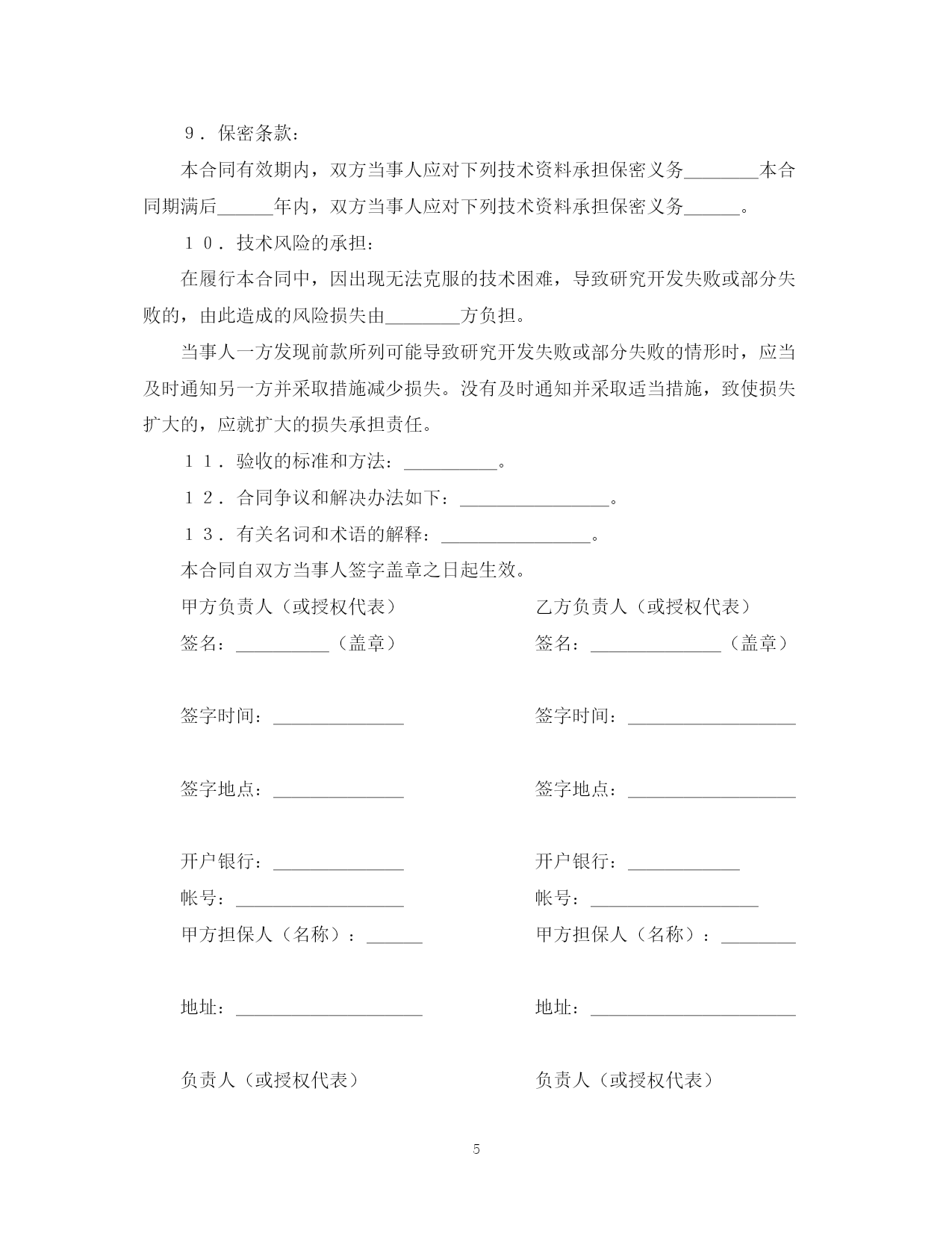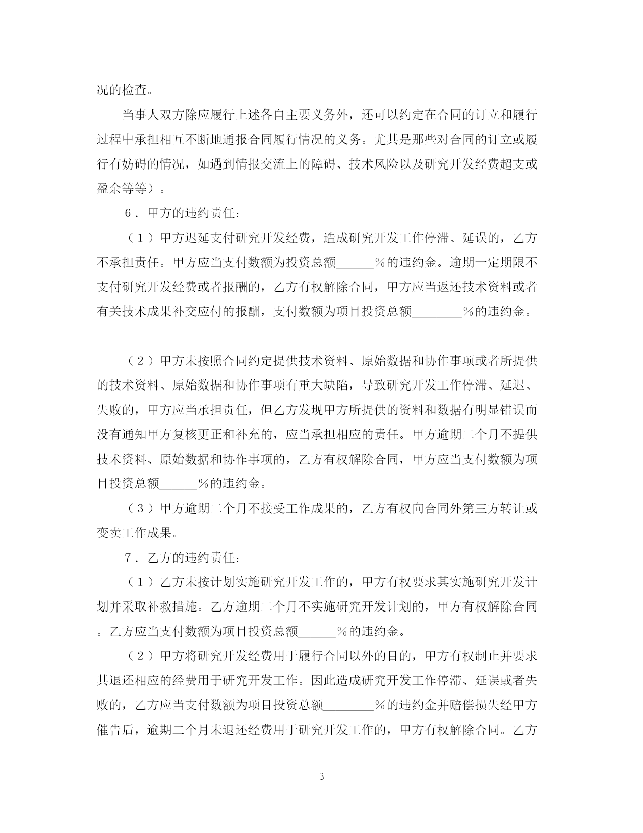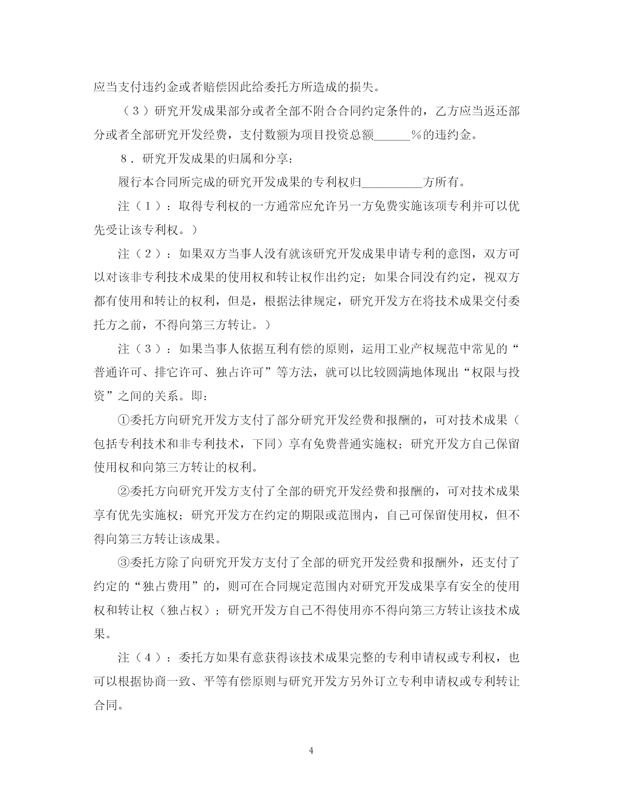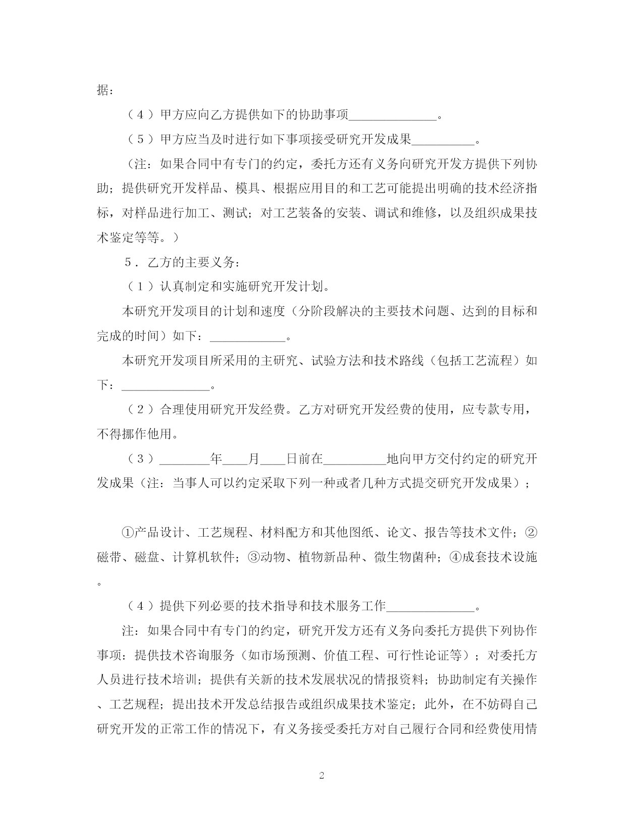 此资料由网络收集而来,如有侵权请告知上传者立即删除。资料共分享,我们负责传递知识。PAGEPAGE6委托开发合同(1)委托技术开发合同委托方:______,以下简称甲方;法定代表人或负责人:________;研究开发方:_______,以下简称乙方;法定代表人或负责人:___________。依据《中华人民共和国合同法》的有关规定,经双方当事人协商一致,签订本合同。1.项目名称:________。(注:本参考格式适用于新技术、新产品、新材料、新工艺及其系统的研究开发活动。)2.本技术开发项目在国内外的现状、水平及发展趋势:_______。3.本研究开发成果应达到的技术水平_________。4.甲方的主要义务:(1)向乙方支付约定的项目投资(包括研究开发经费和报告。合同约定研究开发经费的一定比例作为科研补贴的,可以不单列报酬)项目投资总额为__________。其中:设备费______;材料费________;能源费________;试验费________;试制费________;安装费________;调式费________;文件编制费______;(2)按照如下方式分期支付上述项目投资:________。(注:当事人通常可以选择下列支付方式:①实报实销的方式;②一次总算,分期支付,包干使用的方式;③“研究开发经费”+提成费的方式)。(3)在合同生效后_____日内向乙方提供下列技术背景资料和原始数据:(4)甲方应向乙方提供如下的协助事项_______。(5)甲方应当及时进行如下事项接受研究开发成果_____。(注:如果合同中有专门的约定,委托方还有义务向研究开发方提供下列协助;提供研究开发样品、模具、根据应用目的和工艺可能提出明确的技术经济指标,对样品进行加工、测试;对工艺装备的安装、调试和维修,以及组织成果技术鉴定等等。)5.乙方的主要义务:(1)认真制定和实施研究开发计划。本研究开发项目的计划和速度(分阶段解决的主要技术问题、达到的目标和完成的时间)如下:______。本研究开发项目所采用的主研究、试验方法和技术路线(包括工艺流程)如下:_______。(2)合理使用研究开发经费。乙方对研究开发经费的使用,应专款专用,不得挪作他用。(3)____年__月__日前在_____地向甲方交付约定的研究开发成果(注:当事人可以约定采取下列一种或者几种方式提交研究开发成果);①产品设计、工艺规程、材料配方和其他图纸、论文、报告等技术文件;②磁带、磁盘、计算机软件;③动物、植物新品种、微生物菌种;④成套技术设施。(4)提供下列必要的技术指导和技术服务工作_______。注:如果合同中有专门的约定,研究开发方还有义务向委托方提供下列协作事项:提供技术咨询服务(如市场预测、价值工程、可行性论证等);对委托方人员进行技术培训;提供有关新的技术发展状况的情报资料;协助制定有关操作、工艺规程;提出技术开发总结报告或组织成果技术鉴定;此外,在不妨碍自己研究开发的正常工作的情况下,有义务接受委托方对自己履行合同和经费使用情况的检查。当事人双方除应履行上述各自主要义务外,还可以约定在合同的订立和履行过程中承担相互不断地通报合同履行情况的义务。尤其是那些对合同的订立或履行有妨碍的情况,如遇到情报交流上的障碍、技术风险以及研究开发经费超支或盈余等等)。6.甲方的违约责任:(1)甲方迟延支付研究开发经费,造成研究开发工作停滞、延误的,乙方不承担责任。甲方应当支付数额为投资总额___%的违约金。逾期一定期限不支付研究开发经费或者报酬的,乙方有权解除合同,甲方应当返还技术资料或者有关技术成果补交应付的报酬,支付数额为项目投资总额____%的违约金。(2)甲方未按照合同约定提供技术资料、原始数据和协作事项或者所提供的技术资料、原始数据和协作事项有重大缺陷,导致研究开发工作停滞、延迟、失败的,甲方应当承担责任,但乙方发现甲方所提供的资料和数据有明显错误而没有通知甲方复核更正和补充的,应当承担相应的责任。甲方逾期二个月不提供技术资料、原始数据和协作事项的,乙方有权解除合同,甲方应当支付数额为项目投资总额___%的违约金。(3)甲方逾期二个月不接受工作成果的,乙方有权向合同外第三方转让或变卖工作成果。7.乙方的违约责任:(1)乙方未按计划实施研究开发工作的,甲方有权要求其实施研究开发计划并采取补救措施。乙方逾期二个月不实施研究开发计划的,甲方有权解除合同。乙方应当支付数额为项目投资总额___%的违约金。(2)甲方将研究开发经费用于履行合同以外的目的,甲方有权制止并要求其退还相应的经费用于研究开发工作。因此造成研究开发工作停滞、延误或者失败的,乙方应当支付数额为项
