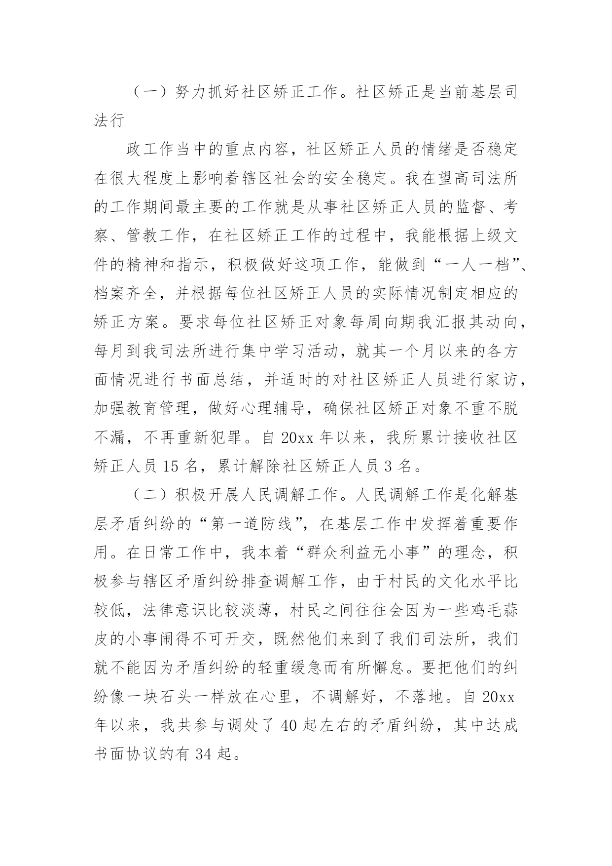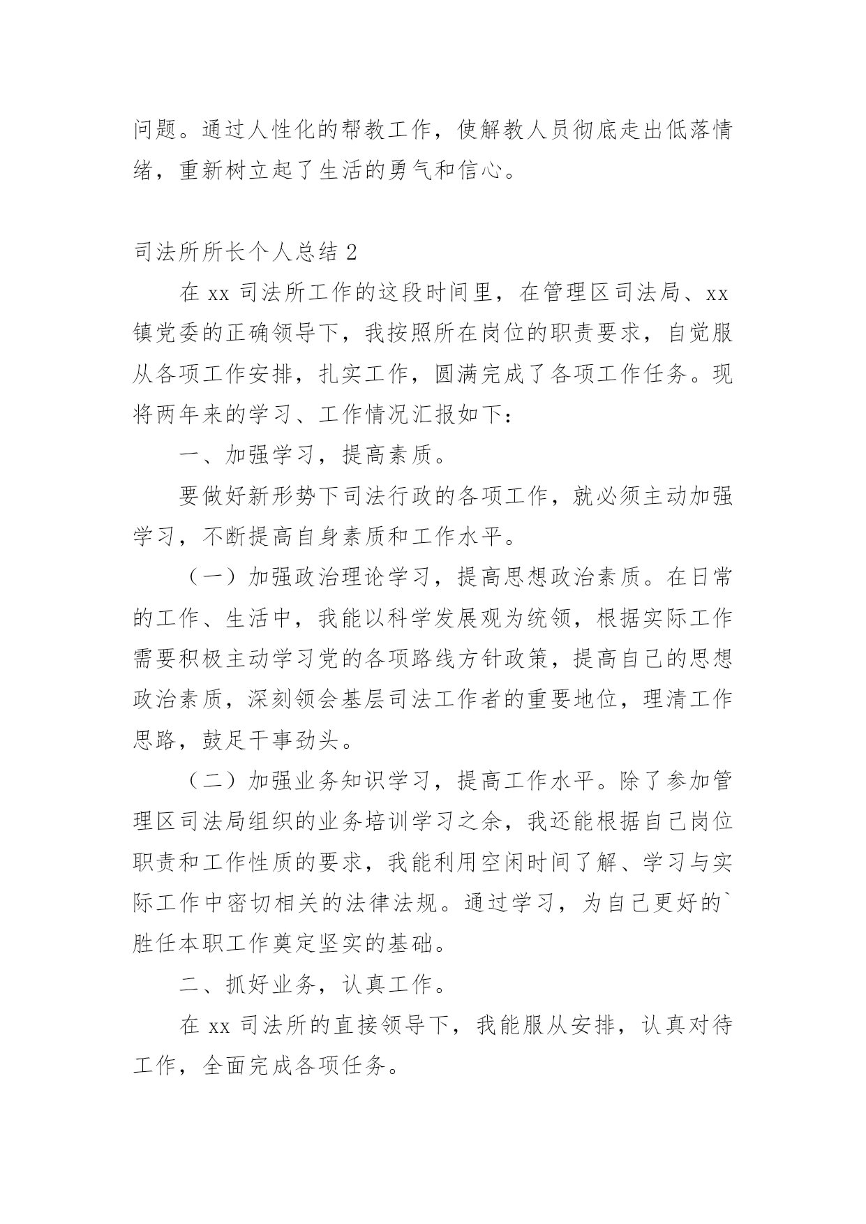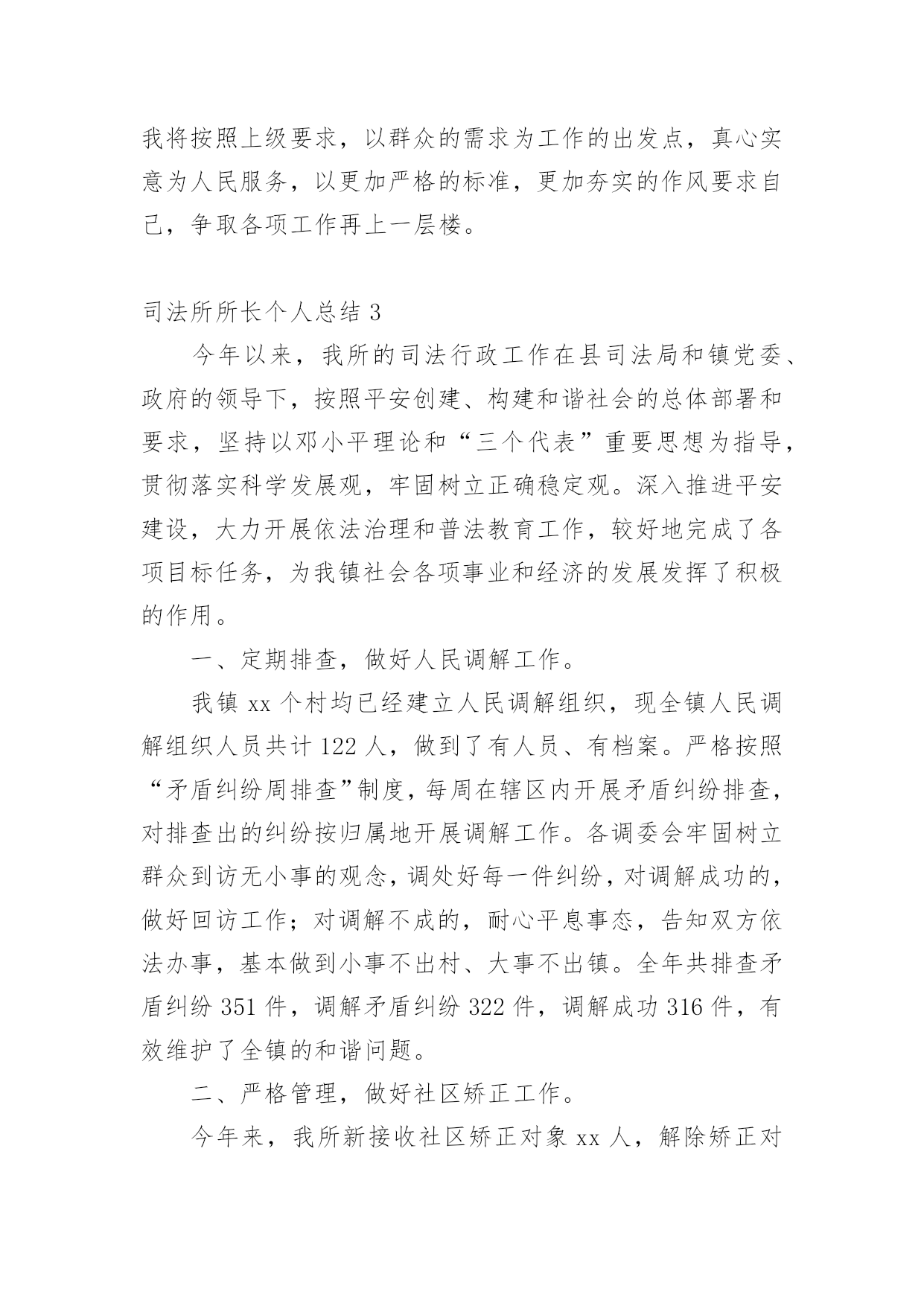 司法所所长个人总结总结是把一定阶段内的有关情况分析研究,做出有指导性的经验方法以及结论的书面材料,通过它可以正确认识以往学习和工作中的优缺点,因此我们要做好归纳,写好总结。我们该怎么去写总结呢?下面是小编为大家收集的司法所所长个人总结,仅供参考,欢迎大家阅读。司法所所长个人总结1xx司法所在镇党委、政府的领导下,在各级指导和大力支持下,以狠抓队伍建设、注重职能发挥、强化管理规范、提升硬件设施和争创文明站所为突破口,认真深入地开展普法教育、依法治理、人民调解、社区矫正、安置帮教、法律服务等工作,较好的完成了年度的各项工作,为xx镇的社会事业和经济发展起到了有力法律保障。现就xx年司法所工作总结如下:一、抓思想政治、扬优良作风打造过硬的司法队伍司法所直接与人民群众打交道,是一个基层窗口单位,担负着千家万户的.矛盾纠纷调解和法律服务工作,责任重大。能否适应新形势的需要,有一支政治素质高、业务能力强、作风纪律硬的司法行政队伍,直接影响着司法行政工作开展的好坏。我们本着“提升水平、打造品牌、发扬传统、坚定信念”的思想,不断加强思想教育工作。使每一位工作人员有一颗扎根基层,服务百姓的红心,想群众之所想,急群众之所急,明确自身职责,发挥自己作用。树立“人民利益高于一切,人民呼声急于一切,人民疾苦先于一切”的服务理念,每名干部都能熟练的使用电脑和专用系统;建立政治学习制度,坚持每月开展学习。积极参加各种法律培训班、认真学习典型案例,不断的讨论交流,充分提高司法工作人员的业务理论水平。在思想上、政治上、行动上与党委、政府能保持高度的一致,爱岗敬业、乐于奉献,思想觉悟高、政治素质好。每一位干警都能做到依法办事,不徇私情,不谋私利。形成了一支工作作风扎实、业务能力过硬、实事求是的良好司法干部队伍。二、立足本职、服务社会、充分发挥司法职能1、积极开展人民调解工作,发挥维稳第一防线作用。一是紧紧围绕镇党委、镇政府的中心工作,努力做好排查社会不安定因素和调解社会矛盾纠纷工作,积极预防矛盾纠纷的激化。按照“那里有人群,哪里就有调解组织”要求,进一步加强标准化调委会创建工作,截止目前共创建基层标准化调委会13个,均能按照要求正常开展工作;二是按照“人民调解制度化、规范化、法制化”要求,今年上半年共召开镇村两级调委会及人民调解员业务培训会3次,全面培训指导各调委会工作规范化运作;三是加强信息反馈、数据统计,坚持每月进行矛盾纠纷排查,全面准确掌握工作动态。今年,共调解各类纠纷起,调解成功起。受理达到100%,调解成功达到99%以上。司法所调解集访案件起,得到妥当处理。三是为基层调解员落实了工资.2、社区矫正流程规范,作用发挥效果明显。社区矫正严格按照工作要求,规范业务、严密监管、强强教育。全镇6名矫正对象按时报到履行登记手续;建立健全了镇村两级的社区矫正网络机制,设立了以司法所成员、派出所干警、村治保主任组成的监管机制,与矫正对象签订了不再犯罪保证书,同其家属亲属签订了社区矫正对象监管协议书。我们结合矫正对象实际情况,制定了全镇社区矫正分类矫正方案套;积极开展政策宣传及矫正工作,家访、谈话、定期汇报、集中授课等规范运行,切实做到周闻其声,月见其人,全面实施季度考察、考评。同时,针对每位矫正对象成立帮教小组,社会志愿者、监督人、责任人到位,逐人落实监管教育责任,实行一人一档式管理。目前,名矫正对象认罪态度积极,服刑表现端正,生产生活稳定,没有重新违法犯罪现象。3、安置帮教扎实有效,真情帮扶妥善安置。为进一步加强对刑满释放人员的管理,结合各自实际,采取有效多样的帮教方法,确保安置帮教工作真正落到实处。全镇刑满释放人员共人,镇司法所对所有刑满释放人员全部建立了个人档案,指定专人实施帮教,完善年度帮教考核记录。对外出打工的刑满释放人员,采用书信、电话等形式落实帮教。雪河村车北组张文革等刑满释放人员都因家庭面临的各种困难,一度生活举步维艰。司法所通过与民政工作站联系,为他们争取了边缘人群生活补助,累计解决救助资金余元,并为其家庭办了农村低保,解决了生活中的实际问题。通过人性化的帮教工作,使解教人员彻底走出低落情绪,重新树立起了生活的勇气和信心。司法所所长个人总结2在xx司法所工作的这段时间里,在管理区司法局、xx镇党委的正确领导下,我按照所在岗位的职责要求,自觉服从各项工作安排,扎实工作,圆满完成了各项工作任务。现将两年来的学习、工作情况汇报如下:一、加强学习,提高素质。要做好新形势下司法行政的各项工作,就必须主动加强学习,不断提高自身素质和工作水平。(一)加强政治理论学习,提高思想政治素质。在日常的工作、生活中,我能以科学发展观为统领,根据实际工作需要积极主动学习党的各项路线方针政策,提高自己的思想政治素质,深刻领会基层司法工作者的重要地位,理清工作思路,鼓足干事劲