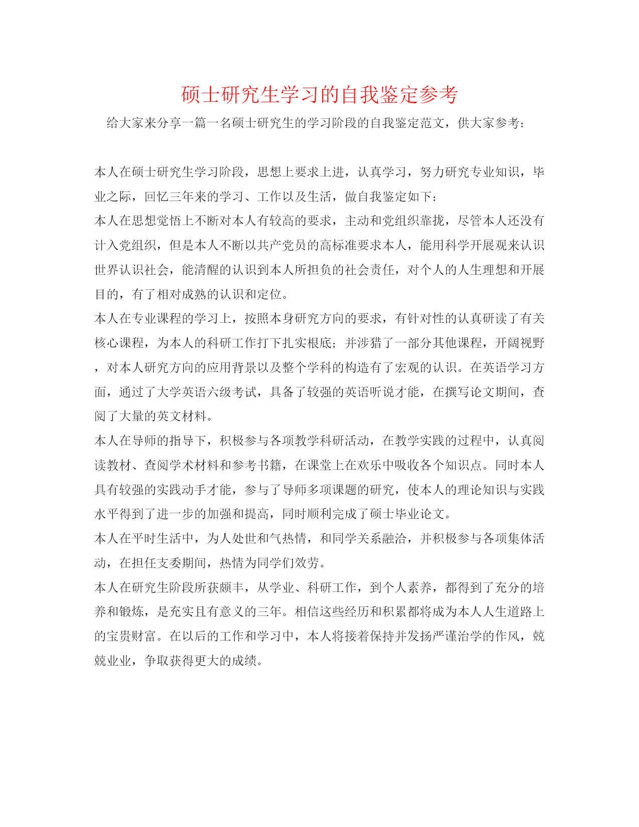 硕士研究生学习的自我鉴定参考给大家来分享一篇一名硕士研究生的学习阶段的自我鉴定范文,供大家参考:本人在硕士研究生学习阶段,思想上要求上进,认真学习,努力研究专业知识,毕业之际,回忆三年来的学习、工作以及生活,做自我鉴定如下:本人在思想觉悟上不断对本人有较高的要求,主动和党组织靠拢,尽管本人还没有计入党组织,但是本人不断以共产党员的高标准要求本人,能用科学开展观来认识世界认识社会,能清醒的认识到本人所担负的社会责任,对个人的人生理想和开展目的,有了相对成熟的认识和定位。本人在专业课程的学习上,按照本身研究方向的要求,有针对性的认真研读了有关核心课程,为本人的科研工作打下扎实根底;并涉猎了一部分其他课程,开阔视野,对本人研究方向的应用背景以及整个学科的构造有了宏观的认识。在英语学习方面,通过了大学英语六级考试,具备了较强的英语听说才能,在撰写论文期间,查阅了大量的英文材料。本人在导师的指导下,积极参与各项教学科研活动,在教学实践的过程中,认真阅读教材、查阅学术材料和参考书籍,在课堂上在欢乐中吸收各个知识点。同时本人具有较强的实践动手才能,参与了导师多项课题的研究,使本人的理论知识与实践水平得到了进一步的加强和提高,同时顺利完成了硕士毕业论文。本人在平时生活中,为人处世和气热情,和同学关系融洽,并积极参与各项集体活动,在担任支委期间,热情为同学们效劳。本人在研究生阶段所获颇丰,从学业、科研工作,到个人素养,都得到了充分的培养和锻炼,是充实且有意义的三年。相信这些经历和积累都将成为本人人生道路上的宝贵财富。在以后的工作和学习中,本人将接着保持并发扬严谨治学的作风,兢兢业业,争取获得更大的成绩。