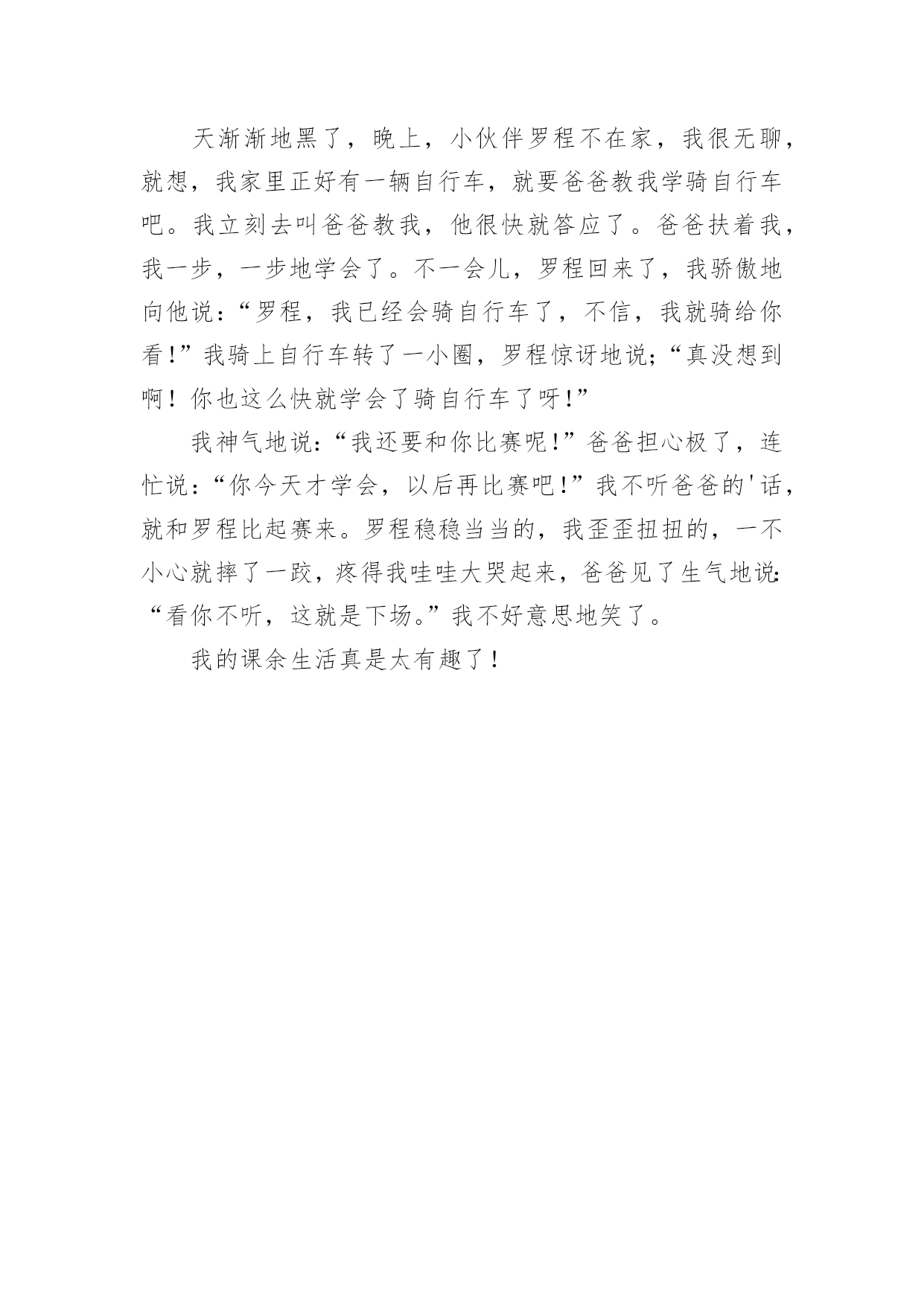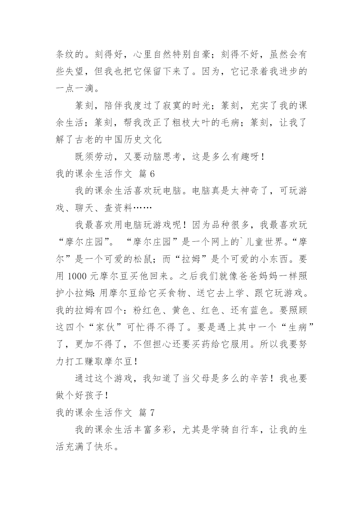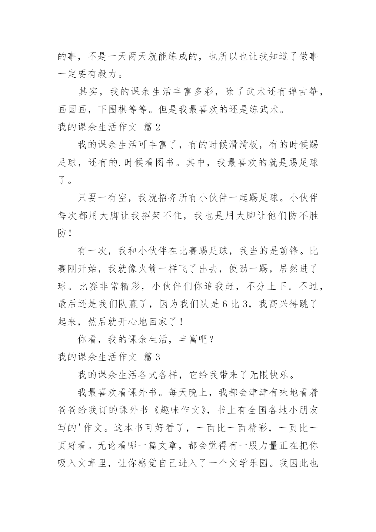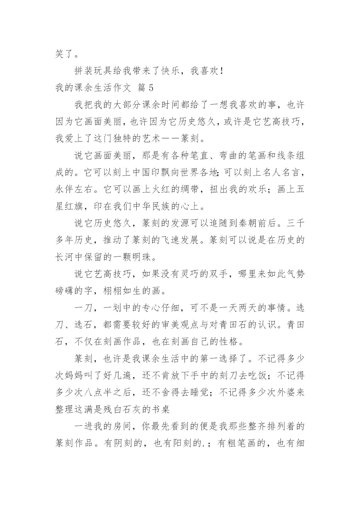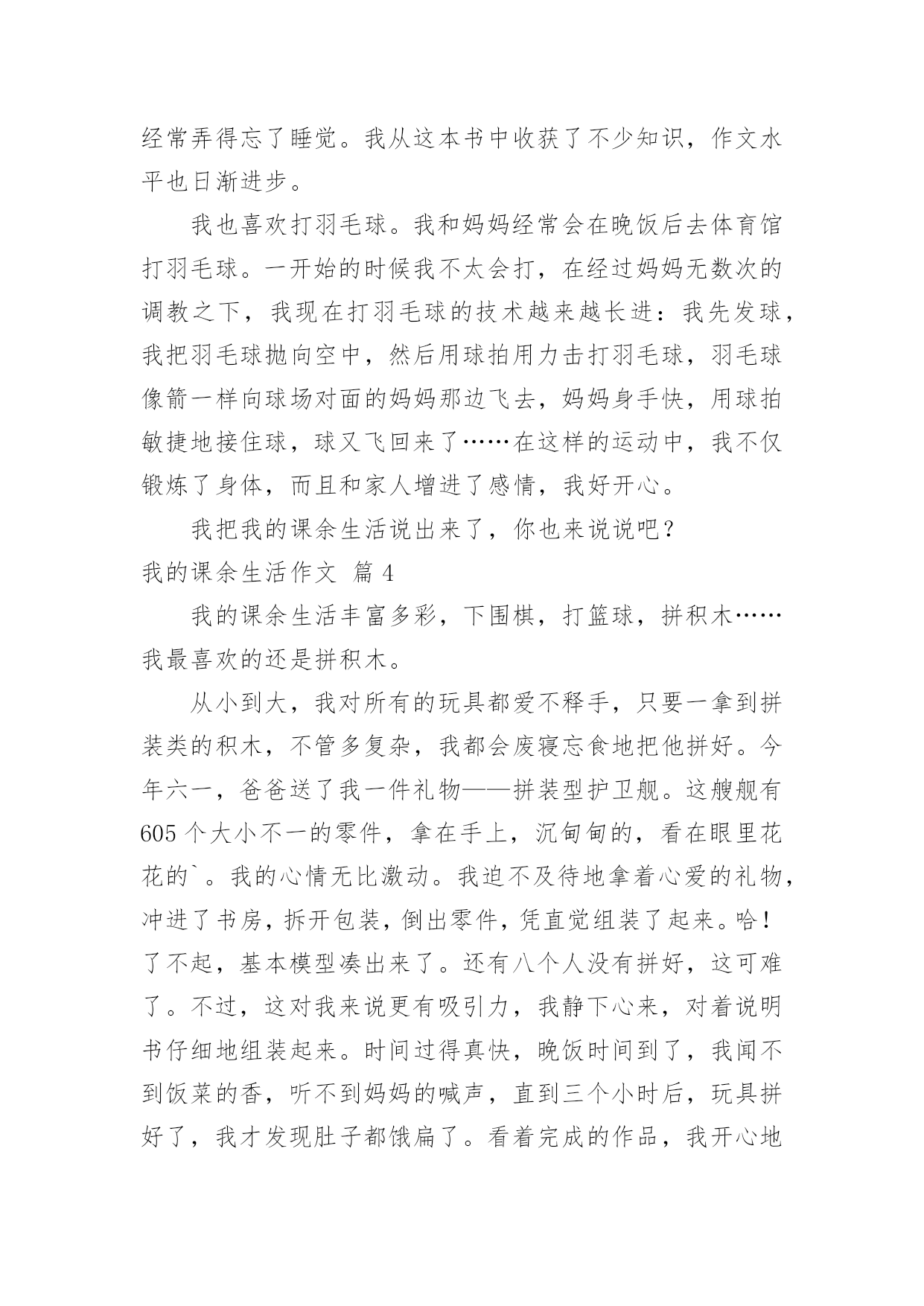 我的课余生活作文【热门】我的课余生活作文锦集7篇在日常的学习、工作、生活中,大家都不可避免地要接触到作文吧,借助作文人们可以实现文化交流的目的。写起作文来就毫无头绪?以下是小编帮大家整理的我的课余生活作文8篇,欢迎阅读与收藏。我的课余生活作文篇1“一————哈!”“二————哈!哈!“”猜猜我在干什么?我正在利用周末课余时间上武术课呢!一听到教练的口令,我就浑身是劲儿,一声声"哈,哈"喊得中气十足!你知道我从何时开始练武术的吗?其实在我读二年级时,我喜欢上了武术,刚好哥哥也去学武,每次哥哥在比刀枪棍时,我都羡慕不已,也想学武术。妈妈鉴于我以前经常感冒生病,所以同意了。其实练武术是很辛苦的,当学绘画的小朋友们坐在温暖的教室里练习画画时,我们却在练习跑步;当学唱歌的小伙伴们站在漂亮的钢琴边练声的.时候,我们在下腰,,压腿;当学舞蹈的女孩子们在动听的音乐中起舞时,我们在飞腿,蹬腿,弹腿————……不少男同学练一半就疼得哭起来,而我却忍着疼痛,心里想:谁说女子不如男!现在的我已经学会劈开竖叉,还有学会了:少林八步连环拳,金刚宝锥,燕青拳,南拳———……等拳术。我在学武术的时光里知道了:习武不仅仅是可强身健体,而且也因为练武是一件辛苦的事,不是一天两天就能练成的,也所以也让我知道了做事一定要有毅力。其实,我的课余生活丰富多彩,除了武术还有弹古筝,画国画,下围棋等等。但是我最喜欢的还是练武术。我的课余生活作文篇2我的课余生活可丰富了,有的时候滑滑板,有的时候踢足球,还有的.时候看图书。其中,我最喜欢的就是踢足球了。只要一有空,我就招齐所有小伙伴一起踢足球。小伙伴每次都用大脚让我招架不住,我也是用大脚让他们防不胜防!有一次,我和小伙伴在比赛踢足球,我当的是前锋。比赛刚开始,我就像火箭一样飞了出去,使劲一踢,居然进了球。比赛非常精彩,小伙伴们你追我赶,不分上下。不过,最后还是我们队赢了,因为我们队是6比3,我高兴得跳了起来,然后就开心地回家了!你看,我的课余生活,丰富吧?我的课余生活作文篇3我的课余生活各式各样,它给我带来了无限快乐。我最喜欢看课外书。每天晚上,我都会津津有味地看着爸爸给我订的课外书《趣味作文》,书上有全国各地小朋友写的'作文。这本书可好看了,一面比一面精彩,一页比一页好看。无论看哪一篇文章,都会觉得有一股力量正在把你吸入文章里,让你感觉自己进入了一个文学乐园。我因此也经常弄得忘了睡觉。我从这本书中收获了不少知识,作文水平也日渐进步。我也喜欢打羽毛球。我和妈妈经常会在晚饭后去体育馆打羽毛球。一开始的时候我不太会打,在经过妈妈无数次的调教之下,我现在打羽毛球的技术越来越长进:我先发球,我把羽毛球抛向空中,然后用球拍用力击打羽毛球,羽毛球像箭一样向球场对面的妈妈那边飞去,妈妈身手快,用球拍敏捷地接住球,球又飞回来了……在这样的运动中,我不仅锻炼了身体,而且和家人增进了感情,我好开心。我把我的课余生活说出来了,你也来说说吧?我的课余生活作文篇4我的课余生活丰富多彩,下围棋,打篮球,拼积木……我最喜欢的还是拼积木。从小到大,我对所有的玩具都爱不释手,只要一拿到拼装类的积木,不管多复杂,我都会废寝忘食地把他拼好。今年六一,爸爸送了我一件礼物——拼装型护卫舰。这艘舰有605个大小不一的零件,拿在手上,沉甸甸的,看在眼里花花的`。我的心情无比激动。我迫不及待地拿着心爱的礼物,冲进了书房,拆开包装,倒出零件,凭直觉组装了起来。哈!了不起,基本模型凑出来了。还有八个人没有拼好,这可难了。不过,这对我来说更有吸引力,我静下心来,对着说明书仔细地组装起来。时间过得真快,晚饭时间到了,我闻不到饭菜的香,听不到妈妈的喊声,直到三个小时后,玩具拼好了,我才发现肚子都饿扁了。看着完成的作品,我开心地笑了。拼装玩具给我带来了快乐,我喜欢!我的课余生活作文篇5我把我的大部分课余时间都给了一想我喜欢的事,也许因为它画面美丽,也许因为它历史悠久,或许是它艺高技巧,我爱上了这门独特的艺术――篆刻。说它画面美丽,那是有各种笔直、弯曲的笔画和线条组成的。它可以刻上中国印飘向世界各地;可以刻上名人名言,永伴左右。它可以画上火红的绸带,扭出我的欢乐;画上五星红旗,印在我们中华民族的心上。说它历史悠久,篆刻的发源可以追随到秦朝前后。三千多年历史,推动了篆刻的飞速发展。篆刻可以说是在历史的长河中保留的一颗明珠。说它艺高技巧,如果没有灵巧的双手,哪里来如此气势磅礴的字,栩栩如生的画。一刀,一划中的专心仔细,可不是一天两天的事情。选刀、选石,都需要较好的审美观点与对青田石的认识。青田石,不仅在刻画作品,也在刻画自己的性格。篆刻,也许是我课余生活中的第一选择了。不记得多少次妈妈叫了好几遍,还不肯放下手中的刻刀去吃饭;不记得多少次八点半之后,还不舍得去睡觉;不记得多少次外婆来整理这