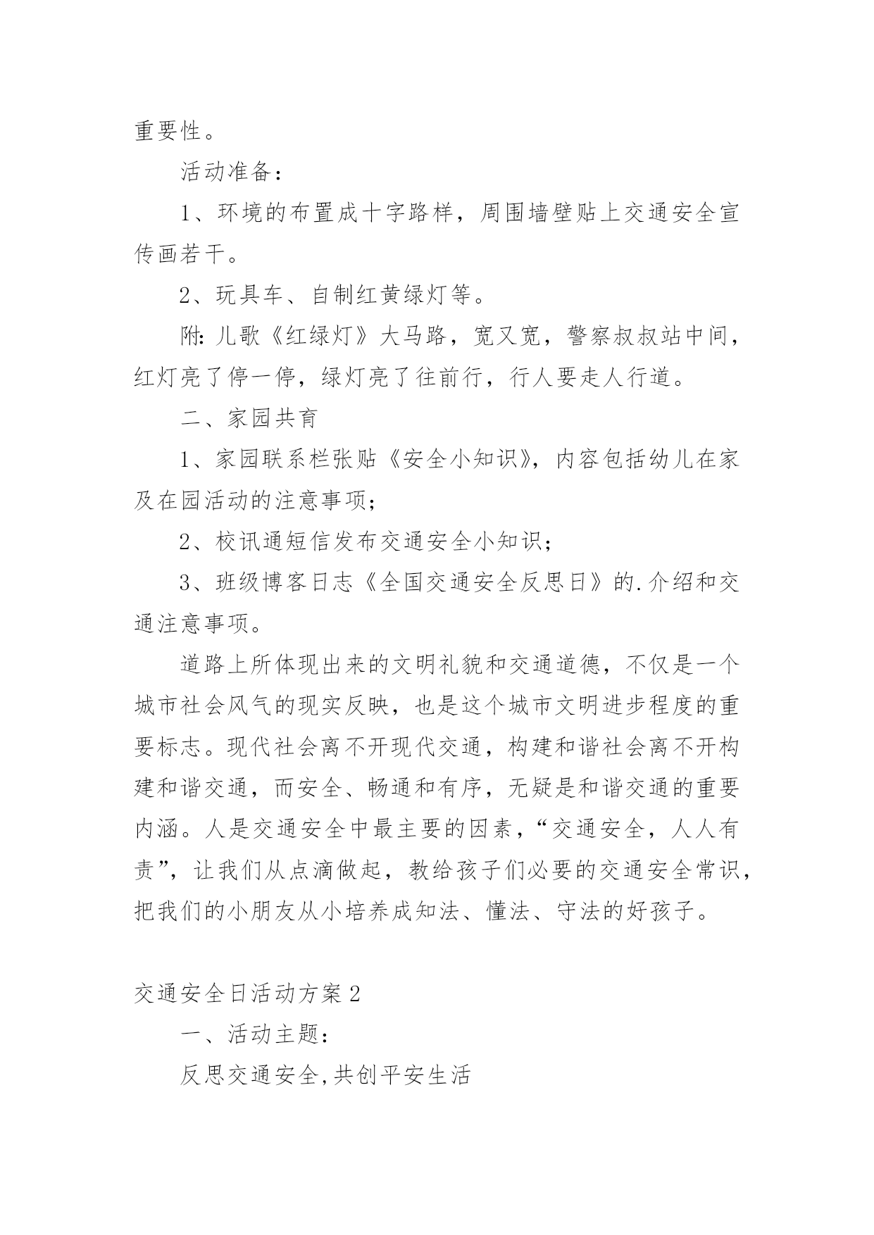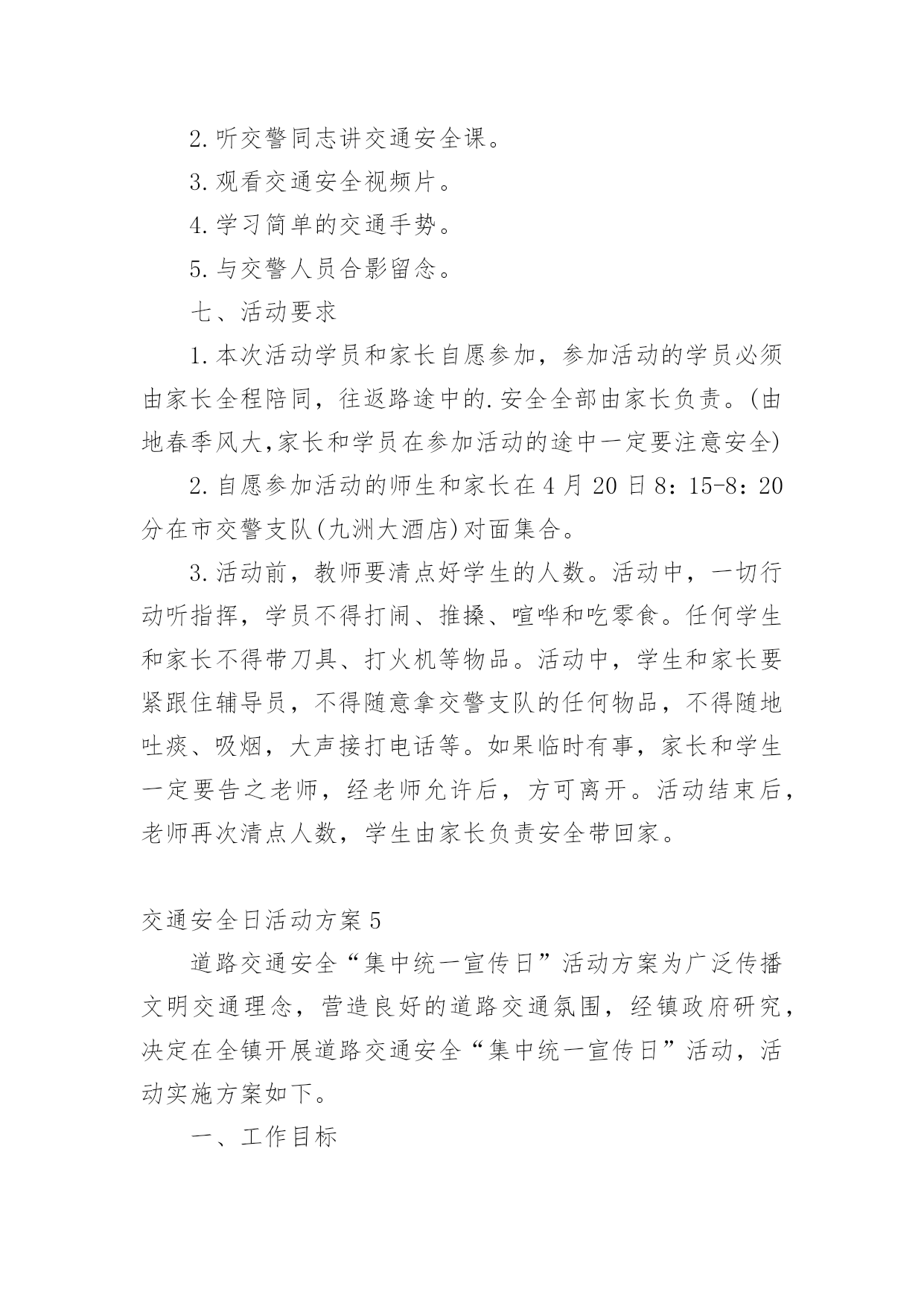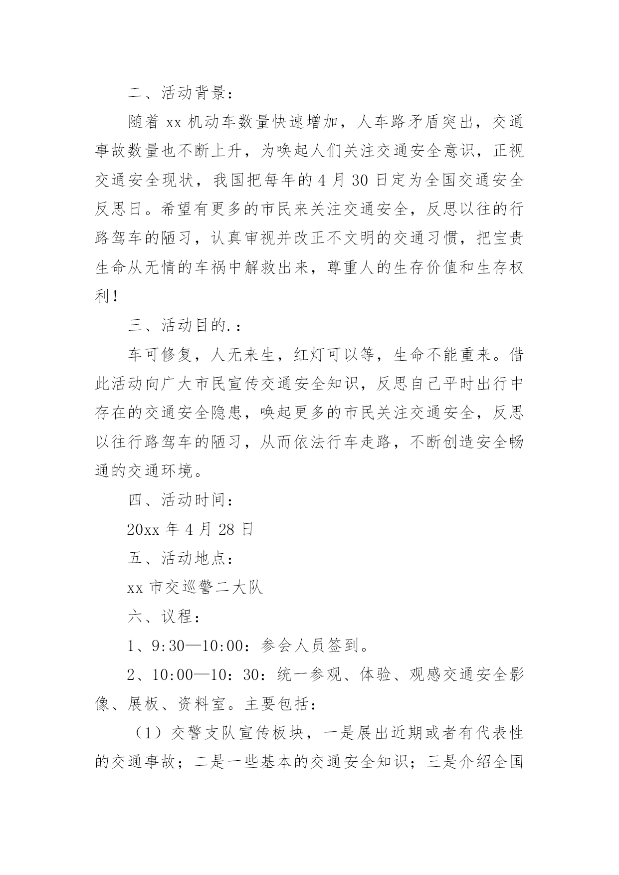 交通安全日活动方案交通安全日活动方案集合9篇为了确保工作或事情顺利进行,我们需要提前开始方案制定工作,方案是从目的、要求、方式、方法、进度等都部署具体、周密,并有很强可操作性的计划。那么什么样的方案才是好的呢?以下是小编整理的交通安全日活动方案,欢迎阅读与收藏。交通安全日活动方案1教学活动(一)认识交通警察活动目标:能与同伴交流分享自己已有的经验,初步了解交通警察的职业特征。情感目标:增强幼儿对交通警察的敬爱之情。技能目标:发展幼儿的语言表达能力活动准备:1、课件(马路上发生交通阻塞的图影资料)2、马路上车辆、行人的喧闹声录音,各种车辆的发动声和汽笛声录音。(二)红绿灯和交通标识活动目标:1、学习交通安全相应知识,提高幼儿自我保护能力。2、增强幼儿交通安全意识,初步懂得遵守交通法规的重要性。活动准备:1、环境的布置成十字路样,周围墙壁贴上交通安全宣传画若干。2、玩具车、自制红黄绿灯等。附:儿歌《红绿灯》大马路,宽又宽,警察叔叔站中间,红灯亮了停一停,绿灯亮了往前行,行人要走人行道。二、家园共育1、家园联系栏张贴《安全小知识》,内容包括幼儿在家及在园活动的注意事项;2、校讯通短信发布交通安全小知识;3、班级博客日志《全国交通安全反思日》的.介绍和交通注意事项。道路上所体现出来的文明礼貌和交通道德,不仅是一个城市社会风气的现实反映,也是这个城市文明进步程度的重要标志。现代社会离不开现代交通,构建和谐社会离不开构建和谐交通,而安全、畅通和有序,无疑是和谐交通的重要内涵。人是交通安全中最主要的因素,“交通安全,人人有责”,让我们从点滴做起,教给孩子们必要的交通安全常识,把我们的小朋友从小培养成知法、懂法、守法的好孩子。交通安全日活动方案2一、活动主题:反思交通安全,共创平安生活二、活动背景:随着xx机动车数量快速增加,人车路矛盾突出,交通事故数量也不断上升,为唤起人们关注交通安全意识,正视交通安全现状,我国把每年的4月30日定为全国交通安全反思日。希望有更多的市民来关注交通安全,反思以往的行路驾车的陋习,认真审视并改正不文明的交通习惯,把宝贵生命从无情的车祸中解救出来,尊重人的生存价值和生存权利!三、活动目的.:车可修复,人无来生,红灯可以等,生命不能重来。借此活动向广大市民宣传交通安全知识,反思自己平时出行中存在的交通安全隐患,唤起更多的市民关注交通安全,反思以往行路驾车的陋习,从而依法行车走路,不断创造安全畅通的交通环境。四、活动时间:20xx年4月28日五、活动地点:xx市交巡警二大队六、议程:1、9:30—10:00:参会人员签到。2、10:00—10:30:统一参观、体验、观感交通安全影像、展板、资料室。主要包括:(1)交警支队宣传板块,一是展出近期或者有代表性的交通事故;二是一些基本的交通安全知识;三是介绍全国交通安全反思日主持人介绍领导和来宾。介绍全国交通安全反思日(2)、主办单位领导致辞(3)、交警支队相关领导致辞(4)、建筑垃圾清理协会发表讲话(5)、交管专家做交通安全讲座、法律知识讲座(6)、与会渣土车驾驶员代表谈安全出行感受(7)、与会人员沟通交流(8)、交警支队与建筑垃圾清理协会及相关货运公司签订无交通违法保证书七、活动外宣1、宣传横幅,标语要鲜明2、将本活动相关信息发布到相关网站和微博上3、邀请xx主流相关媒体参与,形成舆论氛围4、邀请相关的大客(货)车司机和易发交通安全事故单位参与反思5、总结交通事故发生的原因及反思我们日常的出行陋习,警示交通参与者遵守交通安全联系人:彭xx电话:xx邢xx电话:xx交通安全日活动方案3一、活动主题:在全市范围内组织开展“看事故,引反思,评心得”系列教育宣传活动。二、活动时间:*年4月5日-*年5月30日三、活动内容:1、编印一本宣传册。宣传册内配一张*交通事故教育光盘。a4规格,彩色图文并茂印刷,全区印量10万本,6个县区分别10000本,市区40000本。内容以“*市交通安全反思日事故案例汇编”为主,采用问答式,例:超载会带来哪里危害?相关法规解释,列举一个超载事故案例,反思语。通过案例形式,以案说法,引起受教育人的反思,更好地自觉遵守交通法规。宣传册中串插交通安全相关法律法规,以及驾驶人员关心的相关违章处罚规定。2、撰写心得体会并评比。撰写心得是这次反思日教育的重点和创新,是对这次教育活动的有效验证。要求各部委办局、各系统行业、各大交通重点单位都要组织一次或多次集中学习,尤其是出租车、公交车、运输企业、驾校等重点单位更要主动带头,扎实开展,并要求受教育人撰写文明交通反思日心得体会,通过撰写心得体会,真正从思想上提高足够认识,达到宣传教育目的。对撰写的心得体会按照清河区、清浦区、开发区、淮阴区、*区、涟水县、洪泽县、盱眙县、金湖县这9个区县,每个区县选择10-20篇