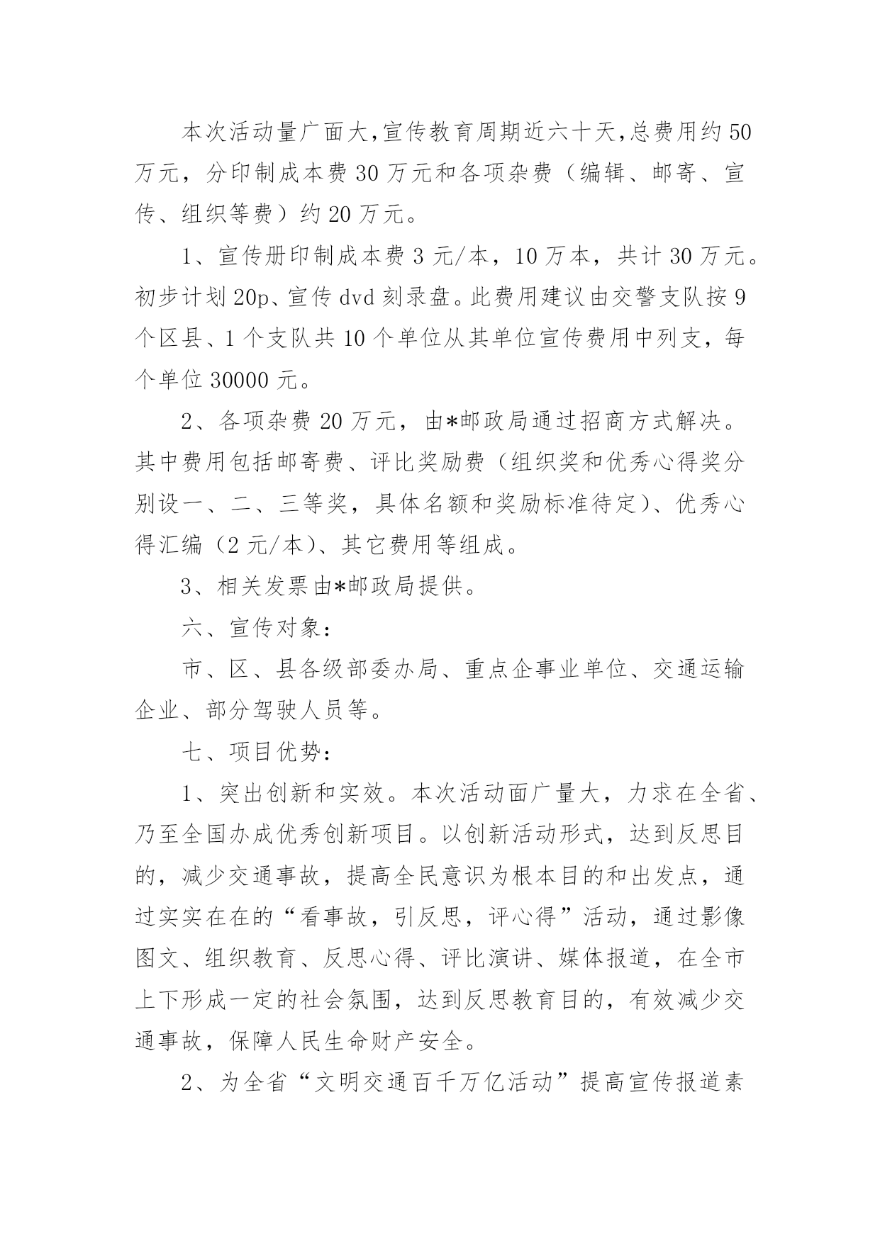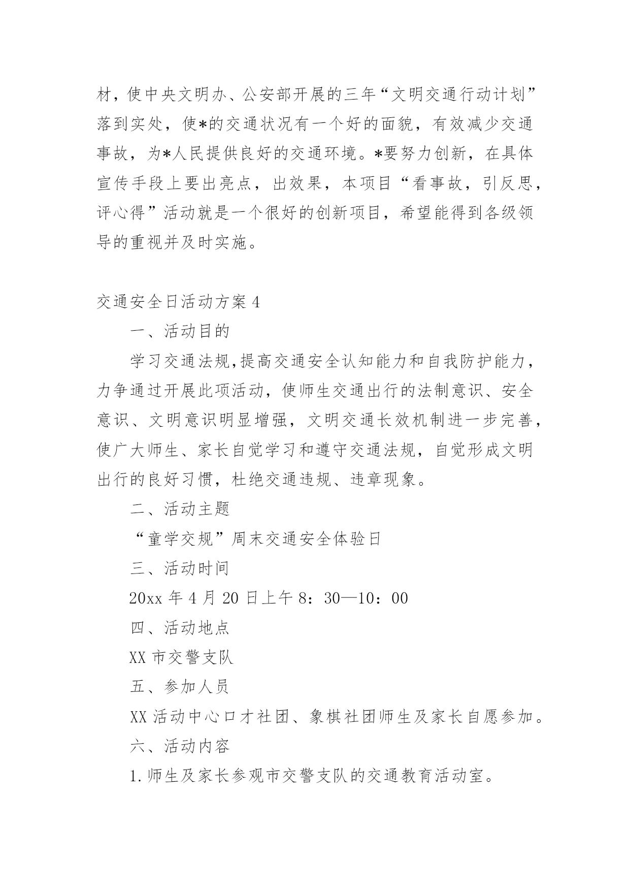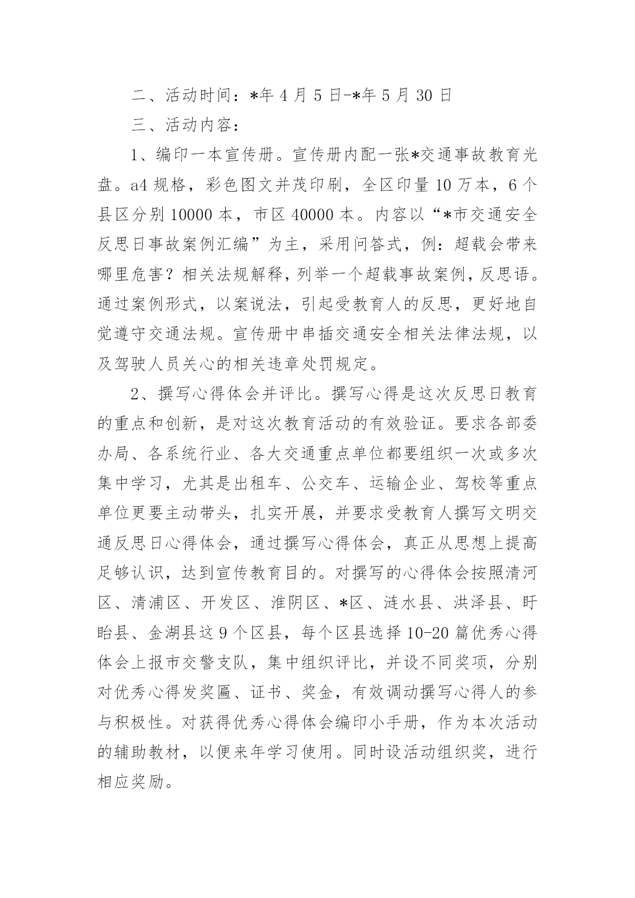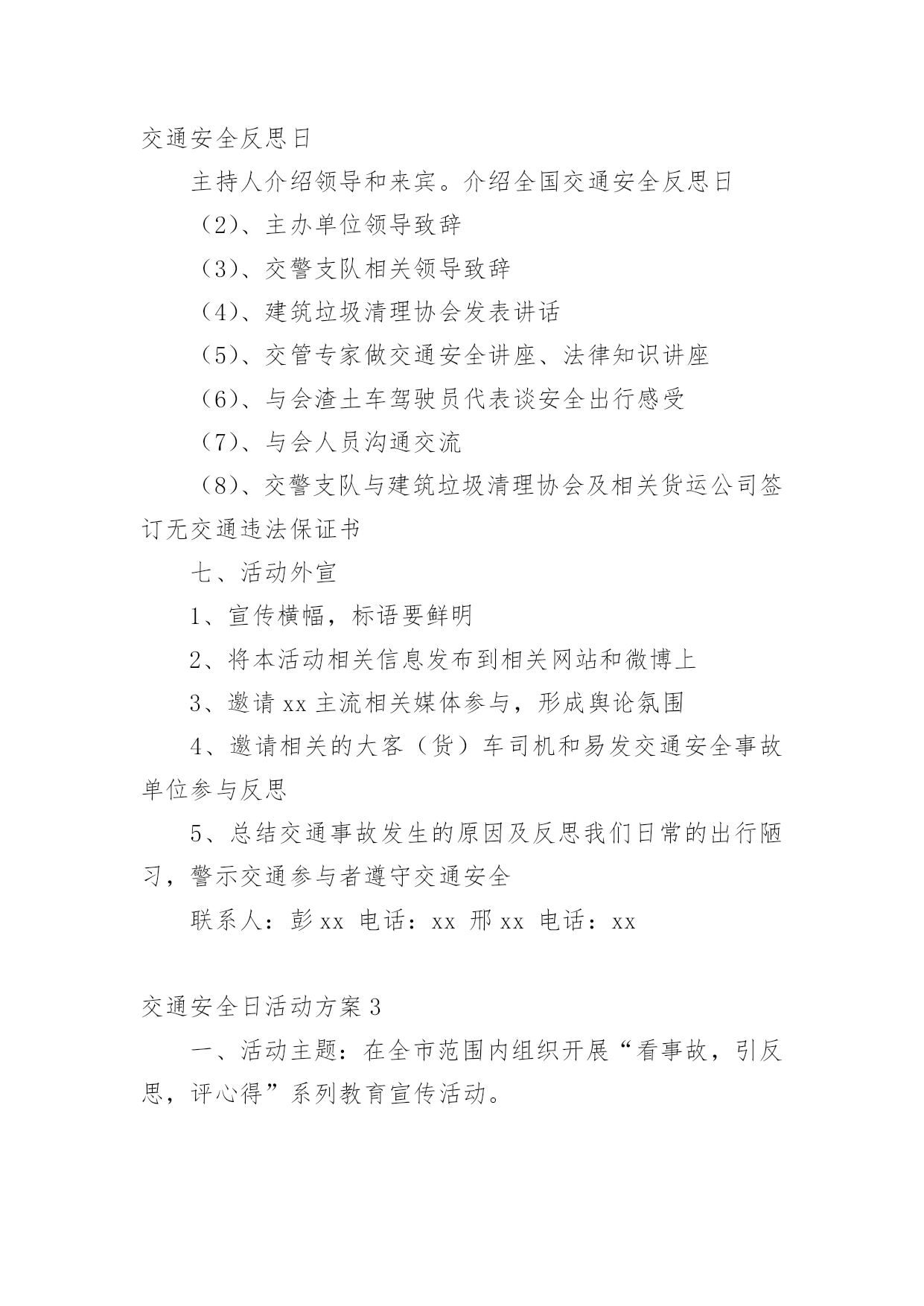 交通安全日活动方案交通安全日活动方案集合9篇为了确保工作或事情顺利进行,我们需要提前开始方案制定工作,方案是从目的、要求、方式、方法、进度等都部署具体、周密,并有很强可操作性的计划。那么什么样的方案才是好的呢?以下是小编整理的交通安全日活动方案,欢迎阅读与收藏。交通安全日活动方案1教学活动(一)认识交通警察活动目标:能与同伴交流分享自己已有的经验,初步了解交通警察的职业特征。情感目标:增强幼儿对交通警察的敬爱之情。技能目标:发展幼儿的语言表达能力活动准备:1、课件(马路上发生交通阻塞的图影资料)2、马路上车辆、行人的喧闹声录音,各种车辆的发动声和汽笛声录音。(二)红绿灯和交通标识活动目标:1、学习交通安全相应知识,提高幼儿自我保护能力。2、增强幼儿交通安全意识,初步懂得遵守交通法规的重要性。活动准备:1、环境的布置成十字路样,周围墙壁贴上交通安全宣传画若干。2、玩具车、自制红黄绿灯等。附:儿歌《红绿灯》大马路,宽又宽,警察叔叔站中间,红灯亮了停一停,绿灯亮了往前行,行人要走人行道。二、家园共育1、家园联系栏张贴《安全小知识》,内容包括幼儿在家及在园活动的注意事项;2、校讯通短信发布交通安全小知识;3、班级博客日志《全国交通安全反思日》的.介绍和交通注意事项。道路上所体现出来的文明礼貌和交通道德,不仅是一个城市社会风气的现实反映,也是这个城市文明进步程度的重要标志。现代社会离不开现代交通,构建和谐社会离不开构建和谐交通,而安全、畅通和有序,无疑是和谐交通的重要内涵。人是交通安全中最主要的因素,“交通安全,人人有责”,让我们从点滴做起,教给孩子们必要的交通安全常识,把我们的小朋友从小培养成知法、懂法、守法的好孩子。交通安全日活动方案2一、活动主题:反思交通安全,共创平安生活二、活动背景:随着xx机动车数量快速增加,人车路矛盾突出,交通事故数量也不断上升,为唤起人们关注交通安全意识,正视交通安全现状,我国把每年的4月30日定为全国交通安全反思日。希望有更多的市民来关注交通安全,反思以往的行路驾车的陋习,认真审视并改正不文明的交通习惯,把宝贵生命从无情的车祸中解救出来,尊重人的生存价值和生存权利!三、活动目的.:车可修复,人无来生,红灯可以等,生命不能重来。借此活动向广大市民宣传交通安全知识,反思自己平时出行中存在的交通安全隐患,唤起更多的市民关注交通安全,反思以往行路驾车的陋习,从而依法行车走路,不断创造安全畅通的交通环境。四、活动时间:20xx年4月28日五、活动地点:xx市交巡警二大队六、议程:1、9:30—10:00:参会人员签到。2、10:00—10:30:统一参观、体验、观感交通安全影像、展板、资料室。主要包括:(1)交警支队宣传板块,一是展出近期或者有代表性的交通事故;二是一些基本的交通安全知识;三是介绍全国交通安全反思日主持人介绍领导和来宾。介绍全国交通安全反思日(2)、主办单位领导致辞(3)、交警支队相关领导致辞(4)、建筑垃圾清理协会发表讲话(5)、交管专家做交通安全讲座、法律知识讲座(6)、与会渣土车驾驶员代表谈安全出行感受(7)、与会人员沟通交流(8)、交警支队与建筑垃圾清理协会及相关货运公司签订无交通违法保证书七、活动外宣1、宣传横幅,标语要鲜明2、将本活动相关信息发布到相关网站和微博上3、邀请xx主流相关媒体参与,形成舆论氛围4、邀请相关的大客(货)车司机和易发交通安全事故单位参与反思5、总结交通事故发生的原因及反思我们日常的出行陋习,警示交通参与者遵守交通安全联系人:彭xx电话:xx邢xx电话:xx交通安全日活动方案3一、活动主题:在全市范围内组织开展“看事故,引反思,评心得”系列教育宣传活动。二、活动时间:*年4月5日-*年5月30日三、活动内容:1、编印一本宣传册。宣传册内配一张*交通事故教育光盘。a4规格,彩色图文并茂印刷,全区印量10万本,6个县区分别10000本,市区40000本。内容以“*市交通安全反思日事故案例汇编”为主,采用问答式,例:超载会带来哪里危害?相关法规解释,列举一个超载事故案例,反思语。通过案例形式,以案说法,引起受教育人的反思,更好地自觉遵守交通法规。宣传册中串插交通安全相关法律法规,以及驾驶人员关心的相关违章处罚规定。2、撰写心得体会并评比。撰写心得是这次反思日教育的重点和创新,是对这次教育活动的有效验证。要求各部委办局、各系统行业、各大交通重点单位都要组织一次或多次集中学习,尤其是出租车、公交车、运输企业、驾校等重点单位更要主动带头,扎实开展,并要求受教育人撰写文明交通反思日心得体会,通过撰写心得体会,真正从思想上提高足够认识,达到宣传教育目的。对撰写的心得体会按照清河区、清浦区、开发区、淮阴区、*区、涟水县、洪泽县、盱眙县、金湖县这9个区县,每个区县选择10-20篇
