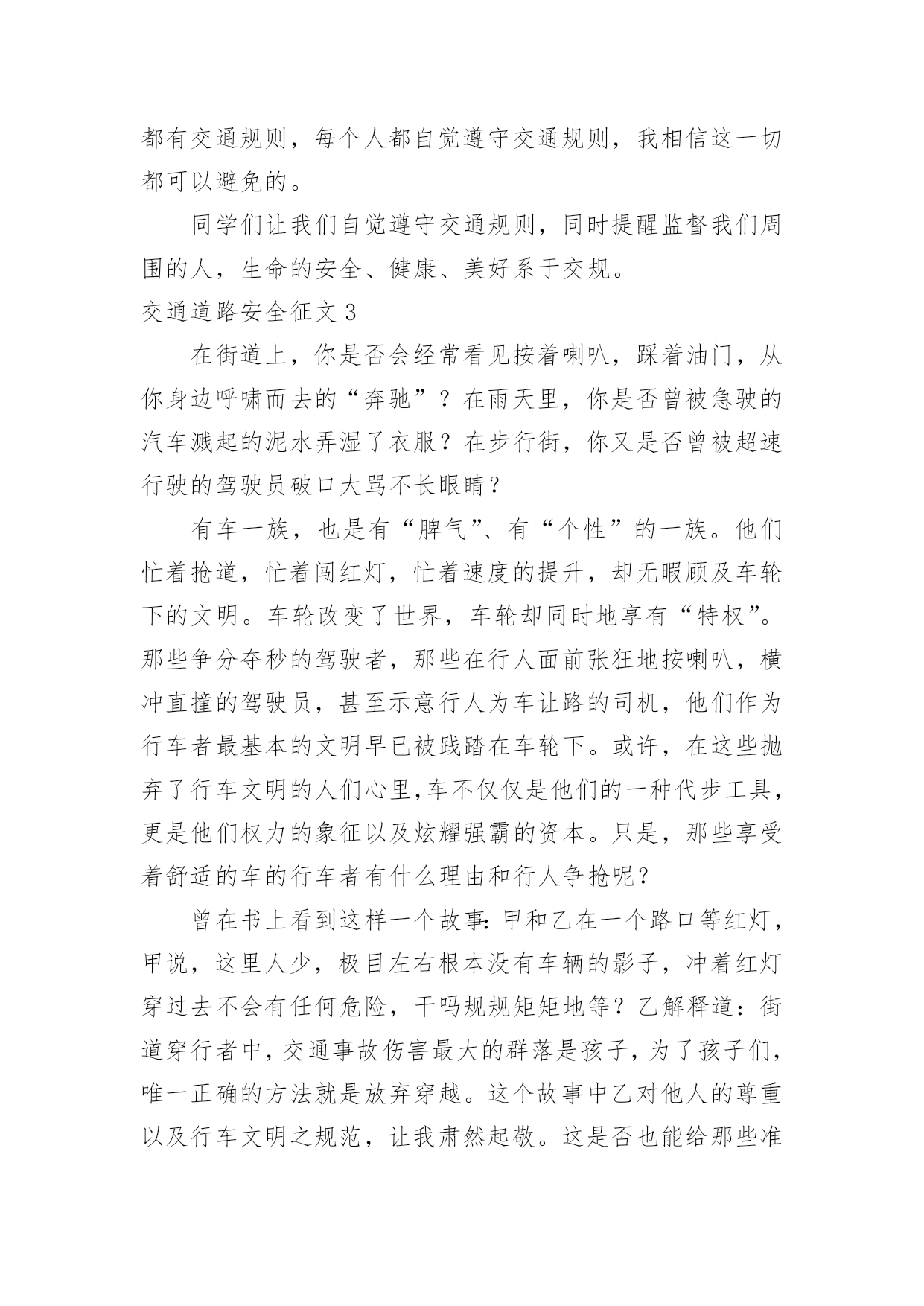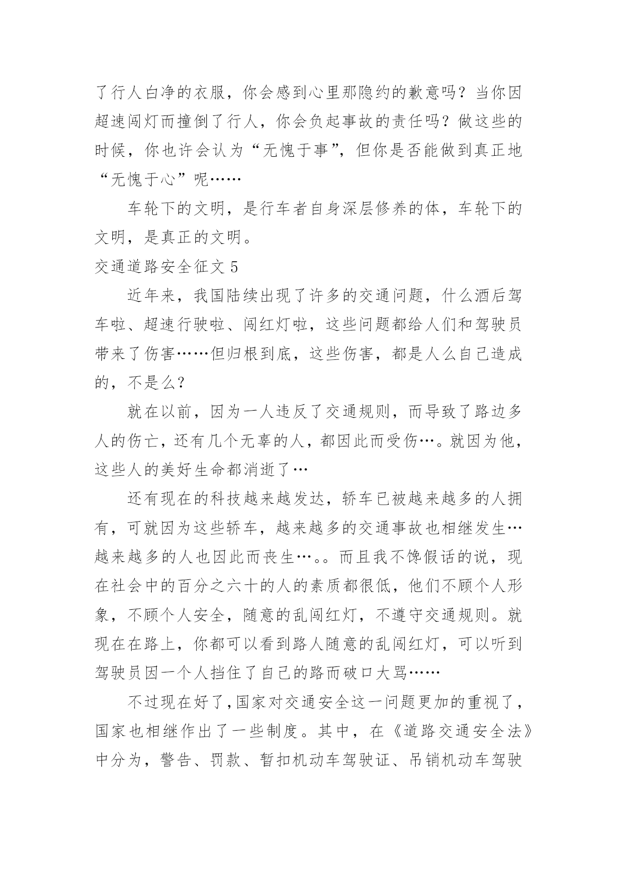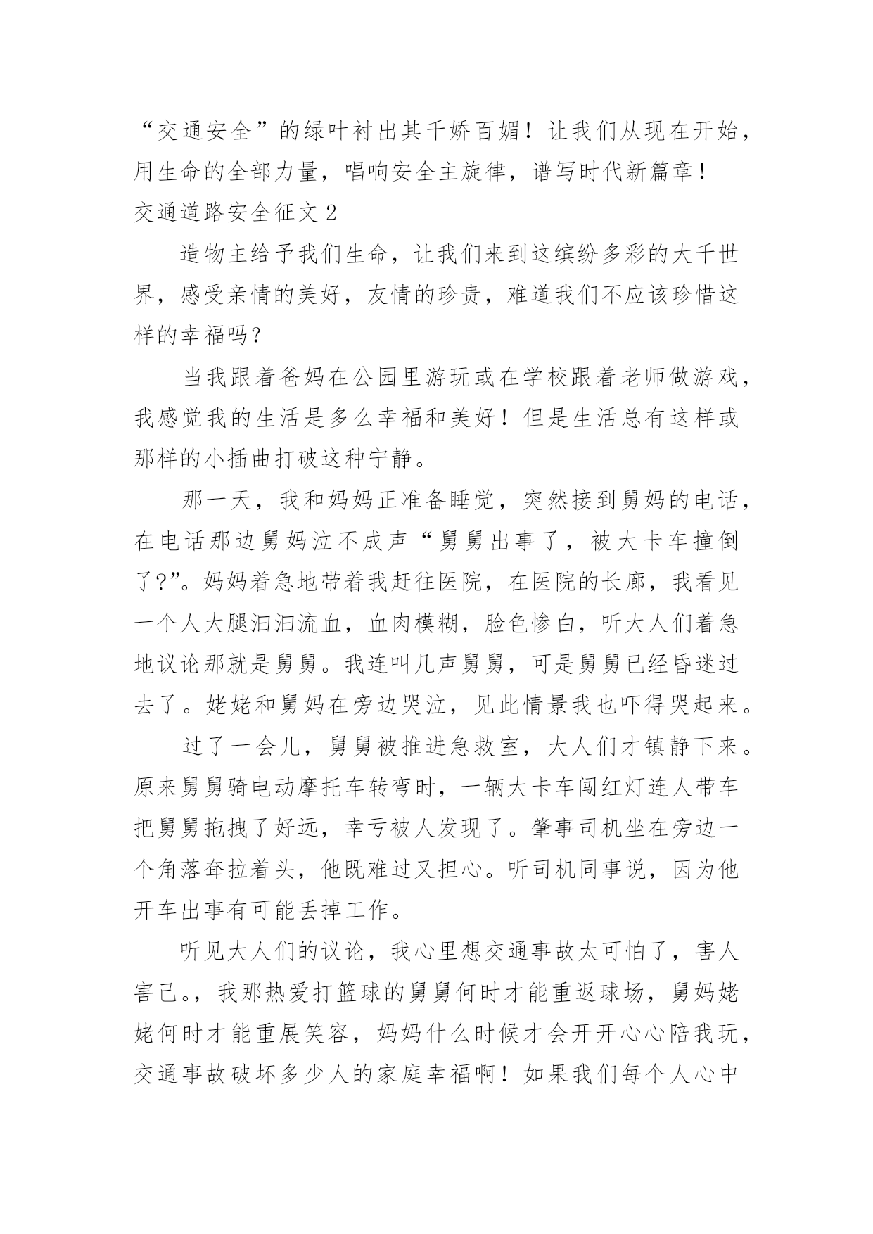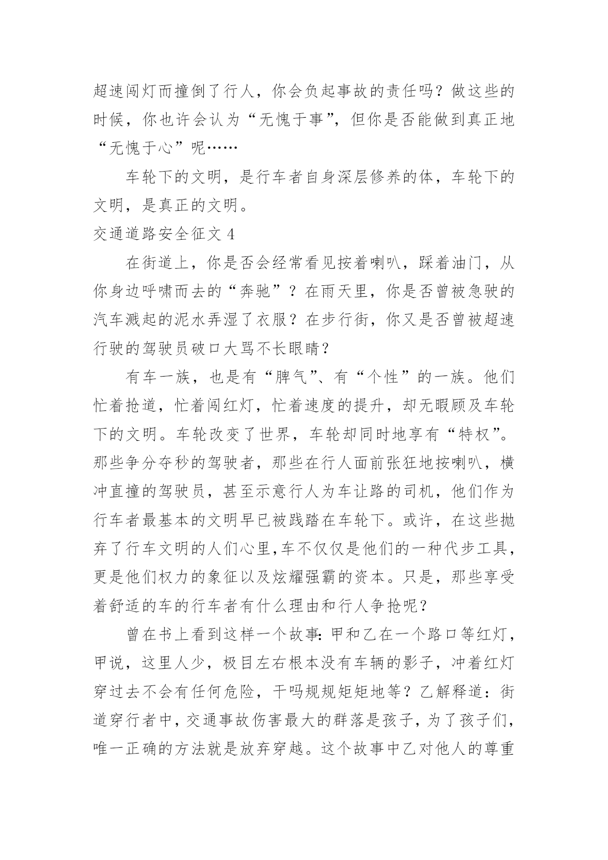 交通道路安全征文交通道路安全征文在日常的学习、工作、生活中,大家都不可避免地要接触到征文吧,征文一般是某个活动、征文比赛等需要,作者将稿件递给征文活动主办者后,作者的作品就可以参与比赛,但是著作权的一部分也相应给了征文活动主办方。你知道征文怎样写才规范吗?下面是小编收集整理的交通道路安全征文,欢迎大家借鉴与参考,希望对大家有所帮助。交通道路安全征文1我时时感叹:“安全”这沉甸甸的两个字,承载多少希望和梦想;我常常思索:“交通安全”这言简意赅的四个字,包含几多喜悦和悲伤啊!有报道说:我国每年有近1.6万中小学生非正常死亡,那么每天都有近40名学生意外死亡,相当于每天减少一个班级。这可怕的数字!真叫人触目惊心。每天我们行走在马路上,会时常发现有人骑自行车逆行,有人乱闯红灯横穿马路,有人坐在车里把手伸出窗外,还有的人明知车超载,硬往车上挤……交通违规的例子,不胜枚举。母亲给予了我们生命,让我们能自由呼吸,不断成长,看到了一路的好风景……今天的我们不正是冉冉升起的初阳吗?充满青春活力,散发蓬勃朝气,但是,您可曾想过,当我们离开母亲的怀抱,独立行走在人生道路上时,我们如此美妙的生命靠的是什么?我思来想去,归结成两个字:安全!是“安全”这把拐杖扞卫着我们的生命,维护我们生存的权利。生命是美好的。不讲安全的生存是危险的。在我看来,安全是幸福,为家庭带来欢笑;安全是快乐,让生活充满希望;安全是健康,给你健全的体魄,安全是激情,创造世界,书写历史。金钱诚可贵,速度价更高,若为安全故,二者皆可抛。通江县广钠小学楼道里学生遭遇踩踏时凄厉的惨叫声,江西沁源县二中学生晨练时被拉煤车碾压的血腥画面,我分明感到,那一个个曾经青春如我,鲜亮如我的生命在逝去时是多么无奈与不甘。这一连串发生在我们身边的并不遥远的事故在以血的代价向我们诉说,威胁人类生命的杀手不是疾病,不是天灾,而是我们忽视交通安全的观念。我们作为一个鲜活的驾驭者,难道不该为自己高贵却又易碎的生命之舟保驾护航吗?时光飞逝,岁月轮回,从欢乐到悲伤,从成功到失败,生与死的距离何其遥远却又何其相近:也许就是你一个偶然的疏忽,一个盲目的行为,一丝侥幸的心理,让生命瞬间付出了昂贵代价,终生无法弥补!生命的河流,需要“交通安全”做坚固的护堤;生命的画卷,需要“交通安全”这枝笔来描绘。生命的鲜花,需要“交通安全”的绿叶衬出其千娇百媚!让我们从现在开始,用生命的全部力量,唱响安全主旋律,谱写时代新篇章!交通道路安全征文2造物主给予我们生命,让我们来到这缤纷多彩的大千世界,感受亲情的美好,友情的珍贵,难道我们不应该珍惜这样的幸福吗?当我跟着爸妈在公园里游玩或在学校跟着老师做游戏,我感觉我的生活是多么幸福和美好!但是生活总有这样或那样的小插曲打破这种宁静。那一天,我和妈妈正准备睡觉,突然接到舅妈的电话,在电话那边舅妈泣不成声“舅舅出事了,被大卡车撞倒了?”。妈妈着急地带着我赶往医院,在医院的长廊,我看见一个人大腿汩汩流血,血肉模糊,脸色惨白,听大人们着急地议论那就是舅舅。我连叫几声舅舅,可是舅舅已经昏迷过去了。姥姥和舅妈在旁边哭泣,见此情景我也吓得哭起来。过了一会儿,舅舅被推进急救室,大人们才镇静下来。原来舅舅骑电动摩托车转弯时,一辆大卡车闯红灯连人带车把舅舅拖拽了好远,幸亏被人发现了。肇事司机坐在旁边一个角落耷拉着头,他既难过又担心。听司机同事说,因为他开车出事有可能丢掉工作。听见大人们的议论,我心里想交通事故太可怕了,害人害己。,我那热爱打篮球的舅舅何时才能重返球场,舅妈姥姥何时才能重展笑容,妈妈什么时候才会开开心心陪我玩,交通事故破坏多少人的家庭幸福啊!如果我们每个人心中都有交通规则,每个人都自觉遵守交通规则,我相信这一切都可以避免的。同学们让我们自觉遵守交通规则,同时提醒监督我们周围的人,生命的安全、健康、美好系于交规。交通道路安全征文3在街道上,你是否会经常看见按着喇叭,踩着油门,从你身边呼啸而去的“奔驰”?在雨天里,你是否曾被急驶的汽车溅起的泥水弄湿了衣服?在步行街,你又是否曾被超速行驶的驾驶员破口大骂不长眼睛?有车一族,也是有“脾气”、有“个性”的一族。他们忙着抢道,忙着闯红灯,忙着速度的提升,却无暇顾及车轮下的文明。车轮改变了世界,车轮却同时地享有“特权”。那些争分夺秒的驾驶者,那些在行人面前张狂地按喇叭,横冲直撞的驾驶员,甚至示意行人为车让路的司机,他们作为行车者最基本的文明早已被践踏在车轮下。或许,在这些抛弃了行车文明的人们心里,车不仅仅是他们的一种代步工具,更是他们权力的象征以及炫耀强霸的资本。只是,那些享受着舒适的车的行车者有什么理由和行人争抢呢?曾在书上看到这样一个故事:甲和乙在一个路口等红灯,甲说,这里人少,极目左右根本没有车辆的影子,冲着红灯穿过去不会有任何危险,干吗规规矩矩地等?乙