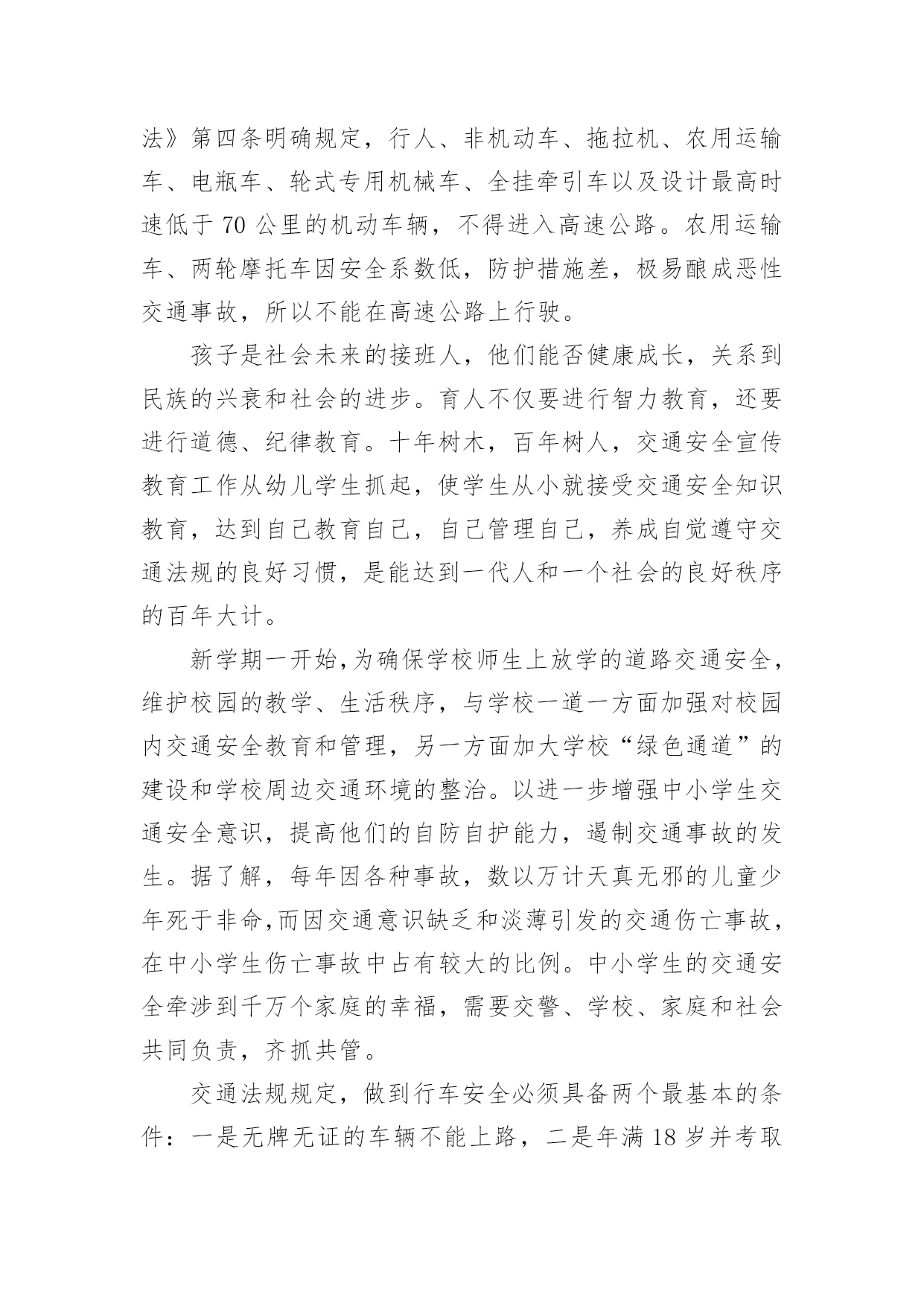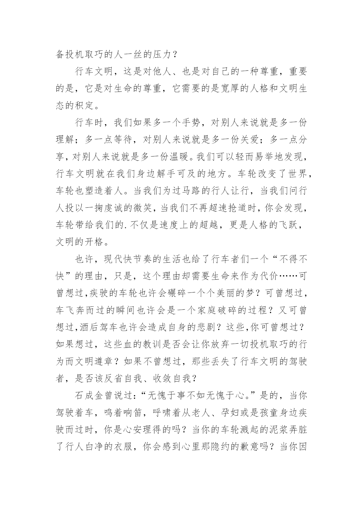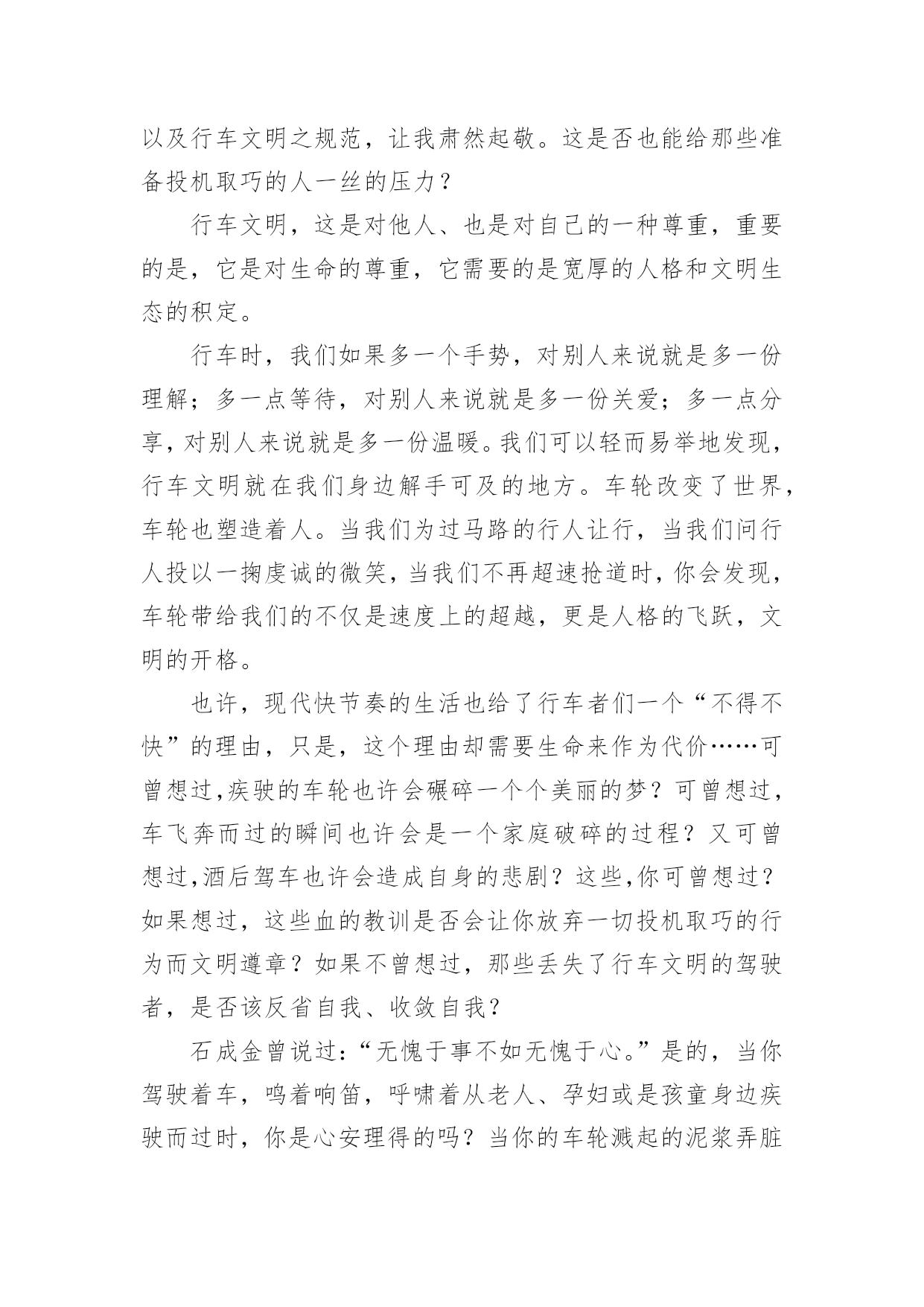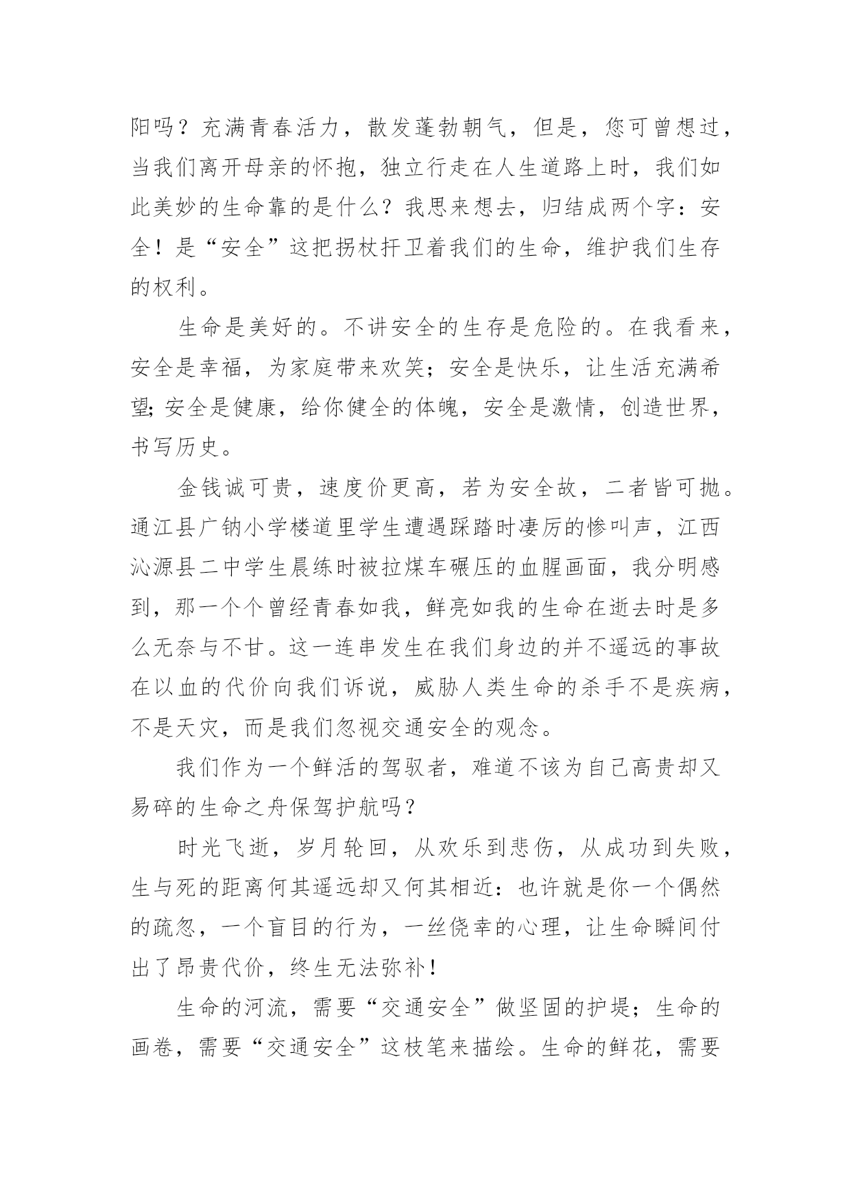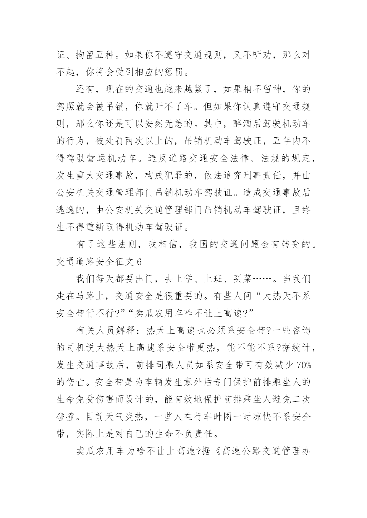 交通道路安全征文交通道路安全征文在日常的学习、工作、生活中,大家都不可避免地要接触到征文吧,征文一般是某个活动、征文比赛等需要,作者将稿件递给征文活动主办者后,作者的作品就可以参与比赛,但是著作权的一部分也相应给了征文活动主办方。你知道征文怎样写才规范吗?下面是小编收集整理的交通道路安全征文,欢迎大家借鉴与参考,希望对大家有所帮助。交通道路安全征文1我时时感叹:“安全”这沉甸甸的两个字,承载多少希望和梦想;我常常思索:“交通安全”这言简意赅的四个字,包含几多喜悦和悲伤啊!有报道说:我国每年有近1.6万中小学生非正常死亡,那么每天都有近40名学生意外死亡,相当于每天减少一个班级。这可怕的数字!真叫人触目惊心。每天我们行走在马路上,会时常发现有人骑自行车逆行,有人乱闯红灯横穿马路,有人坐在车里把手伸出窗外,还有的人明知车超载,硬往车上挤……交通违规的例子,不胜枚举。母亲给予了我们生命,让我们能自由呼吸,不断成长,看到了一路的好风景……今天的我们不正是冉冉升起的初阳吗?充满青春活力,散发蓬勃朝气,但是,您可曾想过,当我们离开母亲的怀抱,独立行走在人生道路上时,我们如此美妙的生命靠的是什么?我思来想去,归结成两个字:安全!是“安全”这把拐杖扞卫着我们的生命,维护我们生存的权利。生命是美好的。不讲安全的生存是危险的。在我看来,安全是幸福,为家庭带来欢笑;安全是快乐,让生活充满希望;安全是健康,给你健全的体魄,安全是激情,创造世界,书写历史。金钱诚可贵,速度价更高,若为安全故,二者皆可抛。通江县广钠小学楼道里学生遭遇踩踏时凄厉的惨叫声,江西沁源县二中学生晨练时被拉煤车碾压的血腥画面,我分明感到,那一个个曾经青春如我,鲜亮如我的生命在逝去时是多么无奈与不甘。这一连串发生在我们身边的并不遥远的事故在以血的代价向我们诉说,威胁人类生命的杀手不是疾病,不是天灾,而是我们忽视交通安全的观念。我们作为一个鲜活的驾驭者,难道不该为自己高贵却又易碎的生命之舟保驾护航吗?时光飞逝,岁月轮回,从欢乐到悲伤,从成功到失败,生与死的距离何其遥远却又何其相近:也许就是你一个偶然的疏忽,一个盲目的行为,一丝侥幸的心理,让生命瞬间付出了昂贵代价,终生无法弥补!生命的河流,需要“交通安全”做坚固的护堤;生命的画卷,需要“交通安全”这枝笔来描绘。生命的鲜花,需要“交通安全”的绿叶衬出其千娇百媚!让我们从现在开始,用生命的全部力量,唱响安全主旋律,谱写时代新篇章!交通道路安全征文2造物主给予我们生命,让我们来到这缤纷多彩的大千世界,感受亲情的美好,友情的珍贵,难道我们不应该珍惜这样的幸福吗?当我跟着爸妈在公园里游玩或在学校跟着老师做游戏,我感觉我的生活是多么幸福和美好!但是生活总有这样或那样的小插曲打破这种宁静。那一天,我和妈妈正准备睡觉,突然接到舅妈的电话,在电话那边舅妈泣不成声“舅舅出事了,被大卡车撞倒了?”。妈妈着急地带着我赶往医院,在医院的长廊,我看见一个人大腿汩汩流血,血肉模糊,脸色惨白,听大人们着急地议论那就是舅舅。我连叫几声舅舅,可是舅舅已经昏迷过去了。姥姥和舅妈在旁边哭泣,见此情景我也吓得哭起来。过了一会儿,舅舅被推进急救室,大人们才镇静下来。原来舅舅骑电动摩托车转弯时,一辆大卡车闯红灯连人带车把舅舅拖拽了好远,幸亏被人发现了。肇事司机坐在旁边一个角落耷拉着头,他既难过又担心。听司机同事说,因为他开车出事有可能丢掉工作。听见大人们的议论,我心里想交通事故太可怕了,害人害己。,我那热爱打篮球的舅舅何时才能重返球场,舅妈姥姥何时才能重展笑容,妈妈什么时候才会开开心心陪我玩,交通事故破坏多少人的家庭幸福啊!如果我们每个人心中都有交通规则,每个人都自觉遵守交通规则,我相信这一切都可以避免的。同学们让我们自觉遵守交通规则,同时提醒监督我们周围的人,生命的安全、健康、美好系于交规。交通道路安全征文3在街道上,你是否会经常看见按着喇叭,踩着油门,从你身边呼啸而去的“奔驰”?在雨天里,你是否曾被急驶的汽车溅起的泥水弄湿了衣服?在步行街,你又是否曾被超速行驶的驾驶员破口大骂不长眼睛?有车一族,也是有“脾气”、有“个性”的一族。他们忙着抢道,忙着闯红灯,忙着速度的提升,却无暇顾及车轮下的文明。车轮改变了世界,车轮却同时地享有“特权”。那些争分夺秒的驾驶者,那些在行人面前张狂地按喇叭,横冲直撞的驾驶员,甚至示意行人为车让路的司机,他们作为行车者最基本的文明早已被践踏在车轮下。或许,在这些抛弃了行车文明的人们心里,车不仅仅是他们的一种代步工具,更是他们权力的象征以及炫耀强霸的资本。只是,那些享受着舒适的车的行车者有什么理由和行人争抢呢?曾在书上看到这样一个故事:甲和乙在一个路口等红灯,甲说,这里人少,极目左右根本没有车辆的影子,冲着红灯穿过去不会有任何危险,干吗规规矩矩地等?乙