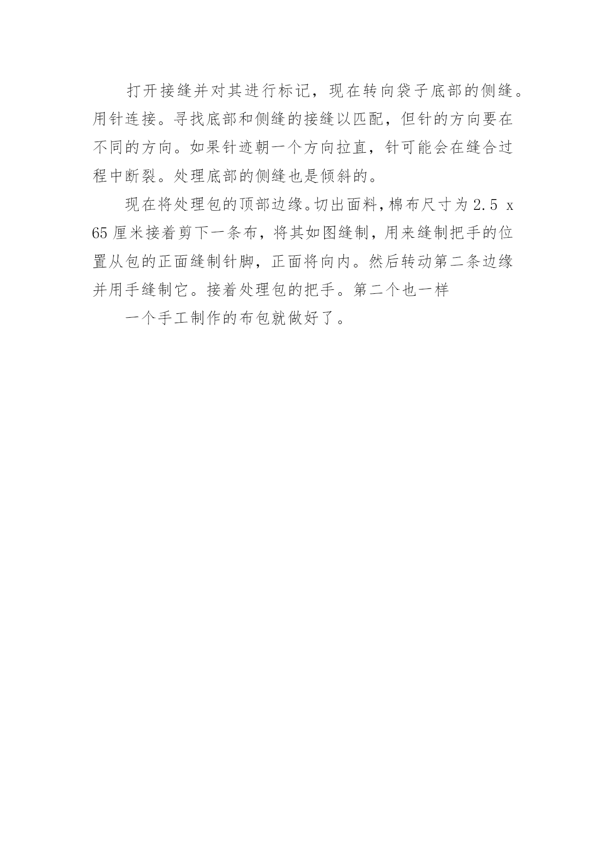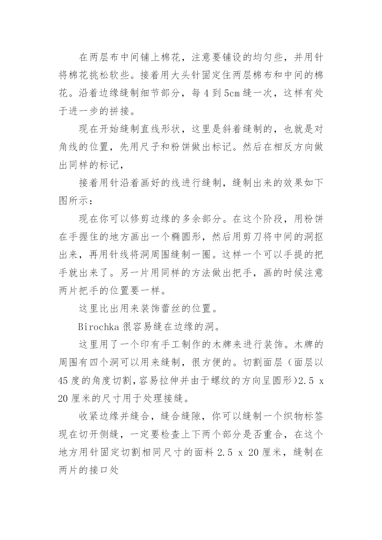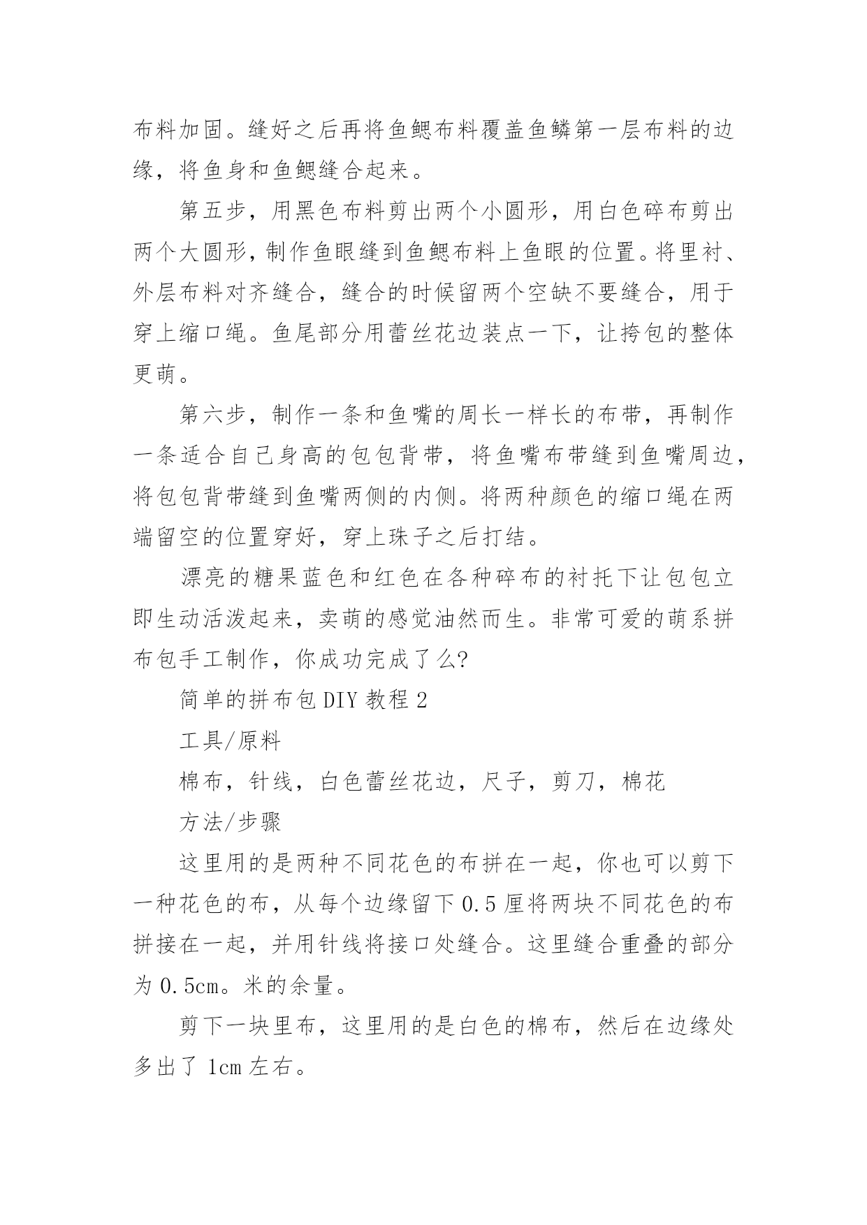 简单的拼布包DIY教程简单的拼布包DIY教程大家喜欢的拼布包包又来了,这次小编为小伙伴们带来的是一款十分清新可人的手提包,保准让你一看就会喜欢上它。下面是小编为大家收集的简单的拼布包DIY教程,欢迎大家借鉴与参考,希望对大家有所帮助。简单的拼布包DIY教程1拼布挎包材料准备:计划制作一蓝一红两个布袋,准备了红蓝布料各一块,里衬布料两块,碎布若干,剪刀、扣子、铅笔、花边蕾丝、针线等材料。拼布挎包制作步骤:第一步,用纸皮画出鲤鱼的模样,用剪刀把鱼鳃和鱼身的部位分开,然后分别按模板裁剪出鱼鳃和鱼身的布料各一块、整条鲤鱼形状的布料一块。第二步,用纸皮裁剪出鱼鳞的模板,沿着模板将各种碎布裁剪出五颜六色的鱼鳞片。然后将这些鱼鳞片简单地用针线缝成一大片鱼鳞,方便后面的手工DIY。第三步,用布料按着鲤鱼鱼身的模板裁剪出两块布料,正面对正面对齐布料缝合做出包包的里衬,让制作好的挎包更加耐用。第四步,将鱼鳞对齐鱼身布料缝到包包的外层布料,为了加固鱼鳞的稳固性,需要一层一层地将鱼鳞缝到鱼身外层布料加固。缝好之后再将鱼鳃布料覆盖鱼鳞第一层布料的边缘,将鱼身和鱼鳃缝合起来。第五步,用黑色布料剪出两个小圆形,用白色碎布剪出两个大圆形,制作鱼眼缝到鱼鳃布料上鱼眼的位置。将里衬、外层布料对齐缝合,缝合的时候留两个空缺不要缝合,用于穿上缩口绳。鱼尾部分用蕾丝花边装点一下,让挎包的整体更萌。第六步,制作一条和鱼嘴的周长一样长的布带,再制作一条适合自己身高的包包背带,将鱼嘴布带缝到鱼嘴周边,将包包背带缝到鱼嘴两侧的内侧。将两种颜色的缩口绳在两端留空的位置穿好,穿上珠子之后打结。漂亮的糖果蓝色和红色在各种碎布的衬托下让包包立即生动活泼起来,卖萌的感觉油然而生。非常可爱的萌系拼布包手工制作,你成功完成了么?简单的拼布包DIY教程2工具/原料棉布,针线,白色蕾丝花边,尺子,剪刀,棉花方法/步骤这里用的是两种不同花色的布拼在一起,你也可以剪下一种花色的布,从每个边缘留下0.5厘将两块不同花色的布拼接在一起,并用针线将接口处缝合。这里缝合重叠的部分为0.5cm。米的余量。剪下一块里布,这里用的是白色的棉布,然后在边缘处多出了1cm左右。在两层布中间铺上棉花,注意要铺设的均匀些,并用针将棉花挑松软些。接着用大头针固定住两层棉布和中间的棉花。沿着边缘缝制细节部分,每4到5cm缝一次,这样有处于进一步的拼接。现在开始缝制直线形状,这里是斜着缝制的,也就是对角线的位置,先用尺子和粉饼做出标记。然后在相反方向做出同样的标记,接着用针沿着画好的线进行缝制,缝制出来的效果如下图所示:现在你可以修剪边缘的多余部分。在这个阶段,用粉饼在手握住的地方画出一个椭圆形,然后用剪刀将中间的洞抠出来,再用针线将洞周围缝制一圈。这样一个可以手提的把手就出来了。另一片用同样的方法做出把手,画的时候注意两片把手的位置要一样。这里比出用来装饰蕾丝的位置。Birochka很容易缝在边缘的洞。这里用了一个印有手工制作的木牌来进行装饰。木牌的周围有四个洞可以用来缝制,很方便的。切割面层(面层以45度的角度切割,容易拉伸并由于螺纹的方向呈圆形)2.5x20厘米的尺寸用于处理接缝。收紧边缘并缝合,缝合缝隙,你可以缝制一个织物标签现在切开侧缝,一定要检查上下两个部分是否重合,在这个地方用针固定切割相同尺寸的面料2.5x20厘米,缝制在两片的接口处打开接缝并对其进行标记,现在转向袋子底部的侧缝。用针连接。寻找底部和侧缝的接缝以匹配,但针的方向要在不同的方向。如果针迹朝一个方向拉直,针可能会在缝合过程中断裂。处理底部的侧缝也是倾斜的。现在将处理包的顶部边缘。切出面料,棉布尺寸为2.5x65厘米接着剪下一条布,将其如图缝制,用来缝制把手的位置从包的正面缝制针脚,正面将向内。然后转动第二条边缘并用手缝制它。接着处理包的把手。第二个也一样一个手工制作的布包就做好了。