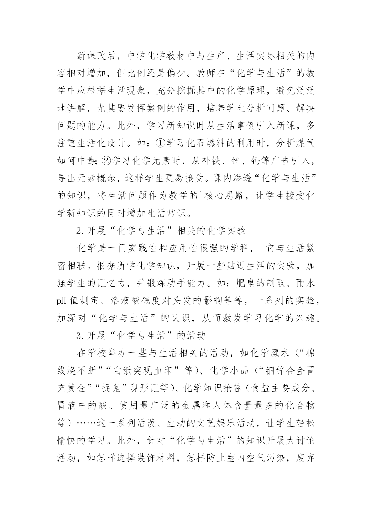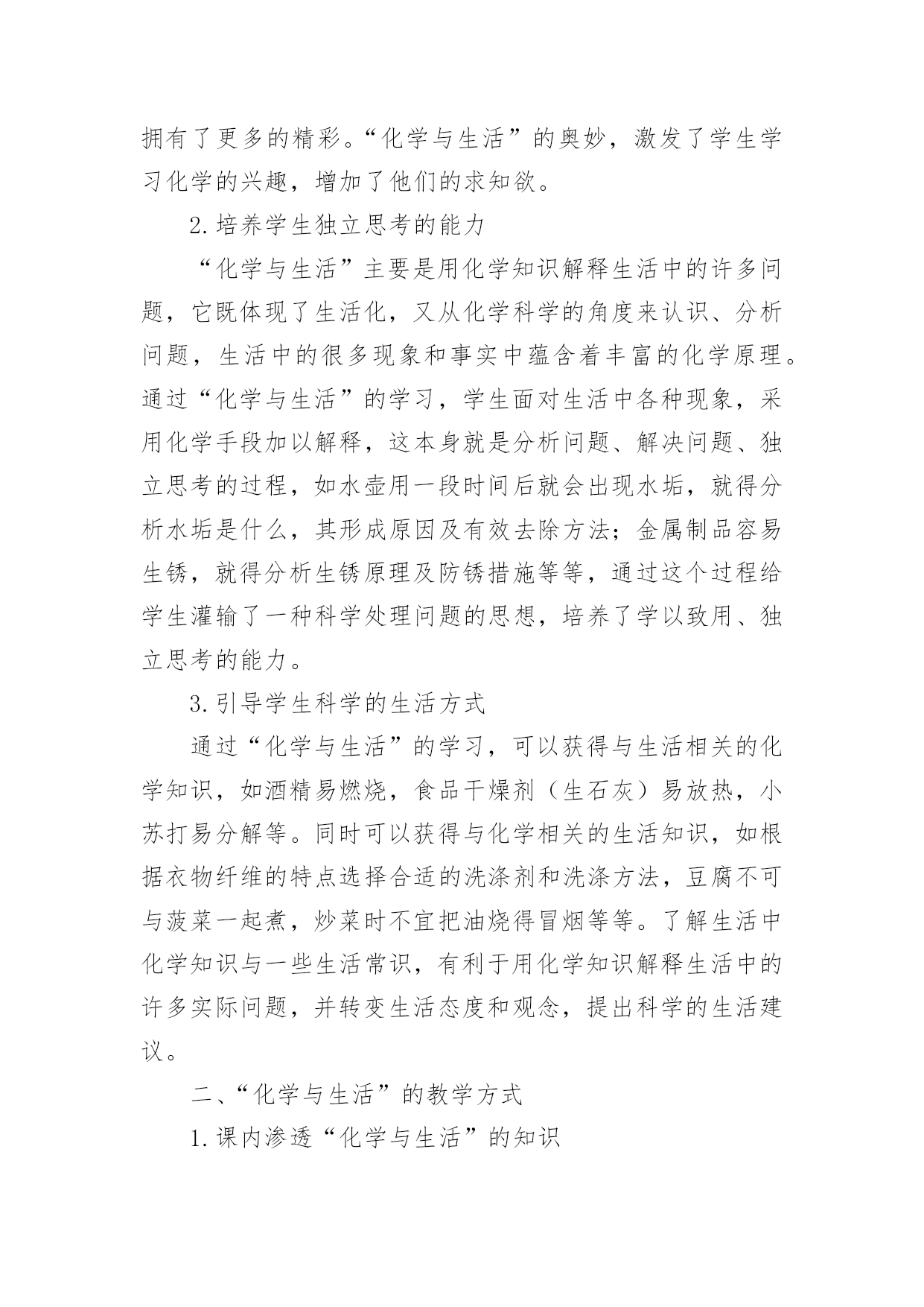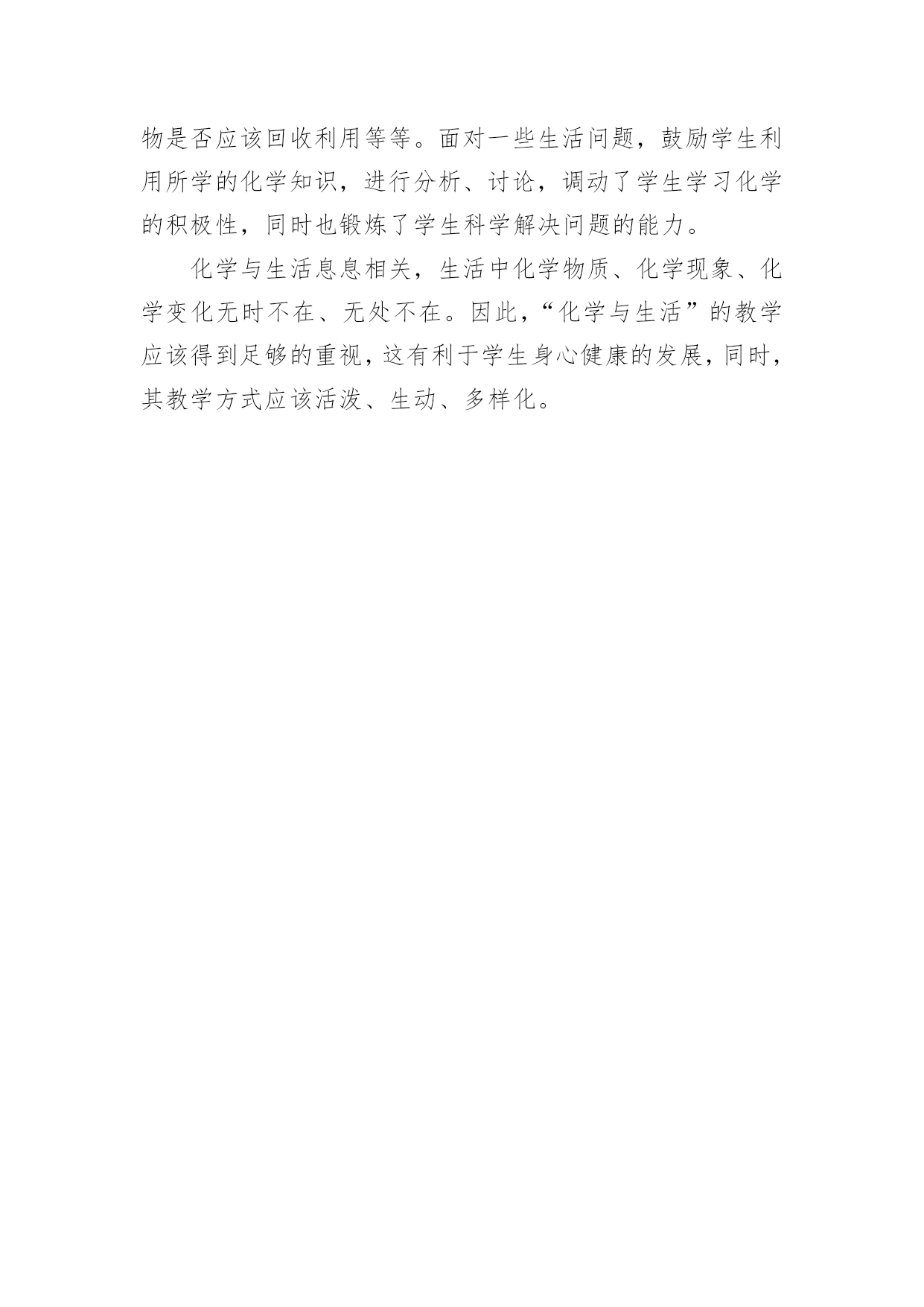 浅谈“化学与生活”的教学论文为什么充满氢气的气球能在天上飘,而换成嘴吹的就下沉呢?为什么小孩成长阶段要多喝牛奶?为什么葡萄密封会变成葡萄酒?为什么大多数易拉罐要用铝而不是铁和铜制作……这一切都离不开化学。化学与生活息息相关,它在衣、食、住、行领域中发挥着重要的、广泛的作用。但是“苏丹红、瘦肉精、三聚氰胺、塑化剂……”又让人谈“化”色变。化学是把双刃剑,既可造福人类,又可危害社会。因此,“化学与生活”作为教学内容应得到足够的重视,且其教学方式应该多样化。一、“化学与生活”对学生的影响1.激发学生学习化学的兴趣大多学生接触化学课后,觉得化学反应式、化学品的特性和原理使人感到十分抽象,难以理解。通过“化学与生活”知识的学习,可以了解到化学是一门与生活密切相关的科学,人们的衣食住行几乎都离不开化学。我们的生活用品、陶瓷、塑料、化纤、纸张、金属、酒醋、衣物等等,都是化学研究的成果,这让学生感受到化学的应用已经不知不觉地融入生活中。同时它也是一门神奇的科学,能化腐朽为神奇,变废物为宝物,如从流星陨落的陨石中提取金属铁;利用粪便产生的沼气做饭、照明……化学之美,不仅在于它本身比如化学反应的精彩,而更在于它对生活的改变,就像糖让生活更甜蜜、盐让菜肴更可口一样。正是化学的广泛应用,让生活拥有了更多的精彩。“化学与生活”的奥妙,激发了学生学习化学的兴趣,增加了他们的求知欲。2.培养学生独立思考的能力“化学与生活”主要是用化学知识解释生活中的许多问题,它既体现了生活化,又从化学科学的角度来认识、分析问题,生活中的很多现象和事实中蕴含着丰富的化学原理。通过“化学与生活”的学习,学生面对生活中各种现象,采用化学手段加以解释,这本身就是分析问题、解决问题、独立思考的过程,如水壶用一段时间后就会出现水垢,就得分析水垢是什么,其形成原因及有效去除方法;金属制品容易生锈,就得分析生锈原理及防锈措施等等,通过这个过程给学生灌输了一种科学处理问题的思想,培养了学以致用、独立思考的能力。3.引导学生科学的生活方式通过“化学与生活”的学习,可以获得与生活相关的化学知识,如酒精易燃烧,食品干燥剂(生石灰)易放热,小苏打易分解等。同时可以获得与化学相关的生活知识,如根据衣物纤维的特点选择合适的洗涤剂和洗涤方法,豆腐不可与菠菜一起煮,炒菜时不宜把油烧得冒烟等等。了解生活中化学知识与一些生活常识,有利于用化学知识解释生活中的许多实际问题,并转变生活态度和观念,提出科学的生活建议。二、“化学与生活”的教学方式1.课内渗透“化学与生活”的知识新课改后,中学化学教材中与生产、生活实际相关的内容相对增加,但比例还是偏少。教师在“化学与生活”的教学中应根据生活现象,充分挖掘其中的化学原理,避免泛泛地讲解,尤其要发挥案例的作用,培养学生分析问题、解决问题的能力。此外,学习新知识时从生活事例引入新课,多注重生活化设计。如:①学习化石燃料的利用时,分析煤气如何中毒;②学习化学元素时,从补铁、锌、钙等广告引入,导出元素概念,这样学生更易接受。课内渗透“化学与生活”的知识,将生活问题作为教学的`核心思路,让学生接受化学新知识的同时增加生活常识。2.开展“化学与生活”相关的化学实验化学是一门实践性和应用性很强的学科,它与生活紧密相联。根据所学化学知识,开展一些贴近生活的实验,加强学生的记忆力,并锻炼动手能力。如:肥皂的制取、雨水pH值测定、溶液酸碱度对头发的影响等等,一系列的实验,加深对“化学与生活”的认识,从而激发学习化学的兴趣。3.开展“化学与生活”的活动在学校举办一些与生活相关的活动,如化学魔术(“棉线烧不断”“白纸突现血印”等)、化学小品(“铜锌合金冒充黄金”“捉鬼”现形记等)、化学知识抢答(食盐主要成分、胃液中的酸、使用最广泛的金属和人体含量最多的化合物等)……这一系列活泼、生动的文艺娱乐活动,让学生轻松愉快的学习。此外,针对“化学与生活”的知识开展大讨论活动,如怎样选择装饰材料,怎样防止室内空气污染,废弃物是否应该回收利用等等。面对一些生活问题,鼓励学生利用所学的化学知识,进行分析、讨论,调动了学生学习化学的积极性,同时也锻炼了学生科学解决问题的能力。化学与生活息息相关,生活中化学物质、化学现象、化学变化无时不在、无处不在。因此,“化学与生活”的教学应该得到足够的重视,这有利于学生身心健康的发展,同时,其教学方式应该活泼、生动、多样化。