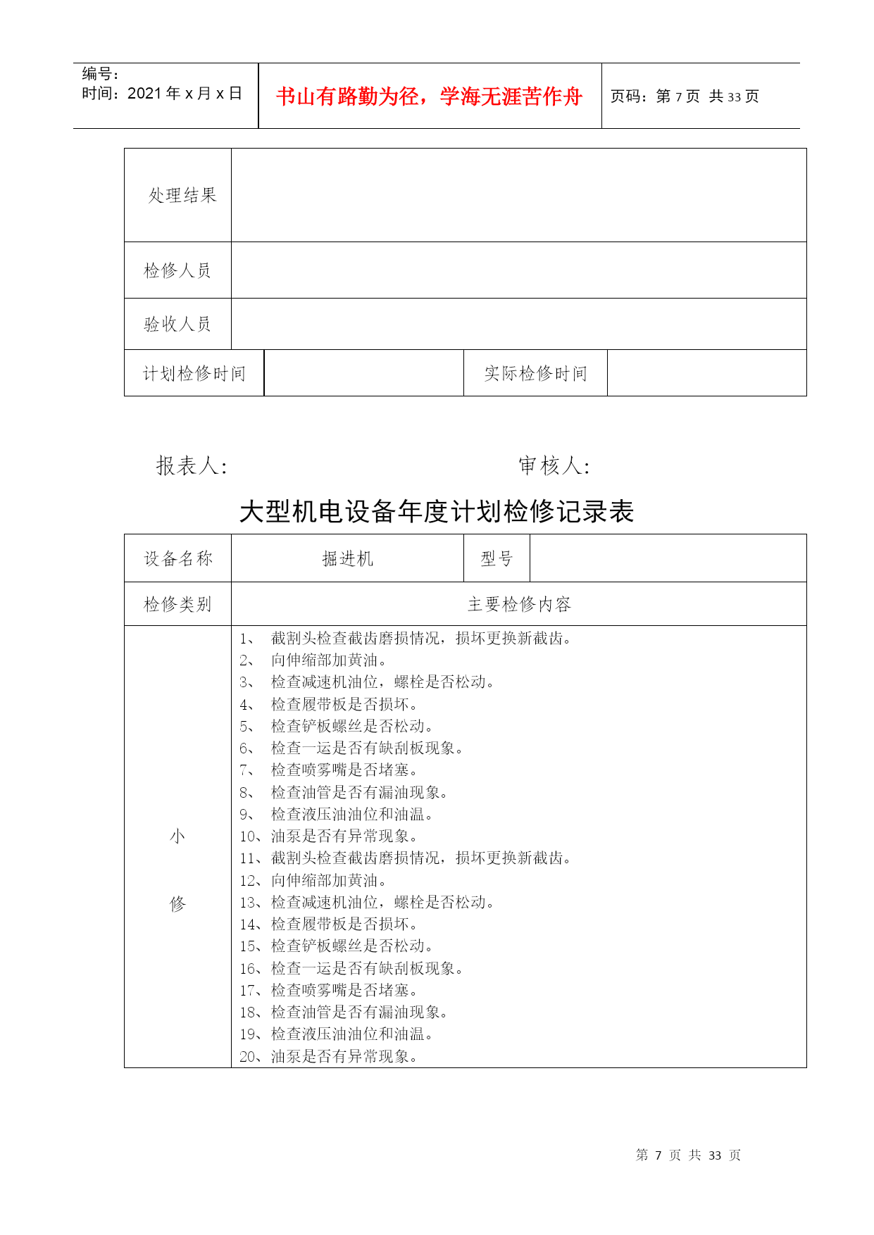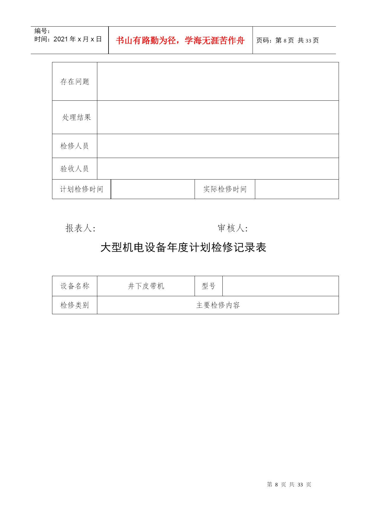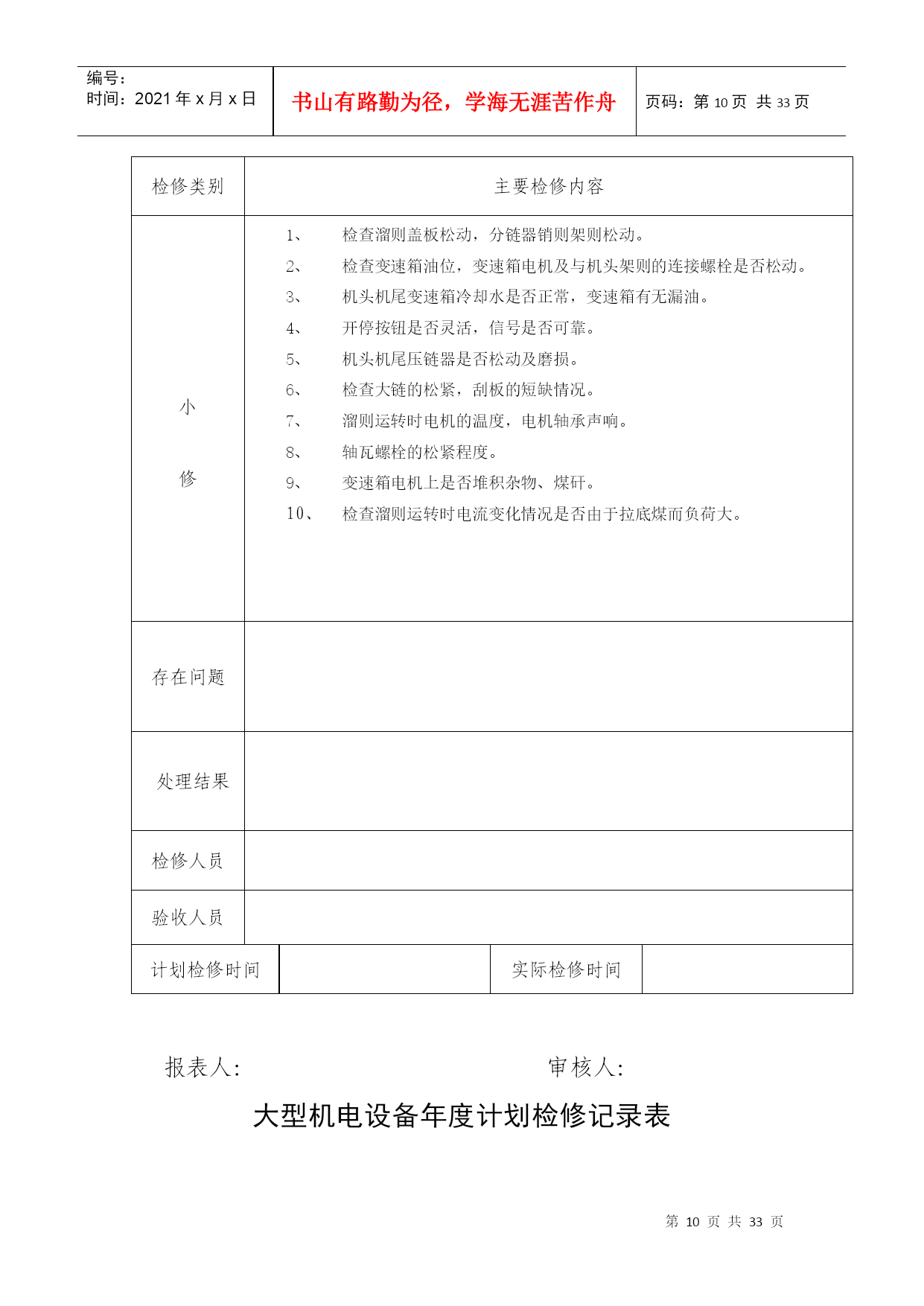 编号:时间:2021年x月x日书山有路勤为径,学海无涯苦作舟页码:第PAGE33页共NUMPAGES33页第PAGE\*MERGEFORMAT33页共NUMPAGES\*MERGEFORMAT33页大型机电设备年度计划检修记录表设备名称主扇风机型号FBCDZNo.16-2X132KW检修类别主要检修内容小修紧固件是否齐全轴承温度、风机绕组温度、负压值、电压值、电流值、振幅等数据各润滑部位润滑油量是否合适,有无漏油现象各风门是否严密风机蝶阀是否灵活可靠通风机有无强烈振动,声音是否正常检查防爆井盖是否严密,发现漏风时及时处理。观察水柱表、电流表、电压表、功率表、等仪表是否指示正常存在问题通风机有强烈振动,声音是异常处理结果紧固通风机外壳螺栓,加强润滑检修人员李玉超张苗林赵鹏鹏王国栋验收人员杨旭彪李玉超计划检修时间2012年10月29日-30日实际检修时间2012年10月29日-30日报表人:陈文凯审核人:大型机电设备年度计划检修记录表设备名称空压机型号检修类别主要检修内容小修检查压缩机出口压力、主机喷油压力是否符合要求检查油分离器压差、空气过滤器压差是否符合要求检查1#主机出口温度、2#主机出口温度、风包温度是否符合要求对空压机的整体卫生进行清扫。检查储气罐的安全阀,发现损坏时及时更换。检查空压机电流、电压仪表指示是否准确。检查空压机的油气分离器油位是否符合要求检查空压机在加载过程中是否排放冷凝水存在问题处理结果检修人员验收人员计划检修时间实际检修时间报表人:审核人:大型机电设备年度计划检修记录表设备名称主皮带型号DTL80/402X75KW检修类别主要检修内容小修检查主皮带控制室微机显示屏上的电压值、电流值、及各滚筒轴承温度、电机轴承的温度是否正常,是否有异常变化。检查减速器、制动器油位是否正常,是否漏油,油少时及时补加,漏油时及时处理对主皮带机控制室、减速器的卫生进行清扫检查胶带是否有破损,发现破损处要向负责人汇报并及时进行标记,以便周检时进行胶带的硫化检查主皮带机的装载处、卸载处及皮带架是否有大矸块、大物件刮卡检查主皮带机的皮带机地脚螺栓、各连接部位螺栓及其他紧固件是否有松动现象检查主皮带机的各类防护罩、防护栅栏是否有失效、损坏现象对皮带机的各类保护进行检查对皮带机直辊及三节托辊进行检查存在问题主皮带机的皮带机地脚螺栓、各连接部位螺栓及其他紧固件是有松动现象处理结果紧固检修人员崔慧东郭和平樊艳伟崔丁丁验收人员刘旭建刘国仙计划检修时间2012年10月25日-26日实际检修时间2012年10月25日-26日报表人:陈文凯审核人:大型机电设备年度计划检修记录表设备名称提升绞车型号JX2x1.5检修类别主要检修内容小修各紧固螺栓不得松动,联接件应齐全牢固减速器的温度,声音有无异常,油位是否适当,有无漏油联轴器间隙应符合规定,防护罩应可靠液压站油液量适当,不漏油,液压管路完好可靠检查离合器油缸的盘式制动器是否漏油检查信号系统是否正常,声光和警铃都必须灵敏可靠检查钢丝绳的排列情况及衬板,绳槽的磨损情况操作台上按钮是否灵活可靠,电流表、电压表、油压表、速度表等各仪表的指示是否正常深度指示器指针是否正常各运转部位有无异响,异震检查滚筒焊缝是否开裂,闸瓦磨损是否超过2mm,制动盘与闸瓦是否有油污检查配电柜的接触器、继电器动作是否可靠存在问题(1)紧固螺栓松动,联接件不牢固。(2)液压站漏油,液压管路有破口。处理结果(1)紧固紧固螺栓,加固连接件。(2)液压站换油,更换液压管路。检修人员刘旭建刘国仙王玲则验收人员张军宏李钢计划检修时间2012年10月27日-28日实际检修时间2012年10月27日-28日报表人:陈文凯审核人:大型机电设备年度计划检修记录表设备名称井下主水泵型号检修类别主要检修内容小修检查主水泵房是否有杂物,若有及时清理检查主水泵房各控制开关是否有煤尘,是否有失爆现象存在检查各阀门是否灵活、可靠检查水泵全部螺栓、管路及引线的连接是否紧固检查压力表、真空表指示是否正确检查各轴承部位的温度是否超限,润滑状况是否良好,声音是否正常检查盘根松紧程度检查电动机、水泵是否有异状、异响、异震泵体、电动机、环形管路及阀门防腐良好引水装置和备用引水装置可靠完好存在问题处理结果检修人员验收人员计划检修时间实际检修时间报表人:审核人:大型机电设备年度计划检修记录表设备名称采煤机型号检修类别主要检修内容小修1、采煤机外观卫生清理,有无影响机器散热、运行的杂物。2、各种信号、仪表情况,确保信号清晰,仪表指示灵敏可靠。3