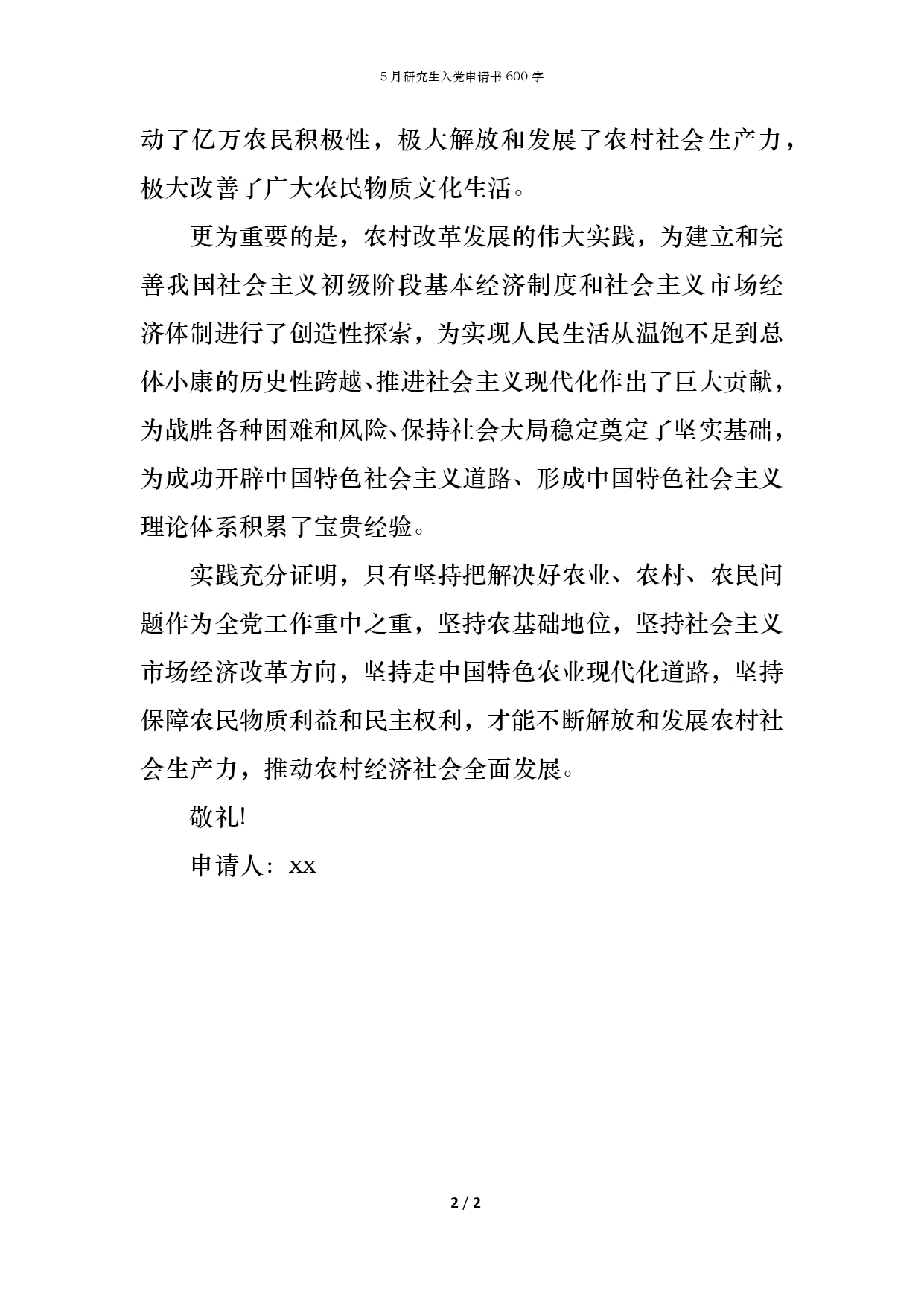 5月研究生入党申请书600字PAGE2/NUMPAGES25月研究生入党申请书600字5月研究生入党申请书600字为大家整理了《5月研究生入党申请书范文600字》供大家参考,望给大家带来帮助!亲爱的党组织:我是被组织接收为xx预备党员的,按照党章第七条规定,今天我的预备期已满一年,现申请转为xx正式党员。下面,我把入党一年来的思想、工作、学习等情况,向支部大会作一汇报。通过在业余时间学习有关理论知识,我思想上有了极大进步,通过学习,我已经认识到马克思主义的辩证唯物主义和历史唯物主义,是人类哲学思想和科学知识发展的结晶,是科学的世界观。建立在这一世界观基础上的马克思主义的全部科学理论,是肩负xx一切剥削制度、建设社会主义、实现xxxx伟大使命的无产阶级及其政认识世界和改造世界的强大思想武器,是中国xxx人推进建设有中国特色社会主义伟大事业的根本指针,是我们的精神支柱和立党立国的根本。坚持马克思列宁主义的基本原理,走中国人民自愿选择的适合中国国情的道路,中国的社会主义事业必将取得最终的胜利党全面把握国内外发展大局,尊重农民首创精神,率先在农村发起改革,并以磅礴之势推向全国,领导人民谱写了改革发展的壮丽史诗。农村改革发展的伟大实践,极大调动了亿万农民积极性,极大解放和发展了农村社会生产力,极大改善了广大农民物质文化生活。更为重要的是,农村改革发展的伟大实践,为建立和完善我国社会主义初级阶段基本经济制度和社会主义市场经济体制进行了创造性探索,为实现人民生活从温饱不足到总体小康的历史性跨越、推进社会主义现代化作出了巨大贡献,为战胜各种困难和风险、保持社会大局稳定奠定了坚实基础,为成功开辟中国特色社会主义道路、形成中国特色社会主义理论体系积累了宝贵经验。实践充分证明,只有坚持把解决好农业、农村、农民问题作为全党工作重中之重,坚持农基础地位,坚持社会主义市场经济改革方向,坚持走中国特色农业现代化道路,坚持保障农民物质利益和民主权利,才能不断解放和发展农村社会生产力,推动农村经济社会全面发展。敬礼!申请人:xx