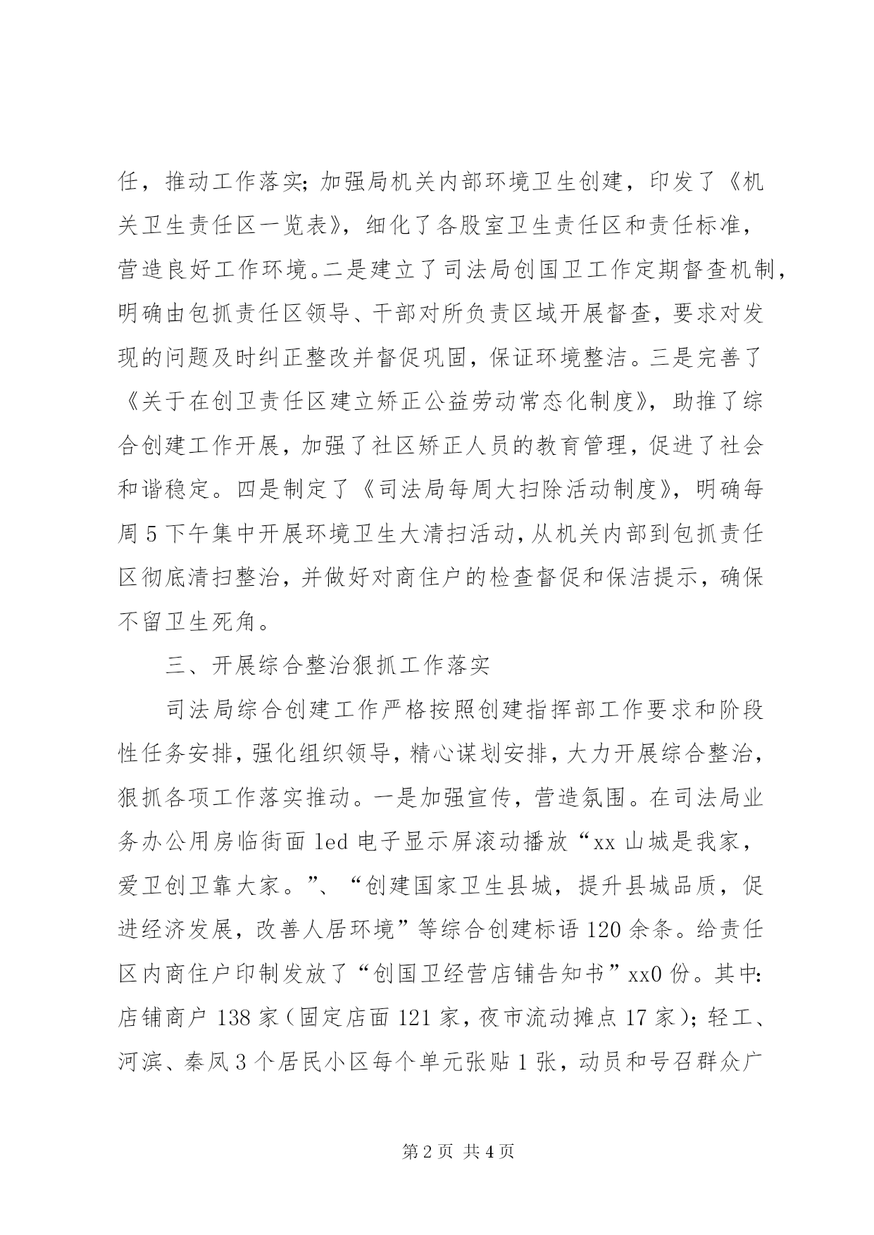 第PAGE\*Arabic\*MERGEFORMAT4页共NUMPAGES\*MERGEFORMAT4页司法局XX年综合创建工作总结今年以来,xx县司法局严格按照县委、县政府关于城市综合创建工作总体部署和创建工作指挥部具体安排,不断加强我局综合创建工作组织领导,切实强化措施,夯实工作责任,狠抓工作落实,包抓责任区面貌得到极大改善,局机关创建成效明显。现将我局2017年度综合创建工作总结如下:一、加强机构建设强化组织领导局党组高度重视综合创建工作,充分认识到坚强领导是完成各项工作的前提和保证,成立了xx县司法局综合创建工作领导小组,由局党组书记、局长任组长,局领导班子各成员任副组长,各股室负责人为组员。对爱国卫生工作领导小组、病媒生物防制领导小组、健康教育工作领导小组进行了及时的调整充实,确保工作不断档,推动不间断。将创建工作列入重点工作内容,进一步明确职责,夯实工作责任,与业务工作同安排、同检查,统一思想认识,齐心凝聚合力,确保各项工作任务落到实处,取得实效。二、健全完善制度形成长效机制建立健全各项工作制度,狠抓工作落实,用制度推动工作,用制度规范工作。一是及时调整了人员分工,将创国卫包抓责任划分3个责任段,印发了《xx县司法局创国卫责任区人员分工的通知》,各责任段分别由局领导班子成员牵头,进一步明确责任,推动工作落实;加强局机关内部环境卫生创建,印发了《机关卫生责任区一览表》,细化了各股室卫生责任区和责任标准,营造良好工作环境。二是建立了司法局创国卫工作定期督查机制,明确由包抓责任区领导、干部对所负责区域开展督查,要求对发现的问题及时纠正整改并督促巩固,保证环境整洁。三是完善了《关于在创卫责任区建立矫正公益劳动常态化制度》,助推了综合创建工作开展,加强了社区矫正人员的教育管理,促进了社会和谐稳定。四是制定了《司法局每周大扫除活动制度》,明确每周5下午集中开展环境卫生大清扫活动,从机关内部到包抓责任区彻底清扫整治,并做好对商住户的检查督促和保洁提示,确保不留卫生死角。三、开展综合整治狠抓工作落实司法局综合创建工作严格按照创建指挥部工作要求和阶段性任务安排,强化组织领导,精心谋划安排,大力开展综合整治,狠抓各项工作落实推动。一是加强宣传,营造氛围。在司法局业务办公用房临街面led电子显示屏滚动播放“xx山城是我家,爱卫创卫靠大家。”、“创建国家卫生县城,提升县城品质,促进经济发展,改善人居环境”等综合创建标语120余条。给责任区内商住户印制发放了“创国卫经营店铺告知书”xx0份。其中:店铺商户138家(固定店面121家,夜市流动摊点17家);轻工、河滨、秦凤3个居民小区每个单元张贴1张,动员和号召群众广泛参与。三是给责任区商户制作发放了环境卫生门前“四包”责任书,明确责任范围和“四包”内容,加强检查督促,监督规范经营,促进环境整洁。二是扎实整治,确保效果。坚持领导带头,分工负责,定期对责任区卫生进行清扫整治,全年累计开展机关内部和责任区卫生清扫、占道经营纠正等集中整治活动42次,出动干部600余人(次),组织社区矫正对象在责任区开展公益劳动6次。全年综合整治活动共清理垃圾30余堆,清除粘贴类野广告310幅,涂刷覆盖墙体野广告520条,剪除废旧电线、铁丝100余米,提醒和纠正占道经营行为商户30余次。四、围绕中心创建强化内部建设紧紧围绕全县综合创建工作大局,结合工作实际,不断加强机关内部建设和干部队伍建设,局机关干部综合创建意识进一步增强,健康观念明显提高,机关工作环境进一步优化,干警队伍形象进一步提升,全县司法行政系统良好社会影响不断增强。一是坚持培训教育。将健康教育和业务培训相结合,利用不同时间节点开展培训教育,通过开办健康大讲堂和健康知识讲座等形式,邀请专业人士向干部宣传控烟禁烟、生活健康常识、常见疾病的预防等知识,增强干部健康意识。二是机关绿化亮化。在局机关院场、楼梯间、过道、阳台等机关公共场所摆放各类绿植、花卉62盆,营造健康清新的工作环境;局机关主楼和附楼楼顶分别架设“中国司法”和“依法治县科学发展”发光标识大字,布置led灯带300余米,为全县绿化亮化工程增光添彩,彰显司法行政新形象。三是规范标识标牌。紧密结合综合创建,不断加强和规范机关内部管理,制作无烟标牌,发至局各股室、会议室;在机关廉政灶制作上墙“倡导节约,反对浪费”、“节约是美德”、“文明用餐、绿色消费”等宣传牌,倡导勤俭节约、健康饮食理念;在机关公共卫生间制作张贴“节约用水文明卫生”、“来的匆匆去得冲冲”等文明建设提示语,营造洁净环境。
