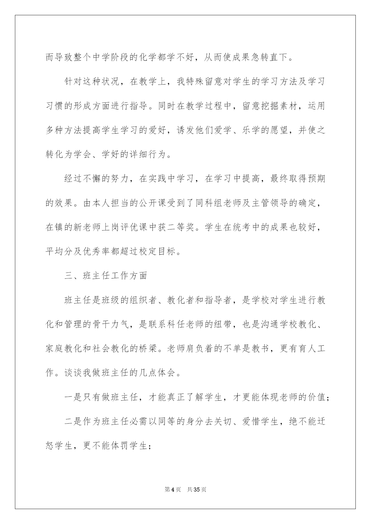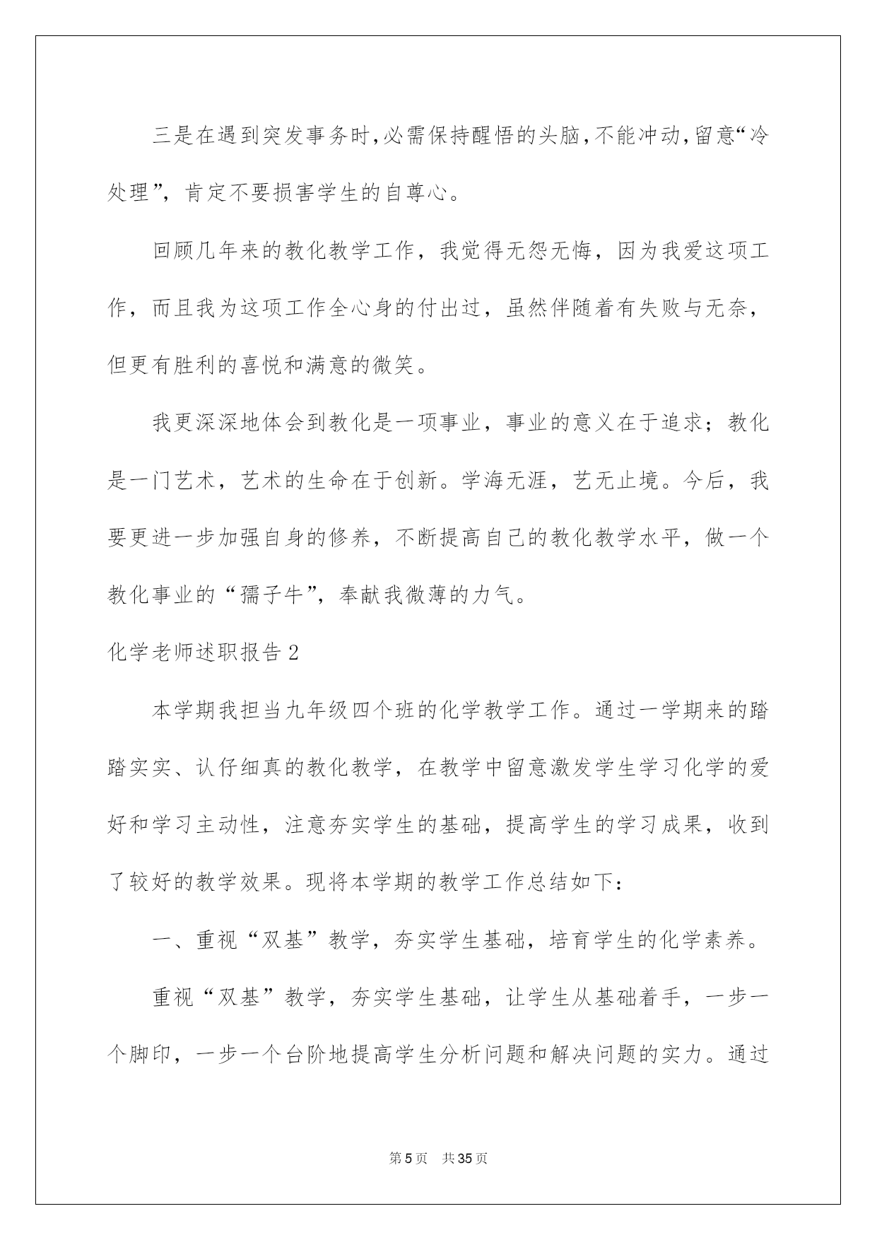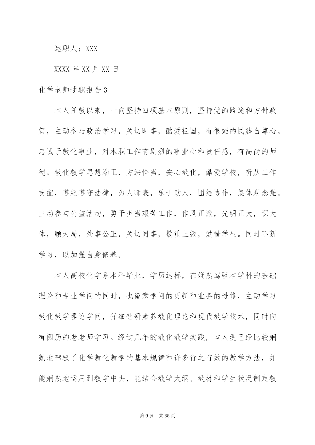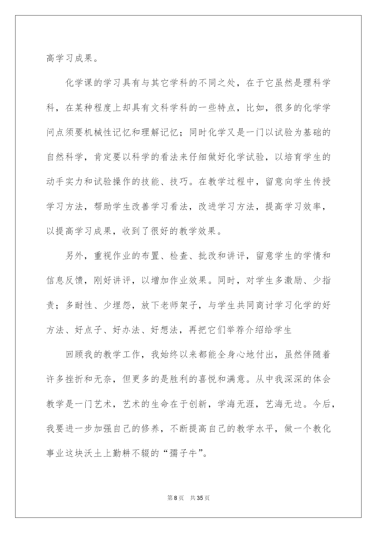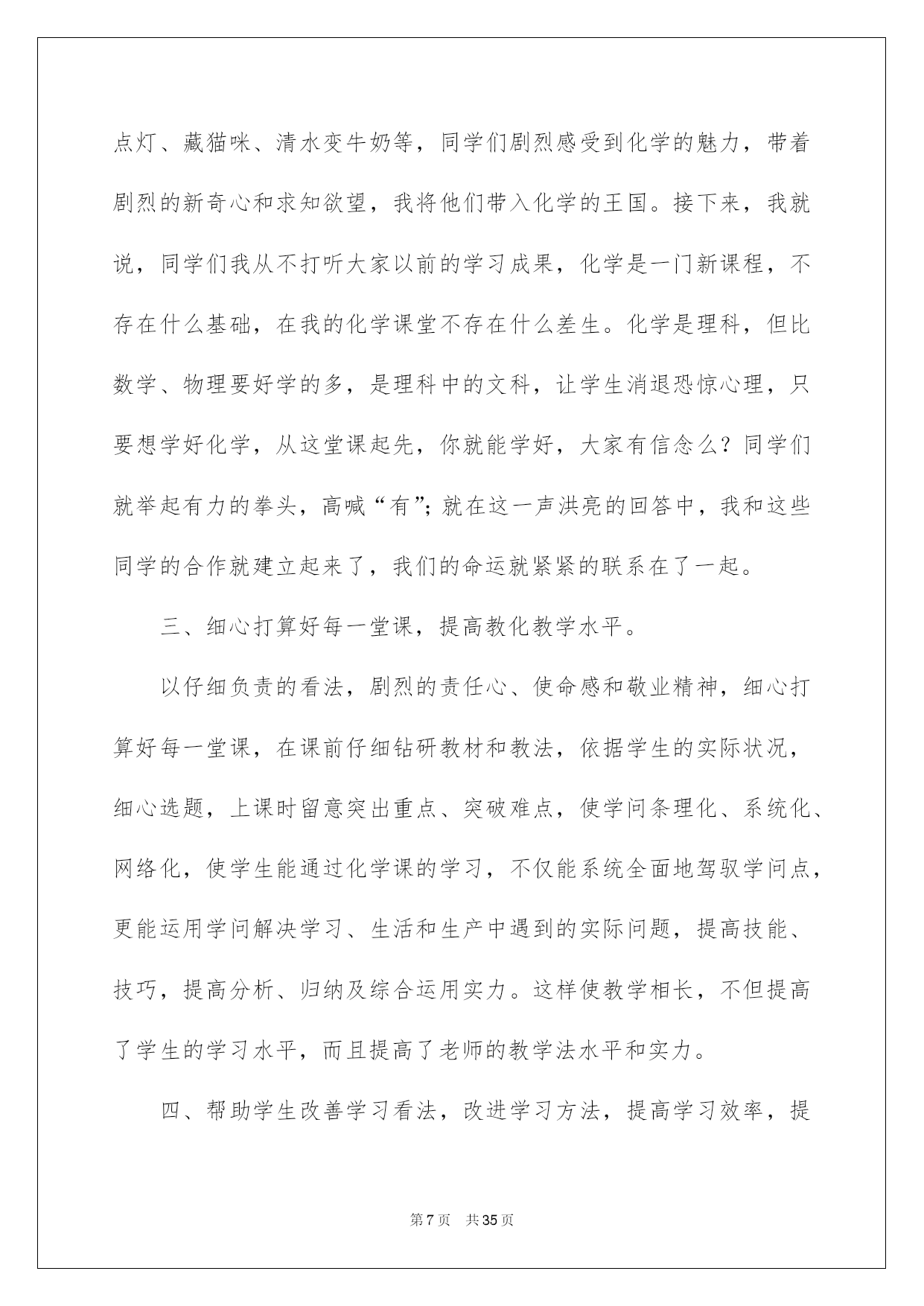 第PAGE\*Arabic\*MERGEFORMAT35页共NUMPAGES\*Arabic\*MERGEFORMAT35页第PAGE\*MERGEFORMAT35页共NUMPAGES\*MERGEFORMAT35页第PAGE\*MERGEFORMAT35页共NUMPAGES\*MERGEFORMAT35页第PAGE\*MERGEFORMAT35页共NUMPAGES\*MERGEFORMAT35页第PAGE\*MERGEFORMAT35页共NUMPAGES\*MERGEFORMAT35页第PAGE\*MERGEFORMAT35页共NUMPAGES\*MERGEFORMAT35页第PAGE\*MERGEFORMAT35页共NUMPAGES\*MERGEFORMAT35页第PAGE\*MERGEFORMAT35页共NUMPAGES\*MERGEFORMAT35页第PAGE\*MERGEFORMAT35页共NUMPAGES\*MERGEFORMAT35页第PAGE\*MERGEFORMAT35页共NUMPAGES\*MERGEFORMAT35页第PAGE\*MERGEFORMAT35页共NUMPAGES\*MERGEFORMAT35页2022化学教师述职报告化学老师述职报告我们眼下的社会,越来越多人会去运用报告,报告具有成文事后性的特点。信任很多人会觉得报告很难写吧,下面是我细心整理的化学老师述职报告,希望对大家有所帮助。化学老师述职报告1本人于XX年六月毕业于XX教化学院化学系。同年七月到XX市XX镇高级中学担当化学老师。一XX年被评定为中学化学二级老师,至今已满四年。20xx年七月调入南海一中工作。在参与工作的几年中,我始终都能听从学校的工作支配,爱岗敬业,尽心尽责,仔细完成学校交给的任务。下面本人对从教几年来的工作状况向各位领导汇报。一、思想政治方面作为一名青年老师和共产党员,参与工作以来,我到处严格要求自己,留意政治理论学习,主动参与党支部生活,坚持学习邓同志关于建设有中国特色的社会主义理论,注意理论联系实际,加强自身的思想理论修养。坚持以江提出的“三个代表”作为自己的行为准则;坚持党的教化方针,忠诚党的教化事业,在工作上乐业敬业,有剧烈的事业心和责任感,满腔热忱地投身到工作中,并到处体现共产党员的先锋模范作用。与学校领导、同事间保持融洽协作的关系,使自己的教学工作在大家的支持和帮助下得以顺当进行。在工作中我坚持做到为人师表,关切学生,帮助学生养成精益求精、肃穆仔细、一丝不苟的良好习惯,做到管教管导,言传身教,教书育人,得到学校领导、同事和学生的确定和好评。二、教学、教研方面老师总是通过所任教的学科进行教学和教化活动,引导学生相识世界,发展智力,培育高尚品德和情操的。所以我认为,衡量一个老师优秀与否的最重要因素教学水平的凹凸,而要有较高的教学水平,就必需有扎实的专业学问、教学基本功和教学的艺术。为此我把初中到中学的化学课本进行深化细致的阅读、探讨,并把高校学问与中学学问相联系,力求追根溯源,融会贯穿;在教学基本功方面,我特殊留意在语言表达实力、组织管理实力、书写实力,总结实力方面下功夫。XX年是本人参与工作的第一年,担当高一级化学教学。俗话说“好的起先是胜利的一半”,我决心要为自己的教学工作开创一个良好的开端。于是我主动从几方面做好:(1)仔细备好每节课。“磨刀不误砍柴功”。课上得好与坏,备课是关键。每备一节课,本人都花费较多的时间去分析教材、钻研大纲、学习教参、钻研教法。并多从学生“学”的角度去考虑怎样上好一节课,做到既备教材、又备学生;既备教法又备学法,为上课作好充分打算;(2)多听同科组或其他科组老师的优质课,学习别人丰富的教学阅历。每学期都先后在本校或其他兄弟学校听课三十多节,学到了许多学生时代学不到的珍贵的实际操作阅历,使自己的教学快速走向成熟;(3)主动试行各种教学方法,以提高学生学习化学的爱好,进而提高教学质量。高一是个转折点,化学科的内容一下子比初中加大加深了很多,许多即使在初中成果较好的同学,都因为在高一学不好,而导致整个中学阶段的化学都学不好,从而使成果急转直下。针对这种状况,在教学上,我特殊留意对学生的学习方法及学习习惯的形成方面进行指导。同时在教学过程中,留意挖掘素材,运用多种方法提高学生学习的爱好,诱发他们爱学、乐学的愿望,并使之转化为学会、学好的详细行为。经过不懈的努力,在实践中学习,在学习中提高,最终取得预期的效果。由本人担当的公开课受到了同科组老师及主管领导的确定,在镇的新老师上岗评优课中获二等奖。学生在统考中的成果也较好,平均分及优秀率