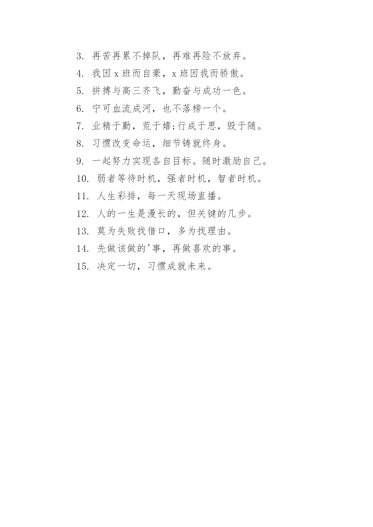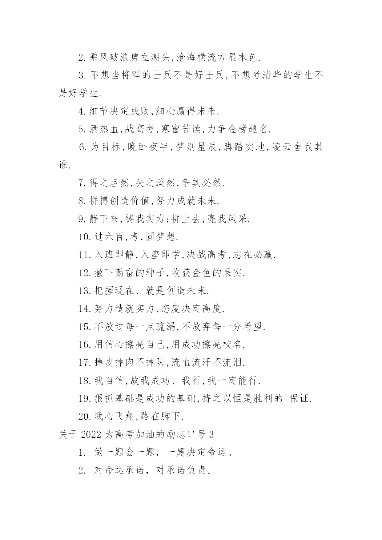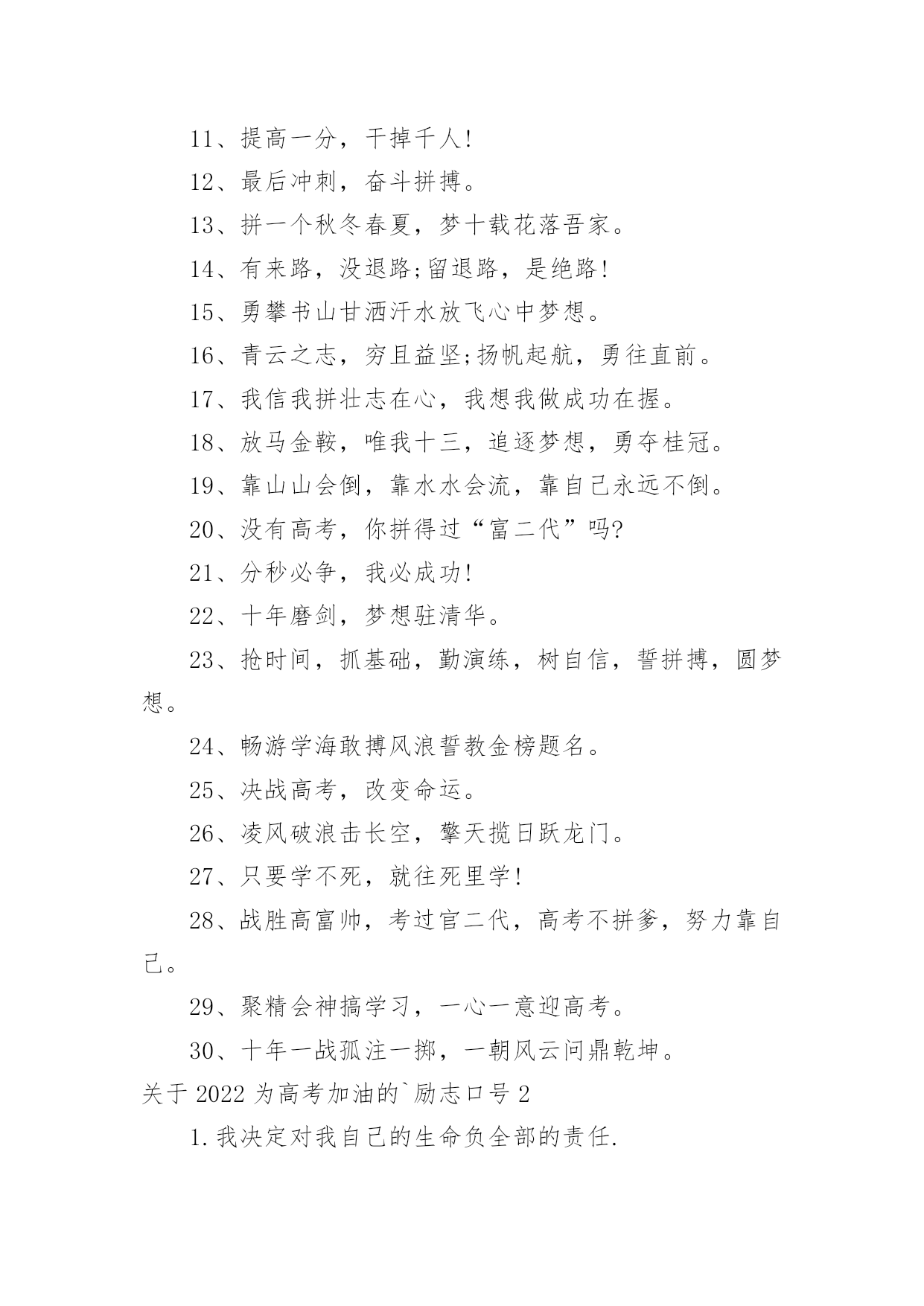 为高考加油的励志口号关于2022为高考加油的励志口号在学习、工作或生活中,许多人对一些广为流传的口号都不陌生吧,口号一般都用一两句完整的句子来表现一个信息或一个观念,信息单一,容易理解,没有过多的信息需要受众用心记忆和用心理解。还在苦苦寻找优秀经典的口号吗?下面是小编帮大家整理的关于2022为高考加油的励志口号,欢迎阅读与收藏。关于2022为高考加油的励志口号11、不拼不博一生白活,不苦不累高三无味!2、物我两忘,天道酬勤。3、不赢高考非英雄,挥泪洒血誓成功。4、韶华如水,逝匆匆,奋力一搏方始休;青灯黄卷,志踌踌,一纸功名造极峰。5、用今朝心如止水,换明日骇浪惊涛。6、不负天赐的智慧,不负父母的期盼,不负恩师的厚望。7、生时何必久睡,死后自会长眠。8、拼一年春夏秋冬,博一生无怨无悔。9、考过高富帅,战胜官二代!10、磨枪砺剑,不惧兵临城下;脚踏实地,凌云舍我其谁!11、提高一分,干掉千人!12、最后冲刺,奋斗拼搏。13、拼一个秋冬春夏,梦十载花落吾家。14、有来路,没退路;留退路,是绝路!15、勇攀书山甘洒汗水放飞心中梦想。16、青云之志,穷且益坚;扬帆起航,勇往直前。17、我信我拼壮志在心,我想我做成功在握。18、放马金鞍,唯我十三,追逐梦想,勇夺桂冠。19、靠山山会倒,靠水水会流,靠自己永远不倒。20、没有高考,你拼得过“富二代”吗?21、分秒必争,我必成功!22、十年磨剑,梦想驻清华。23、抢时间,抓基础,勤演练,树自信,誓拼搏,圆梦想。24、畅游学海敢搏风浪誓教金榜题名。25、决战高考,改变命运。26、凌风破浪击长空,擎天揽日跃龙门。27、只要学不死,就往死里学!28、战胜高富帅,考过官二代,高考不拼爹,努力靠自己。29、聚精会神搞学习,一心一意迎高考。30、十年一战孤注一掷,一朝风云问鼎乾坤。关于2022为高考加油的`励志口号21.我决定对我自己的生命负全部的责任.2.乘风破浪勇立潮头,沧海横流方显本色.3.不想当将军的士兵不是好士兵,不想考清华的学生不是好学生.4.细节决定成败,细心赢得未来.5.洒热血,战高考,寒窗苦读,力争金榜题名.6.为目标,晚卧夜半,梦别星辰,脚踏实地,凌云舍我其谁.7.得之坦然,失之淡然,争其必然.8.拼搏创造价值,努力成就未来.9.静下来,铸我实力;拼上去,亮我风采.10.过六百,考,圆梦想.11.入班即静,入座即学,决战高考,志在必赢.12.撒下勤奋的种子,收获金色的果实.13.把握现在、就是创造未来.14.努力造就实力,态度决定高度.15.不放过每一点疏漏,不放弃每一分希望.16.用信心擦亮自己,用成功擦亮校名.17.掉皮掉肉不掉队,流血流汗不流泪.18.我自信,故我成功、我行,我一定能行.19.狠抓基础是成功的基础,持之以恒是胜利的`保证.20.我心飞翔,路在脚下.关于2022为高考加油的励志口号31.做一题会一题,一题决定命运。2.对命运承诺,对承诺负责。3.再苦再累不掉队,再难再险不放弃。4.我因x班而自豪,x班因我而骄傲。5.拼搏与高三齐飞,勤奋与成功一色。6.宁可血流成河,也不落榜一个。7.业精于勤,荒于嬉;行成于思,毁于随。8.习惯改变命运,细节铸就终身。9.一起努力实现各自目标。随时激励自己。10.弱者等待时机,强者时机,智者时机。11.人生彩排,每一天现场直播。12.人的一生是漫长的,但关键的几步。13.莫为失败找借口,多为找理由。14.先做该做的'事,再做喜欢的事。15.决定一切,习惯成就未来。