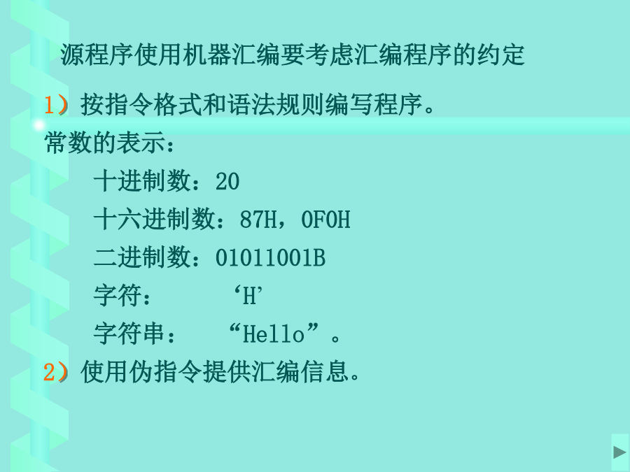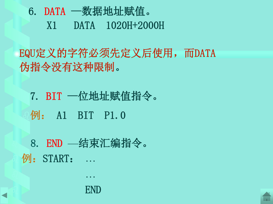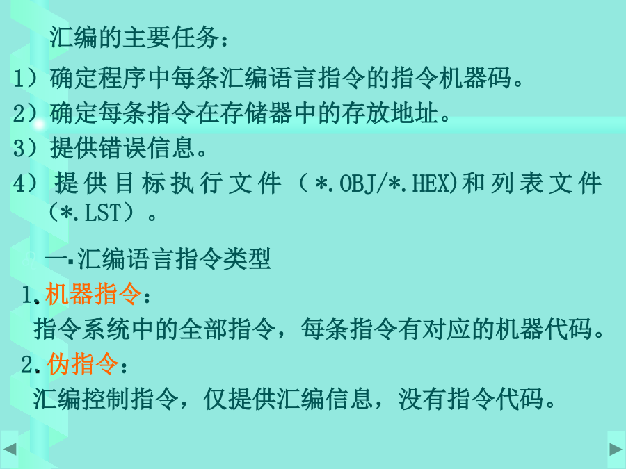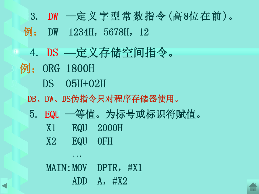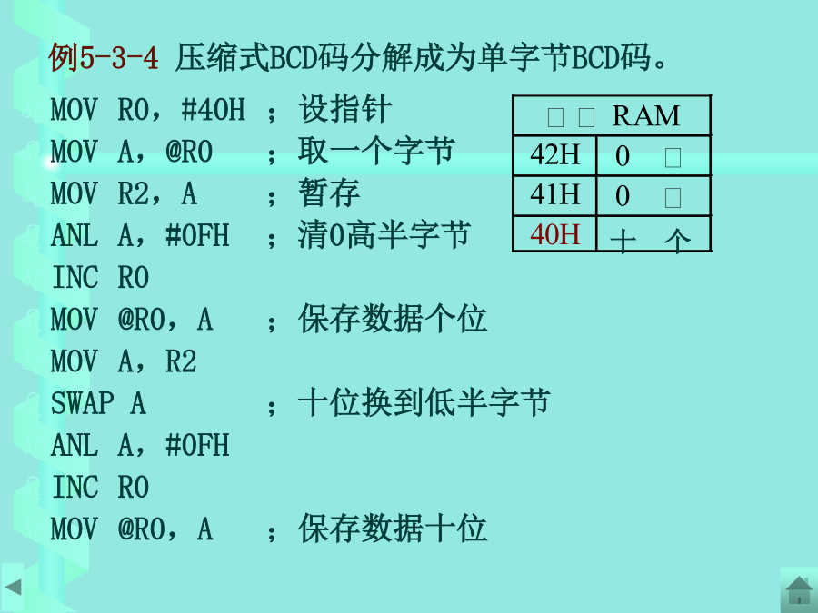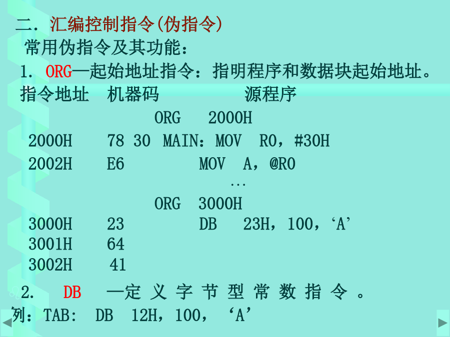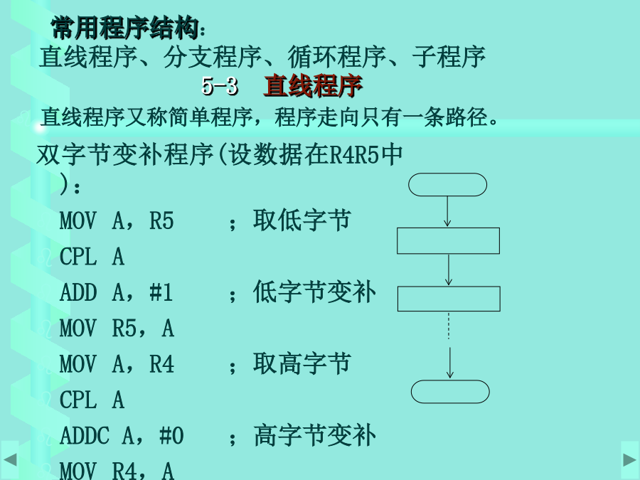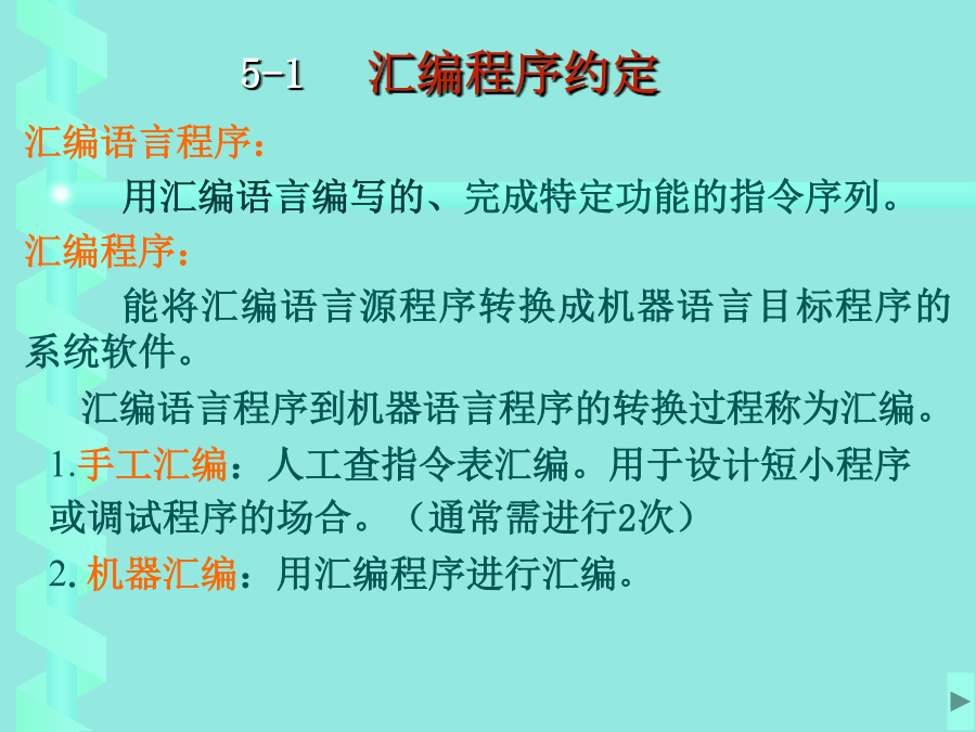 第五章汇编语言程序设计5-1汇编程序约定源程序使用机器汇编要考虑汇编程序的约定汇编的主要任务:二.汇编控制指令(伪指令)常用伪指令及其功能:5.EQU—等值。为标号或标识符赋值。X1EQU2000HX2EQU0FH…MAIN:MOVDPTR,#X1ADDA,#X26.DATA—数据地址赋值。X1DATA1020H+2000HEQU定义的字符必须先定义后使用,而DATA伪指令没有这种限制。5-2汇编语言程序设计步骤常用程序结构:直线程序、分支程序、循环程序、子程序例5-3-4压缩式BCD码分解成为单字节BCD码。5-4分支程序由条件转移指令构成程序判断框部分,形成程序分支结构。行李计价:当G≤5,M=G×3;当G>5,M=G×3+(G-5)×(5-3)5-4-3多重分支程序一.多次使用条件转移指令,形成两个以上判断框。二.按分支号转移(2)转移表法。用分支转移指令JMP@A+DPTR。设R7R6=分支号5-5循环程序包含多次重复执行的程序段,循环结构使程序紧凑。5-5-2单重循环简单循环结构:循环体中不套循环。循环控制方法:计数控制、特征标志控制。二.特征控制:设定循环结束标志实现循环控制。5-5-3多重循环循环体中套循环结构。以双重循环使用较多。软件延时程序。用循环程序将指令重复多次执行,实现软件延时。5-6子程序子程序:能完成某项特定功能的独立程序段,可被反复调用。5-6-2子程序的类型按子程序与主程序之间传递参数的方式分类。例:将R4R5R6中三个字节数据对半分解,变成6个字节,存入显示缓冲区(DISMEM0~DISMEM5)。例比较两个数据串是否完全相等,若完全相等,A=0;否则A=FFH。例:查表求出数据的ASCII码,再以字符形式输出。5-7算术运算程序5-7-1多字节加减运算程序5-7-2多字节无符号数乘除运算相减计算多字节除法程序,步骤:1.对齐高位被除数试减除数。2.若够减商上1,不够减商上0且恢复余数。3.余数左移或除数右移对位。4.循环重复前3步,直至取够相应位数的商。5-7-3代码转换程序(一)十六进制数转换为ASCII码(三)BCD码与二进制数之间的转换有乘法和除法两种转换方式。2.二进制数转换为BCD码B=bn-1×2n-1+bn-2×2n-2+…+b1×21+b0×20=(((bn-1×2+bn-2)×2+bn-3)×2+…b1)+b0