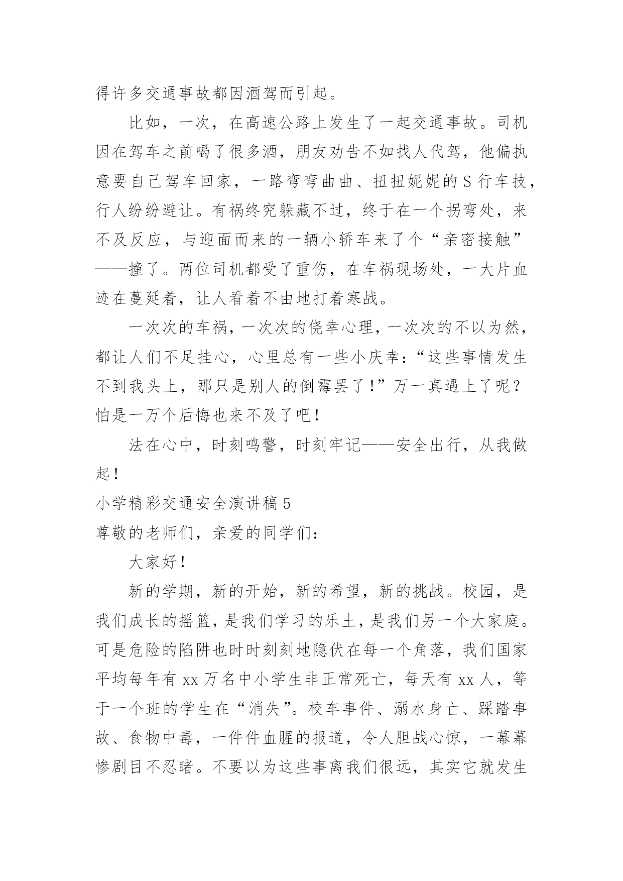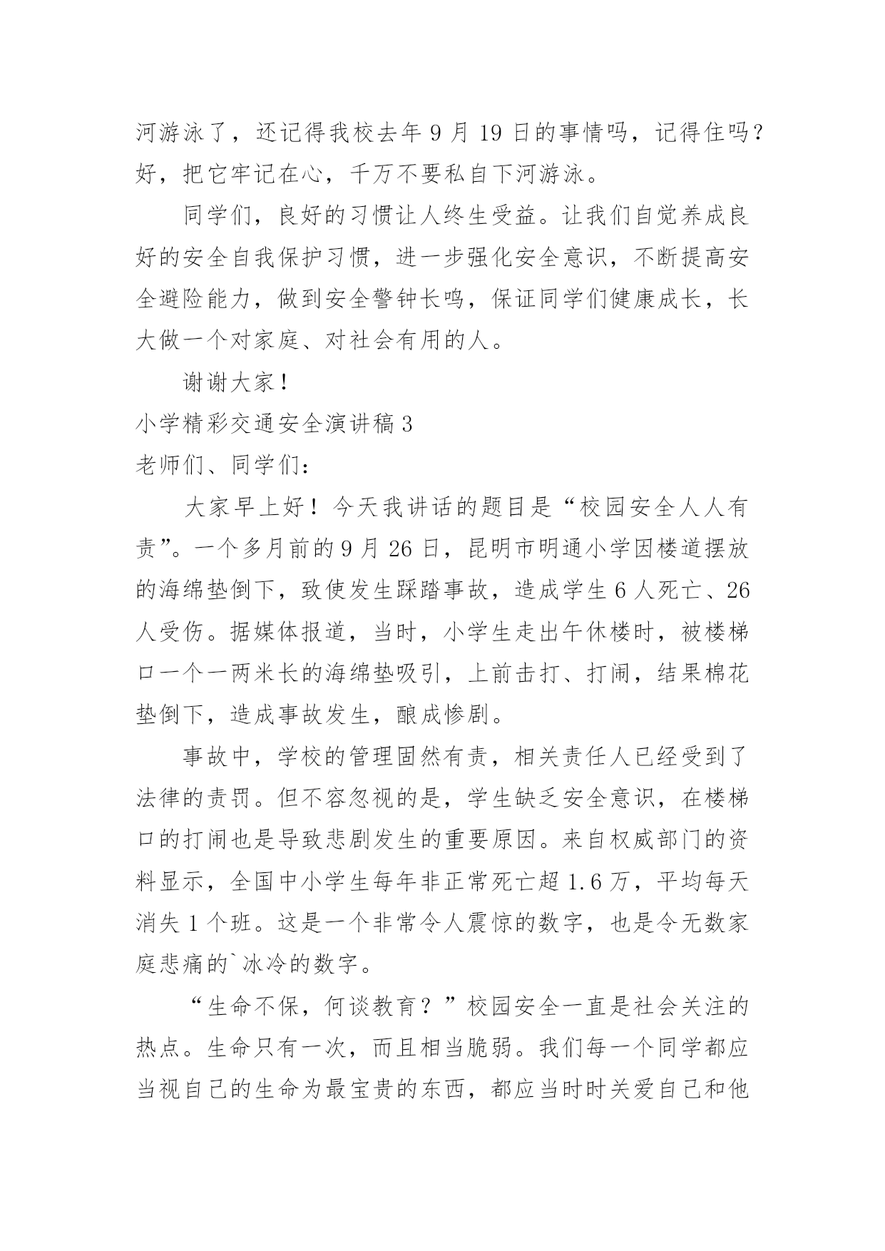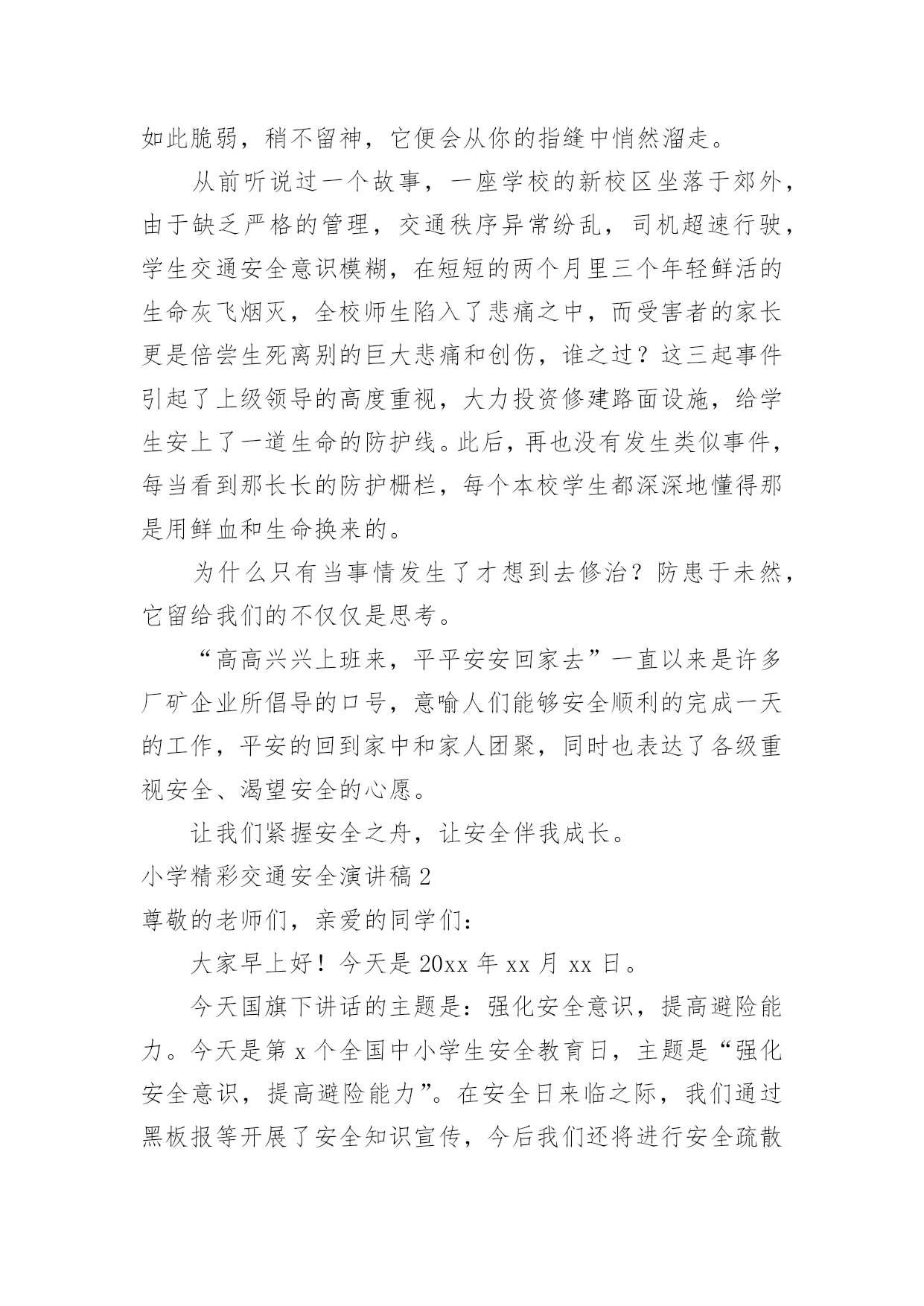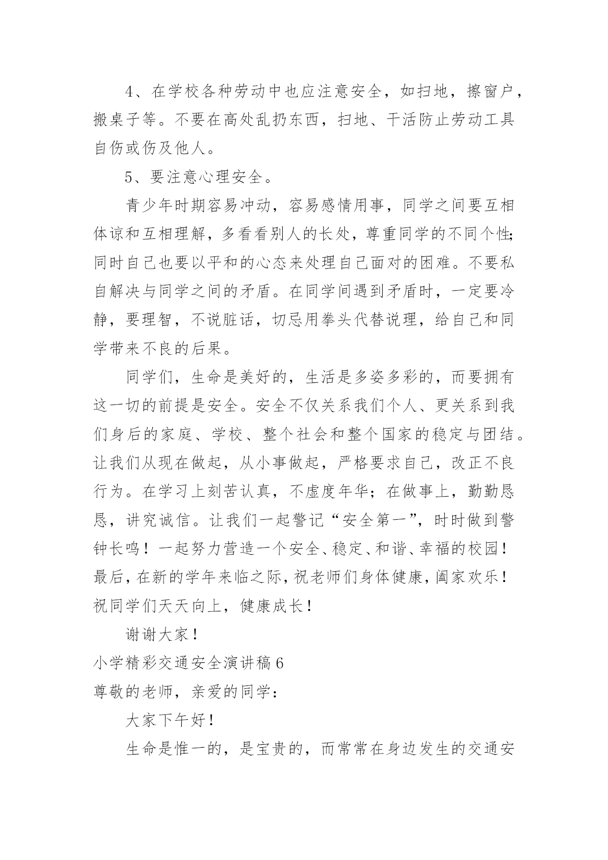 小学精彩交通安全演讲稿小学精彩交通安全演讲稿演讲稿具有逻辑严密,态度明确,观点鲜明的特点。在现在的社会生活中,演讲稿在我们的视野里出现的频率越来越高,在写之前,可以先参考范文,以下是小编帮大家整理的小学精彩交通安全演讲稿,仅供参考,欢迎大家阅读。小学精彩交通安全演讲稿1尊敬的老师们,亲爱的同学们:大家好!大概是我这种迟钝的人也早已意识到了“平安创建”的开始,没有刻意地去想关注,“平安建设”便以渗入生活的一点一滴。对所谓这样的名词总是懵懵懂懂,打着官腔的生硬概念亦总归糊里糊涂。大抵也就囫囵地搪塞过去了,却不想这次动了真格,若是让我仔细的'一点儿一点儿细数变化,我倒是讲不大完的,好像也没有再慌慌张张惊恐无措地走夜路,好像一人出行不必惊惶诚恐地害怕哪儿窜出个乱贼来,总归是感觉日子过得宁静安稳了许多。这大抵是最明显的一点了。生命,再熟悉不过的字眼。它如夏花般绚丽。生命之花是刚强的,它让人思索,让人感受,让人倾听,只要有毅力,它能克服任何困难;然而,它又宛如一棵弱不禁风的小草,如此脆弱,稍不留神,它便会从你的指缝中悄然溜走。从前听说过一个故事,一座学校的新校区坐落于郊外,由于缺乏严格的管理,交通秩序异常纷乱,司机超速行驶,学生交通安全意识模糊,在短短的两个月里三个年轻鲜活的生命灰飞烟灭,全校师生陷入了悲痛之中,而受害者的家长更是倍尝生死离别的巨大悲痛和创伤,谁之过?这三起事件引起了上级领导的高度重视,大力投资修建路面设施,给学生安上了一道生命的防护线。此后,再也没有发生类似事件,每当看到那长长的防护栅栏,每个本校学生都深深地懂得那是用鲜血和生命换来的。为什么只有当事情发生了才想到去修治?防患于未然,它留给我们的不仅仅是思考。“高高兴兴上班来,平平安安回家去”一直以来是许多厂矿企业所倡导的口号,意喻人们能够安全顺利的完成一天的工作,平安的回到家中和家人团聚,同时也表达了各级重视安全、渴望安全的心愿。让我们紧握安全之舟,让安全伴我成长。小学精彩交通安全演讲稿2尊敬的老师们,亲爱的同学们:大家早上好!今天是20xx年xx月xx日。今天国旗下讲话的主题是:强化安全意识,提高避险能力。今天是第x个全国中小学生安全教育日,主题是“强化安全意识,提高避险能力”。在安全日来临之际,我们通过黑板报等开展了安全知识宣传,今后我们还将进行安全疏散演练等活动,同时我们更要将安全意识和行为作为一种习惯进行养成。我们需要养成的安全好习惯有:1、遵守交通规则;2、不玩火;3、放学及时离校回家;4、遵守公共秩序;5、不急追猛跑;6、上下楼梯不拥挤,不推搡,右行礼让;7、有安全自护意识;8、不做危险动作、游戏。最近,经常发现一个比较严重的问题,低年级的同学喜欢做一个游戏,两个同学摔跤摔在地上,其他同学一伙围上去,压在他们上面,要知道这是非常危险的,很容易就把底下的同学压死,所以,同学们今后绝对不许做这种游戏。还有,我们还常发现有同学到教学楼后的`灌木丛里玩耍,把那儿当成是假山去那游玩。同学们都知道,现在已经是春天了,万物苏醒,许多冬眠的动物都会苏醒过来。你知道在那灌木丛中有什么非常危险的东西会苏醒吗?对,老蛇。在那种地方老蛇是非常多的,如果到那儿玩耍,很有可能会被蛇咬。不仅如此,那灌木丛的外侧是什么地方?是河,很深的河,如果不小心滑下去,谁也救不了你。所以,学校规定,禁止同学们到教学楼后山坡玩耍,包括垃圾堆处、灌木丛、倒弃土处等地方。今后下去,天气又将逐渐转暖,也许又有许多同学想下河游泳了,还记得我校去年9月19日的事情吗,记得住吗?好,把它牢记在心,千万不要私自下河游泳。同学们,良好的习惯让人终生受益。让我们自觉养成良好的安全自我保护习惯,进一步强化安全意识,不断提高安全避险能力,做到安全警钟长鸣,保证同学们健康成长,长大做一个对家庭、对社会有用的人。谢谢大家!小学精彩交通安全演讲稿3老师们、同学们:大家早上好!今天我讲话的题目是“校园安全人人有责”。一个多月前的9月26日,昆明市明通小学因楼道摆放的海绵垫倒下,致使发生踩踏事故,造成学生6人死亡、26人受伤。据媒体报道,当时,小学生走出午休楼时,被楼梯口一个一两米长的海绵垫吸引,上前击打、打闹,结果棉花垫倒下,造成事故发生,酿成惨剧。事故中,学校的管理固然有责,相关责任人已经受到了法律的责罚。但不容忽视的是,学生缺乏安全意识,在楼梯口的打闹也是导致悲剧发生的重要原因。来自权威部门的资料显示,全国中小学生每年非正常死亡超1.6万,平均每天消失1个班。这是一个非常令人震惊的数字,也是令无数家庭悲痛的`冰冷的数字。“生命不保,何谈教育?”校园安全一直是社会关注的热点。生命只有一次,而且相当脆弱。我们每一个同学都应当视自己的生命为最宝贵的东西,都应当时时关爱自己和他人的生命。对于安全,希望同学记住以下几点:1、我们全体同