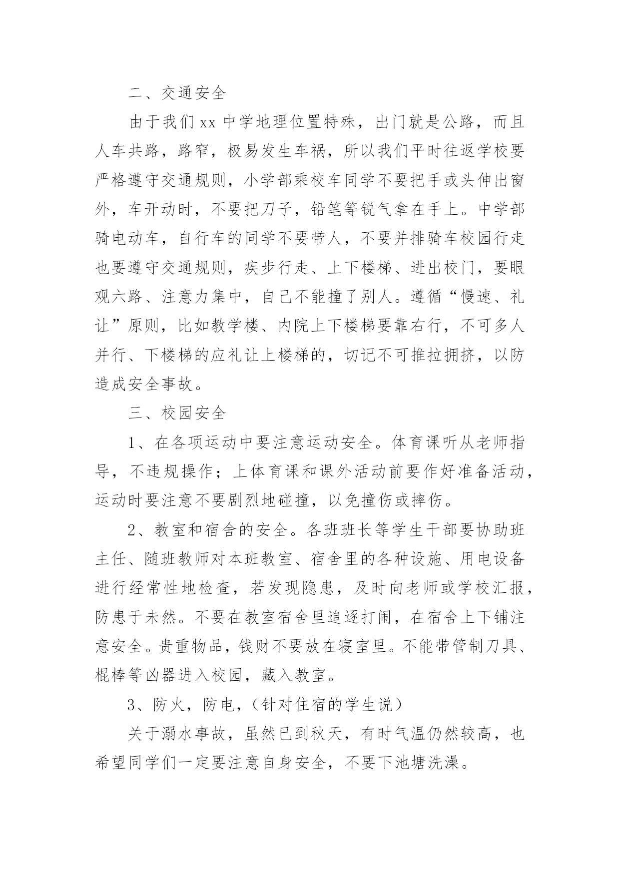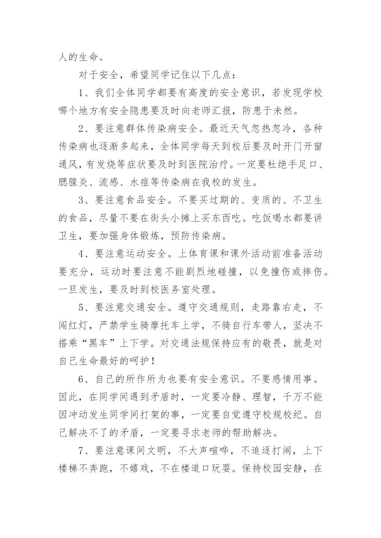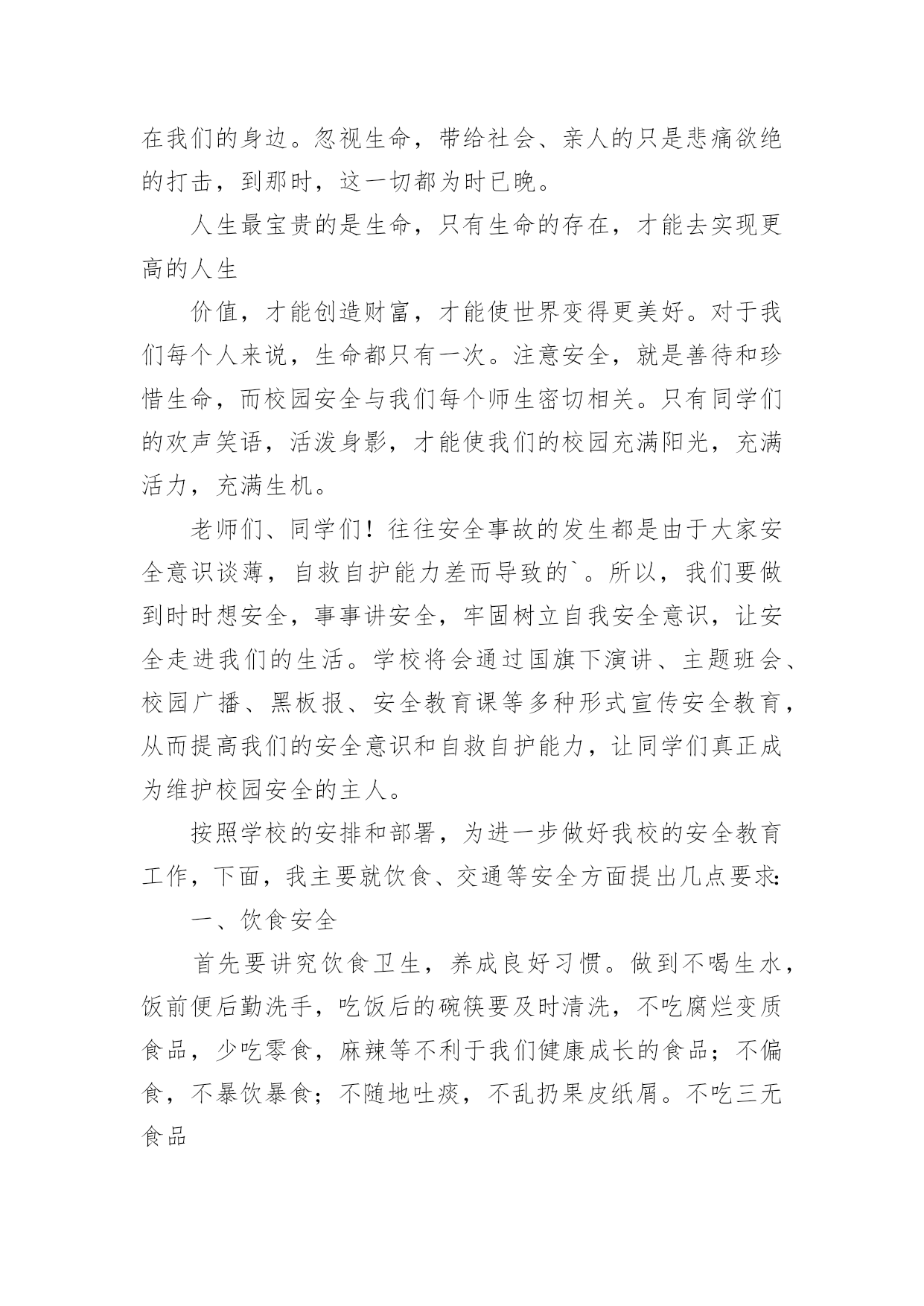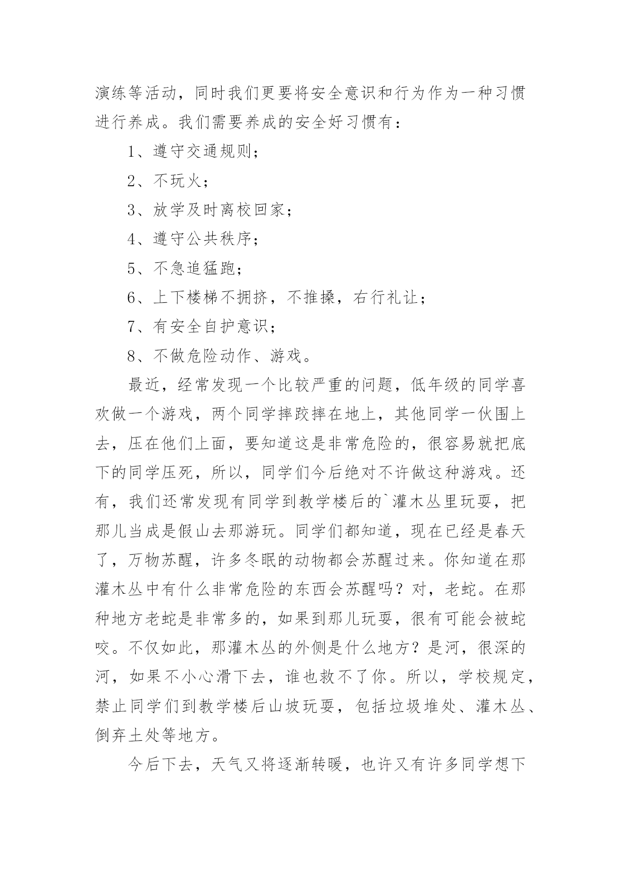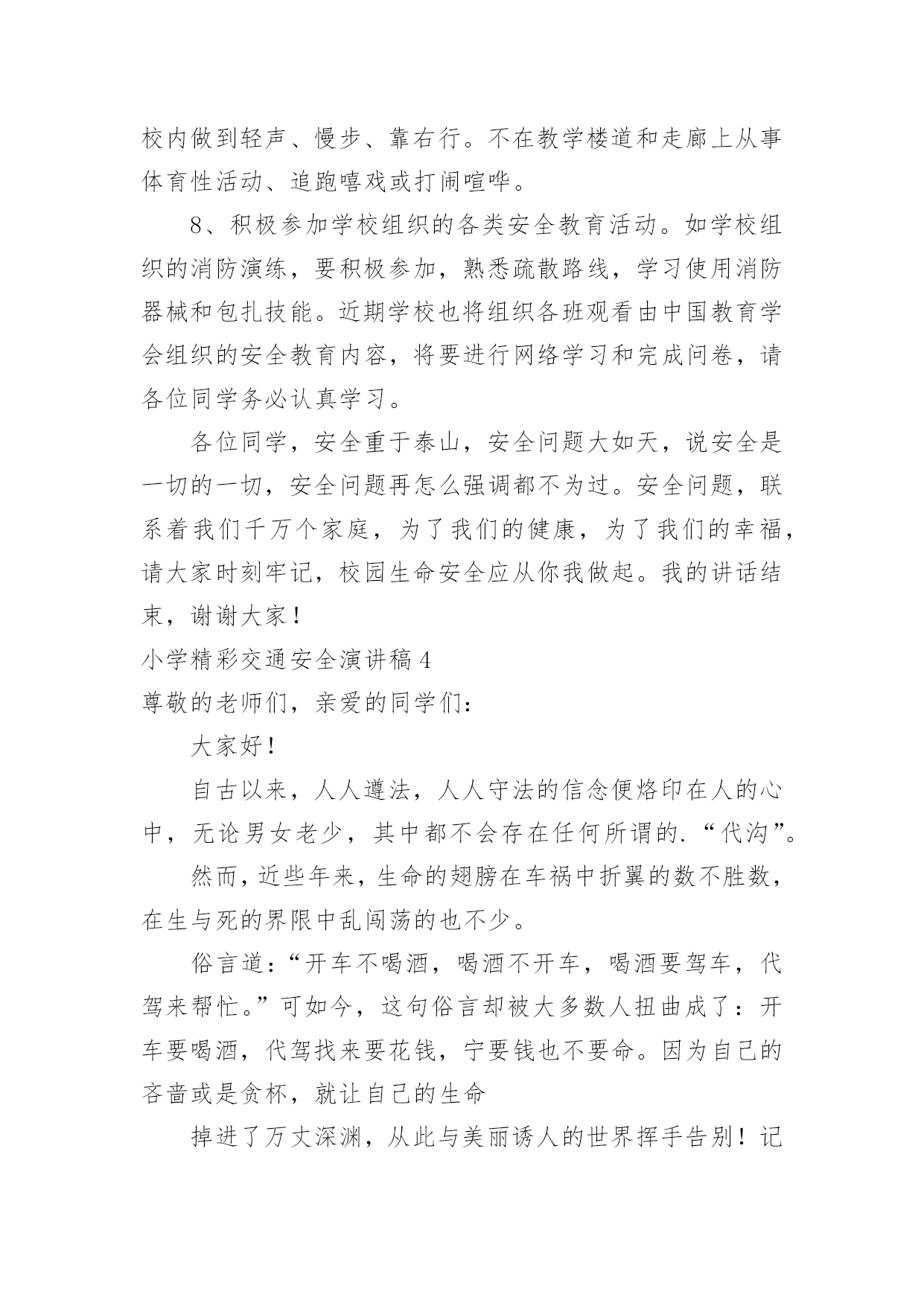 小学精彩交通安全演讲稿小学精彩交通安全演讲稿演讲稿具有逻辑严密,态度明确,观点鲜明的特点。在现在的社会生活中,演讲稿在我们的视野里出现的频率越来越高,在写之前,可以先参考范文,以下是小编帮大家整理的小学精彩交通安全演讲稿,仅供参考,欢迎大家阅读。小学精彩交通安全演讲稿1尊敬的老师们,亲爱的同学们:大家好!大概是我这种迟钝的人也早已意识到了“平安创建”的开始,没有刻意地去想关注,“平安建设”便以渗入生活的一点一滴。对所谓这样的名词总是懵懵懂懂,打着官腔的生硬概念亦总归糊里糊涂。大抵也就囫囵地搪塞过去了,却不想这次动了真格,若是让我仔细的'一点儿一点儿细数变化,我倒是讲不大完的,好像也没有再慌慌张张惊恐无措地走夜路,好像一人出行不必惊惶诚恐地害怕哪儿窜出个乱贼来,总归是感觉日子过得宁静安稳了许多。这大抵是最明显的一点了。生命,再熟悉不过的字眼。它如夏花般绚丽。生命之花是刚强的,它让人思索,让人感受,让人倾听,只要有毅力,它能克服任何困难;然而,它又宛如一棵弱不禁风的小草,如此脆弱,稍不留神,它便会从你的指缝中悄然溜走。从前听说过一个故事,一座学校的新校区坐落于郊外,由于缺乏严格的管理,交通秩序异常纷乱,司机超速行驶,学生交通安全意识模糊,在短短的两个月里三个年轻鲜活的生命灰飞烟灭,全校师生陷入了悲痛之中,而受害者的家长更是倍尝生死离别的巨大悲痛和创伤,谁之过?这三起事件引起了上级领导的高度重视,大力投资修建路面设施,给学生安上了一道生命的防护线。此后,再也没有发生类似事件,每当看到那长长的防护栅栏,每个本校学生都深深地懂得那是用鲜血和生命换来的。为什么只有当事情发生了才想到去修治?防患于未然,它留给我们的不仅仅是思考。“高高兴兴上班来,平平安安回家去”一直以来是许多厂矿企业所倡导的口号,意喻人们能够安全顺利的完成一天的工作,平安的回到家中和家人团聚,同时也表达了各级重视安全、渴望安全的心愿。让我们紧握安全之舟,让安全伴我成长。小学精彩交通安全演讲稿2尊敬的老师们,亲爱的同学们:大家早上好!今天是20xx年xx月xx日。今天国旗下讲话的主题是:强化安全意识,提高避险能力。今天是第x个全国中小学生安全教育日,主题是“强化安全意识,提高避险能力”。在安全日来临之际,我们通过黑板报等开展了安全知识宣传,今后我们还将进行安全疏散演练等活动,同时我们更要将安全意识和行为作为一种习惯进行养成。我们需要养成的安全好习惯有:1、遵守交通规则;2、不玩火;3、放学及时离校回家;4、遵守公共秩序;5、不急追猛跑;6、上下楼梯不拥挤,不推搡,右行礼让;7、有安全自护意识;8、不做危险动作、游戏。最近,经常发现一个比较严重的问题,低年级的同学喜欢做一个游戏,两个同学摔跤摔在地上,其他同学一伙围上去,压在他们上面,要知道这是非常危险的,很容易就把底下的同学压死,所以,同学们今后绝对不许做这种游戏。还有,我们还常发现有同学到教学楼后的`灌木丛里玩耍,把那儿当成是假山去那游玩。同学们都知道,现在已经是春天了,万物苏醒,许多冬眠的动物都会苏醒过来。你知道在那灌木丛中有什么非常危险的东西会苏醒吗?对,老蛇。在那种地方老蛇是非常多的,如果到那儿玩耍,很有可能会被蛇咬。不仅如此,那灌木丛的外侧是什么地方?是河,很深的河,如果不小心滑下去,谁也救不了你。所以,学校规定,禁止同学们到教学楼后山坡玩耍,包括垃圾堆处、灌木丛、倒弃土处等地方。今后下去,天气又将逐渐转暖,也许又有许多同学想下河游泳了,还记得我校去年9月19日的事情吗,记得住吗?好,把它牢记在心,千万不要私自下河游泳。同学们,良好的习惯让人终生受益。让我们自觉养成良好的安全自我保护习惯,进一步强化安全意识,不断提高安全避险能力,做到安全警钟长鸣,保证同学们健康成长,长大做一个对家庭、对社会有用的人。谢谢大家!小学精彩交通安全演讲稿3老师们、同学们:大家早上好!今天我讲话的题目是“校园安全人人有责”。一个多月前的9月26日,昆明市明通小学因楼道摆放的海绵垫倒下,致使发生踩踏事故,造成学生6人死亡、26人受伤。据媒体报道,当时,小学生走出午休楼时,被楼梯口一个一两米长的海绵垫吸引,上前击打、打闹,结果棉花垫倒下,造成事故发生,酿成惨剧。事故中,学校的管理固然有责,相关责任人已经受到了法律的责罚。但不容忽视的是,学生缺乏安全意识,在楼梯口的打闹也是导致悲剧发生的重要原因。来自权威部门的资料显示,全国中小学生每年非正常死亡超1.6万,平均每天消失1个班。这是一个非常令人震惊的数字,也是令无数家庭悲痛的`冰冷的数字。“生命不保,何谈教育?”校园安全一直是社会关注的热点。生命只有一次,而且相当脆弱。我们每一个同学都应当视自己的生命为最宝贵的东西,都应当时时关爱自己和他人的生命。对于安全,希望同学记住以下几点:1、我们全体同