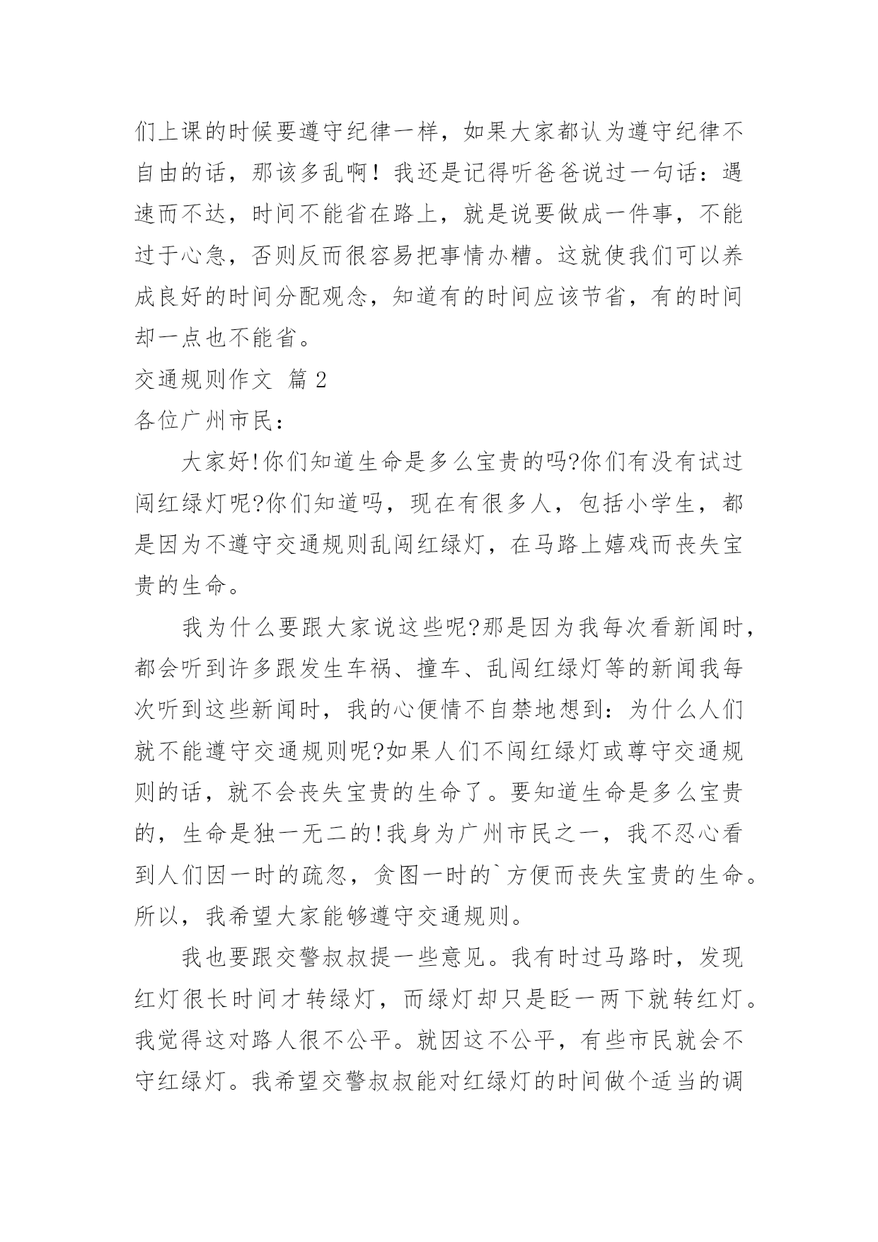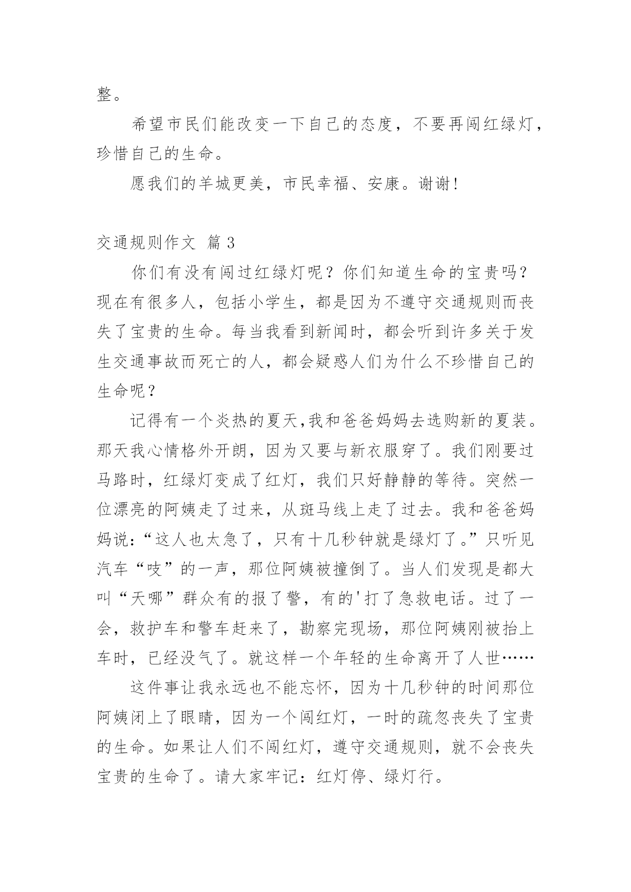 交通规则作文【精品】交通规则作文3篇无论在学习、工作或是生活中,大家都经常看到作文的身影吧,作文是人们把记忆中所存储的有关知识、经验和思想用书面形式表达出来的记叙方式。你知道作文怎样才能写的好吗?以下是小编为大家整理的交通规则作文3篇,仅供参考,欢迎大家阅读。交通规则作文篇1有一天,我看见一辆汽车飞快地在马路上行驶,在前边的车辆间窜来钻去,车喇叭按得“哇哇”直响,听起来非常刺耳。路上的行人看得纷纷摇头,有几个小朋友被吓得哭了起来。我在旁边边走边看着,不由想道:这样实在是太不安全了!这车的速度竟然开得这样快,一个不好,就容易和别的车辆相撞,无论对别人还是自己,都很不好。这车的司机已经严重违反了交通规则,因为他超速了。我又想到我曾看见一个人开车闯了红灯被警察叔叔制止并罚了他的款,他很不服气,磨磨蹭蹭就是不愿认错,总觉得警察叔叔小题大作了。我认为这两个司机都很不对,因为他们都违反了交通规则。我觉得遵守交通规则很重要,遵守它,能使得司机们又快速又安全地行驶,这对大家都好。遵守交通规则,它的重要性不但表现在路上的`安全上,也能提高我们的素质,使我们养成良好的习惯,不能太由着自己的性子,要懂得有的事该做,有的事不该做,这就像我们上课的时候要遵守纪律一样,如果大家都认为遵守纪律不自由的话,那该多乱啊!我还是记得听爸爸说过一句话:遇速而不达,时间不能省在路上,就是说要做成一件事,不能过于心急,否则反而很容易把事情办糟。这就使我们可以养成良好的时间分配观念,知道有的时间应该节省,有的时间却一点也不能省。交通规则作文篇2各位广州市民:大家好!你们知道生命是多么宝贵的吗?你们有没有试过闯红绿灯呢?你们知道吗,现在有很多人,包括小学生,都是因为不遵守交通规则乱闯红绿灯,在马路上嬉戏而丧失宝贵的生命。我为什么要跟大家说这些呢?那是因为我每次看新闻时,都会听到许多跟发生车祸、撞车、乱闯红绿灯等的新闻我每次听到这些新闻时,我的心便情不自禁地想到:为什么人们就不能遵守交通规则呢?如果人们不闯红绿灯或尊守交通规则的话,就不会丧失宝贵的生命了。要知道生命是多么宝贵的,生命是独一无二的!我身为广州市民之一,我不忍心看到人们因一时的疏忽,贪图一时的`方便而丧失宝贵的生命。所以,我希望大家能够遵守交通规则。我也要跟交警叔叔提一些意见。我有时过马路时,发现红灯很长时间才转绿灯,而绿灯却只是眨一两下就转红灯。我觉得这对路人很不公平。就因这不公平,有些市民就会不守红绿灯。我希望交警叔叔能对红绿灯的时间做个适当的调整。希望市民们能改变一下自己的态度,不要再闯红绿灯,珍惜自己的生命。愿我们的羊城更美,市民幸福、安康。谢谢!交通规则作文篇3你们有没有闯过红绿灯呢?你们知道生命的宝贵吗?现在有很多人,包括小学生,都是因为不遵守交通规则而丧失了宝贵的生命。每当我看到新闻时,都会听到许多关于发生交通事故而死亡的人,都会疑惑人们为什么不珍惜自己的生命呢?记得有一个炎热的夏天,我和爸爸妈妈去选购新的夏装。那天我心情格外开朗,因为又要与新衣服穿了。我们刚要过马路时,红绿灯变成了红灯,我们只好静静的等待。突然一位漂亮的阿姨走了过来,从斑马线上走了过去。我和爸爸妈妈说:“这人也太急了,只有十几秒钟就是绿灯了。”只听见汽车“吱”的一声,那位阿姨被撞倒了。当人们发现是都大叫“天哪”群众有的报了警,有的'打了急救电话。过了一会,救护车和警车赶来了,勘察完现场,那位阿姨刚被抬上车时,已经没气了。就这样一个年轻的生命离开了人世……这件事让我永远也不能忘怀,因为十几秒钟的时间那位阿姨闭上了眼睛,因为一个闯红灯,一时的疏忽丧失了宝贵的生命。如果让人们不闯红灯,遵守交通规则,就不会丧失宝贵的生命了。请大家牢记:红灯停、绿灯行。