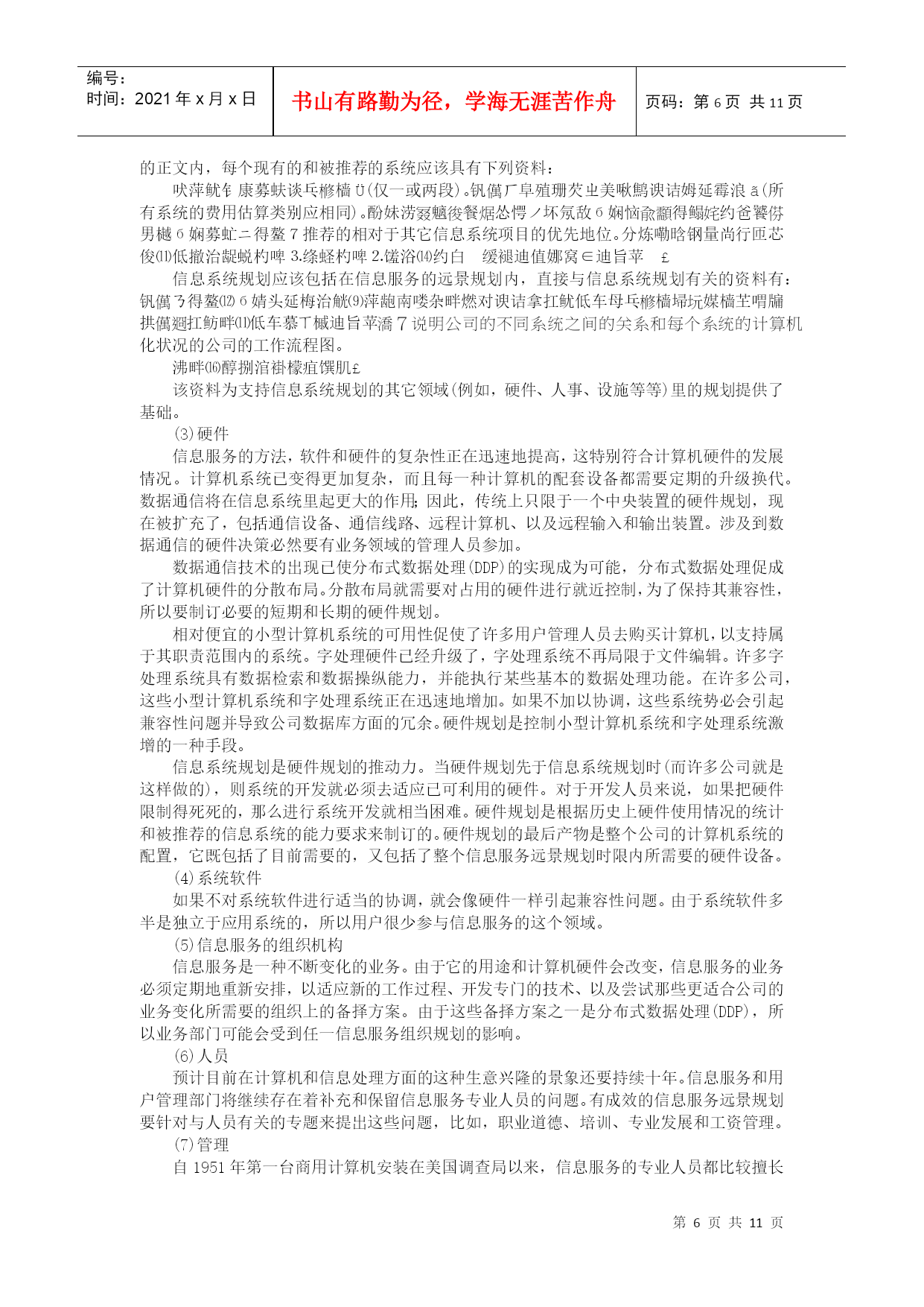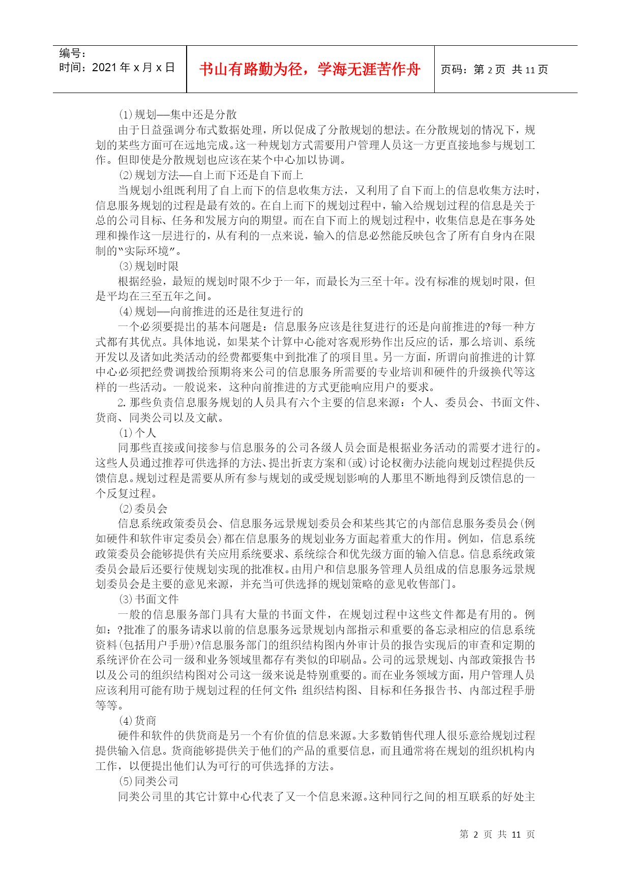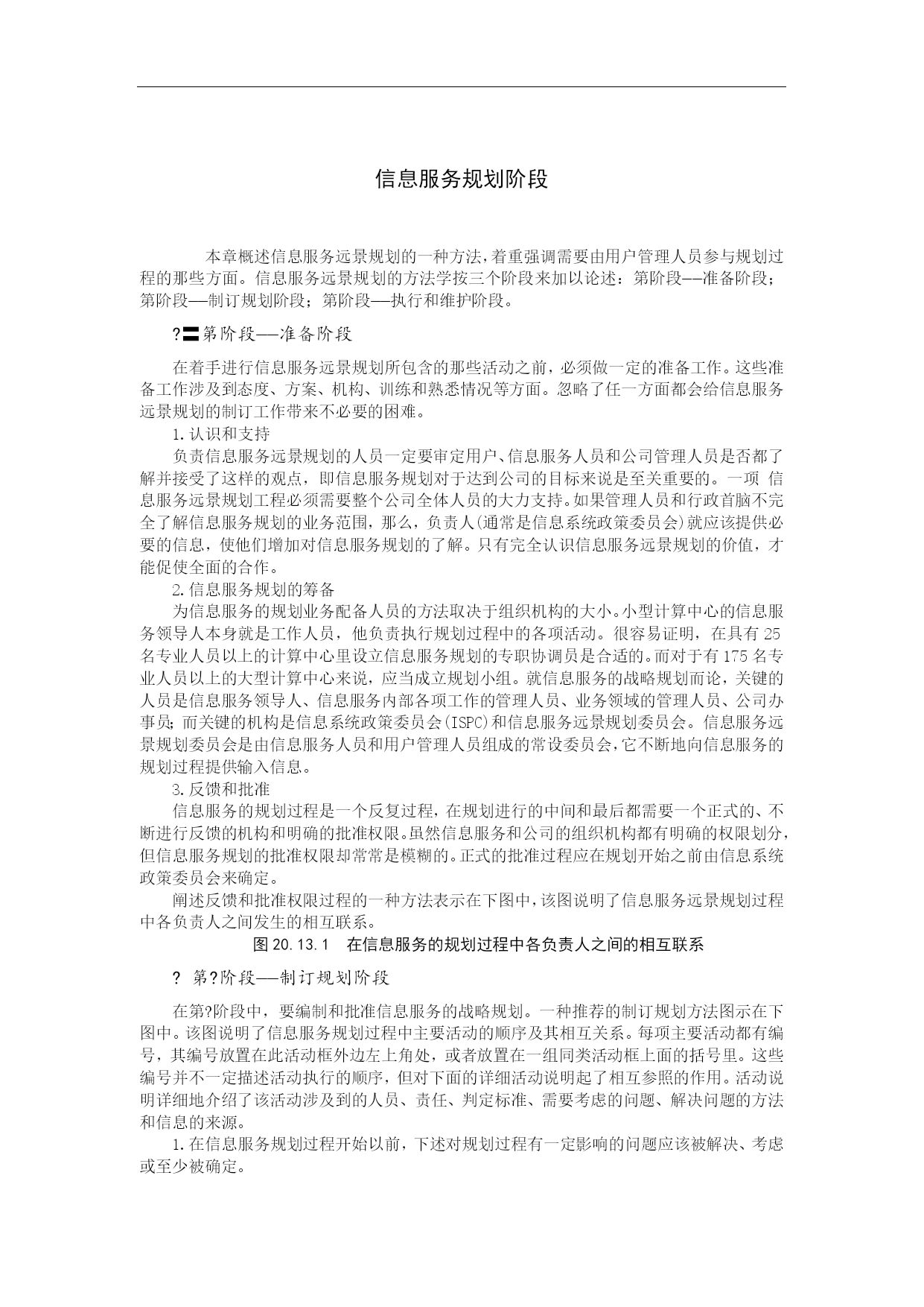 编号:时间:2021年x月x日书山有路勤为径,学海无涯苦作舟页码:第PAGE11页共NUMPAGES11页第PAGE\*MERGEFORMAT11页共NUMPAGES\*MERGEFORMAT11页信息服务规划阶段本章概述信息服务远景规划的一种方法,着重强调需要由用户管理人员参与规划过程的那些方面。信息服务远景规划的方法学按三个阶段来加以论述:第阶段——准备阶段;第阶段——制订规划阶段;第阶段——执行和维护阶段。?〓第阶段——准备阶段在着手进行信息服务远景规划所包含的那些活动之前,必须做一定的准备工作。这些准备工作涉及到态度、方案、机构、训练和熟悉情况等方面。忽略了任一方面都会给信息服务远景规划的制订工作带来不必要的困难。1.认识和支持负责信息服务远景规划的人员一定要审定用户、信息服务人员和公司管理人员是否都了解并接受了这样的观点,即信息服务规划对于达到公司的目标来说是至关重要的。一项信息服务远景规划工程必须需要整个公司全体人员的大力支持。如果管理人员和行政首脑不完全了解信息服务规划的业务范围,那么,负责人(通常是信息系统政策委员会)就应该提供必要的信息,使他们增加对信息服务规划的了解。只有完全认识信息服务远景规划的价值,才能促使全面的合作。2.信息服务规划的筹备为信息服务的规划业务配备人员的方法取决于组织机构的大小。小型计算中心的信息服务领导人本身就是工作人员,他负责执行规划过程中的各项活动。很容易证明,在具有25名专业人员以上的计算中心里设立信息服务规划的专职协调员是合适的。而对于有175名专业人员以上的大型计算中心来说,应当成立规划小组。就信息服务的战略规划而论,关键的人员是信息服务领导人、信息服务内部各项工作的管理人员、业务领域的管理人员、公司办事员;而关键的机构是信息系统政策委员会(ISPC)和信息服务远景规划委员会。信息服务远景规划委员会是由信息服务人员和用户管理人员组成的常设委员会,它不断地向信息服务的规划过程提供输入信息。3.反馈和批准信息服务的规划过程是一个反复过程,在规划进行的中间和最后都需要一个正式的、不断进行反馈的机构和明确的批准权限。虽然信息服务和公司的组织机构都有明确的权限划分,但信息服务规划的批准权限却常常是模糊的。正式的批准过程应在规划开始之前由信息系统政策委员会来确定。阐述反馈和批准权限过程的一种方法表示在下图中,该图说明了信息服务远景规划过程中各负责人之间发生的相互联系。图20.13.1在信息服务的规划过程中各负责人之间的相互联系?第?阶段——制订规划阶段在第?阶段中,要编制和批准信息服务的战略规划。一种推荐的制订规划方法图示在下图中。该图说明了信息服务规划过程中主要活动的顺序及其相互关系。每项主要活动都有编号,其编号放置在此活动框外边左上角处,或者放置在一组同类活动框上面的括号里。这些编号并不一定描述活动执行的顺序,但对下面的详细活动说明起了相互参照的作用。活动说明详细地介绍了该活动涉及到的人员、责任、判定标准、需要考虑的问题、解决问题的方法和信息的来源。1.在信息服务规划过程开始以前,下述对规划过程有一定影响的问题应该被解决、考虑或至少被确定。(1)规划——集中还是分散由于日益强调分布式数据处理,所以促成了分散规划的想法。在分散规划的情况下,规划的某些方面可在远地完成。这一种规划方式需要用户管理人员这一方更直接地参与规划工作。但即使是分散规划也应该在某个中心加以协调。(2)规划方法——自上而下还是自下而上当规划小组既利用了自上而下的信息收集方法,又利用了自下而上的信息收集方法时,信息服务规划的过程是最有效的。在自上而下的规划过程中,输入给规划过程的信息是关于总的公司目标、任务和发展方向的期望。而在自下而上的规划过程中,收集信息是在事务处理和操作这一层进行的,从有利的一点来说,输入的信息必然能反映包含了所有自身内在限制的“实际环境”。(3)规划时限根据经验,最短的规划时限不少于一年,而最长为三至十年。没有标准的规划时限,但是平均在三至五年之间。(4)规划——向前推进的还是往复进行的一个必须要提出的基本问题是:信息服务应该是往复进行的还是向前推进的?每一种方式都有其优点。具体地说,如果某个计算中心能对客观形势作出反应的话,那么培训、系统开发以及诸如此类活动的经费都要集中到批准了的项目里。另一方面,所谓向前推进的计算中心必须把经费调拨给预期将来公司的信息服务所需要的专业培训和硬件的升级换代等这样的一些活动。一般说来,这种向前推进的方式更能响应用户的要求。2.那些负责信息服务规划的人员具有六个主要的信息来源:个人、委员会、书面文件、货商、同类公司以及文献。(1)个人同那些直接或间接参与信息服务的公司