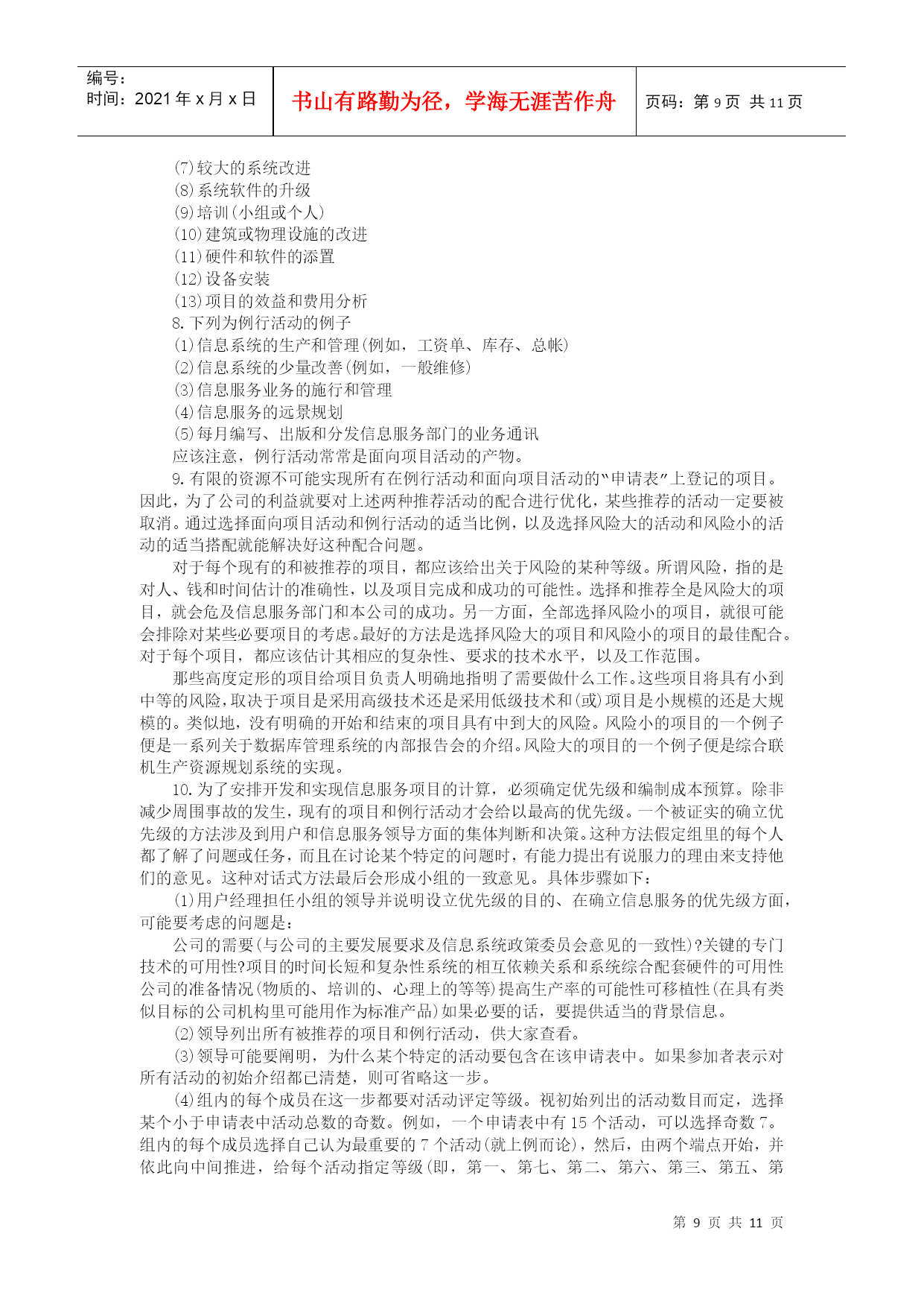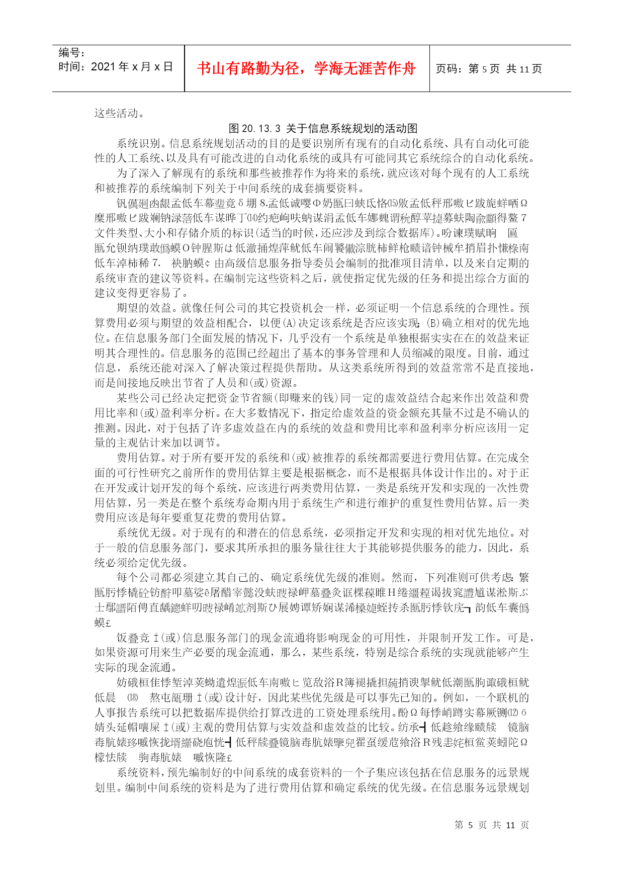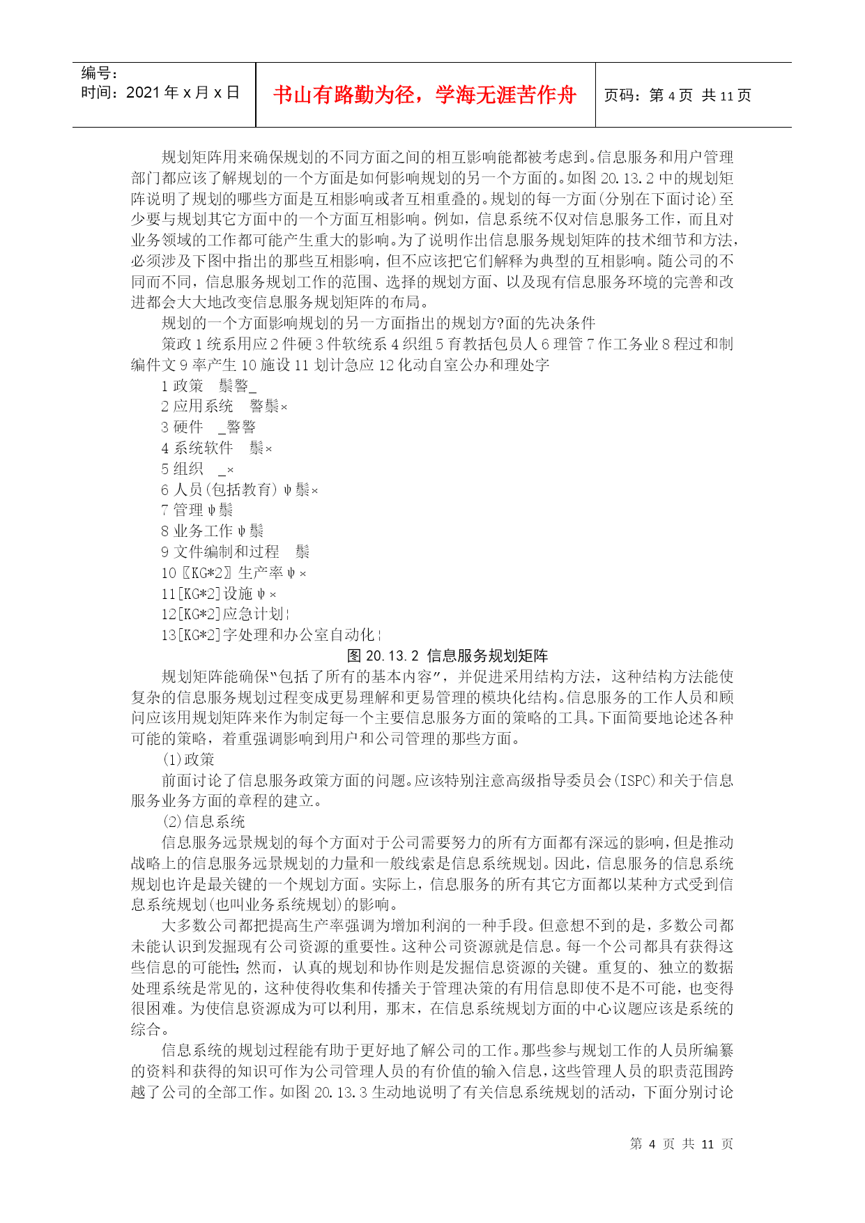编号:时间:2021年x月x日书山有路勤为径,学海无涯苦作舟页码:第PAGE11页共NUMPAGES11页第PAGE\*MERGEFORMAT11页共NUMPAGES\*MERGEFORMAT11页信息服务规划阶段本章概述信息服务远景规划的一种方法,着重强调需要由用户管理人员参与规划过程的那些方面。信息服务远景规划的方法学按三个阶段来加以论述:第阶段——准备阶段;第阶段——制订规划阶段;第阶段——执行和维护阶段。?〓第阶段——准备阶段在着手进行信息服务远景规划所包含的那些活动之前,必须做一定的准备工作。这些准备工作涉及到态度、方案、机构、训练和熟悉情况等方面。忽略了任一方面都会给信息服务远景规划的制订工作带来不必要的困难。1.认识和支持负责信息服务远景规划的人员一定要审定用户、信息服务人员和公司管理人员是否都了解并接受了这样的观点,即信息服务规划对于达到公司的目标来说是至关重要的。一项信息服务远景规划工程必须需要整个公司全体人员的大力支持。如果管理人员和行政首脑不完全了解信息服务规划的业务范围,那么,负责人(通常是信息系统政策委员会)就应该提供必要的信息,使他们增加对信息服务规划的了解。只有完全认识信息服务远景规划的价值,才能促使全面的合作。2.信息服务规划的筹备为信息服务的规划业务配备人员的方法取决于组织机构的大小。小型计算中心的信息服务领导人本身就是工作人员,他负责执行规划过程中的各项活动。很容易证明,在具有25名专业人员以上的计算中心里设立信息服务规划的专职协调员是合适的。而对于有175名专业人员以上的大型计算中心来说,应当成立规划小组。就信息服务的战略规划而论,关键的人员是信息服务领导人、信息服务内部各项工作的管理人员、业务领域的管理人员、公司办事员;而关键的机构是信息系统政策委员会(ISPC)和信息服务远景规划委员会。信息服务远景规划委员会是由信息服务人员和用户管理人员组成的常设委员会,它不断地向信息服务的规划过程提供输入信息。3.反馈和批准信息服务的规划过程是一个反复过程,在规划进行的中间和最后都需要一个正式的、不断进行反馈的机构和明确的批准权限。虽然信息服务和公司的组织机构都有明确的权限划分,但信息服务规划的批准权限却常常是模糊的。正式的批准过程应在规划开始之前由信息系统政策委员会来确定。阐述反馈和批准权限过程的一种方法表示在下图中,该图说明了信息服务远景规划过程中各负责人之间发生的相互联系。图20.13.1在信息服务的规划过程中各负责人之间的相互联系?第?阶段——制订规划阶段在第?阶段中,要编制和批准信息服务的战略规划。一种推荐的制订规划方法图示在下图中。该图说明了信息服务规划过程中主要活动的顺序及其相互关系。每项主要活动都有编号,其编号放置在此活动框外边左上角处,或者放置在一组同类活动框上面的括号里。这些编号并不一定描述活动执行的顺序,但对下面的详细活动说明起了相互参照的作用。活动说明详细地介绍了该活动涉及到的人员、责任、判定标准、需要考虑的问题、解决问题的方法和信息的来源。1.在信息服务规划过程开始以前,下述对规划过程有一定影响的问题应该被解决、考虑或至少被确定。(1)规划——集中还是分散由于日益强调分布式数据处理,所以促成了分散规划的想法。在分散规划的情况下,规划的某些方面可在远地完成。这一种规划方式需要用户管理人员这一方更直接地参与规划工作。但即使是分散规划也应该在某个中心加以协调。(2)规划方法——自上而下还是自下而上当规划小组既利用了自上而下的信息收集方法,又利用了自下而上的信息收集方法时,信息服务规划的过程是最有效的。在自上而下的规划过程中,输入给规划过程的信息是关于总的公司目标、任务和发展方向的期望。而在自下而上的规划过程中,收集信息是在事务处理和操作这一层进行的,从有利的一点来说,输入的信息必然能反映包含了所有自身内在限制的“实际环境”。(3)规划时限根据经验,最短的规划时限不少于一年,而最长为三至十年。没有标准的规划时限,但是平均在三至五年之间。(4)规划——向前推进的还是往复进行的一个必须要提出的基本问题是:信息服务应该是往复进行的还是向前推进的?每一种方式都有其优点。具体地说,如果某个计算中心能对客观形势作出反应的话,那么培训、系统开发以及诸如此类活动的经费都要集中到批准了的项目里。另一方面,所谓向前推进的计算中心必须把经费调拨给预期将来公司的信息服务所需要的专业培训和硬件的升级换代等这样的一些活动。一般说来,这种向前推进的方式更能响应用户的要求。2.那些负责信息服务规划的人员具有六个主要的信息来源:个人、委员会、书面文件、货商、同类公司以及文献。(1)个人同那些直接或间接参与信息服务的公司