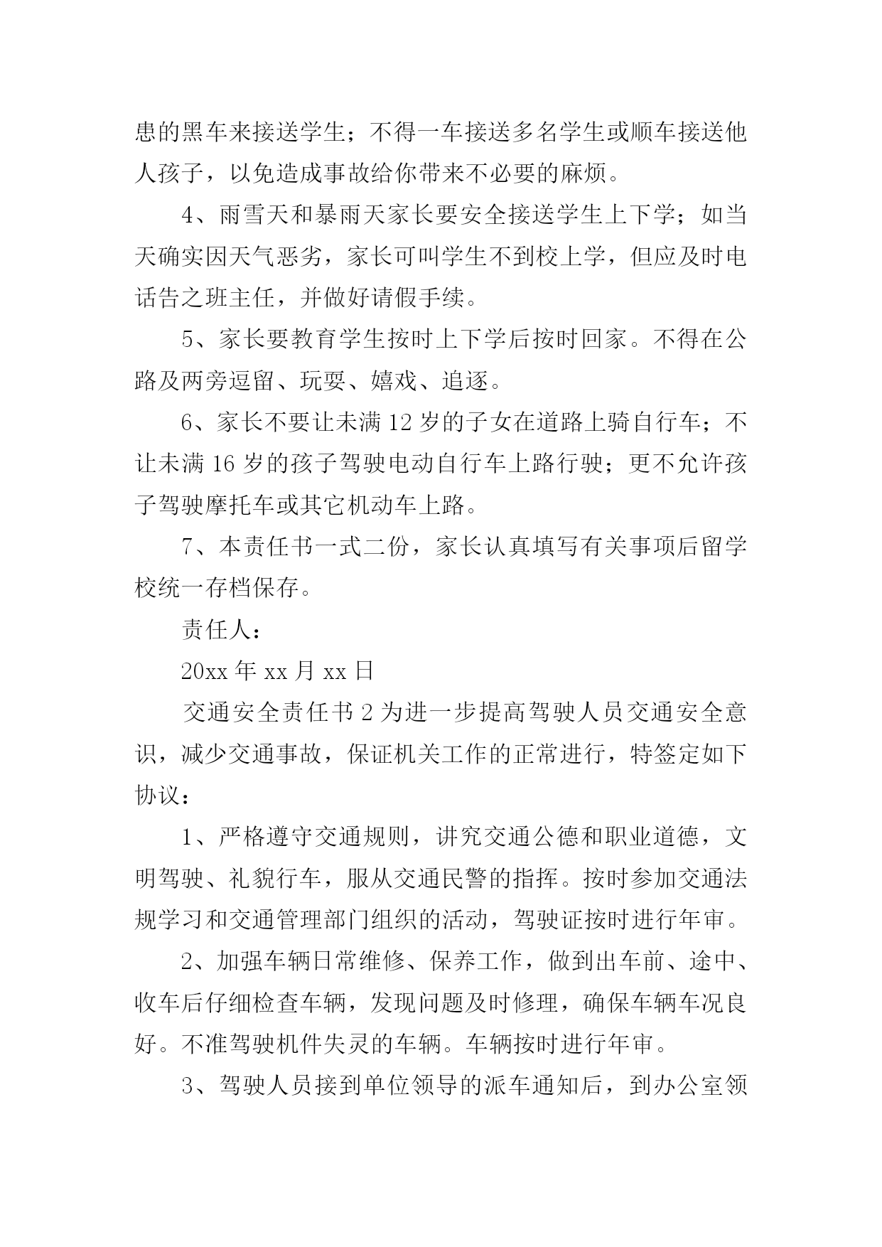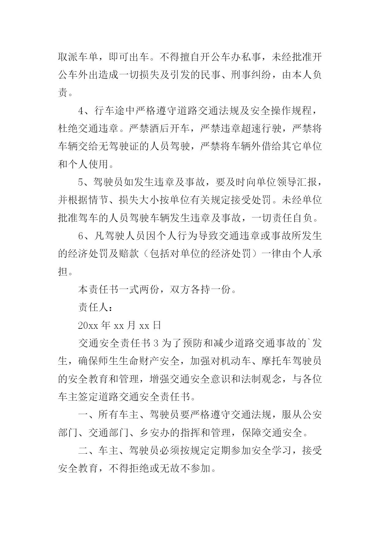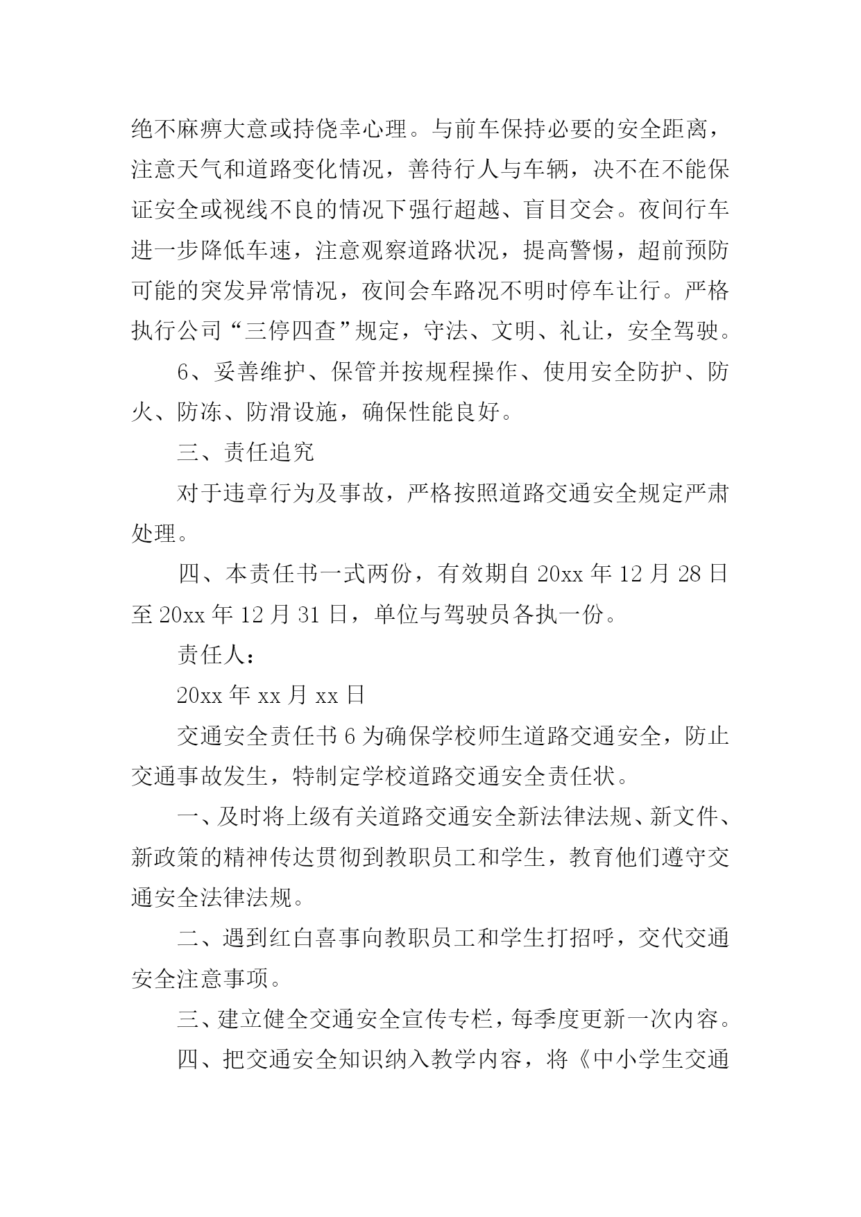 交通安全责任书交通安全责任书1为确保学生上下学交通安全,使学生高高兴兴上学,平平安安回家,作为家长应积极配合学校做好子女安全教育工作,真正担负起监护责任。我校地处村村通公路旁,车流量大,对学生上下学造成较大安全隐患。学校和家长应共同教育学生遵守交通安全法规,增强孩子交通安全意识、自我保护意识。做到责任到位,确保学生人身安全。特与家长签订如下交通安全责任书:一、学校方面:1、加强交通安全宣传教育,引导学生遵守交通规则,不乘坐非法营运及不符合要求的车辆;2、教育、督促学生放学后按时回家。不准在公路及两旁玩耍、游戏、骑车、滑滑板等。二、家长方面:1、家长要认真学习交通安全法规,教育孩子自觉遵守交通安全法规,上下学途中不得嬉戏打闹,过马路时要注意交通规则,注意来往车辆,要靠右行走。2、家长要教育学生不乘坐超速超载车、拼装车、报废车、无牌无证车、三轮车、个人机动车、低速载货汽车和拖拉机等存在安全隐患的车辆,提高学生交通安全意识和自我防护能力,有效防止交通事故的发生。3、家长不得使用或租用拼装车、报废车、无牌无证车、三轮车、个人机动车、低速载货汽车和拖拉机等存在安全隐患的黑车来接送学生;不得一车接送多名学生或顺车接送他人孩子,以免造成事故给你带来不必要的麻烦。4、雨雪天和暴雨天家长要安全接送学生上下学;如当天确实因天气恶劣,家长可叫学生不到校上学,但应及时电话告之班主任,并做好请假手续。5、家长要教育学生按时上下学后按时回家。不得在公路及两旁逗留、玩耍、嬉戏、追逐。6、家长不要让未满12岁的子女在道路上骑自行车;不让未满16岁的孩子驾驶电动自行车上路行驶;更不允许孩子驾驶摩托车或其它机动车上路。7、本责任书一式二份,家长认真填写有关事项后留学校统一存档保存。责任人:20xx年xx月xx日交通安全责任书2为进一步提高驾驶人员交通安全意识,减少交通事故,保证机关工作的正常进行,特签定如下协议:1、严格遵守交通规则,讲究交通公德和职业道德,文明驾驶、礼貌行车,服从交通民警的指挥。按时参加交通法规学习和交通管理部门组织的活动,驾驶证按时进行年审。2、加强车辆日常维修、保养工作,做到出车前、途中、收车后仔细检查车辆,发现问题及时修理,确保车辆车况良好。不准驾驶机件失灵的车辆。车辆按时进行年审。3、驾驶人员接到单位领导的派车通知后,到办公室领取派车单,即可出车。不得擅自开公车办私事,未经批准开公车外出造成一切损失及引发的民事、刑事纠纷,由本人负责。4、行车途中严格遵守道路交通法规及安全操作规程,杜绝交通违章。严禁酒后开车,严禁违章超速行驶,严禁将车辆交给无驾驶证的人员驾驶,严禁将车辆外借给其它单位和个人使用。5、驾驶员如发生违章及事故,要及时向单位领导汇报,并根据情节、损失大小按单位有关规定接受处罚。未经单位批准驾车的人员驾驶车辆发生违章及事故,一切责任自负。6、凡驾驶人员因个人行为导致交通违章或事故所发生的经济处罚及赔款(包括对单位的经济处罚)一律由个人承担。本责任书一式两份,双方各持一份。责任人:20xx年xx月xx日交通安全责任书3为了预防和减少道路交通事故的`发生,确保师生生命财产安全,加强对机动车、摩托车驾驶员的安全教育和管理,增强交通安全意识和法制观念,与各位车主签定道路交通安全责任书。一、所有车主、驾驶员要严格遵守交通法规,服从公安部门、交通部门、乡安办的指挥和管理,保障交通安全。二、车主、驾驶员必须按规定定期参加安全学习,接受安全教育,不得拒绝或无故不参加。三、车主必须到公安交警部门办理牌证,领取号牌、行驶证,方准上路行驶,严禁无牌无证的车辆上路。四、车辆必须保持车况良好,车容整洁,证件齐全有效,严禁拼装车、故障车、“带病、带残”车辆上路行驶。车辆必须定期年检,未按规定检验合格的,不准继续行驶。五、驾驶证必须按规定审检,未经审检合格的,不准继续行驶。六、驾驶车辆时必须带齐驾驶证、行驶证,严禁无驾驶证开车。七、二轮摩托车只准坐二人,严禁超坐、超速,严禁农用车客货混装。八、驾驶和乘坐摩托车必须戴安全头盔。严禁疲劳驾车、酒后驾车,严禁挪用牌证。九、机动车辆必须参加强制保险,禁止将车辆交给没有驾驶证的人驾驶。十、保证政令畅通,发生事故及时上报。不准隐瞒不报或迟报。责任人:20xx年xx月xx日交通安全责任书4根据国家、盛市有关文件精神,为进一步加强车辆规范化管理,明确车辆安全管理职责,防止车辆交通安全事故的发生。特签定如下责任书。主管领导责任:1、监督、检查主管部门的车辆管理和使用。2、严禁私自驾驶公务用车。对因特殊情况确需自己驾驶公车的,经请示局长同意后方可,否则出现交通事故的,本人承担一切责任。3、按照“谁主管,谁负责”的原则,对主管部门的车辆安全负有直