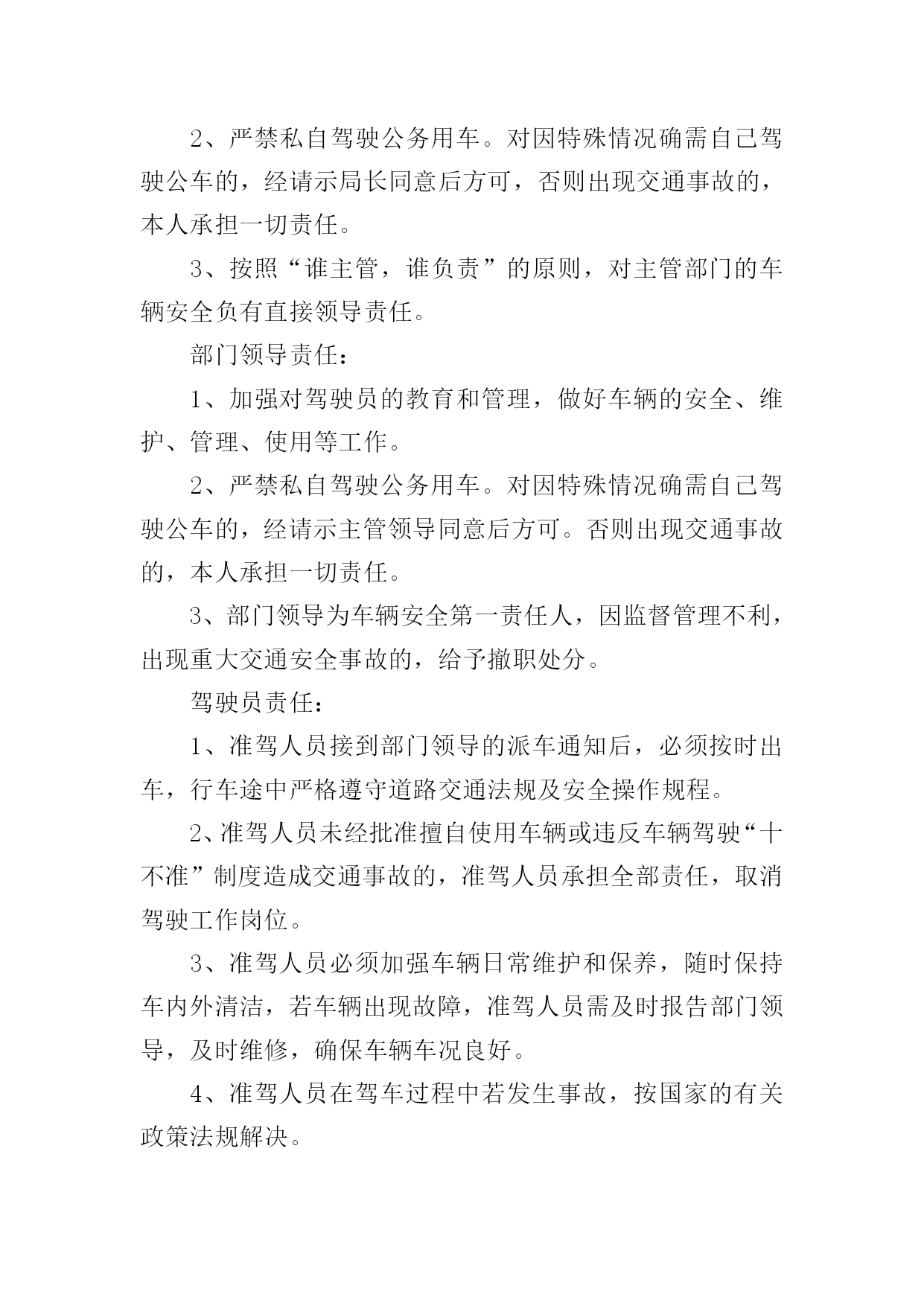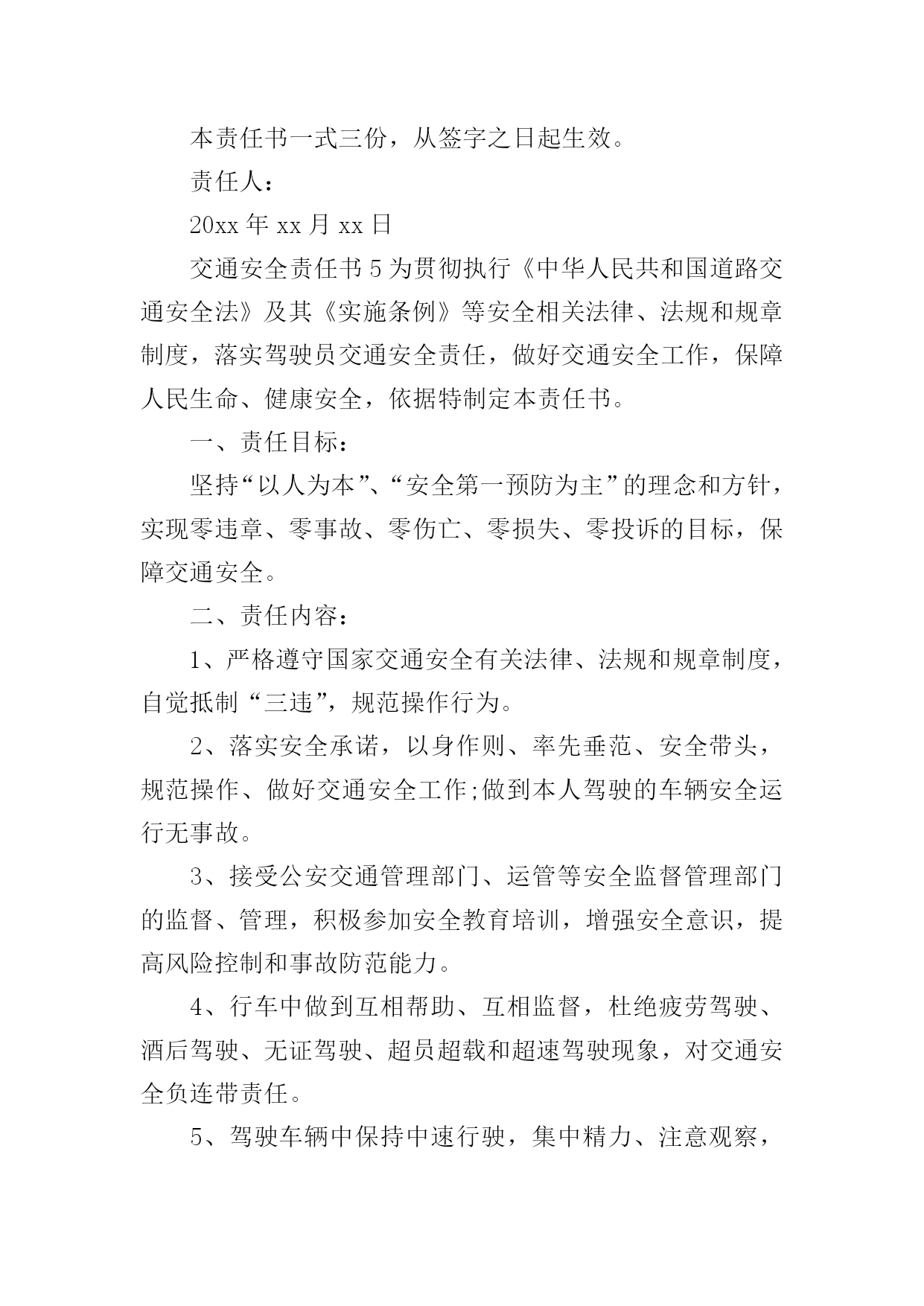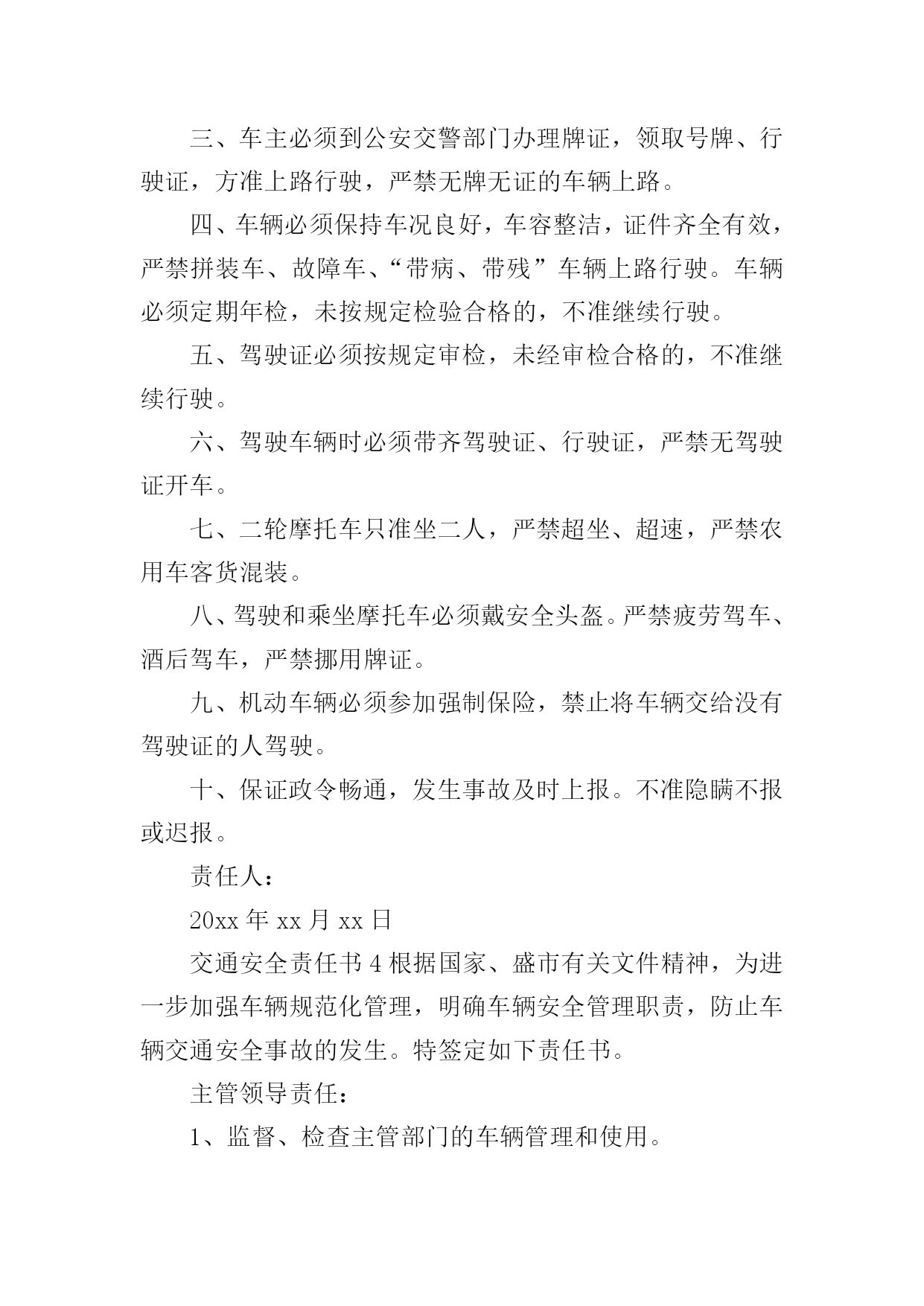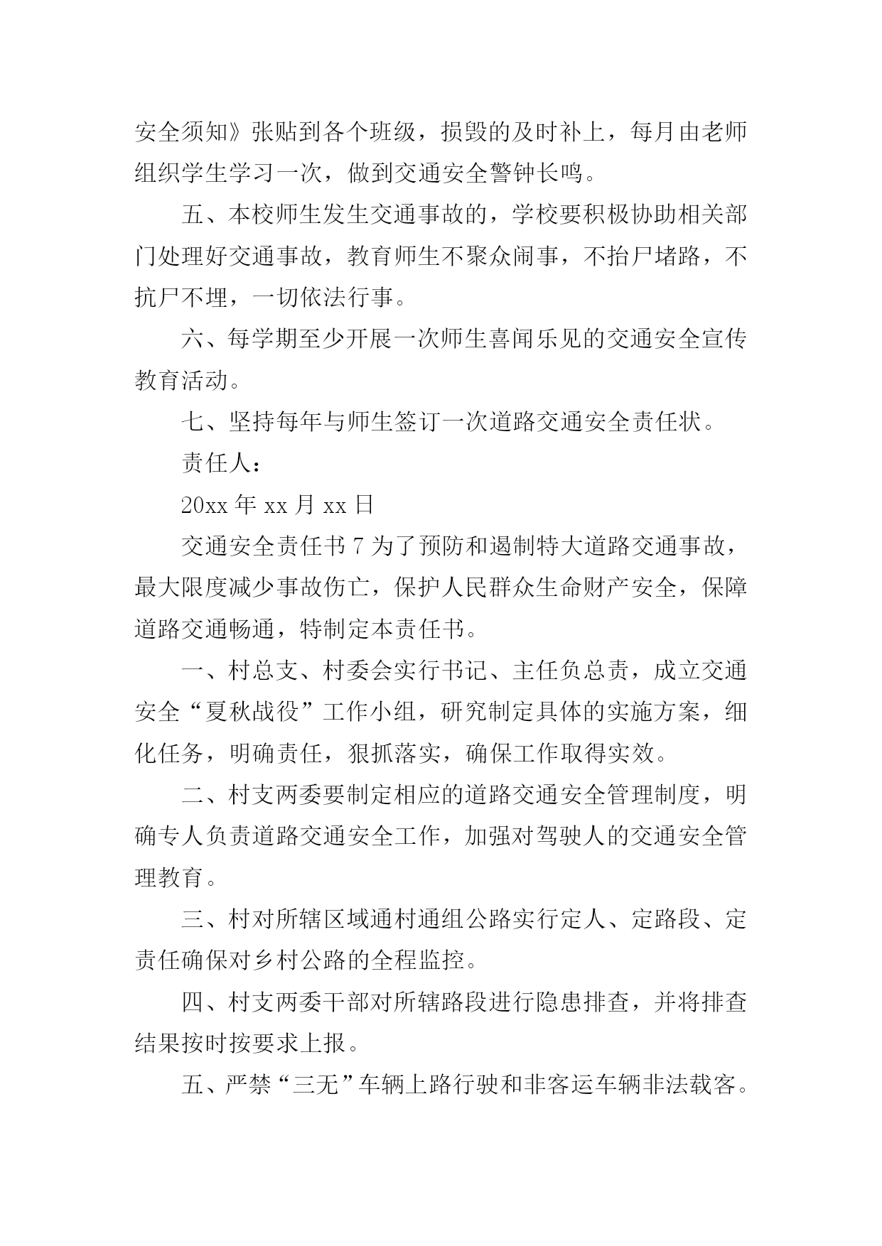 交通安全责任书交通安全责任书1为确保学生上下学交通安全,使学生高高兴兴上学,平平安安回家,作为家长应积极配合学校做好子女安全教育工作,真正担负起监护责任。我校地处村村通公路旁,车流量大,对学生上下学造成较大安全隐患。学校和家长应共同教育学生遵守交通安全法规,增强孩子交通安全意识、自我保护意识。做到责任到位,确保学生人身安全。特与家长签订如下交通安全责任书:一、学校方面:1、加强交通安全宣传教育,引导学生遵守交通规则,不乘坐非法营运及不符合要求的车辆;2、教育、督促学生放学后按时回家。不准在公路及两旁玩耍、游戏、骑车、滑滑板等。二、家长方面:1、家长要认真学习交通安全法规,教育孩子自觉遵守交通安全法规,上下学途中不得嬉戏打闹,过马路时要注意交通规则,注意来往车辆,要靠右行走。2、家长要教育学生不乘坐超速超载车、拼装车、报废车、无牌无证车、三轮车、个人机动车、低速载货汽车和拖拉机等存在安全隐患的车辆,提高学生交通安全意识和自我防护能力,有效防止交通事故的发生。3、家长不得使用或租用拼装车、报废车、无牌无证车、三轮车、个人机动车、低速载货汽车和拖拉机等存在安全隐患的黑车来接送学生;不得一车接送多名学生或顺车接送他人孩子,以免造成事故给你带来不必要的麻烦。4、雨雪天和暴雨天家长要安全接送学生上下学;如当天确实因天气恶劣,家长可叫学生不到校上学,但应及时电话告之班主任,并做好请假手续。5、家长要教育学生按时上下学后按时回家。不得在公路及两旁逗留、玩耍、嬉戏、追逐。6、家长不要让未满12岁的子女在道路上骑自行车;不让未满16岁的孩子驾驶电动自行车上路行驶;更不允许孩子驾驶摩托车或其它机动车上路。7、本责任书一式二份,家长认真填写有关事项后留学校统一存档保存。责任人:20xx年xx月xx日交通安全责任书2为进一步提高驾驶人员交通安全意识,减少交通事故,保证机关工作的正常进行,特签定如下协议:1、严格遵守交通规则,讲究交通公德和职业道德,文明驾驶、礼貌行车,服从交通民警的指挥。按时参加交通法规学习和交通管理部门组织的活动,驾驶证按时进行年审。2、加强车辆日常维修、保养工作,做到出车前、途中、收车后仔细检查车辆,发现问题及时修理,确保车辆车况良好。不准驾驶机件失灵的车辆。车辆按时进行年审。3、驾驶人员接到单位领导的派车通知后,到办公室领取派车单,即可出车。不得擅自开公车办私事,未经批准开公车外出造成一切损失及引发的民事、刑事纠纷,由本人负责。4、行车途中严格遵守道路交通法规及安全操作规程,杜绝交通违章。严禁酒后开车,严禁违章超速行驶,严禁将车辆交给无驾驶证的人员驾驶,严禁将车辆外借给其它单位和个人使用。5、驾驶员如发生违章及事故,要及时向单位领导汇报,并根据情节、损失大小按单位有关规定接受处罚。未经单位批准驾车的人员驾驶车辆发生违章及事故,一切责任自负。6、凡驾驶人员因个人行为导致交通违章或事故所发生的经济处罚及赔款(包括对单位的经济处罚)一律由个人承担。本责任书一式两份,双方各持一份。责任人:20xx年xx月xx日交通安全责任书3为了预防和减少道路交通事故的`发生,确保师生生命财产安全,加强对机动车、摩托车驾驶员的安全教育和管理,增强交通安全意识和法制观念,与各位车主签定道路交通安全责任书。一、所有车主、驾驶员要严格遵守交通法规,服从公安部门、交通部门、乡安办的指挥和管理,保障交通安全。二、车主、驾驶员必须按规定定期参加安全学习,接受安全教育,不得拒绝或无故不参加。三、车主必须到公安交警部门办理牌证,领取号牌、行驶证,方准上路行驶,严禁无牌无证的车辆上路。四、车辆必须保持车况良好,车容整洁,证件齐全有效,严禁拼装车、故障车、“带病、带残”车辆上路行驶。车辆必须定期年检,未按规定检验合格的,不准继续行驶。五、驾驶证必须按规定审检,未经审检合格的,不准继续行驶。六、驾驶车辆时必须带齐驾驶证、行驶证,严禁无驾驶证开车。七、二轮摩托车只准坐二人,严禁超坐、超速,严禁农用车客货混装。八、驾驶和乘坐摩托车必须戴安全头盔。严禁疲劳驾车、酒后驾车,严禁挪用牌证。九、机动车辆必须参加强制保险,禁止将车辆交给没有驾驶证的人驾驶。十、保证政令畅通,发生事故及时上报。不准隐瞒不报或迟报。责任人:20xx年xx月xx日交通安全责任书4根据国家、盛市有关文件精神,为进一步加强车辆规范化管理,明确车辆安全管理职责,防止车辆交通安全事故的发生。特签定如下责任书。主管领导责任:1、监督、检查主管部门的车辆管理和使用。2、严禁私自驾驶公务用车。对因特殊情况确需自己驾驶公车的,经请示局长同意后方可,否则出现交通事故的,本人承担一切责任。3、按照“谁主管,谁负责”的原则,对主管部门的车辆安全负有直