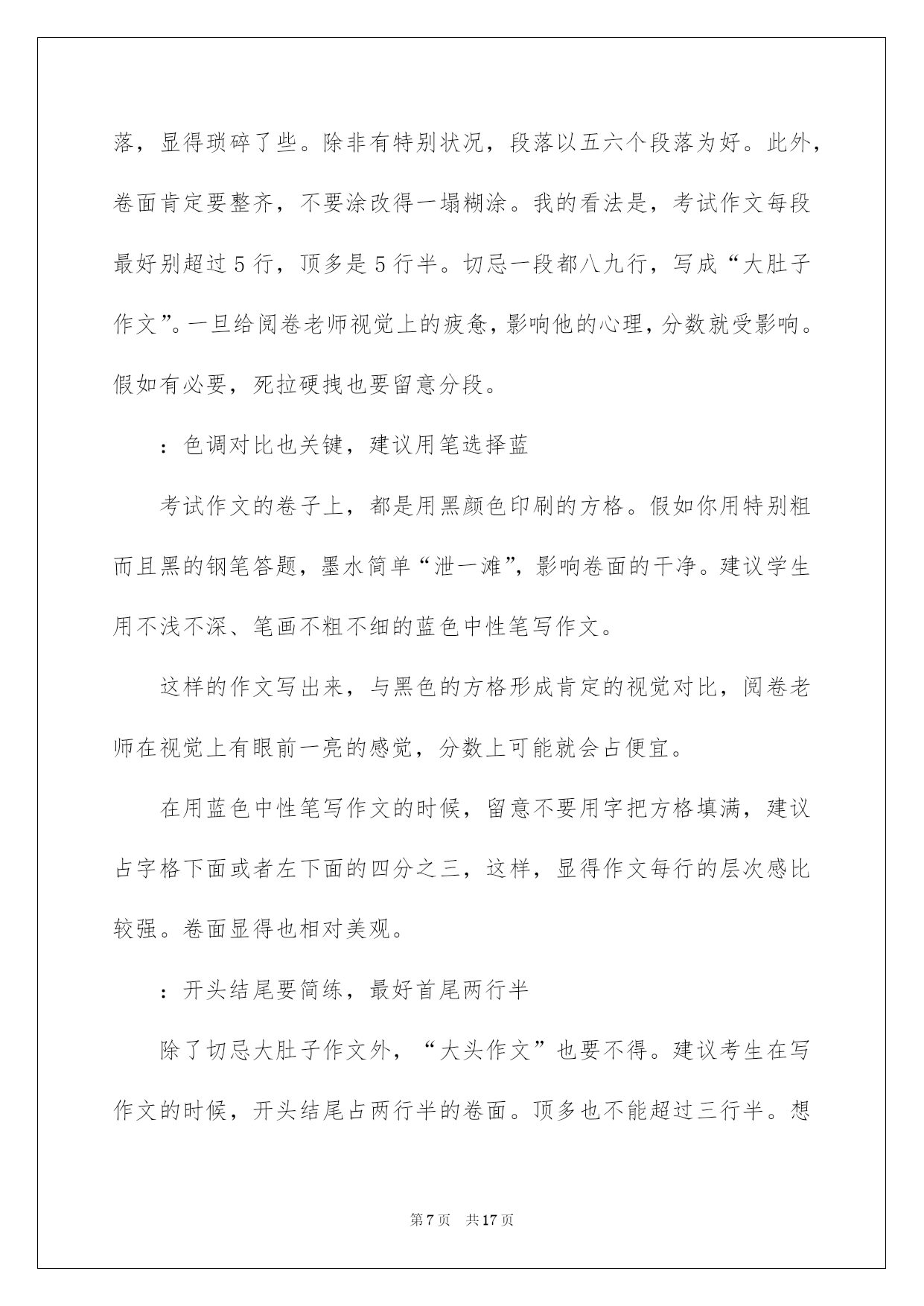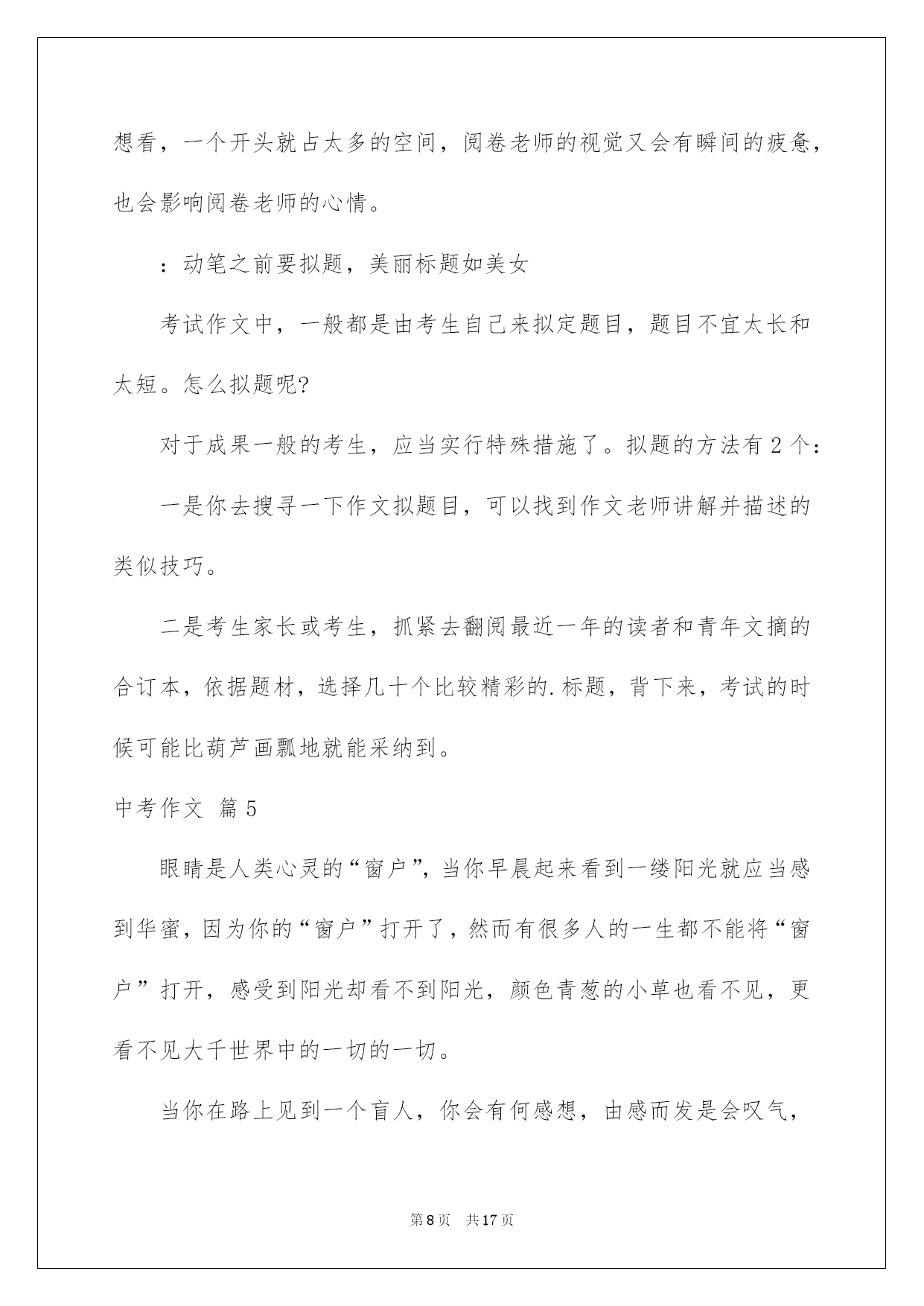 第PAGE\*Arabic\*MERGEFORMAT17页共NUMPAGES\*Arabic\*MERGEFORMAT17页第PAGE\*MERGEFORMAT17页共NUMPAGES\*MERGEFORMAT17页第PAGE\*MERGEFORMAT17页共NUMPAGES\*MERGEFORMAT17页第PAGE\*MERGEFORMAT17页共NUMPAGES\*MERGEFORMAT17页第PAGE\*MERGEFORMAT17页共NUMPAGES\*MERGEFORMAT17页第PAGE\*MERGEFORMAT17页共NUMPAGES\*MERGEFORMAT17页第PAGE\*MERGEFORMAT17页共NUMPAGES\*MERGEFORMAT17页第PAGE\*MERGEFORMAT17页共NUMPAGES\*MERGEFORMAT17页第PAGE\*MERGEFORMAT17页共NUMPAGES\*MERGEFORMAT17页第PAGE\*MERGEFORMAT17页共NUMPAGES\*MERGEFORMAT17页第PAGE\*MERGEFORMAT17页共NUMPAGES\*MERGEFORMAT17页2022中考作文精选中考作文锦集9篇在学习、工作或生活中,大家都常常看到作文的身影吧,作文是经过人的思想考虑和语言组织,通过文字来表达一个主题意义的记叙方法。信任许多挚友都对写作文感到特别苦恼吧,下面是我细心整理的中考作文9篇,供大家参考借鉴,希望可以帮助到有须要的挚友。中考作文篇1我很希望到国外去,我们这里的很多人都出国淘金,我的爸爸妈妈也希望我将来能够出国留学,我姐姐则崇拜那些韩国日本的明星,她应当就属于“哈韩哈日族”吧。总之,在我心中,五千年的悠久历史好像成为了祖国前进的巨大负担,它使我们接受所谓的“素养教化”,使我们要背大段大段的文言文,接受题海战术,扼杀了我们的想象力,束缚了我们的思想。但是,上午从报纸上看到了一篇文章,却使我大为惊异。文章中说:现在有越来越多的外国人对中国的文化历史产生了巨大的爱好,现在全世界有80多所孔子学校,特地用以学习探讨孔子思想。而世界足联主席布拉特在闲暇之余,很喜爱琢磨老子的《道德经》,葡萄牙队主教练斯科拉里在备战世界杯时正看孙武的《孙子兵法》……惊异之后,便是一番愧疚。自己的文化啊,曾经被我看的一文不值,早就不放在眼里了,而那些钞票比我们多得多的老外却把他们视为珍宝。我想这不仅仅体现了中国的国际地位的提高,更体现了中国文化的博大精深。现在回想起孔子的论语十则,觉得那短短的十句话的确充溢了生活的哲理,体现了先祖们的才智。可是,现在像我这样的人已不在少数,他们会醒悟吗?班上的每节早读课,读英语的比比皆是,除非语文老师要检查背诵,要不,念语文的则寥寥无几,大家都说语文太古板了,而且英语的学习任务也的确很重。书店里热销的也都是一些管理营销方面的书,或者一两本网上速成的小说,五千年的绚丽文化输给了三百年的工业发展,为什么呢?有些人认为传统就是落后,有些人认为GDP能代表一切,他们都错了。传统并不代表落后,一些传统陋俗的确应当让它尘封,而一些优良传统则须要我们的继承与发扬,GDP只能代表这个国家的贫或富,而人文素养则体现了一个民族的精神境界,对于外来文化,我们不能照单全收,也不能全部否定,而应当执行拿来主义,我们要爱护我们的文化,爱护我们的人文,不能让这物欲横流的世界模糊了孔子的脸庞。中考作文篇2夜色中,我睡得正朦胧,房门被悄然打开,我模糊中见到父亲来了,他用他那双大而暖和的手给我盖上了被子,被寒意侵袭的我,忽然暖和了。小时候,我就喜爱父亲的手,尽管那双手,非常粗糙,以致于那双手摸到我的手,都感觉有点痛,但是我不介意,我喜爱父亲的手。上学后,父亲的手是一双劝慰我的手,我被人欺压了,或是受了委屈,父亲就经常用那双好大好暖和的手轻抚着我毛茸茸的小脑袋,说着劝慰我的话,我忽然笑逐颜开了,那不正是因为我宠爱父亲的手吗?最终,时间一点一滴地过去,成熟起来。可以不再依靠父亲的手来劝慰我,而学习的繁重,已慢慢地使我起先遗忘了父亲的手,忘了那手中所蕴含的丰富感情以及其中的无限回忆。可当我时常发觉父亲自上的伤痕又多了时,我又禁不住非常伤心起来。我又想,我当真能遗忘那样的一双手吗?那是我父亲的手啊!快要大考了,夜里,挑灯夜战的我,好累,又好烦躁,父亲为什么偏偏又要在我身边踱来踱去呢?我越加急躁。父亲又习惯性地伸出那手,摸摸我的头,我终究奈不住了,猛一转头,冲着父亲嚷了一句:“你好烦呀!没见着我忙呀?”父亲先一愣,然后笑着说:“好,好,我走,