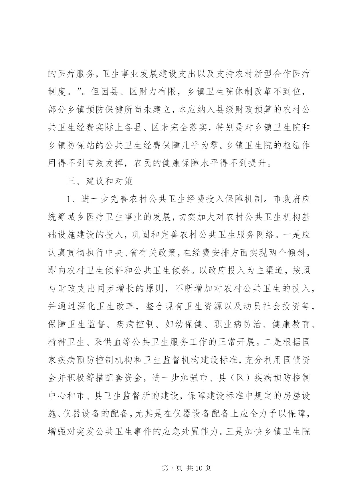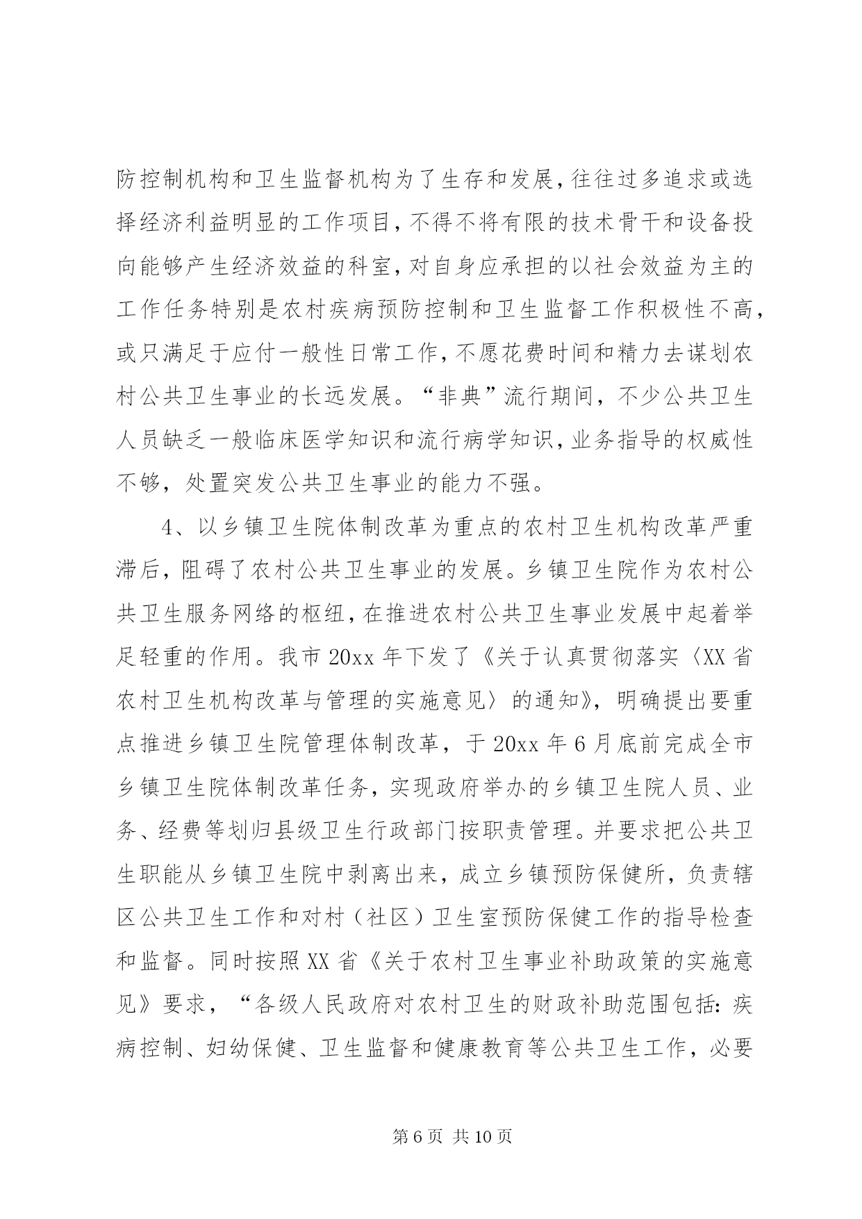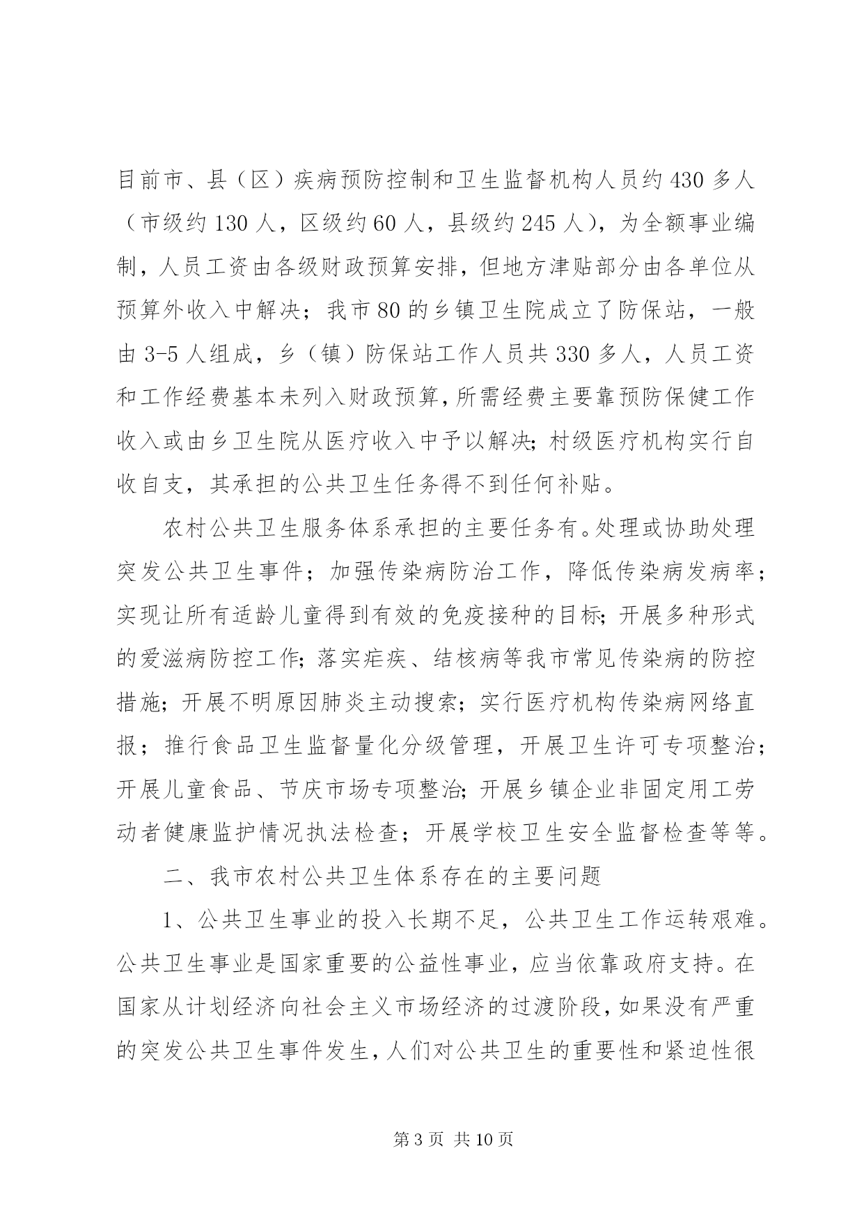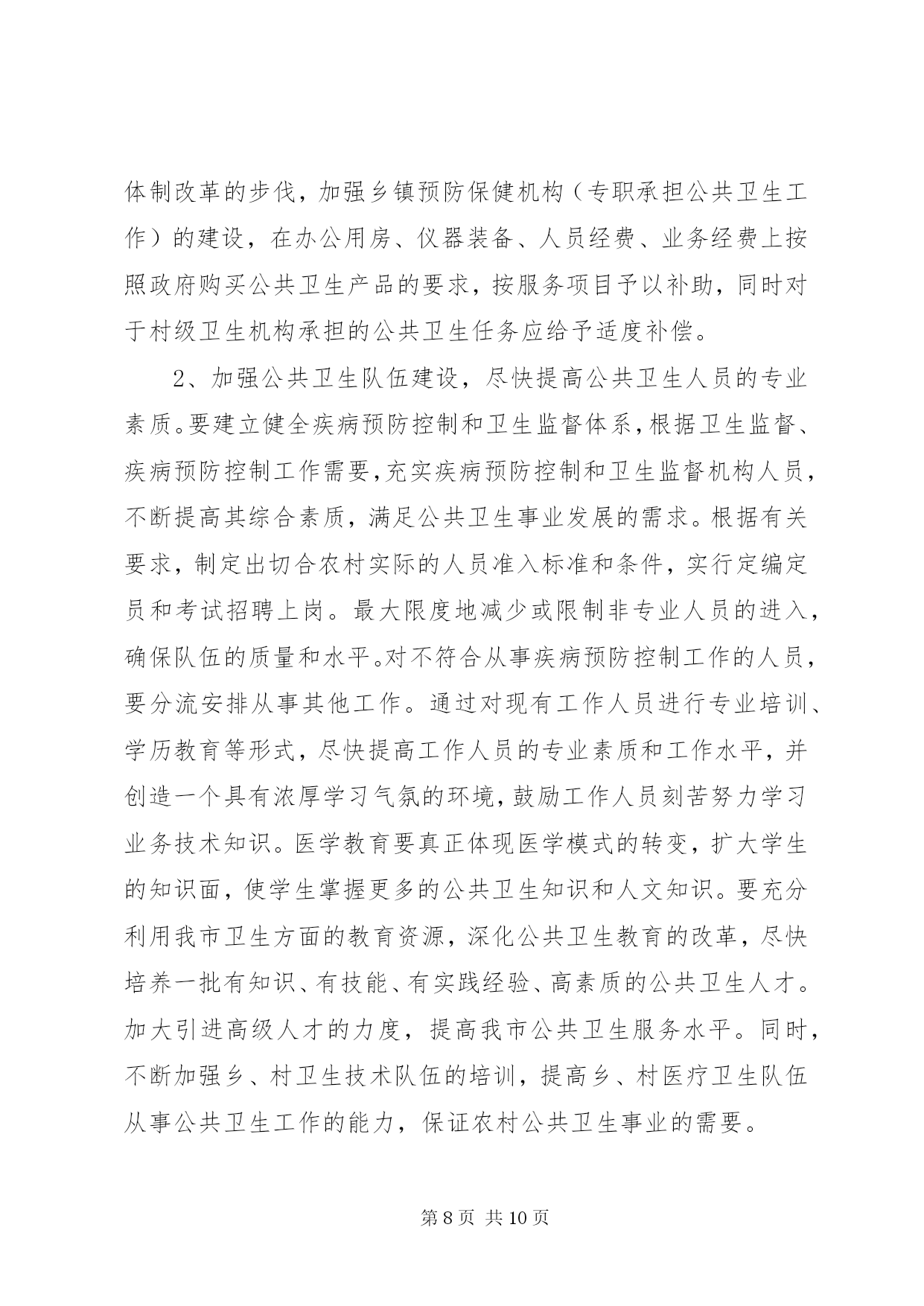 第PAGE\*Arabic\*MERGEFORMAT10页共NUMPAGES\*MERGEFORMAT10页我市农村公共卫生体系建设的调研一般理解公共卫生体系应包括为所有人服务的卫生设施、卫生系统以及卫生人员。公共卫生体系建设的核心任务通常包含几个方面:突发公共卫生事件应急机制、疾病预防控制体系、医疗救治体系、卫生执法监督体系和卫生信息体系的建立和完善。正是因为公共卫生体系是为所有人提供健康服务的,所以公共卫生体系建设得如何将直接影响人口的素质和劳动力的劳动能力的提高。对我国这样一个人口大国来说,搞好公共卫生体系建设意味着花费少量的资金解决广大人民群众的健康问题。当前,我国正处于经济社会发展和建设社会主义和谐社会的关键时期,由于我国农业人口比重大,加快农村卫生事业的发展也是我国经济社会发展的内在要求。农村公共卫生事业作为农村卫生事业的重要组成部分一直受到党和政府的高度重视。特别是20xx年取得抗击“非典”斗争胜利后,党中央、国务院作出一系列加强农村公共卫生体系建设的决策,卫生等部门做了大量工作,取得了一定成效。但是,应当看到地区发展的不平衡,经济社会发展的不平衡,尤其是城乡发展的不平衡,严重制约着农村公共卫生体系建设的推进,农村公共卫生基础薄弱的情况还没有得到根本改善。近年来,我市在公共卫生体系建设上取得了一些成效。基本完成了市县4所疾病预防控制中心、3县传染病区、市紧急救援和紧急医疗救治中心的建设。建立并完善了市、县、乡三级疫情网络报告系统,突发公共卫生事件应急处置能力明显增强。市、县疾病预防控制和卫生监督体制改革基本到位。但不可否认也存在一些问题,为进一步推进我市农村公共卫生体系建设,现将我市农村公共卫生体系建设调查情况以及几点建议报告如下。一、我市农村公共卫生体系基本框架和承担的主要任务按照市编委《关于调整市区疾病预防控制和卫生监督体制的通知》(蚌编[20xx]12号)要求:“将现有区级卫生防疫机构及职能重新整合,分别组建XX市龙子湖区疾病预防控制中心、XX市蚌山区疾病预防控制中心、XX市禹会区疾病预防控制中心、XX市淮上区疾病预防控制中心,均为副科级建制,列入区卫生局直属事业单位管理序列,同时撤销原区卫生防疫站。XX县区一级不设卫生监督所,其公共卫生监督执法职能由市卫生局卫生监督所承担。”固镇、五河及怀远三县编办也均正式下文批准组建三县疾病预防控制中心和卫生监督所,撤销原县卫生防疫站。市、县卫生监督所按有关规定负责辖区范围内的卫生监督执法工作。20xx年3月,XX市XX县区实行区划调整,市内4个区都带了乡镇,增加了农村卫生工作。因此,我市农村公共卫生体系在三县主要由县、乡、村三级卫生服务网络构成,在市区主要由市、区、乡、村四级卫生服务网络构成。形成了以市、县(区)疾病预防和卫生监督机构为龙头,以乡(镇)防保站或卫生院为枢纽,以村级医疗机构为基础的农村公共卫生服务体系。从调查情况看,目前市、县(区)疾病预防控制和卫生监督机构人员约430多人(市级约130人,区级约60人,县级约245人),为全额事业编制,人员工资由各级财政预算安排,但地方津贴部分由各单位从预算外收入中解决;我市80的乡镇卫生院成立了防保站,一般由3-5人组成,乡(镇)防保站工作人员共330多人,人员工资和工作经费基本未列入财政预算,所需经费主要靠预防保健工作收入或由乡卫生院从医疗收入中予以解决;村级医疗机构实行自收自支,其承担的公共卫生任务得不到任何补贴。农村公共卫生服务体系承担的主要任务有。处理或协助处理突发公共卫生事件;加强传染病防治工作,降低传染病发病率;实现让所有适龄儿童得到有效的免疫接种的目标;开展多种形式的爱滋病防控工作;落实疟疾、结核病等我市常见传染病的防控措施;开展不明原因肺炎主动搜索;实行医疗机构传染病网络直报;推行食品卫生监督量化分级管理,开展卫生许可专项整治;开展儿童食品、节庆市场专项整治;开展乡镇企业非固定用工劳动者健康监护情况执法检查;开展学校卫生安全监督检查等等。二、我市农村公共卫生体系存在的主要问题1、公共卫生事业的投入长期不足,公共卫生工作运转艰难。公共卫生事业是国家重要的公益性事业,应当依靠政府支持。在国家从计划经济向社会主义市场经济的过渡阶段,如果没有严重的突发公共卫生事件发生,人们对公共卫生的重要性和紧迫性很难认识到位,从而影响了各级政府对公共卫生事业的正常投入,以至积累了大量问题。调查反映,我市、县(区)级财政对市、县(区)疾病预防控制和卫生监督机构的预算内经费安排仅限于人员工资的部分和人均1000元的办公经费,人员工资的地方津贴部分和特殊行业津贴、检验检测设备更新经费、国家规定的免费接种的疫苗所需经费以及正常的办公开支都要从各单位的行政事业性收费或有偿技术服务收费中予以补充,县级财政安排
