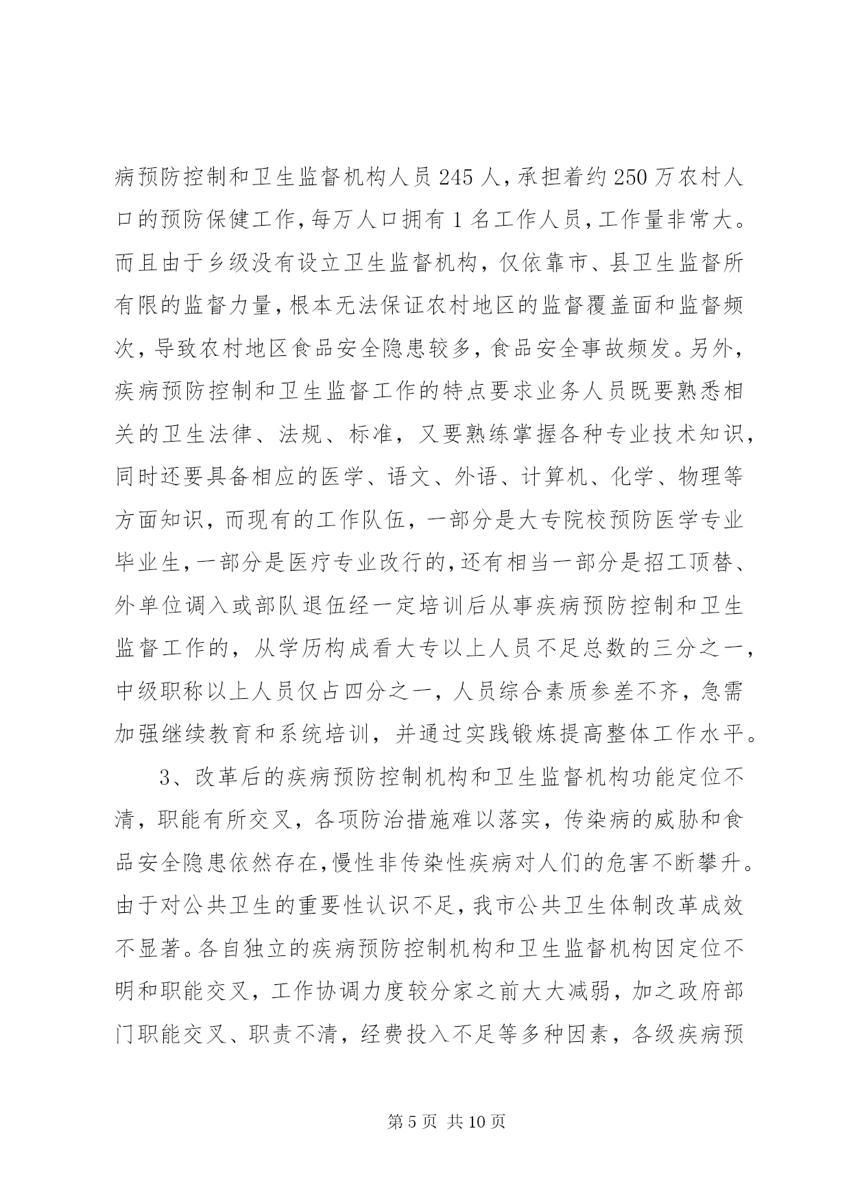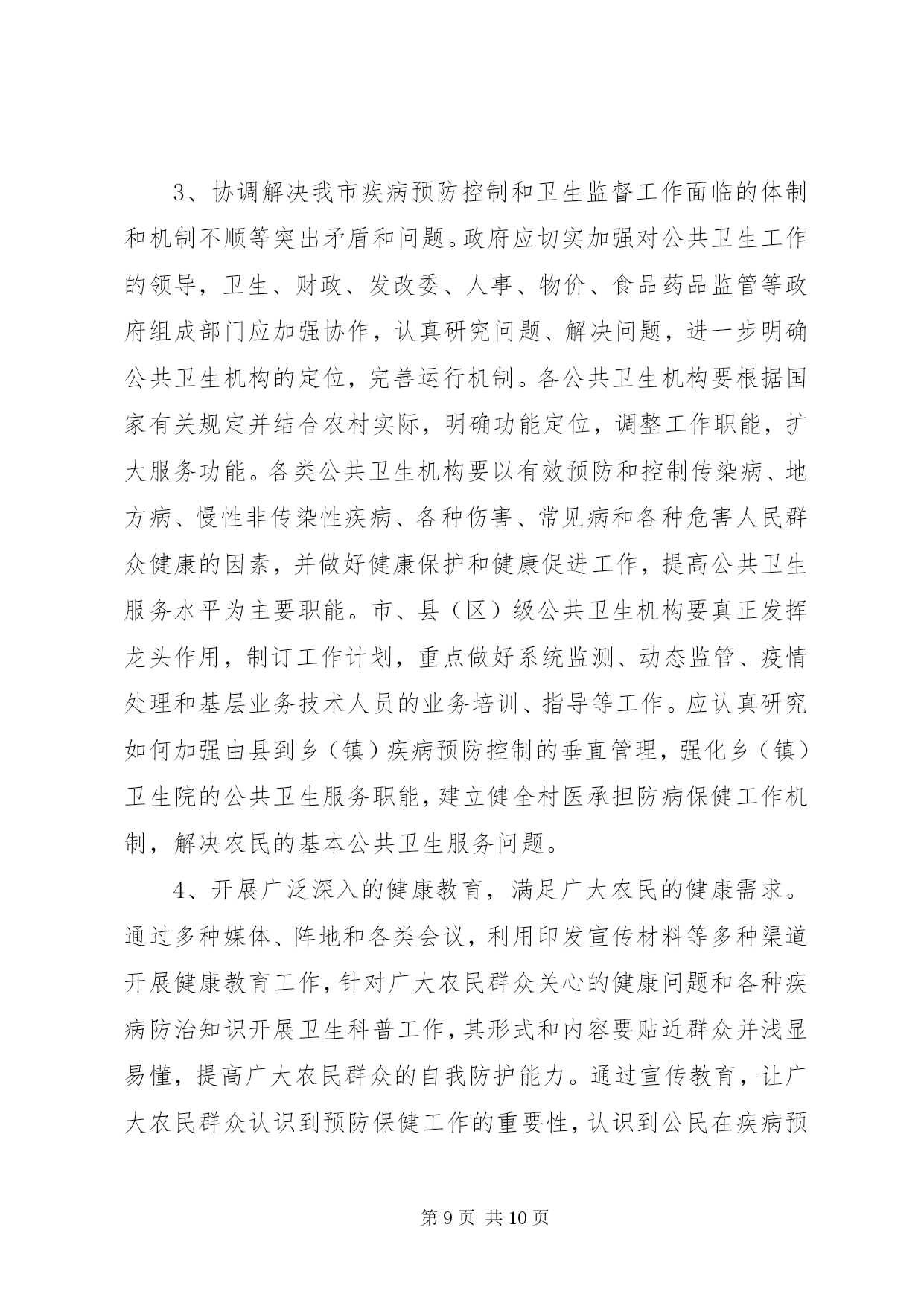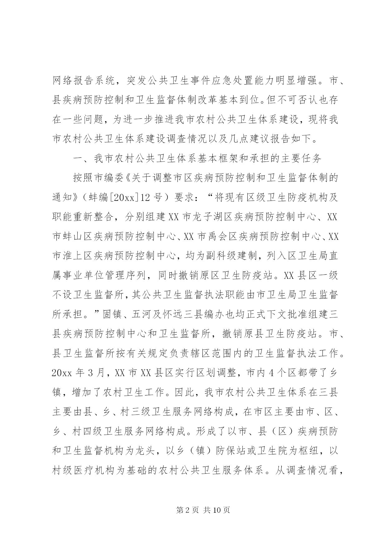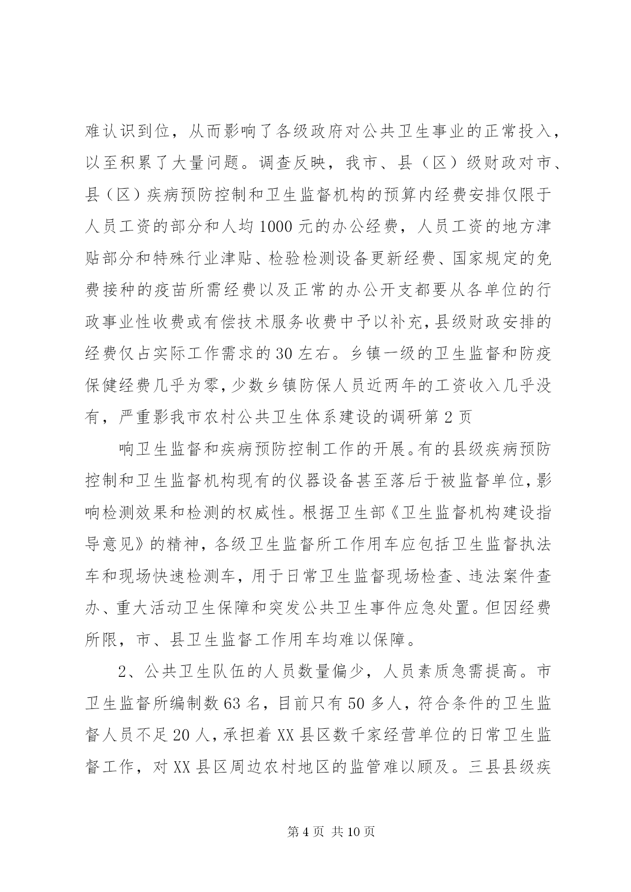 第PAGE\*Arabic\*MERGEFORMAT10页共NUMPAGES\*MERGEFORMAT10页我市农村公共卫生体系建设的调研一般理解公共卫生体系应包括为所有人服务的卫生设施、卫生系统以及卫生人员。公共卫生体系建设的核心任务通常包含几个方面:突发公共卫生事件应急机制、疾病预防控制体系、医疗救治体系、卫生执法监督体系和卫生信息体系的建立和完善。正是因为公共卫生体系是为所有人提供健康服务的,所以公共卫生体系建设得如何将直接影响人口的素质和劳动力的劳动能力的提高。对我国这样一个人口大国来说,搞好公共卫生体系建设意味着花费少量的资金解决广大人民群众的健康问题。当前,我国正处于经济社会发展和建设社会主义和谐社会的关键时期,由于我国农业人口比重大,加快农村卫生事业的发展也是我国经济社会发展的内在要求。农村公共卫生事业作为农村卫生事业的重要组成部分一直受到党和政府的高度重视。特别是20xx年取得抗击“非典”斗争胜利后,党中央、国务院作出一系列加强农村公共卫生体系建设的决策,卫生等部门做了大量工作,取得了一定成效。但是,应当看到地区发展的不平衡,经济社会发展的不平衡,尤其是城乡发展的不平衡,严重制约着农村公共卫生体系建设的推进,农村公共卫生基础薄弱的情况还没有得到根本改善。近年来,我市在公共卫生体系建设上取得了一些成效。基本完成了市县4所疾病预防控制中心、3县传染病区、市紧急救援和紧急医疗救治中心的建设。建立并完善了市、县、乡三级疫情网络报告系统,突发公共卫生事件应急处置能力明显增强。市、县疾病预防控制和卫生监督体制改革基本到位。但不可否认也存在一些问题,为进一步推进我市农村公共卫生体系建设,现将我市农村公共卫生体系建设调查情况以及几点建议报告如下。一、我市农村公共卫生体系基本框架和承担的主要任务按照市编委《关于调整市区疾病预防控制和卫生监督体制的通知》(蚌编[20xx]12号)要求:“将现有区级卫生防疫机构及职能重新整合,分别组建XX市龙子湖区疾病预防控制中心、XX市蚌山区疾病预防控制中心、XX市禹会区疾病预防控制中心、XX市淮上区疾病预防控制中心,均为副科级建制,列入区卫生局直属事业单位管理序列,同时撤销原区卫生防疫站。XX县区一级不设卫生监督所,其公共卫生监督执法职能由市卫生局卫生监督所承担。”固镇、五河及怀远三县编办也均正式下文批准组建三县疾病预防控制中心和卫生监督所,撤销原县卫生防疫站。市、县卫生监督所按有关规定负责辖区范围内的卫生监督执法工作。20xx年3月,XX市XX县区实行区划调整,市内4个区都带了乡镇,增加了农村卫生工作。因此,我市农村公共卫生体系在三县主要由县、乡、村三级卫生服务网络构成,在市区主要由市、区、乡、村四级卫生服务网络构成。形成了以市、县(区)疾病预防和卫生监督机构为龙头,以乡(镇)防保站或卫生院为枢纽,以村级医疗机构为基础的农村公共卫生服务体系。从调查情况看,目前市、县(区)疾病预防控制和卫生监督机构人员约430多人(市级约130人,区级约60人,县级约245人),为全额事业编制,人员工资由各级财政预算安排,但地方津贴部分由各单位从预算外收入中解决;我市80的乡镇卫生院成立了防保站,一般由3-5人组成,乡(镇)防保站工作人员共330多人,人员工资和工作经费基本未列入财政预算,所需经费主要靠预防保健工作收入或由乡卫生院从医疗收入中予以解决;村级医疗机构实行自收自支,其承担的公共卫生任务得不到任何补贴。农村公共卫生服务体系承担的主要任务有。处理或协助处理突发公共卫生事件;加强传染病防治工作,降低传染病发病率;实现让所有适龄儿童得到有效的免疫接种的目标;开展多种形式的爱滋病防控工作;落实疟疾、结核病等我市常见传染病的防控措施;开展不明原因肺炎主动搜索;实行医疗机构传染病网络直报;推行食品卫生监督量化分级管理,开展卫生许可专项整治;开展儿童食品、节庆市场专项整治;开展乡镇企业非固定用工劳动者健康监护情况执法检查;开展学校卫生安全监督检查等等。二、我市农村公共卫生体系存在的主要问题1、公共卫生事业的投入长期不足,公共卫生工作运转艰难。公共卫生事业是国家重要的公益性事业,应当依靠政府支持。在国家从计划经济向社会主义市场经济的过渡阶段,如果没有严重的突发公共卫生事件发生,人们对公共卫生的重要性和紧迫性很难认识到位,从而影响了各级政府对公共卫生事业的正常投入,以至积累了大量问题。调查反映,我市、县(区)级财政对市、县(区)疾病预防控制和卫生监督机构的预算内经费安排仅限于人员工资的部分和人均1000元的办公经费,人员工资的地方津贴部分和特殊行业津贴、检验检测设备更新经费、国家规定的免费接种的疫苗所需经费以及正常的办公开支都要从各单位的行政事业性收费或有偿技术服务收费中予以补充,县级财政安排