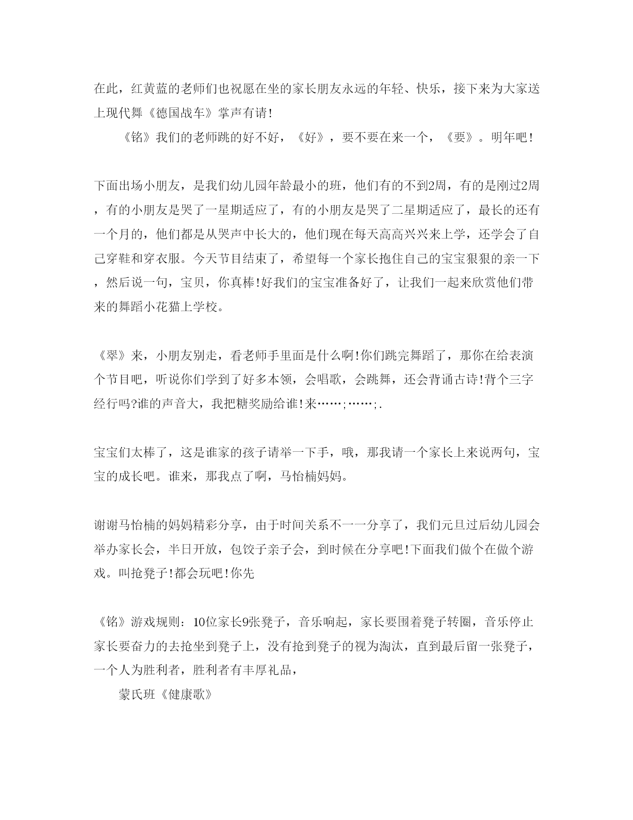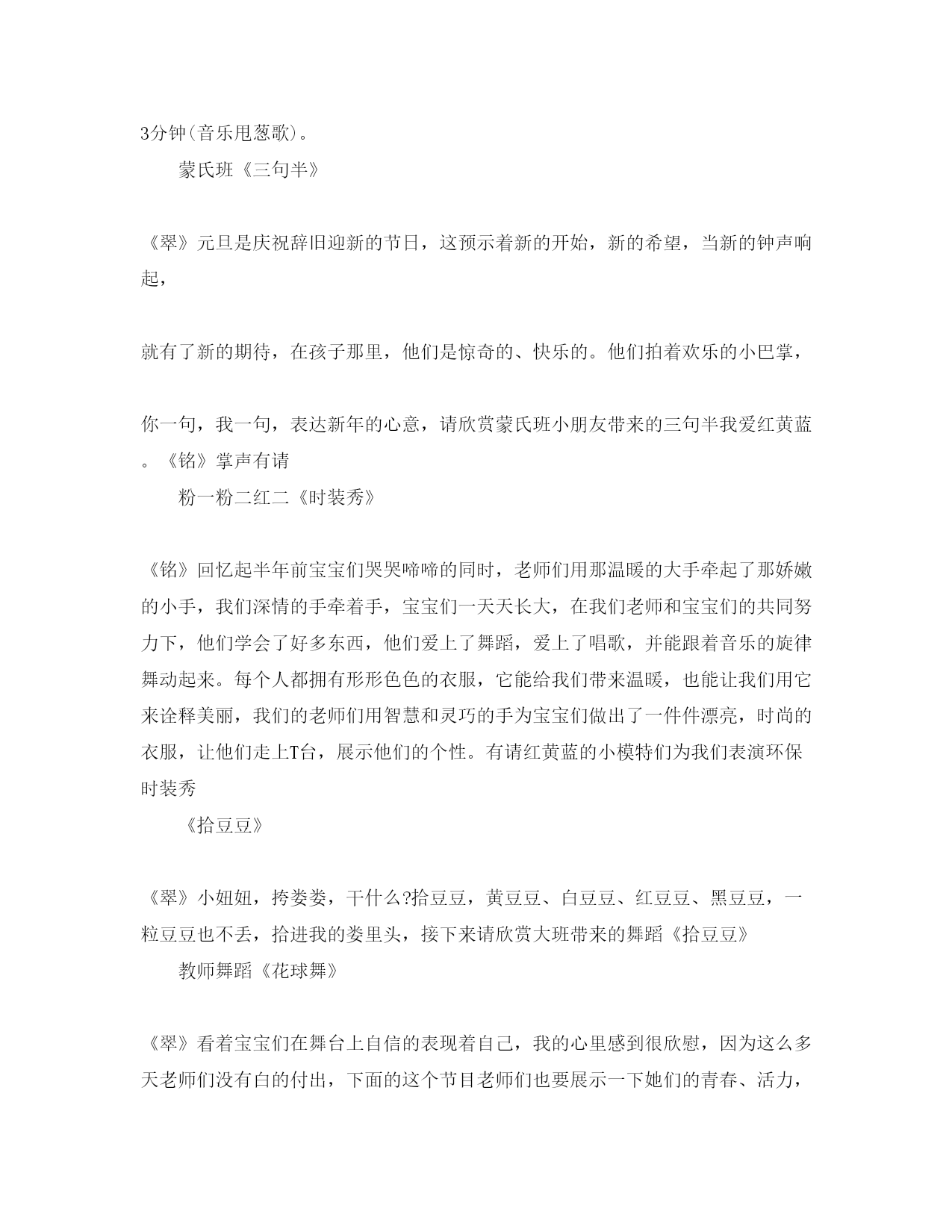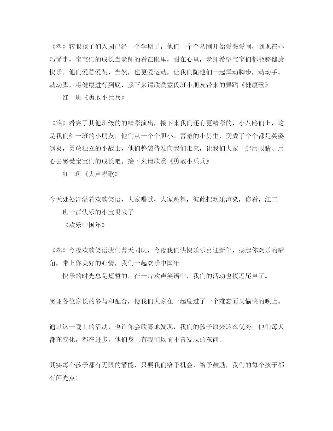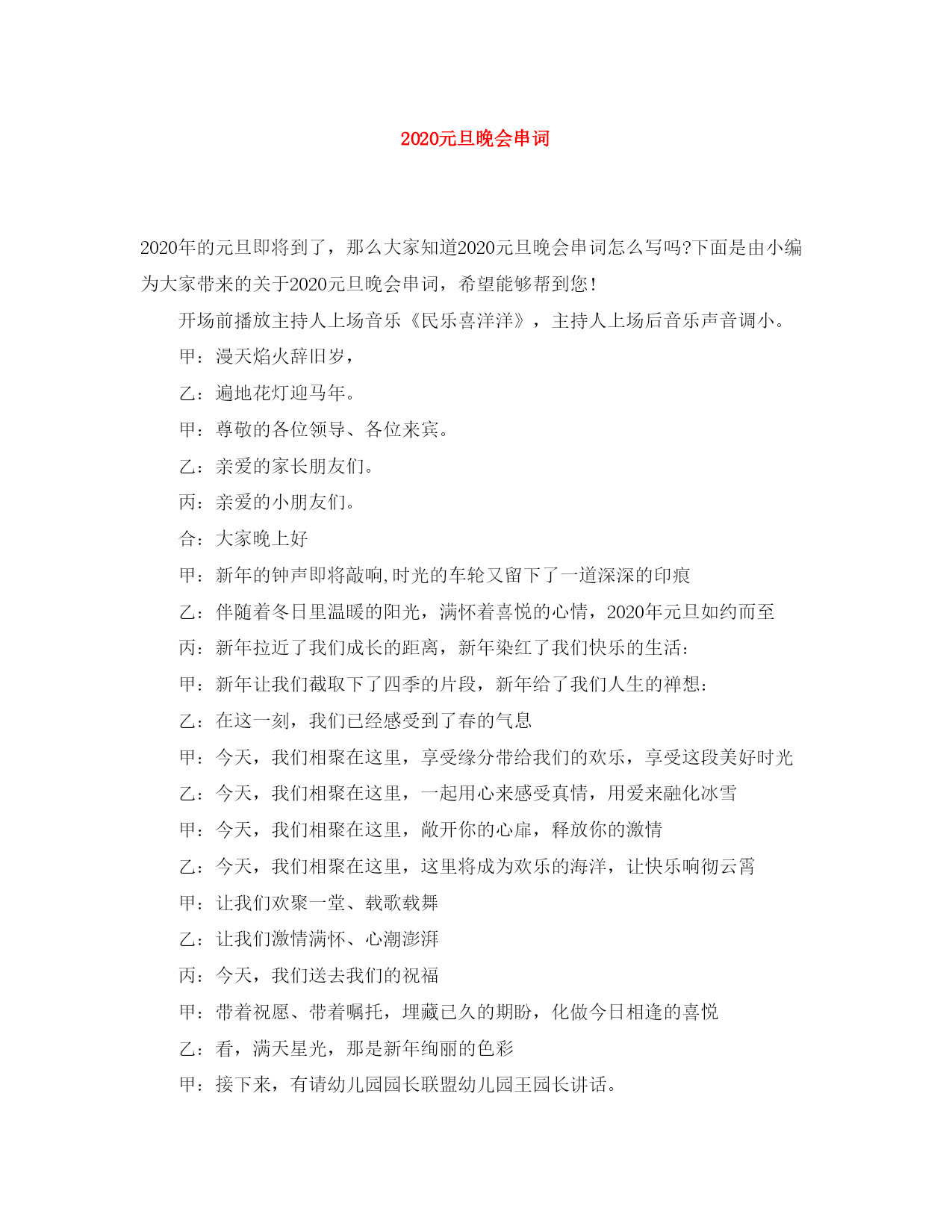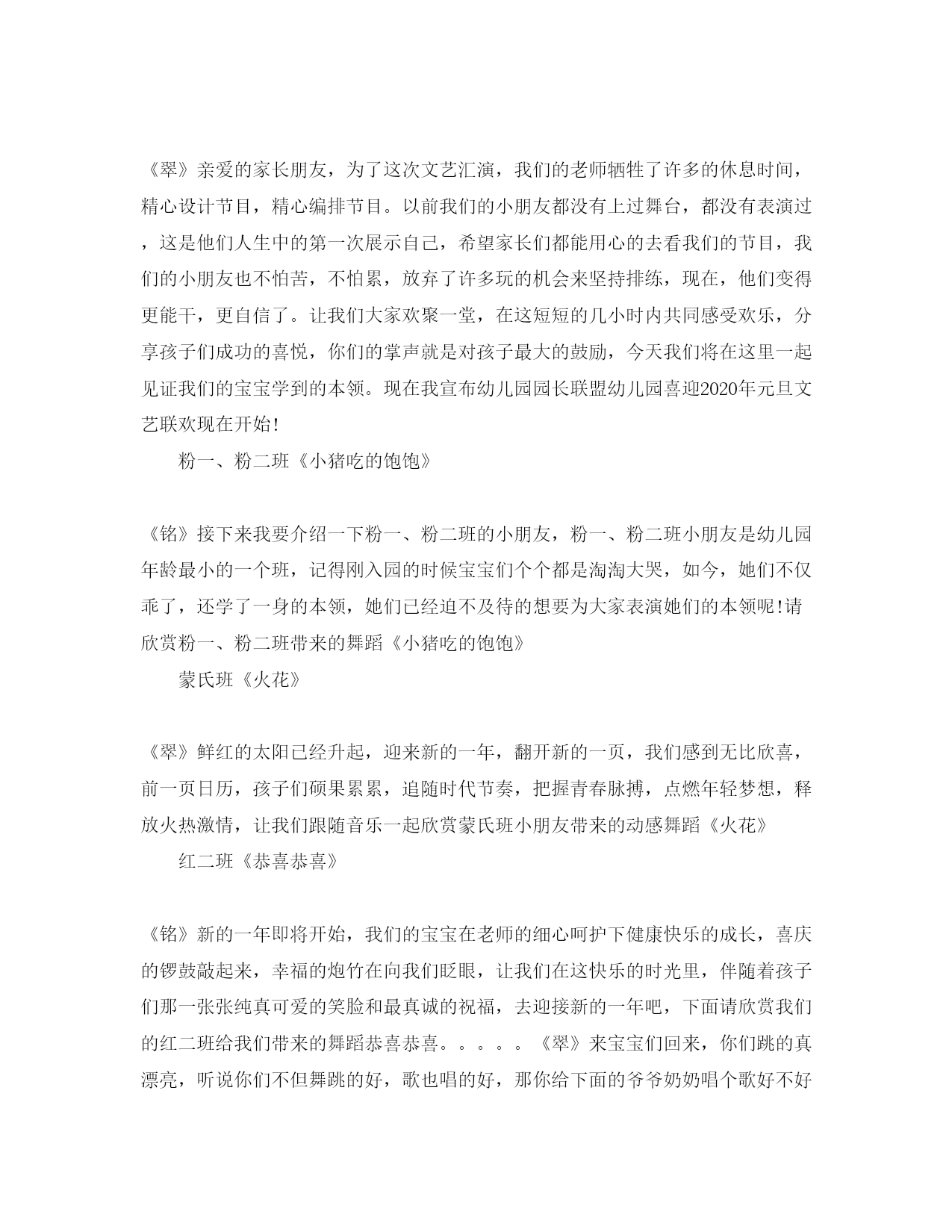 此资料由网络收集而来,如有侵权请告知上传者立即删除。资料共分享,我们负责传递知识。2020元旦晚会串词2020年的元旦即将到了,那么大家知道2020元旦晚会串词怎么写吗?下面是由小编为大家带来的关于2020元旦晚会串词,希望能够帮到您!开场前播放主持人上场音乐《民乐喜洋洋》,主持人上场后音乐声音调小。甲:漫天焰火辞旧岁,乙:遍地花灯迎马年。甲:尊敬的各位领导、各位来宾。乙:亲爱的家长朋友们。丙:亲爱的小朋友们。合:大家晚上好甲:新年的钟声即将敲响,时光的车轮又留下了一道深深的印痕乙:伴随着冬日里温暖的阳光,满怀着喜悦的心情,2020年元旦如约而至丙:新年拉近了我们成长的距离,新年染红了我们快乐的生活:甲:新年让我们截取下了四季的片段,新年给了我们人生的禅想:乙:在这一刻,我们已经感受到了春的气息甲:今天,我们相聚在这里,享受缘分带给我们的欢乐,享受这段美好时光乙:今天,我们相聚在这里,一起用心来感受真情,用爱来融化冰雪甲:今天,我们相聚在这里,敞开你的心扉,释放你的激情乙:今天,我们相聚在这里,这里将成为欢乐的海洋,让快乐响彻云霄甲:让我们欢聚一堂、载歌载舞乙:让我们激情满怀、心潮澎湃丙:今天,我们送去我们的祝福甲:带着祝愿、带着嘱托,埋藏已久的期盼,化做今日相逢的喜悦乙:看,满天星光,那是新年绚丽的色彩甲:接下来,有请幼儿园园长联盟幼儿园王园长讲话。《翠》亲爱的家长朋友,为了这次文艺汇演,我们的老师牺牲了许多的休息时间,精心设计节目,精心编排节目。以前我们的小朋友都没有上过舞台,都没有表演过,这是他们人生中的第一次展示自己,希望家长们都能用心的去看我们的节目,我们的小朋友也不怕苦,不怕累,放弃了许多玩的机会来坚持排练,现在,他们变得更能干,更自信了。让我们大家欢聚一堂,在这短短的几小时内共同感受欢乐,分享孩子们成功的喜悦,你们的掌声就是对孩子最大的鼓励,今天我们将在这里一起见证我们的宝宝学到的本领。现在我宣布幼儿园园长联盟幼儿园喜迎2020年元旦文艺联欢现在开始!粉一、粉二班《小猪吃的饱饱》《铭》接下来我要介绍一下粉一、粉二班的小朋友,粉一、粉二班小朋友是幼儿园年龄最小的一个班,记得刚入园的时候宝宝们个个都是淘淘大哭,如今,她们不仅乖了,还学了一身的本领,她们已经迫不及待的想要为大家表演她们的本领呢!请欣赏粉一、粉二班带来的舞蹈《小猪吃的饱饱》蒙氏班《火花》《翠》鲜红的太阳已经升起,迎来新的一年,翻开新的一页,我们感到无比欣喜,前一页日历,孩子们硕果累累,追随时代节奏,把握青春脉搏,点燃年轻梦想,释放火热激情,让我们跟随音乐一起欣赏蒙氏班小朋友带来的动感舞蹈《火花》红二班《恭喜恭喜》《铭》新的一年即将开始,我们的宝宝在老师的细心呵护下健康快乐的成长,喜庆的锣鼓敲起来,幸福的炮竹在向我们眨眼,让我们在这快乐的时光里,伴随着孩子们那一张张纯真可爱的笑脸和最真诚的祝福,去迎接新的一年吧,下面请欣赏我们的红二班给我们带来的舞蹈恭喜恭喜。。。。。《翠》来宝宝们回来,你们跳的真漂亮,听说你们不但舞跳的好,歌也唱的好,那你给下面的爷爷奶奶唱个歌好不好,唱的好的话老师这有奖励。唱世上只有妈妈好。是啊,世上只有妈妈好,有妈的孩子像块宝,希望我们的家长朋友不要为了工作,为了挣钱而忽略了对孩子的爱,抽出时间能多陪陪我们的孩子,多给我们孩子爱,因为孩子需要我们共同的爱。红一班《我的身体》亲爱的爷爷奶奶,爸爸妈妈,这是我的头,这是我的胸,这是我的肩,下面呢这个节目就是介绍我的身体,掌声有请他们。《铭、翠》我们的宝宝们跳的好不好呀,《好》能再一次伸出你那热情的掌声送给他们吗?谢谢!下面呢我们俩给家长朋友读一封信,这是一个新生家长写给幼儿园的,她手里是一封老师写给家长的。希望大家都能用心的去聆听我们家长和老师之间的心声。《铭》通过这两封信的,我们看到了什么?看到了每一个宝宝刚入幼儿园时妈妈的心声。我们的老师呢也说出了她对孩子的爱与责任,从早晨7.20到晚上5.30,每一天我们的老师都是披星挂月的上班回家,来到幼儿园就是为了照顾好我们的宝宝,有时候工作上会出现一点点小小的错误,但是我希望家长们能理解我们这些老师们,但是你们也放心,既然把宝宝交给了红黄蓝,我们每一个老师都会像妈妈一样来疼爱我们的孩子。用心的呵护他。你们的支持就是对我们老师工作最大的认可,我希望大家能再一次伸出双手送给我们这些战斗在一线的幼儿教师们,在此我代表我们的老师对你们说一声谢谢!《翠》接下来我们来互动一下,请我们的幸运家长来,我们一起来玩和游戏《踩气球》游戏规则:游戏分为红队、蓝队两队,两队每位家长脚上分别绑上三个气球,在规定时间内,哪组的球先被踩完即为淘汰,被淘汰的一组就要给大家献上节目。限时3分钟(音乐甩葱歌